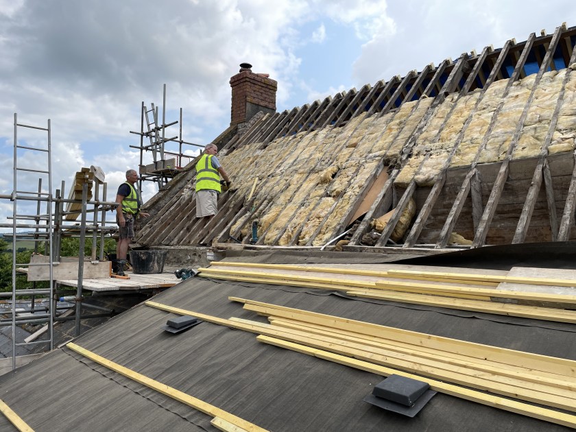 Day one started well – the roofers arrived and stripped the roof completely. They had to wear proper suits and breathing masks because of the asbestos – it was quite disconcerting working at the dining table and seeing white and orange-suited people going up and down the scaffolding ladder all day! The tiles were hauled down in bundles – most of which made it down in one piece – a couple weren’t balanced properly and tipped their contents over the tomato plants which we promptly moved!