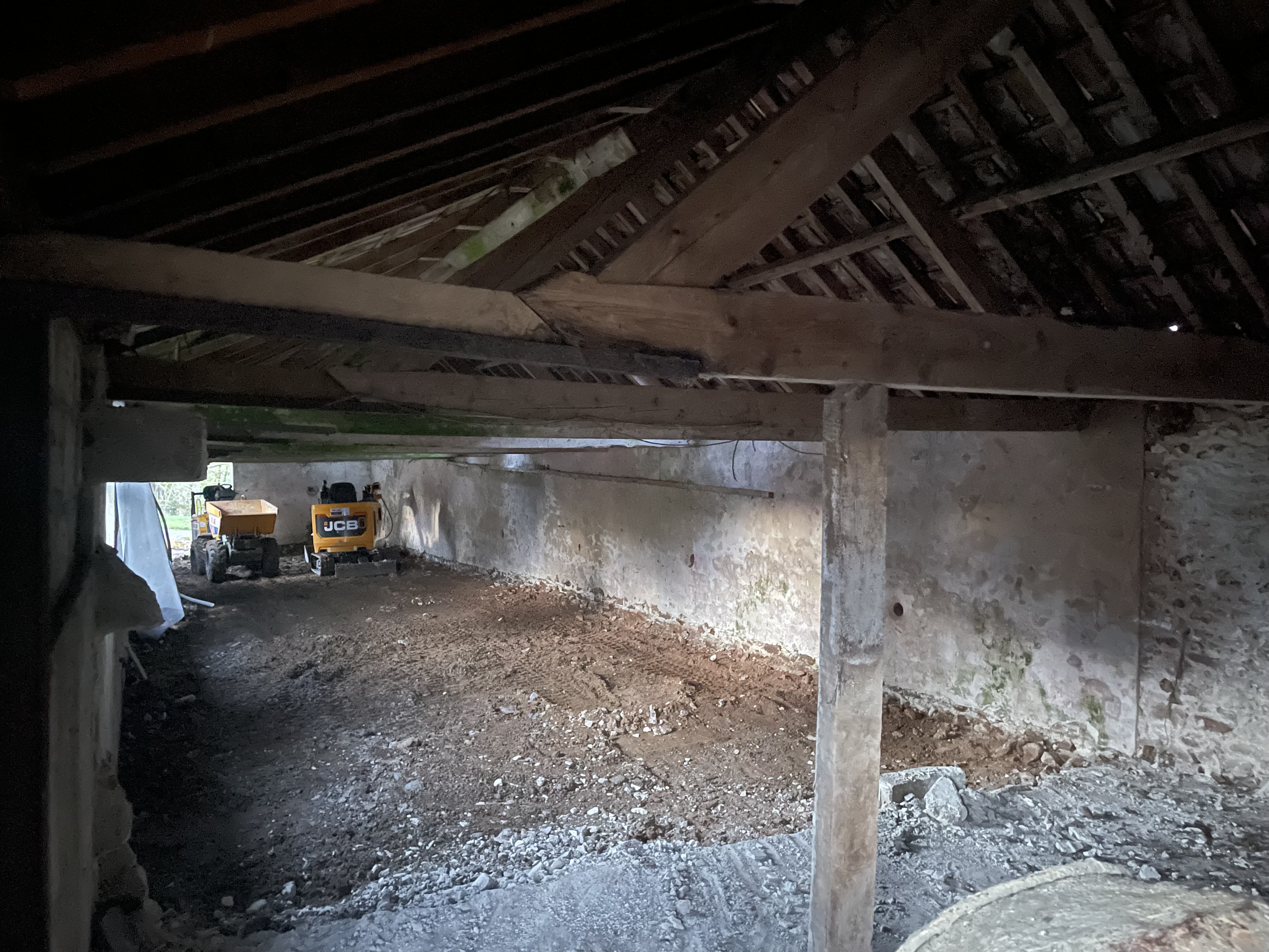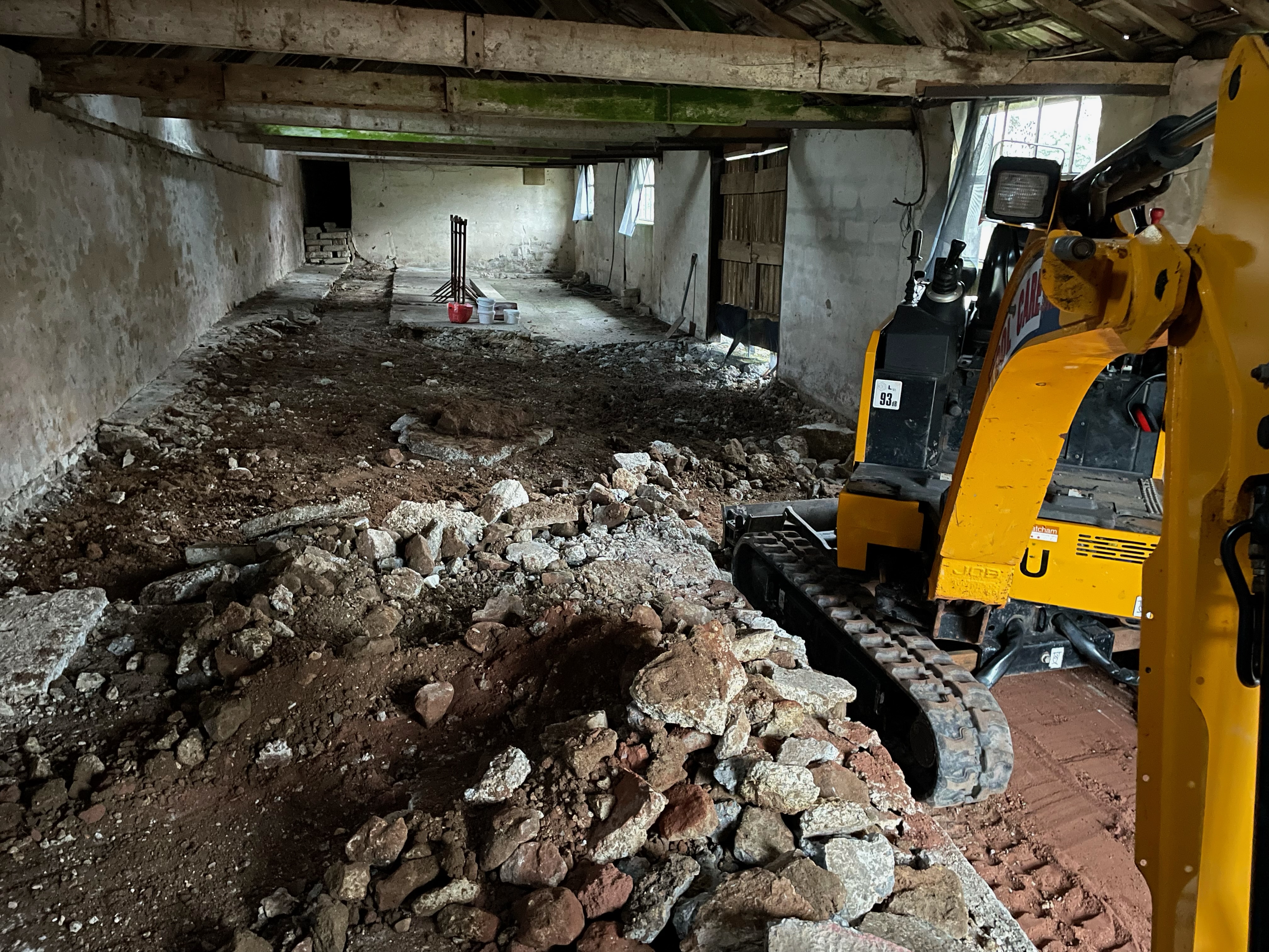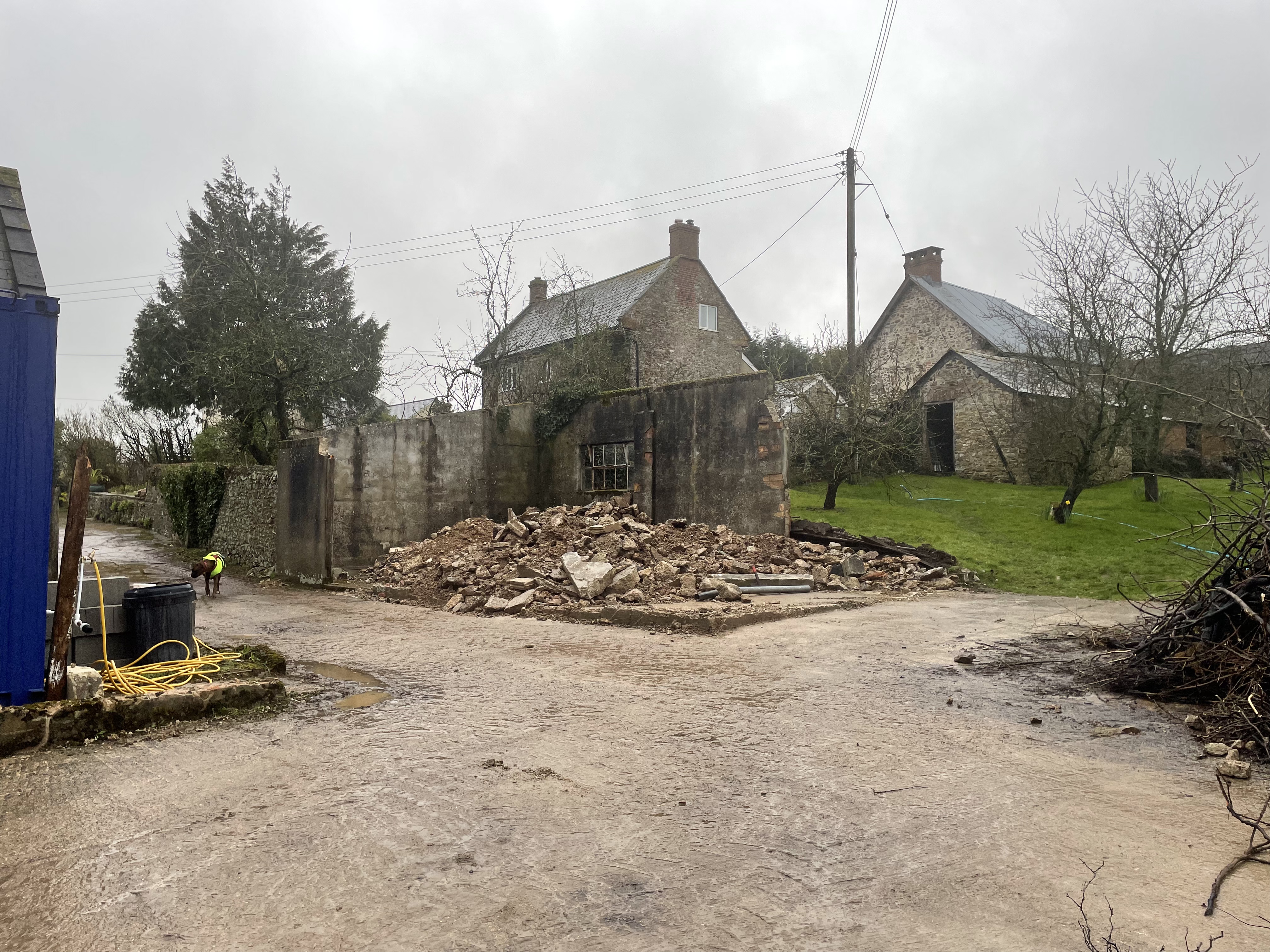 We distracted ourselves over the second half of last year by getting on with all the site preparation we needed to do. This ranged from easier jobs like gradually clearing out the barns (mainly into the top floor of the farmhouse, which we then had to move again last month) and reclaiming beams for lighting, through to organising works with third parties like BT Openreach, National Grid, and our bat license and mitigation plans. Looking back, we spent at least half our weekends from August to February either moving things out of the way (compost bins, piles of woodchip and stones, and boxes), cutting back years of vegetation off the shippon (memories of that bitterly cold weather will stay with us for a while!).