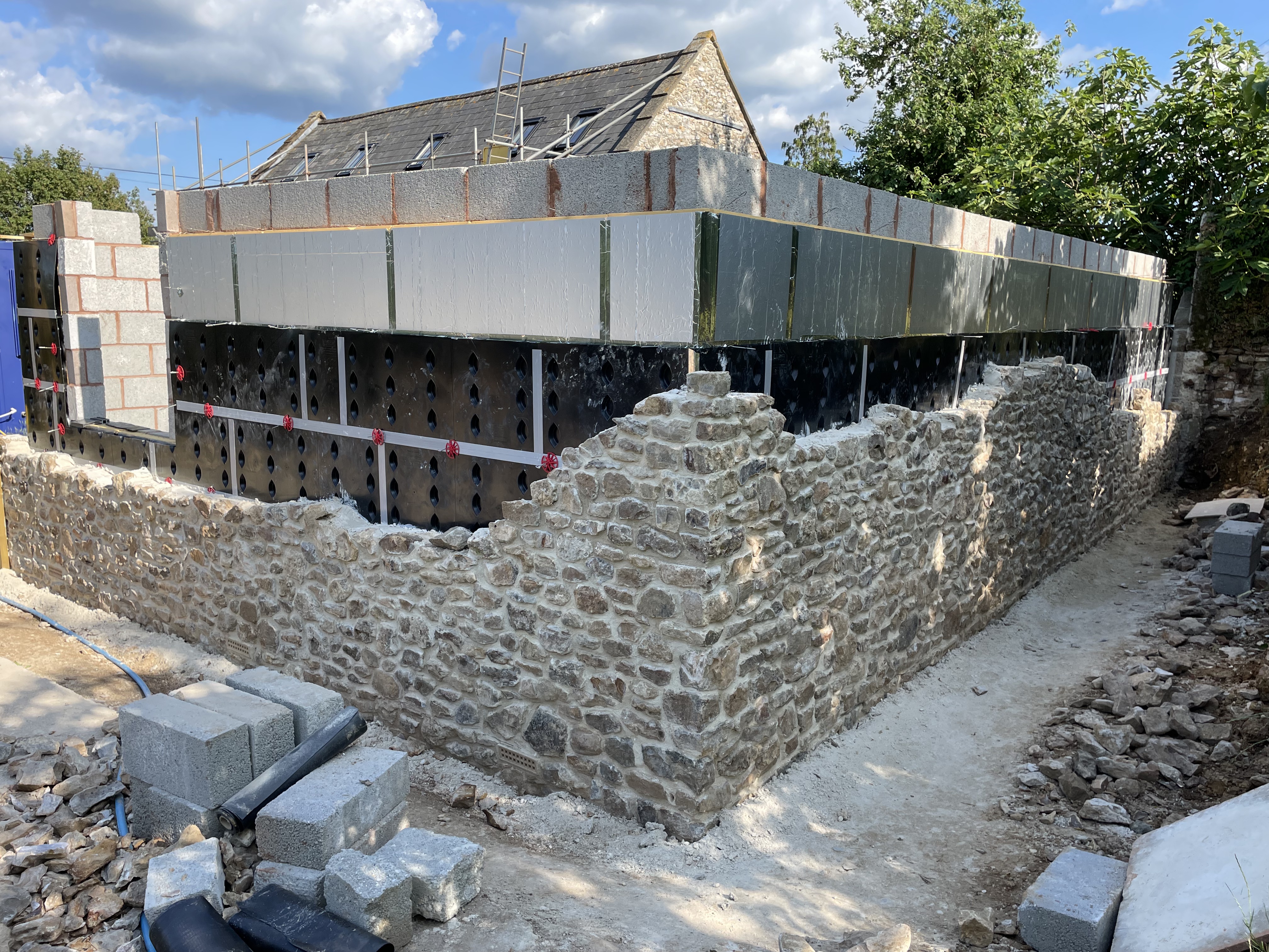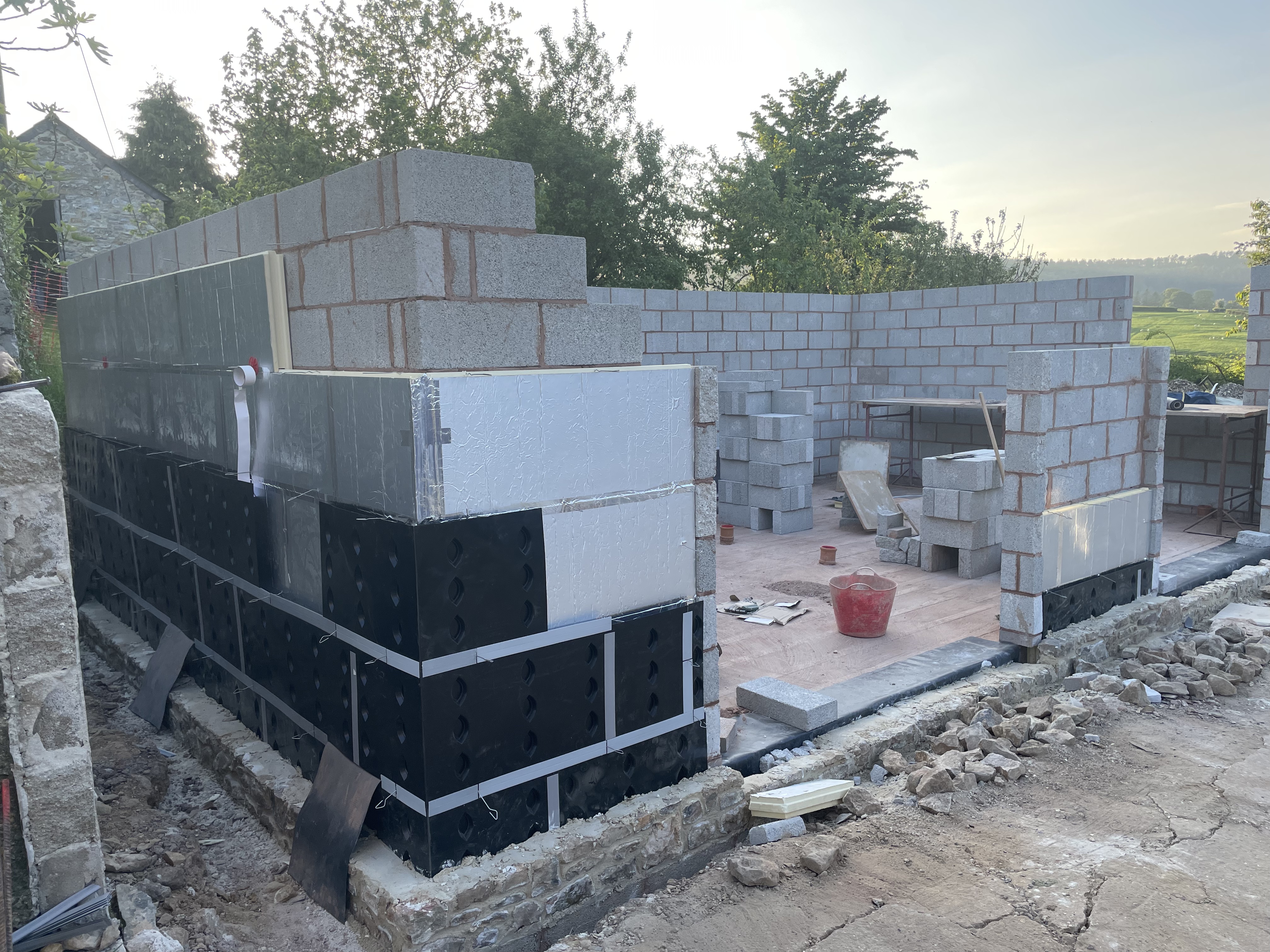 Shortly after starting on the shippon, our builders also started working on our derelict barn, knocking most of it down to the ground, and just keeping the walls that are built into the hill. They’ve worked on this continually since – digging out deep foundations and laying the floor, then building up the walls – first breeze block and insulation, and then an incredible-looking facing of stone, ready for the next floor to be added. It may not sound much, but you can see the amount of effort going into this.