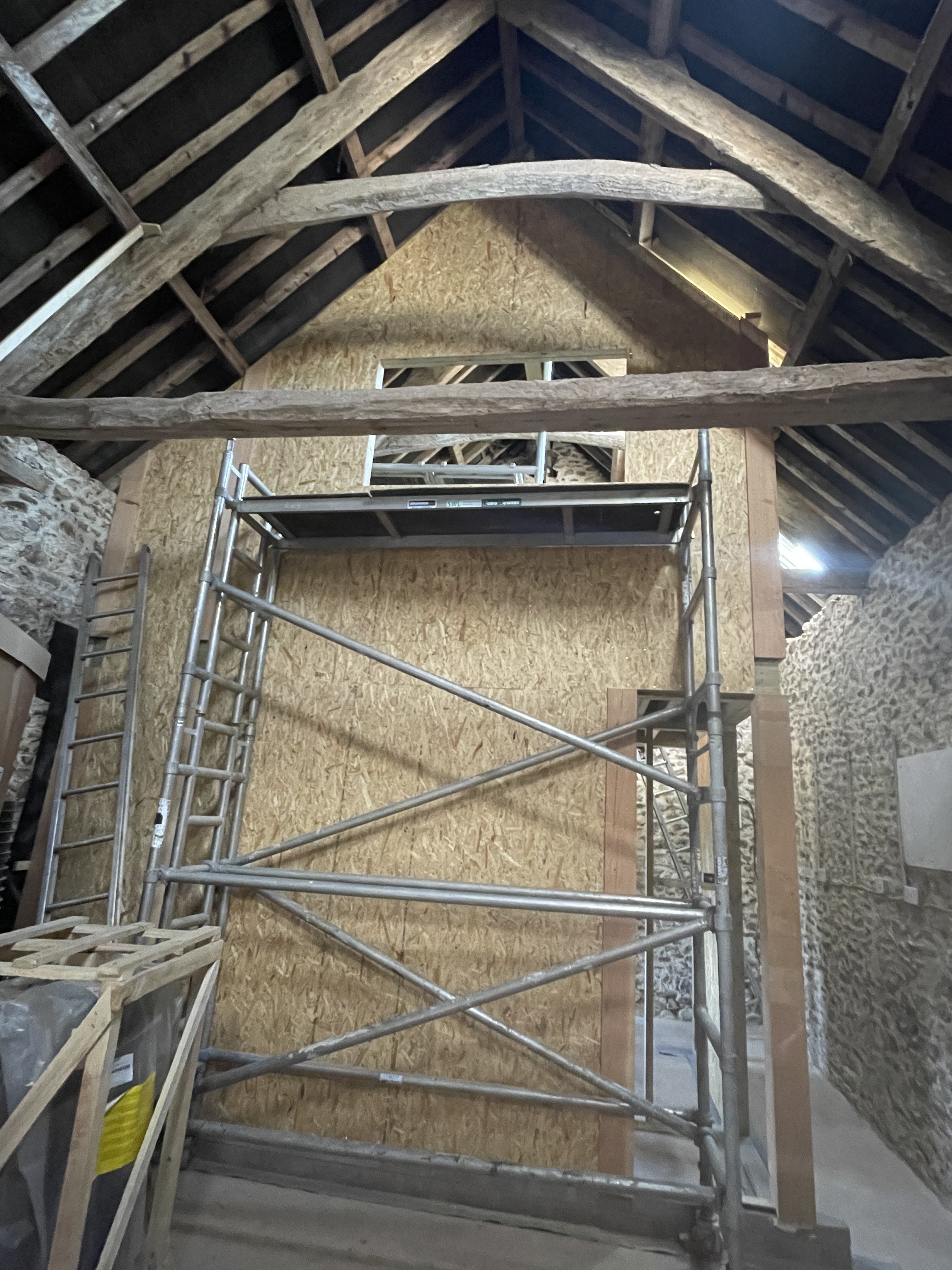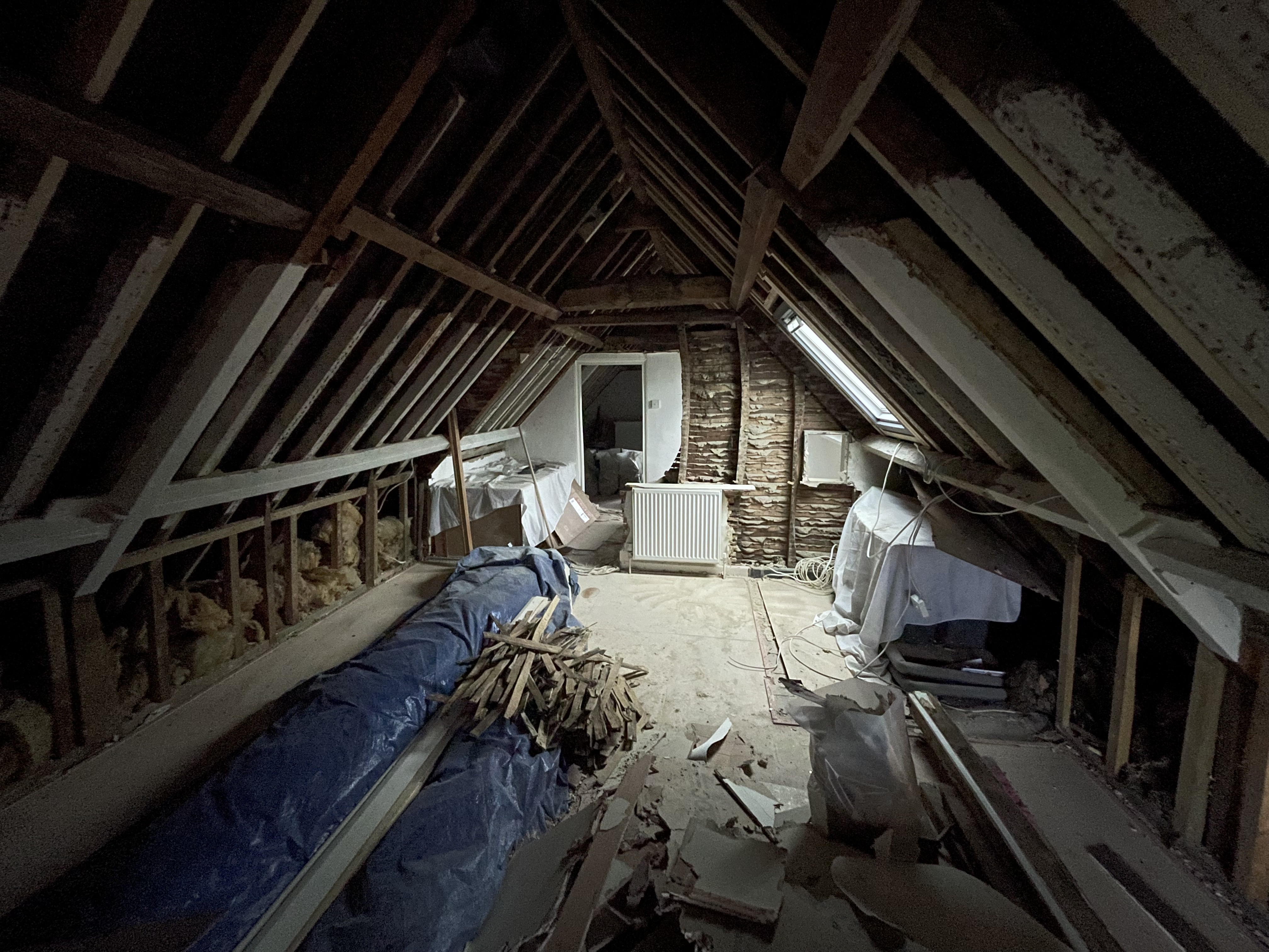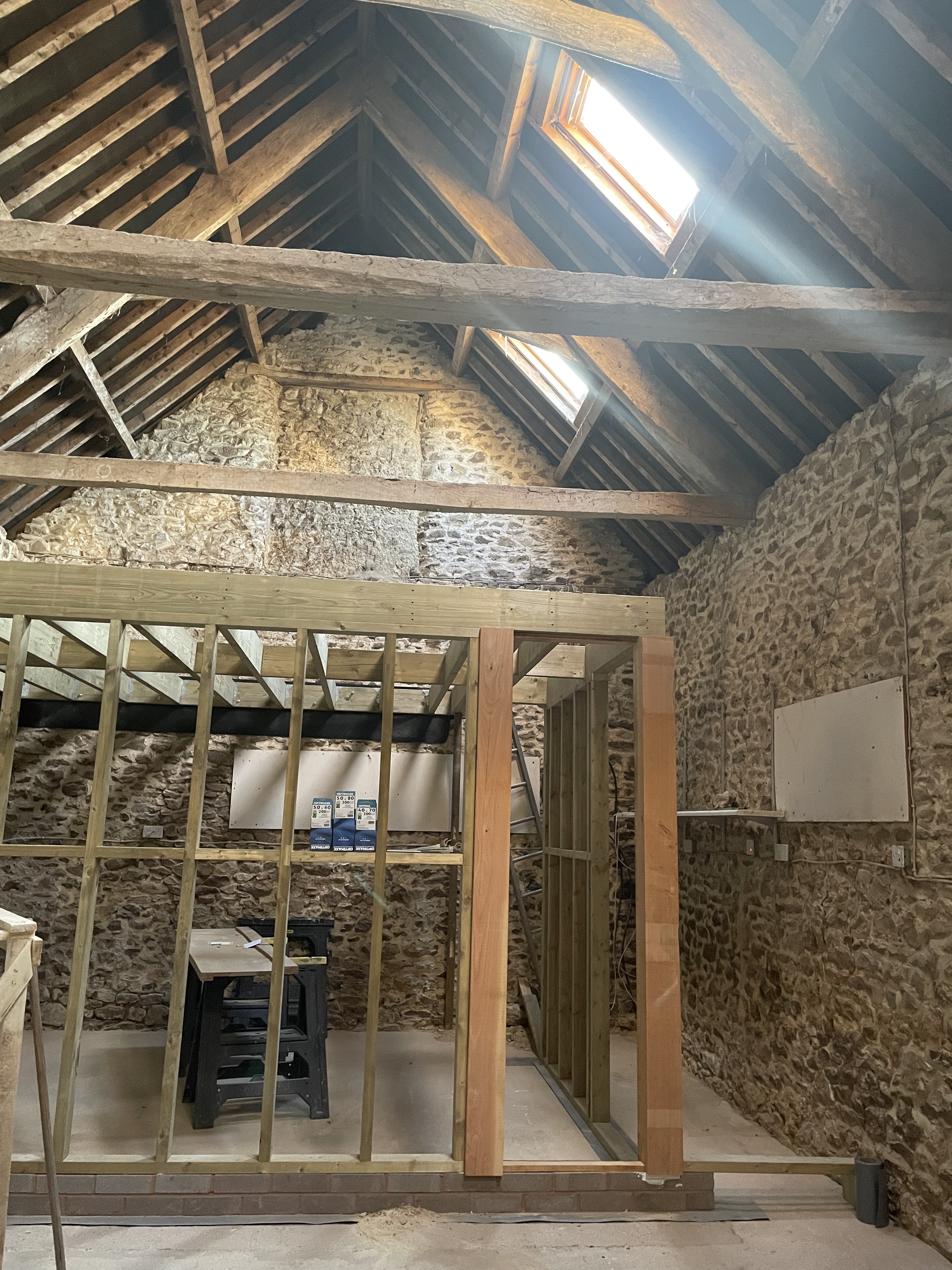 In the last month, our builders have also started on the farmhouse, making this the fourth building they’re juggling. At least most of the work is contained within the top floor and our ensuite – it does mean though that our living space is full either of boxes or odd bits of furniture we’ve been collecting. Trying to squeeze past everything can be challenging at times! They’re making fast progress though – having already stripped the asbestos roof tiles and replaced them with slate and solar tiles; and then ripping out the top floor back to the bare walls, ready to be properly insulated and reformed.
