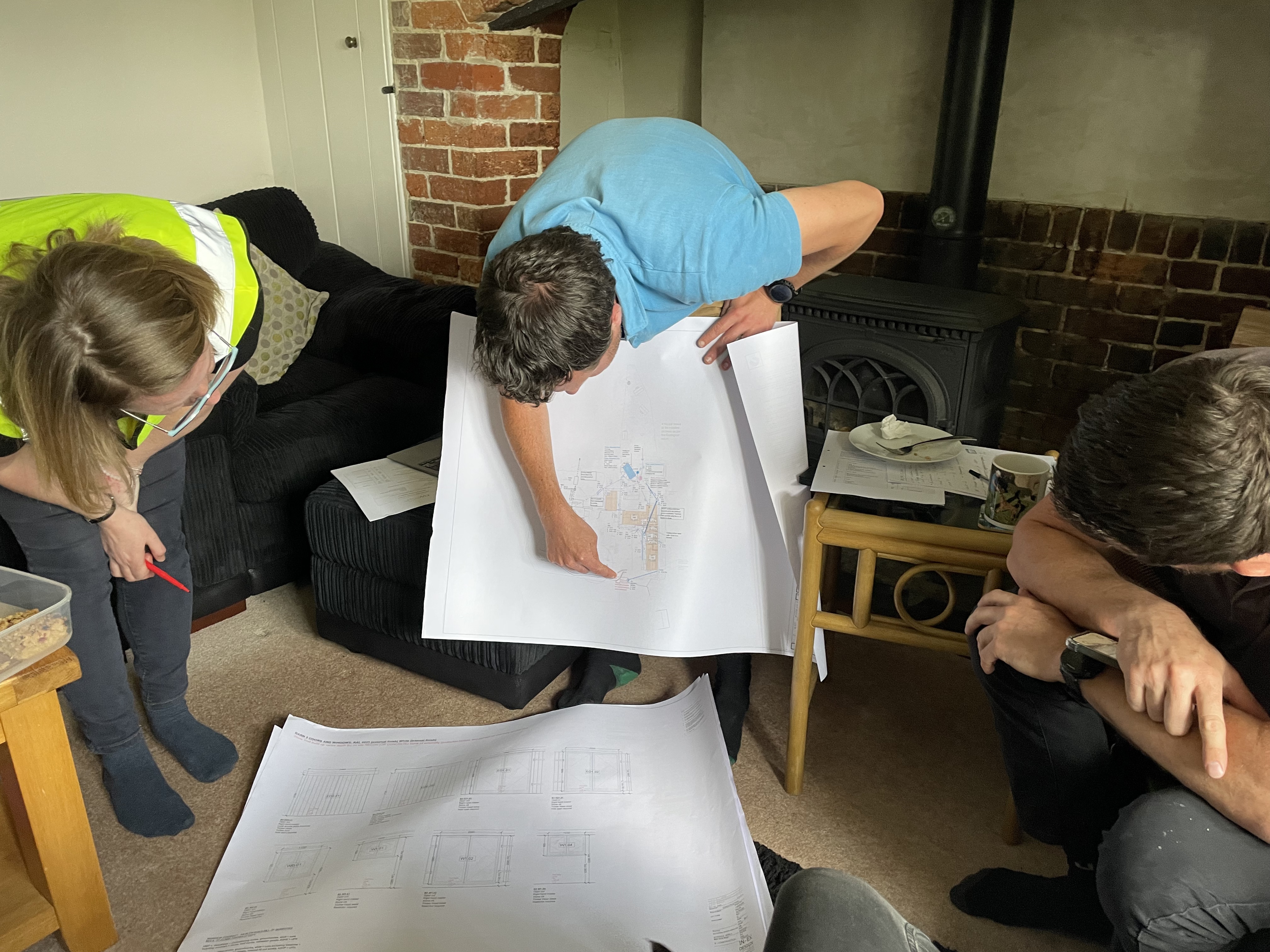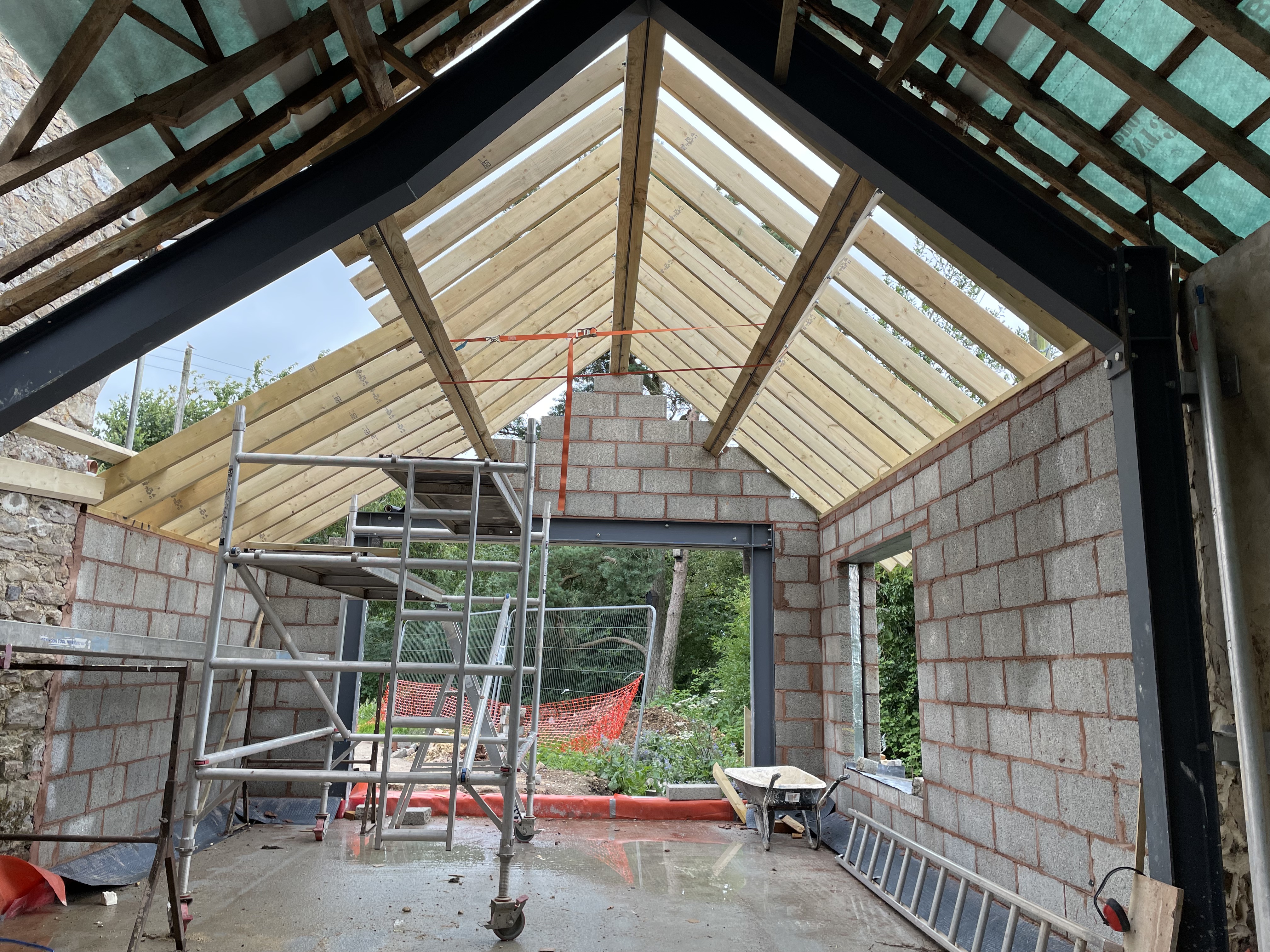 With everything going on, it’s been very useful having our monthly site meetings to catch up on everything that’s happened and is coming up – particularly having forewarning of the decisions we need to make. These tend mostly to be decisions on materials or cost options (for example buying more expensive breathable bat felt, vs the cheaper bat felt but requiring more vents in the roof). We’re generally not indecisive people, but with so little time available, we’re finding it hard to reach a conclusion in many areas until the last minute. Probably not a bad thing for our builders though, who have had to put up with storing those materials we have bought ahead and working around them, as we simply don’t have room for them in the farmhouse.