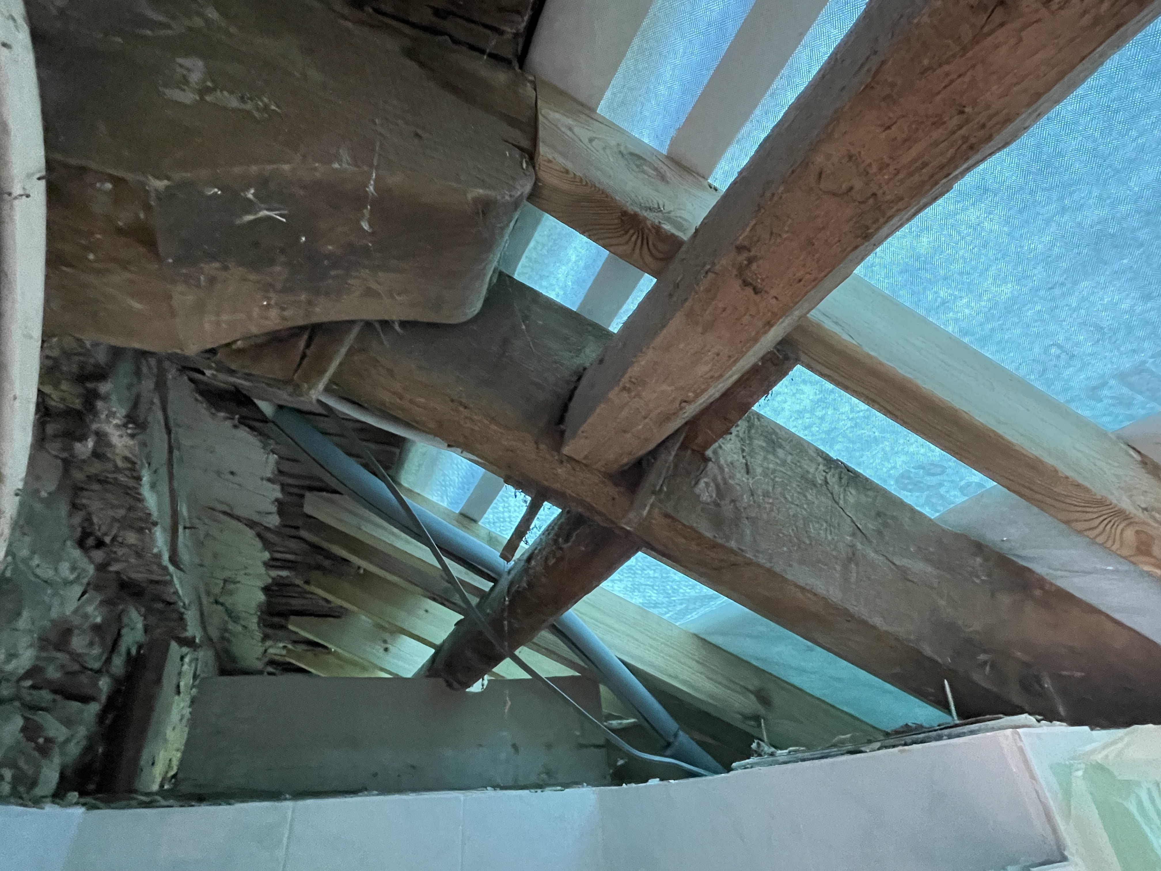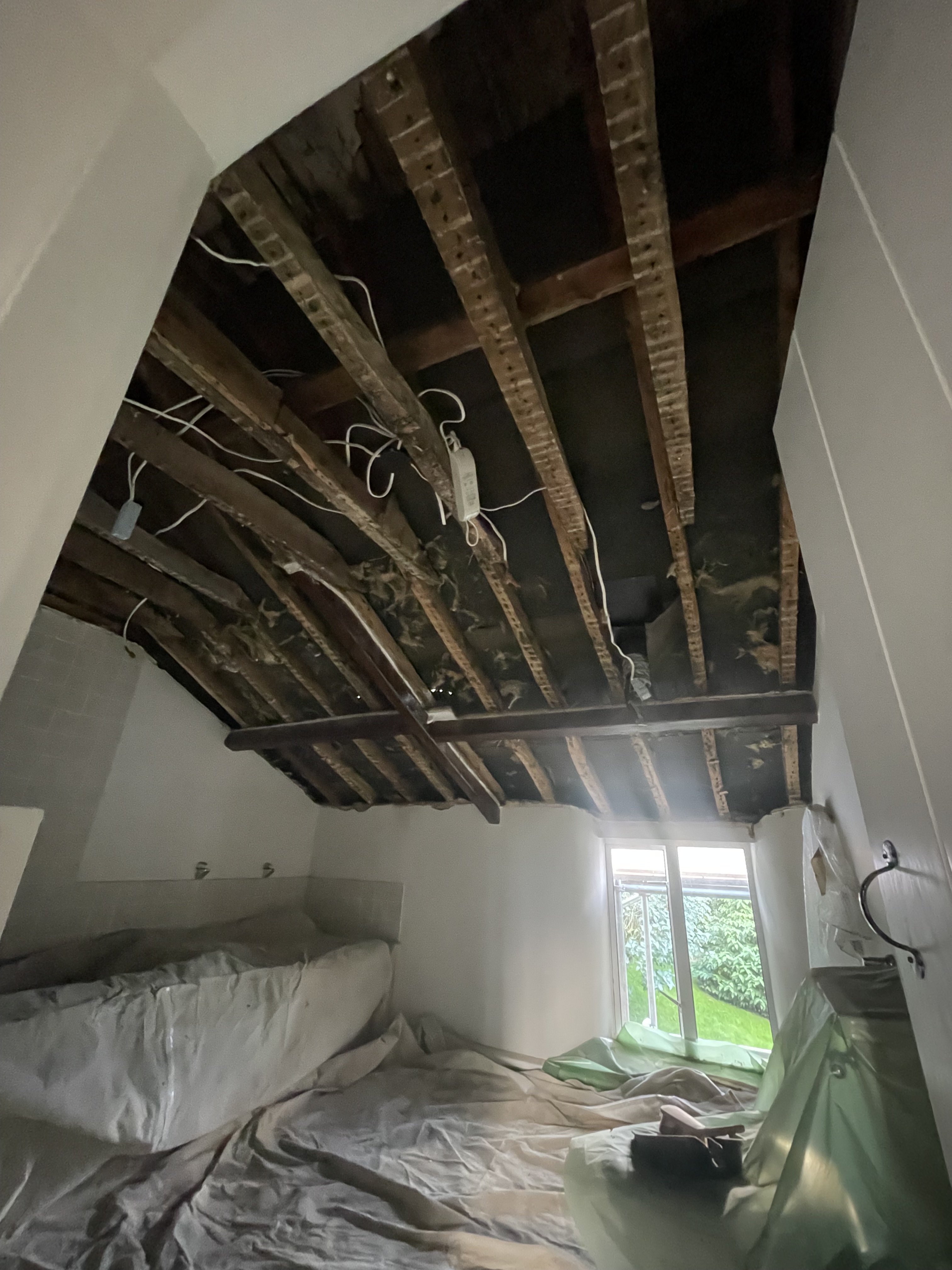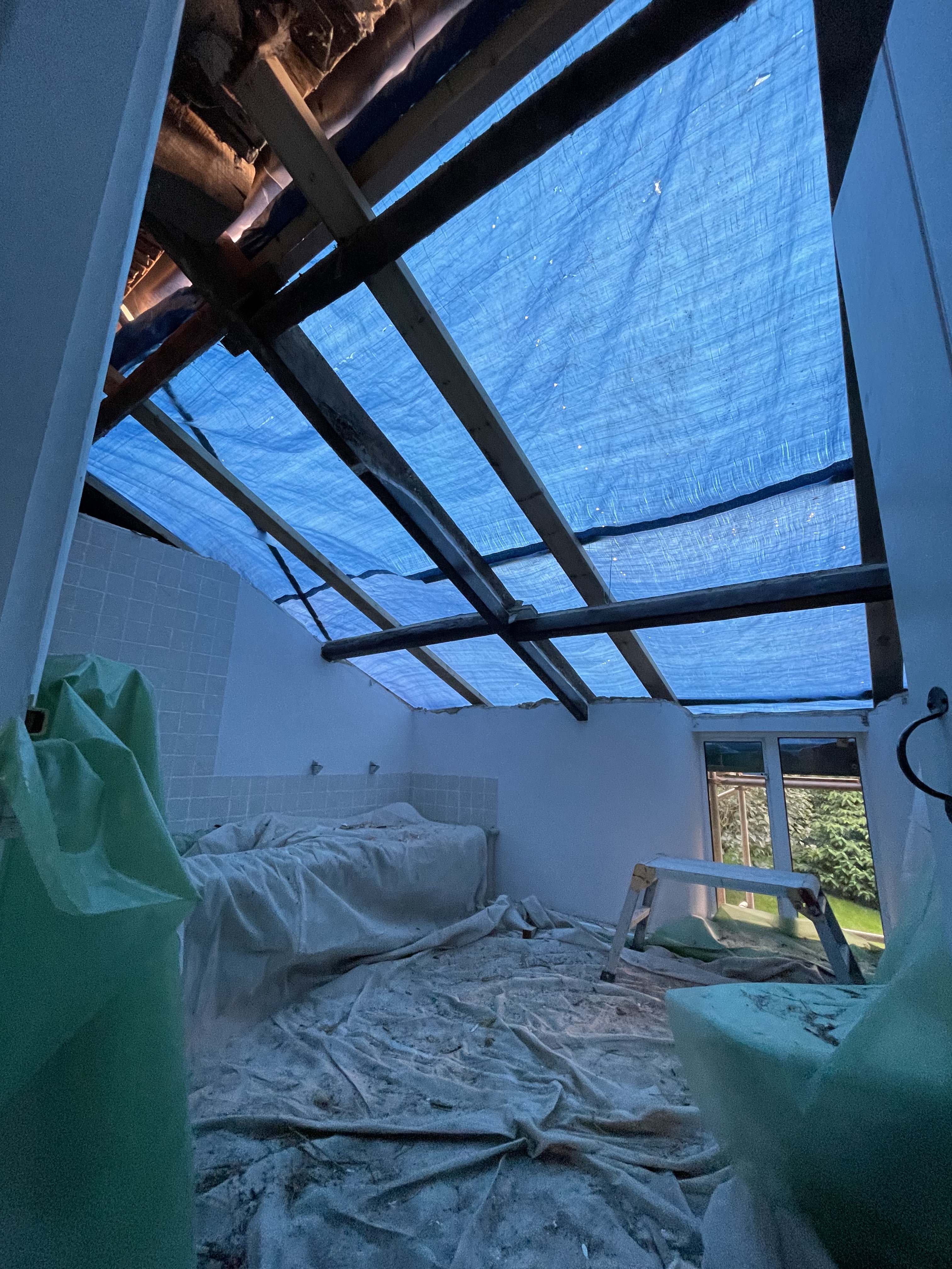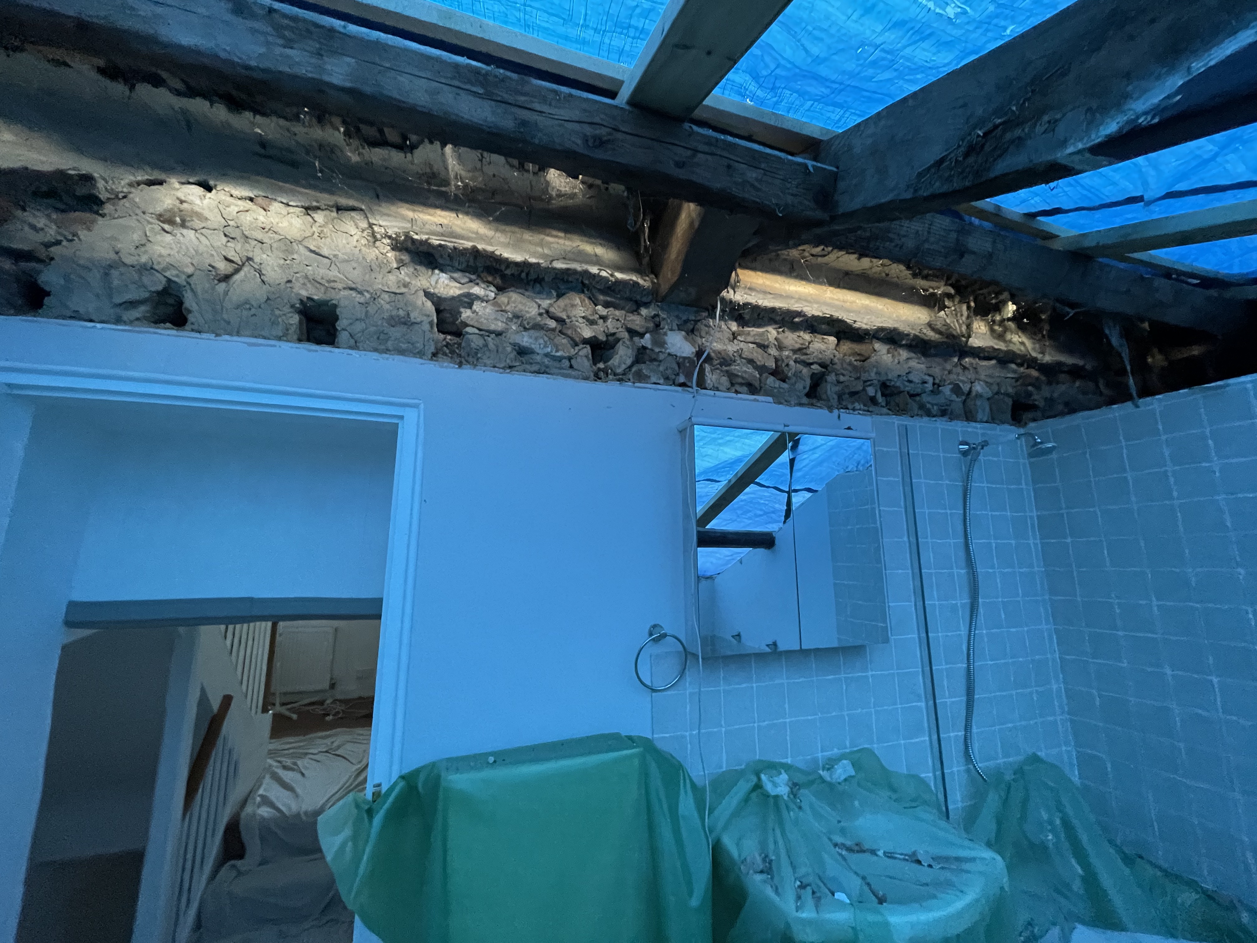 This was the week our builders started replacing the rotten bathroom & ensuite roof on the farmhouse. We hadn’t expected to have to do this, but when the asbestos tiles were taken off to be switched out for slate tiles, an investigation established that the rafters had badly rotted and would only last a couple of years. It felt less disruptive to replace the rafters now while the house was in disarray anyway, rather than wait until the roof started sagging and potentially have to miss out on holiday bookings, and so at the start of the week, the electricians isolated the circuits and removed the lights from the rooms, and the builders covered them with green plastic and dust sheets. By the end of Tuesday, they’d removed the internal ceiling and insulation in the bathroom, and on Wednesday the entire roof came off! It’s fascinating to see the wall where the ceiling used to be – old wood joints and beams have been uncovered – although these will likely be covered up again when the rooms are put back together. The builders have replaced the rafters although we still have temporary felt covering the roof – not ideal on Friday night when a rain shower made its way through the holes and ended up soaking the floors and sheeting (despite our best attempts with buckets and pots).