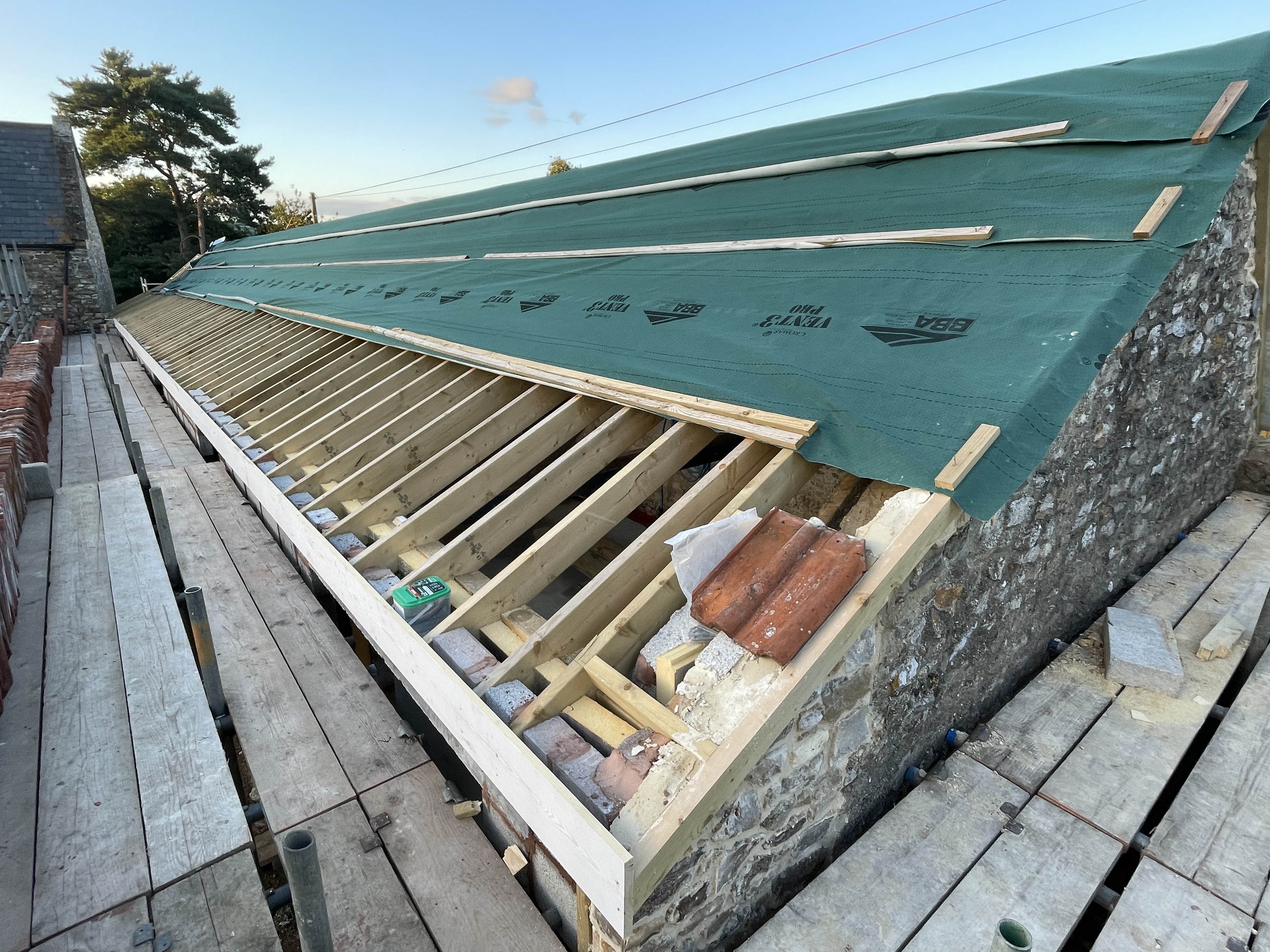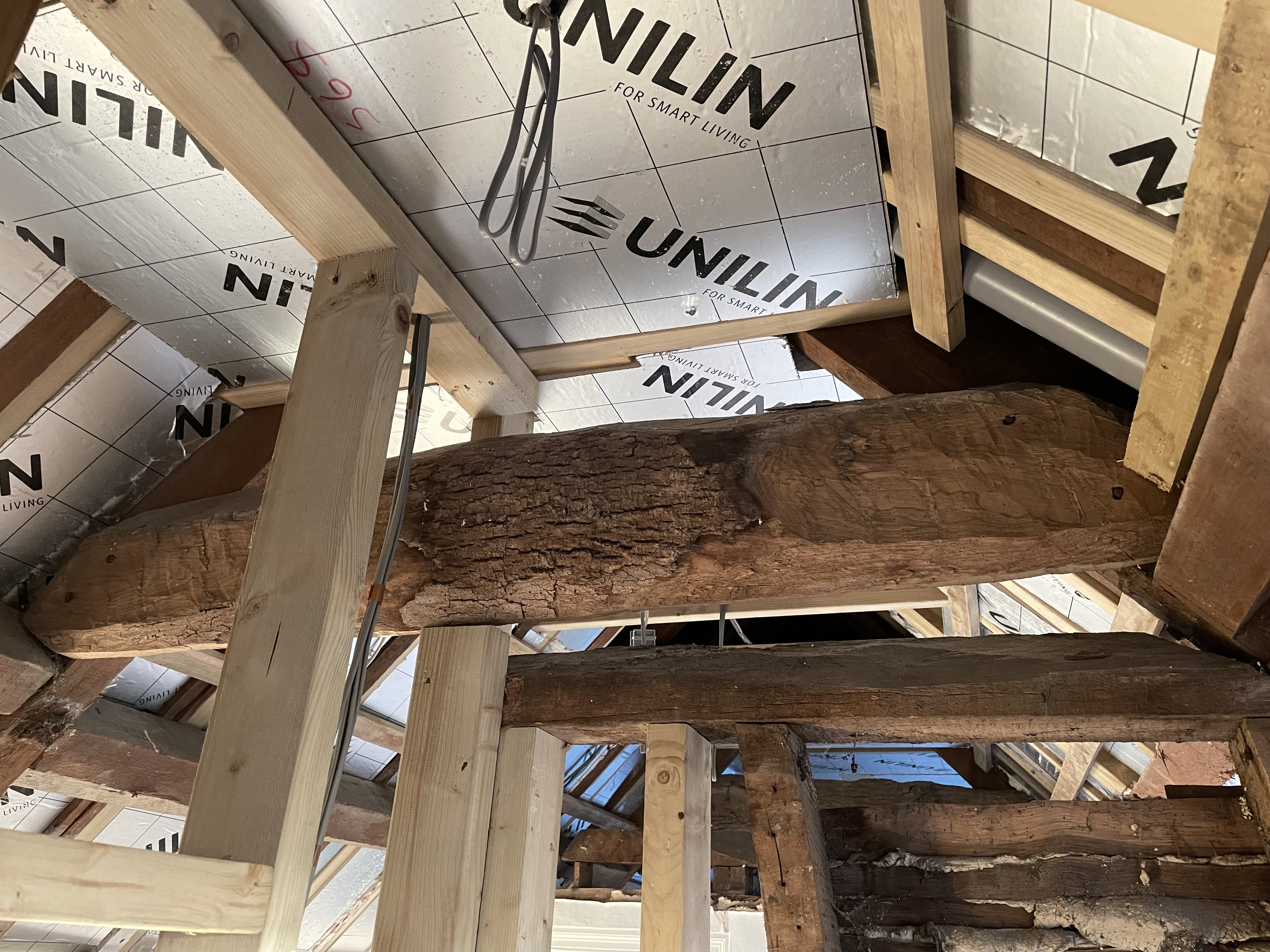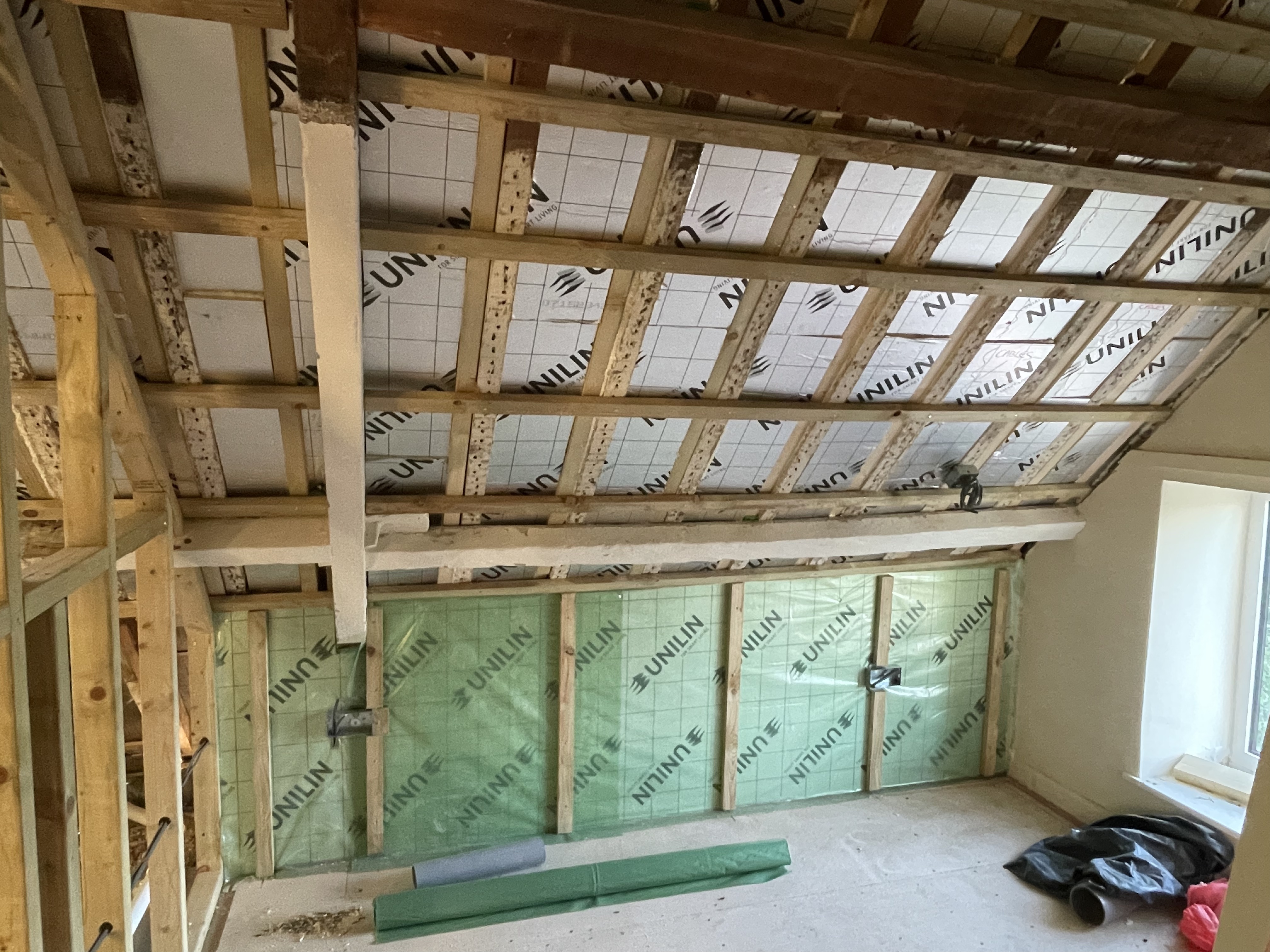 This was the week our builders started replacing the rotten bathroom & ensuite roof on the farmhouse. We hadn’t expected to have to do this, but when the asbestos tiles were taken off to be switched out for slate tiles, an investigation established that the rafters had badly rotted and would only last a couple of years. It felt less disruptive to replace the rafters now while the house was in disarray anyway, rather than wait until the roof started sagging and potentially have to miss out on holiday bookings, and so at the start of the week, the electricians isolated the circuits and removed the lights from the rooms, and the builders covered them with green plastic and dust sheets. By the end of Tuesday, they’d removed the internal ceiling and insulation in the bathroom, and on Wednesday the entire roof came off! It’s fascinating to see the wall where the ceiling used to be – old wood joints and beams have been uncovered – although these will likely be covered up again when the rooms are put back together. The builders have replaced the rafters although we still have temporary felt covering the roof – not ideal on Friday night when a rain shower made its way through the holes and ended up soaking the floors and sheeting (despite our best attempts with buckets and pots).