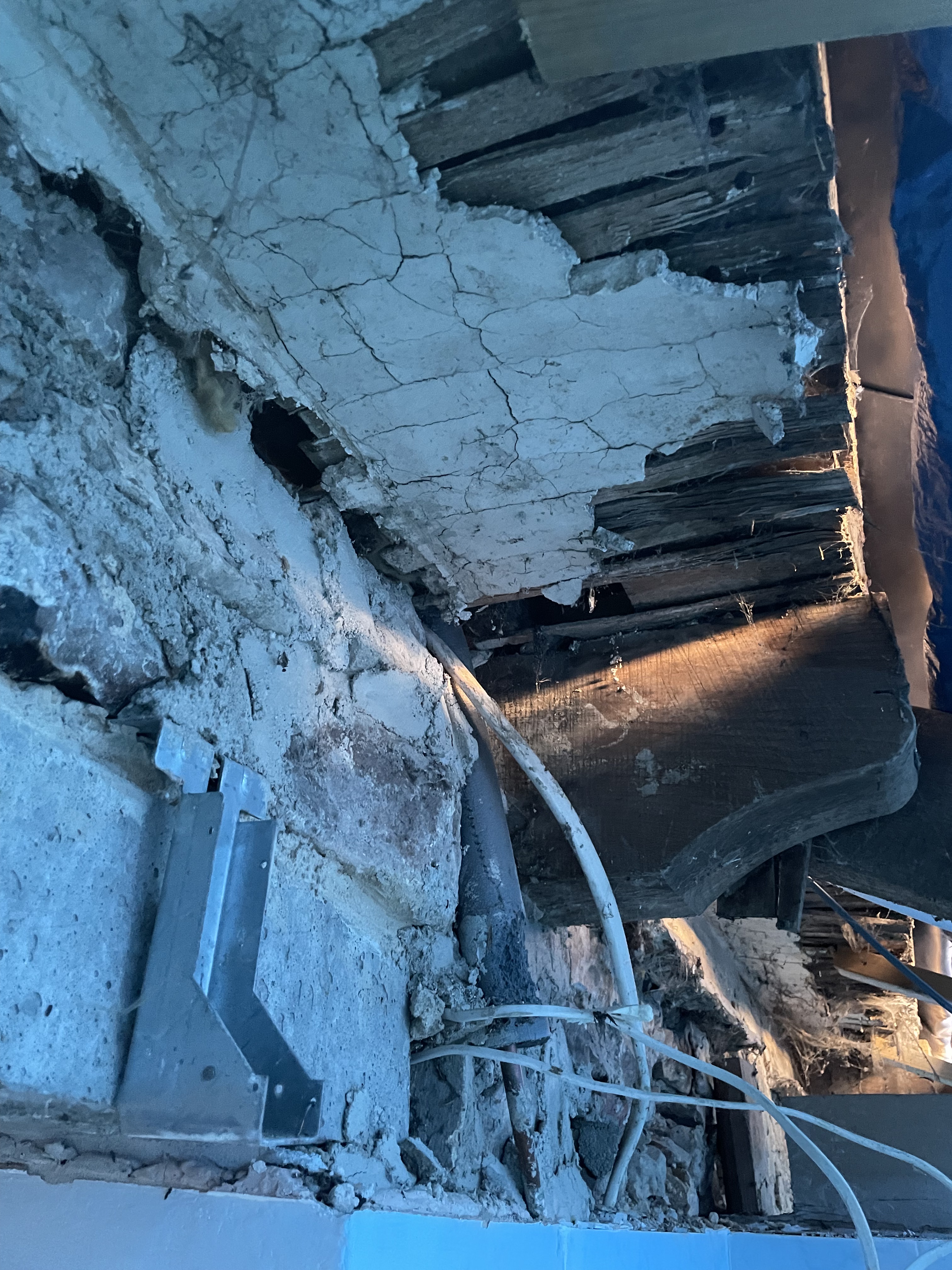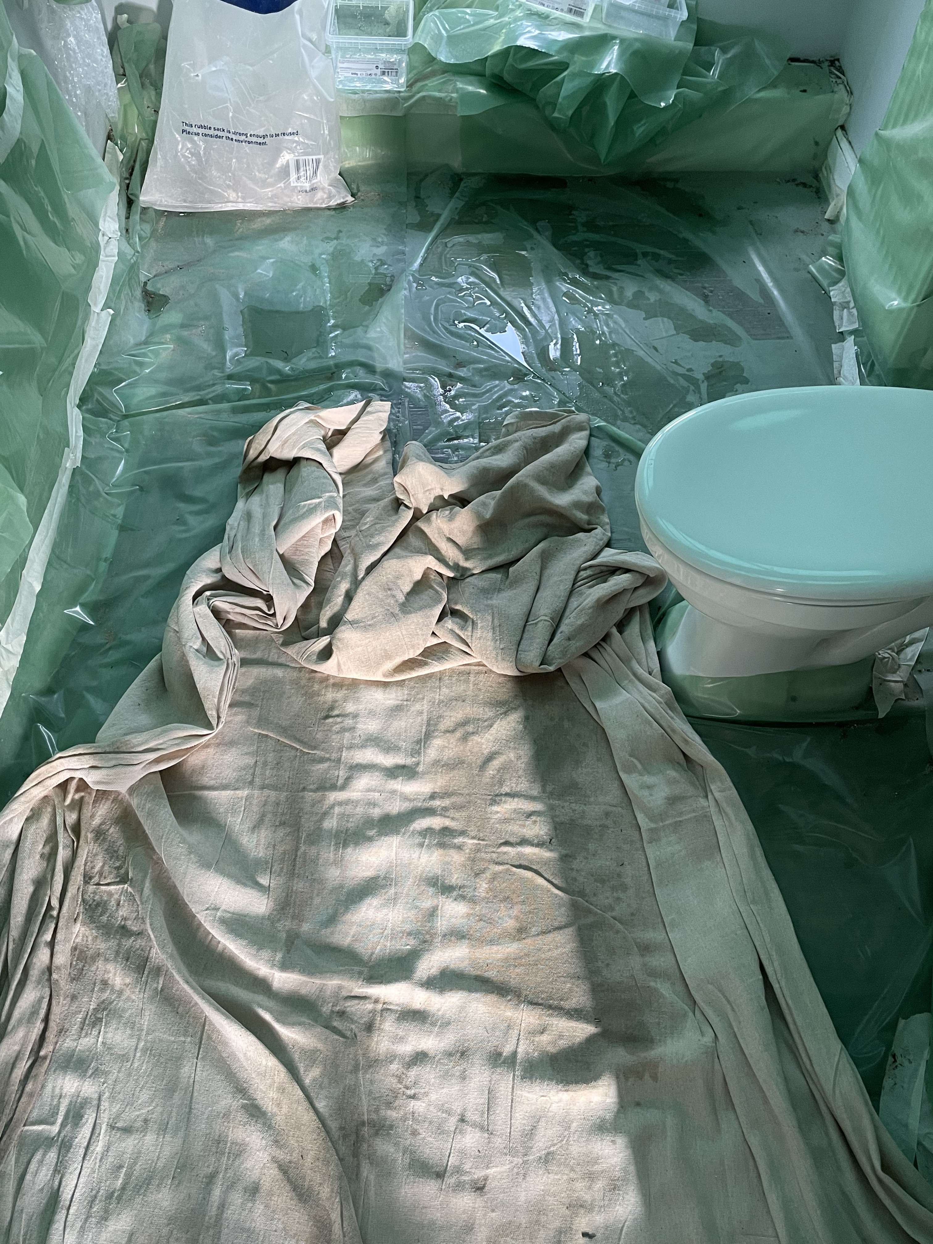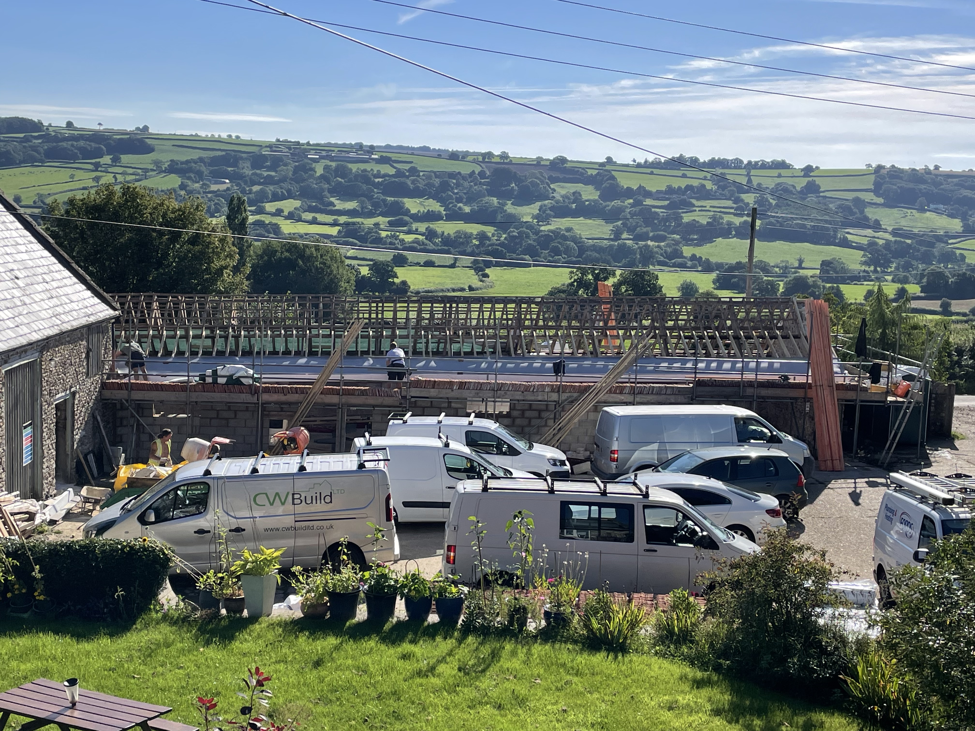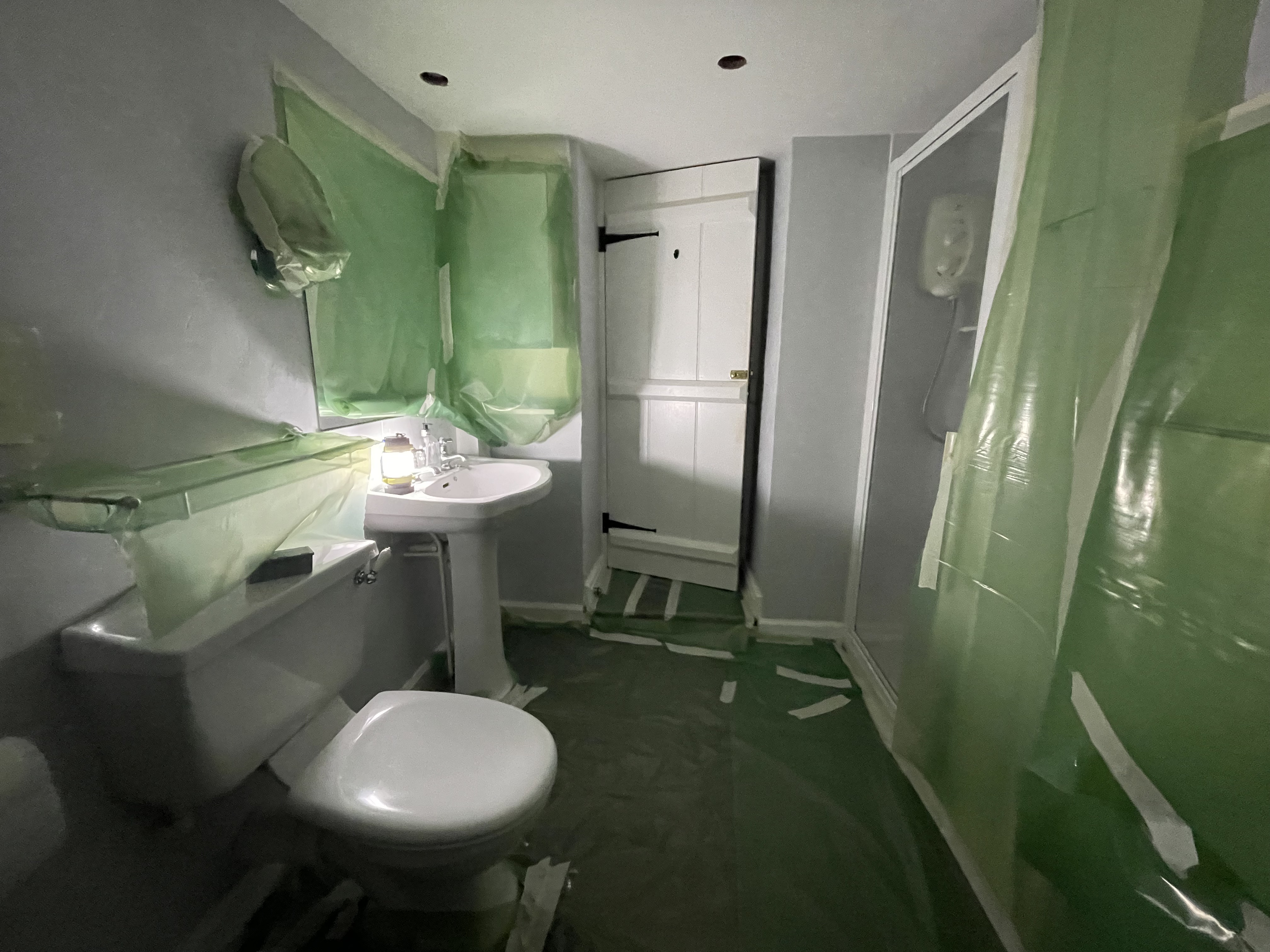 This was the week our builders started replacing the rotten bathroom & ensuite roof on the farmhouse. We hadn’t expected to have to do this, but when the asbestos tiles were taken off to be switched out for slate tiles, an investigation established that the rafters had badly rotted and would only last a couple of years. It felt less disruptive to replace the rafters now while the house was in disarray anyway, rather than wait until the roof started sagging and potentially have to miss out on holiday bookings, and so at the start of the week, the electricians isolated the circuits and removed the lights from the rooms, and the builders covered them with green plastic and dust sheets. By the end of Tuesday, they’d removed the internal ceiling and insulation in the bathroom, and on Wednesday the entire roof came off! It’s fascinating to see the wall where the ceiling used to be – old wood joints and beams have been uncovered – although these will likely be covered up again when the rooms are put back together. The builders have replaced the rafters although we still have temporary felt covering the roof – not ideal on Friday night when a rain shower made its way through the holes and ended up soaking the floors and sheeting (despite our best attempts with buckets and pots).