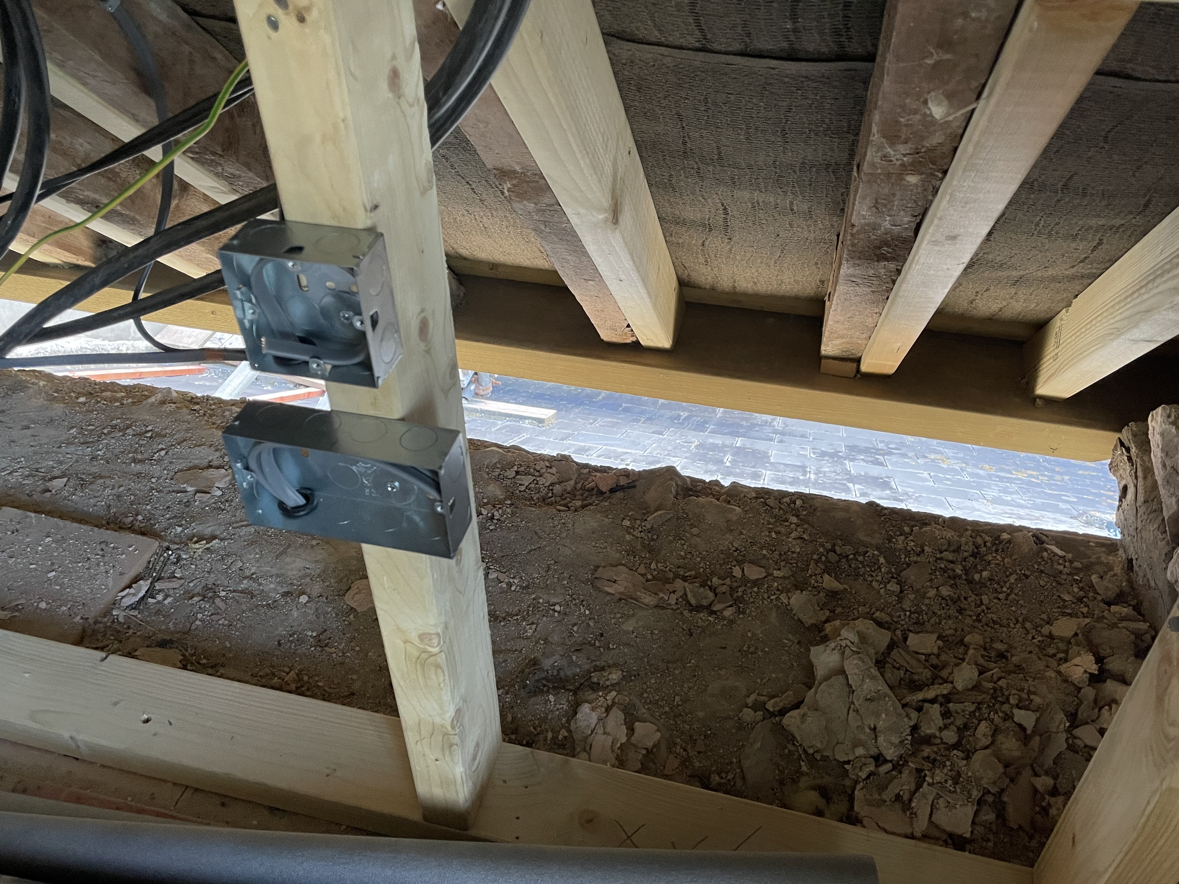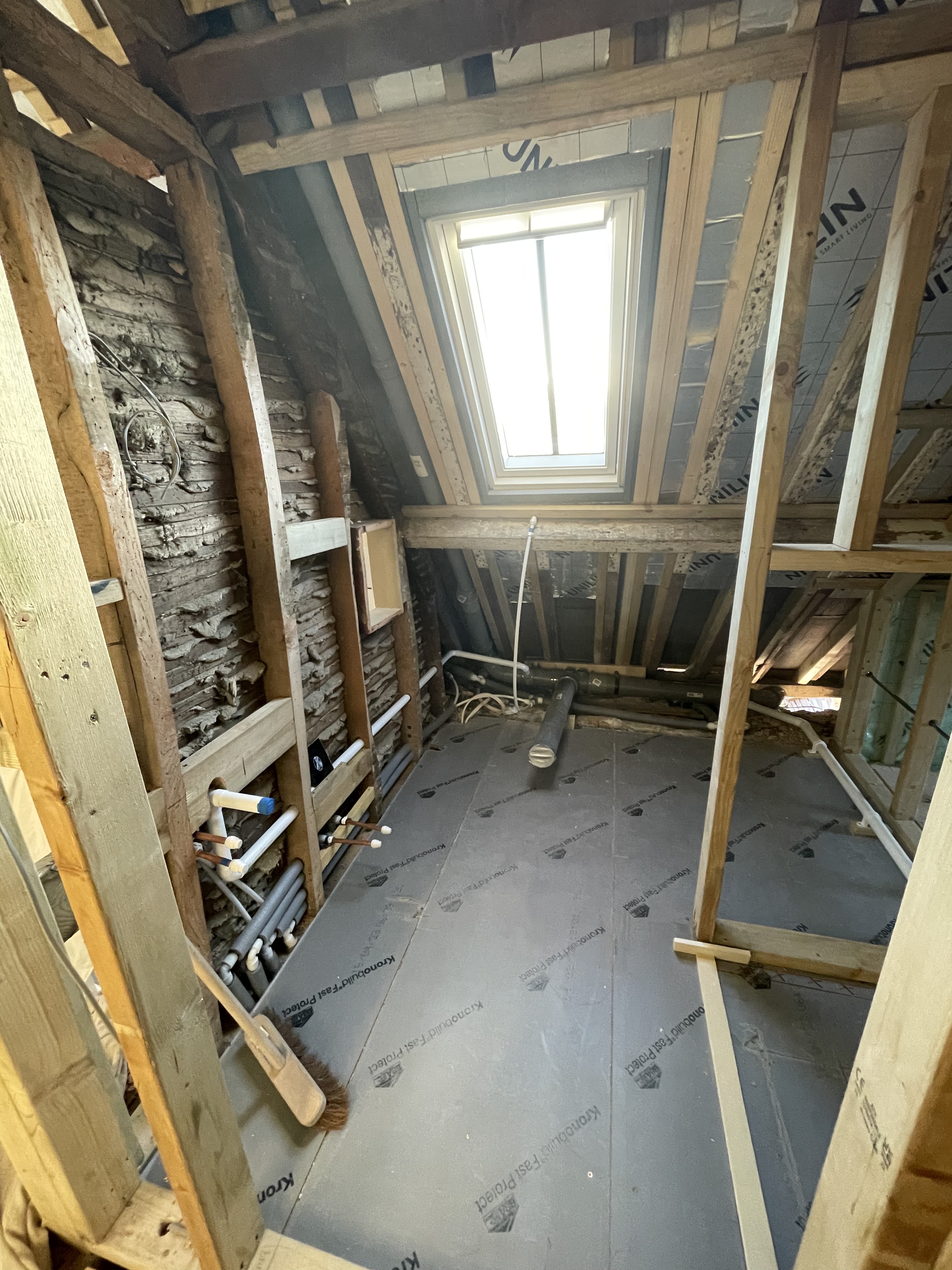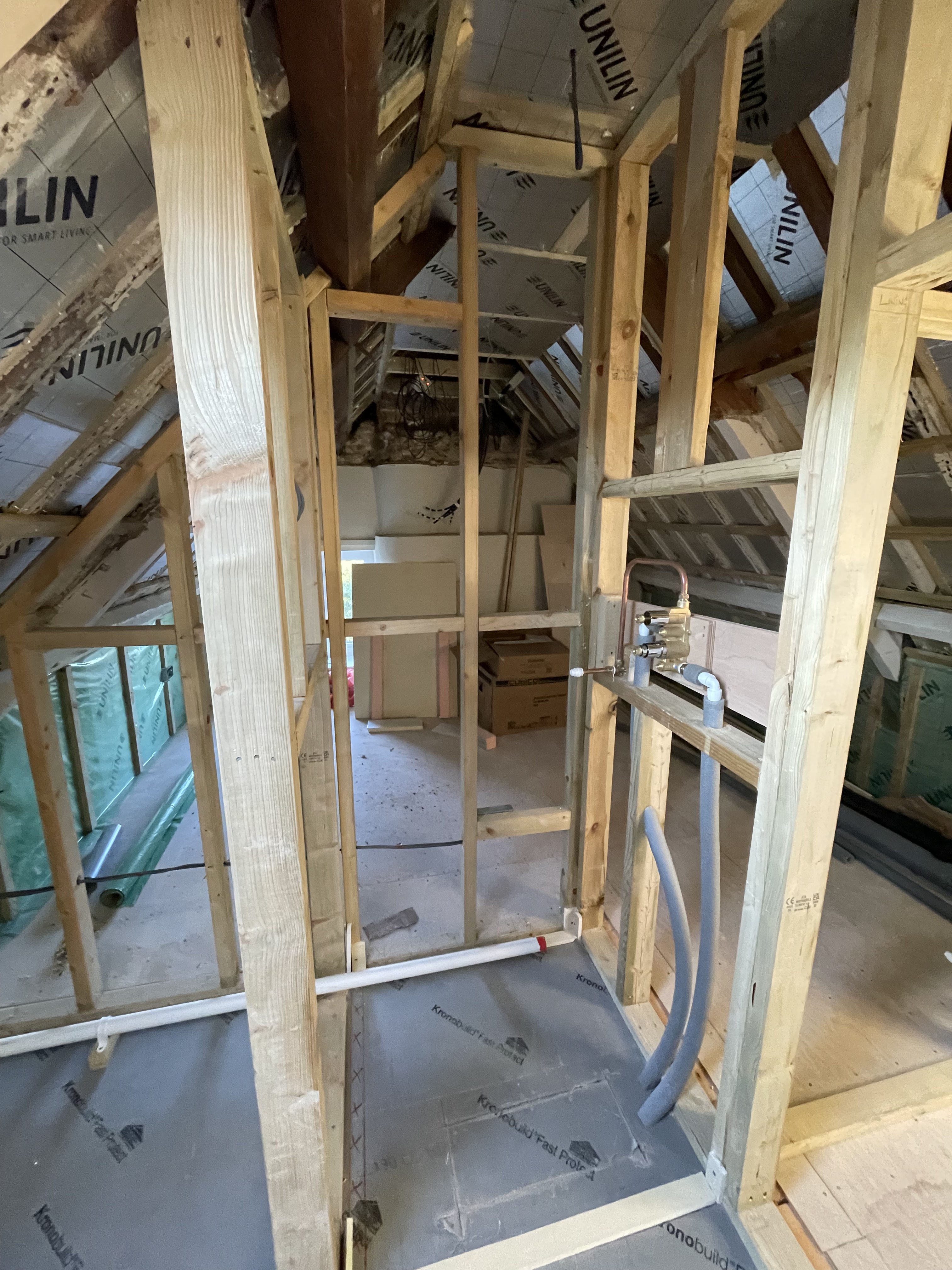 The top floor of the farmhouse is taking shape – the rooms have been fully insulated, the electric backplates have been fitted, and the stud wall around our shower has been put in. The plumbers have started work too, installing the plumbing for the sink and shower and even putting the shower controls in. The rooms feel deceptively large still – once the walls are built out with plasterboard we’ll get a better feel for the size. It’s really exciting to see the progress.