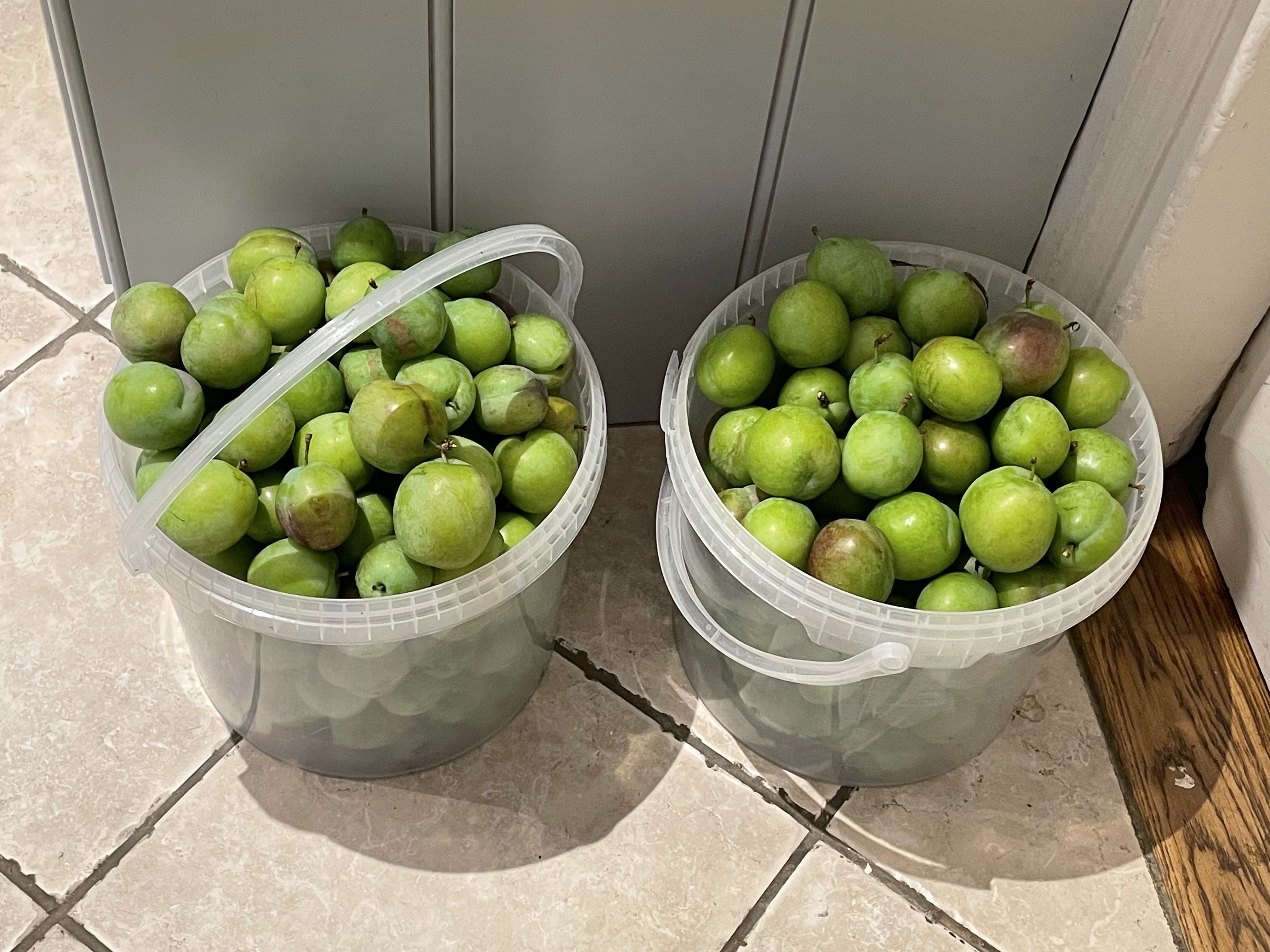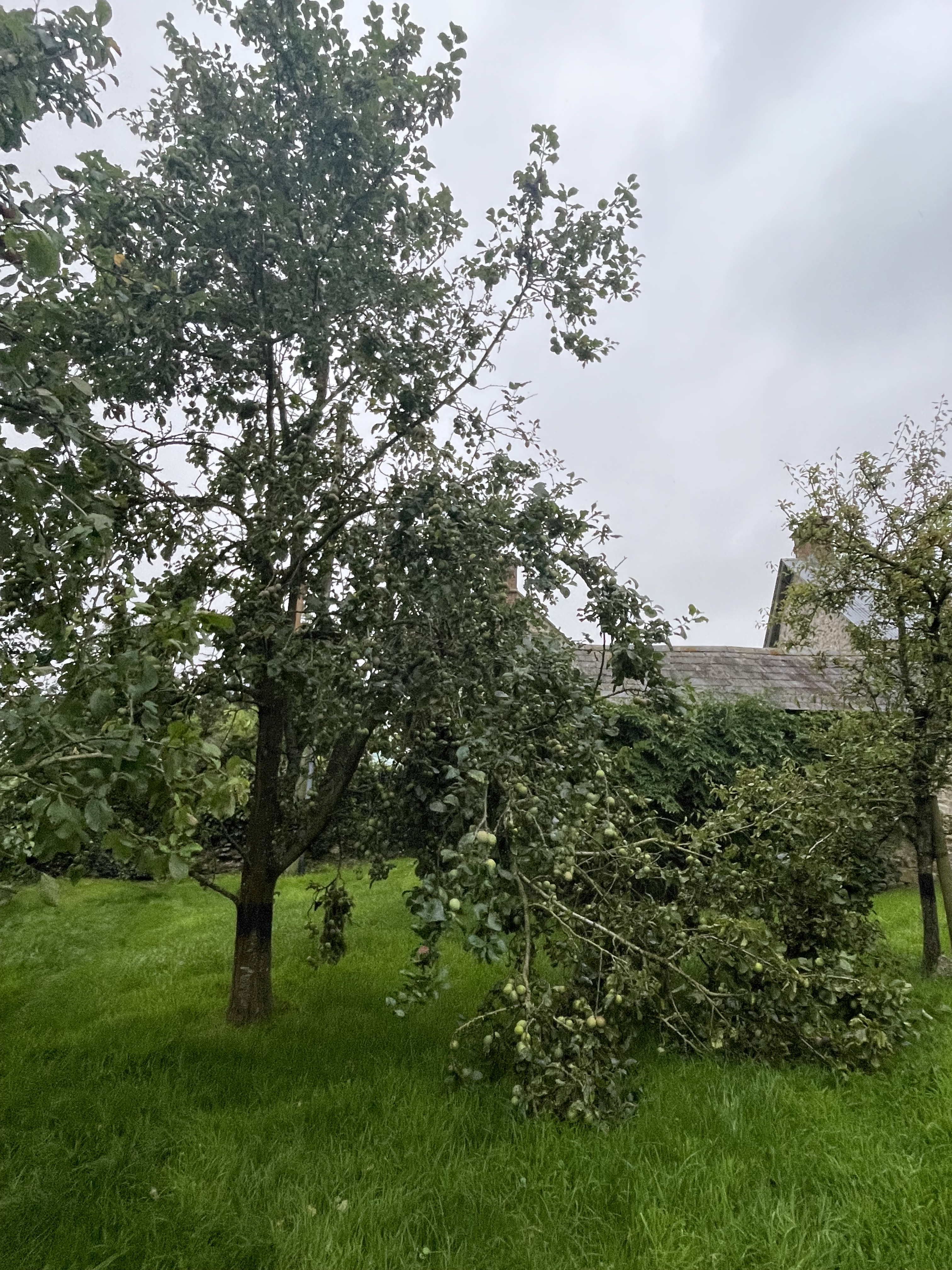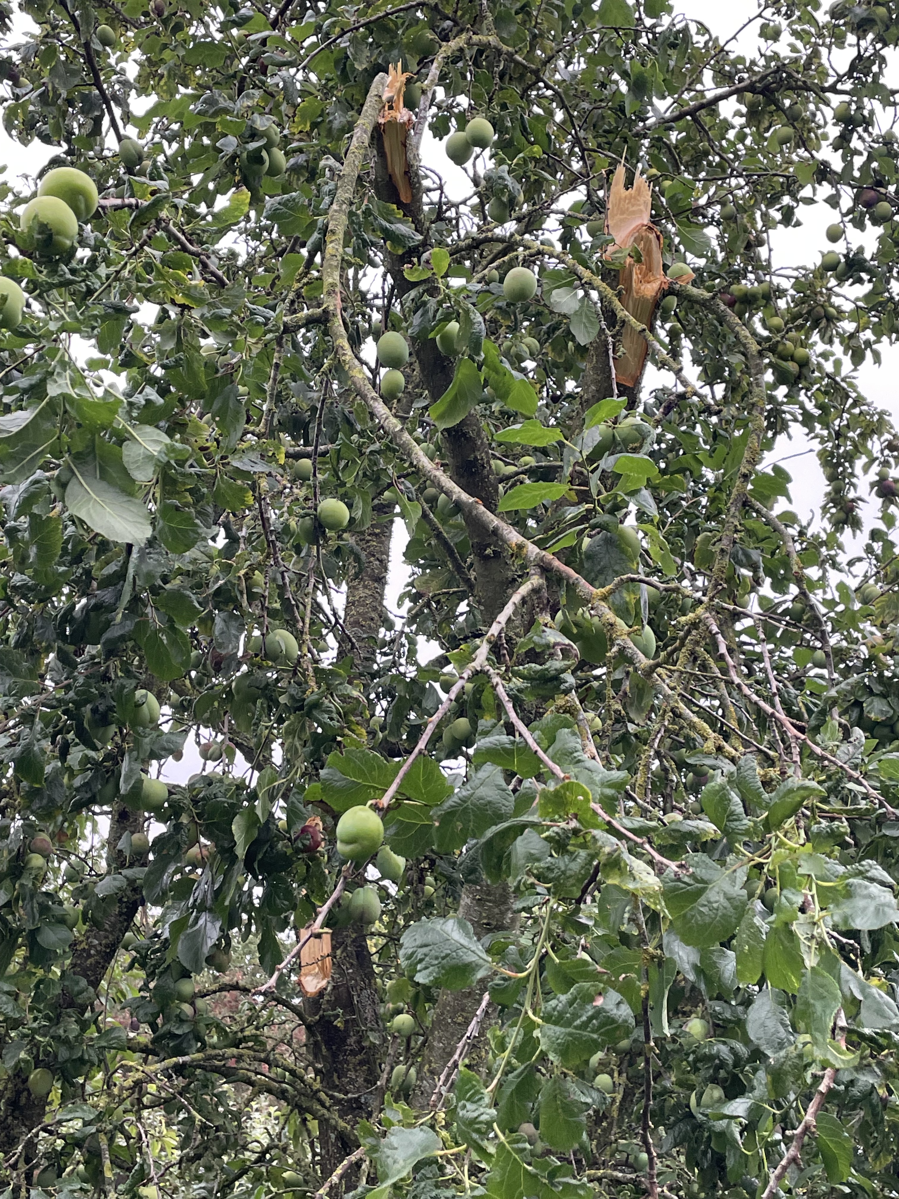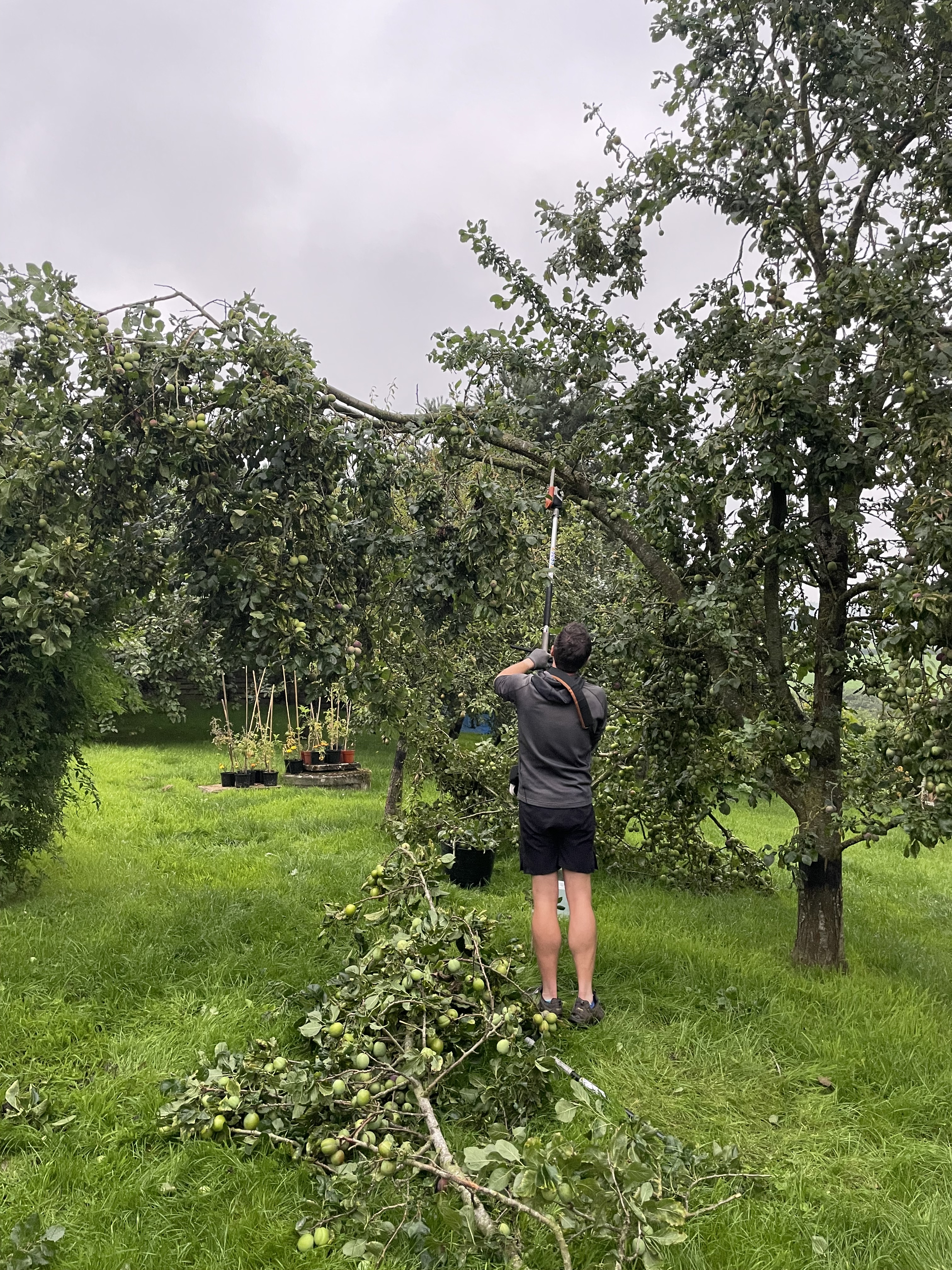Friday morning saw some emergency pruning – overnight we’d lost branches off two of our plum trees (one a major branch that was full of fruit and had almost snapped off, but was lying on another branch). We had to cut it off before it took any of the rest of the tree with it – and then collect the fruit before the insects took over. We also secured branches on one of the apple trees and the damson tree which were drooping dangerously. We’re just hoping we can protect them until the fruit is ready, so we don’t lose too much.