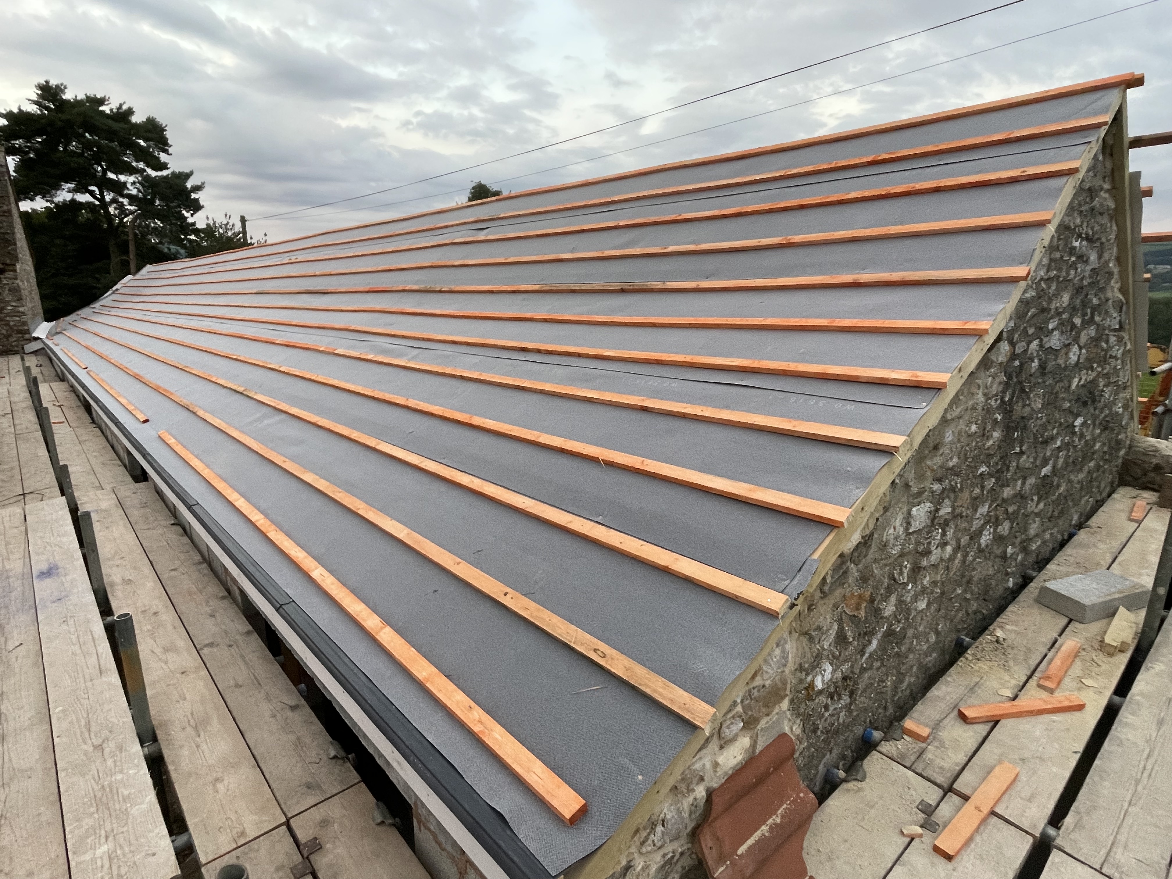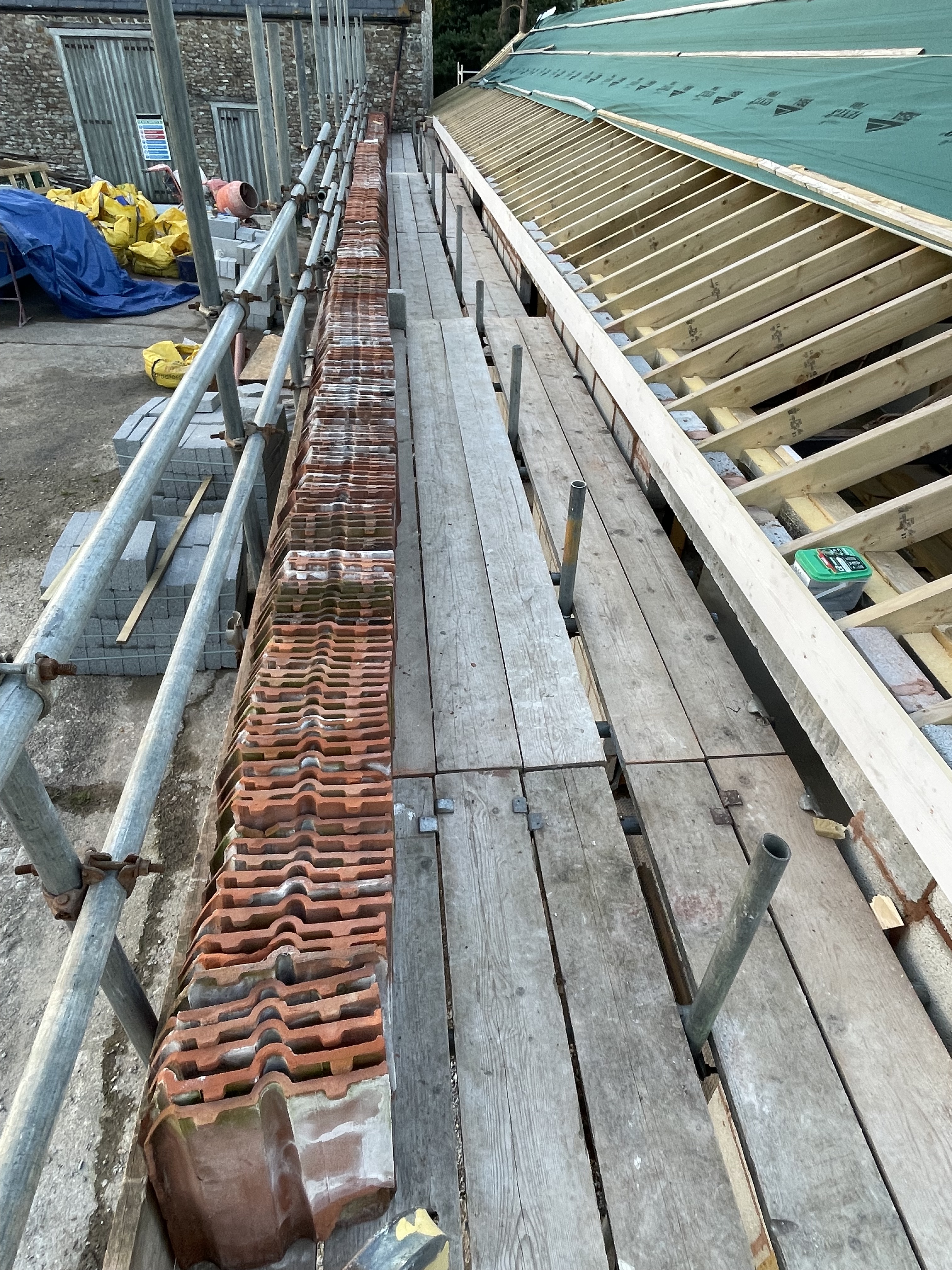 Talking about taking shape – the shippon is coming along nicely. Our stonemasons have finished facing the external walls of the extension with stone, and the roofers have felt and battened the entire roof. When you’re inside, it really feels like a proper building suddenly, rather than a shell. The first clay tiles have been moved onto the scaffolding ready to be fitted next week – it’ll make such a difference once the courtyard isn’t full of tiles.