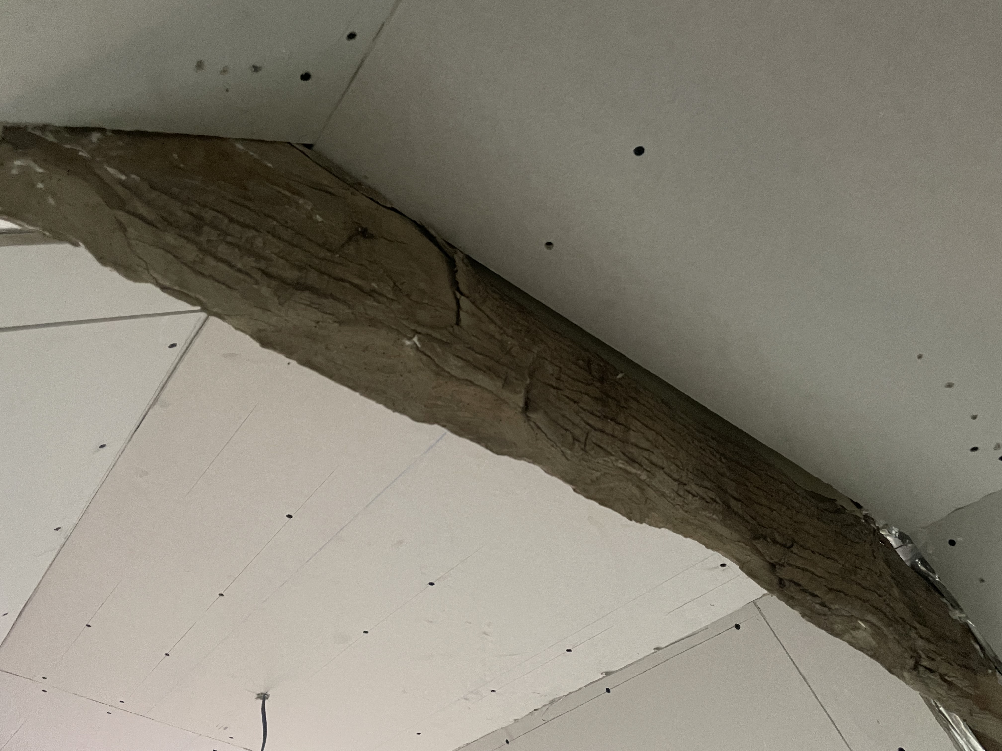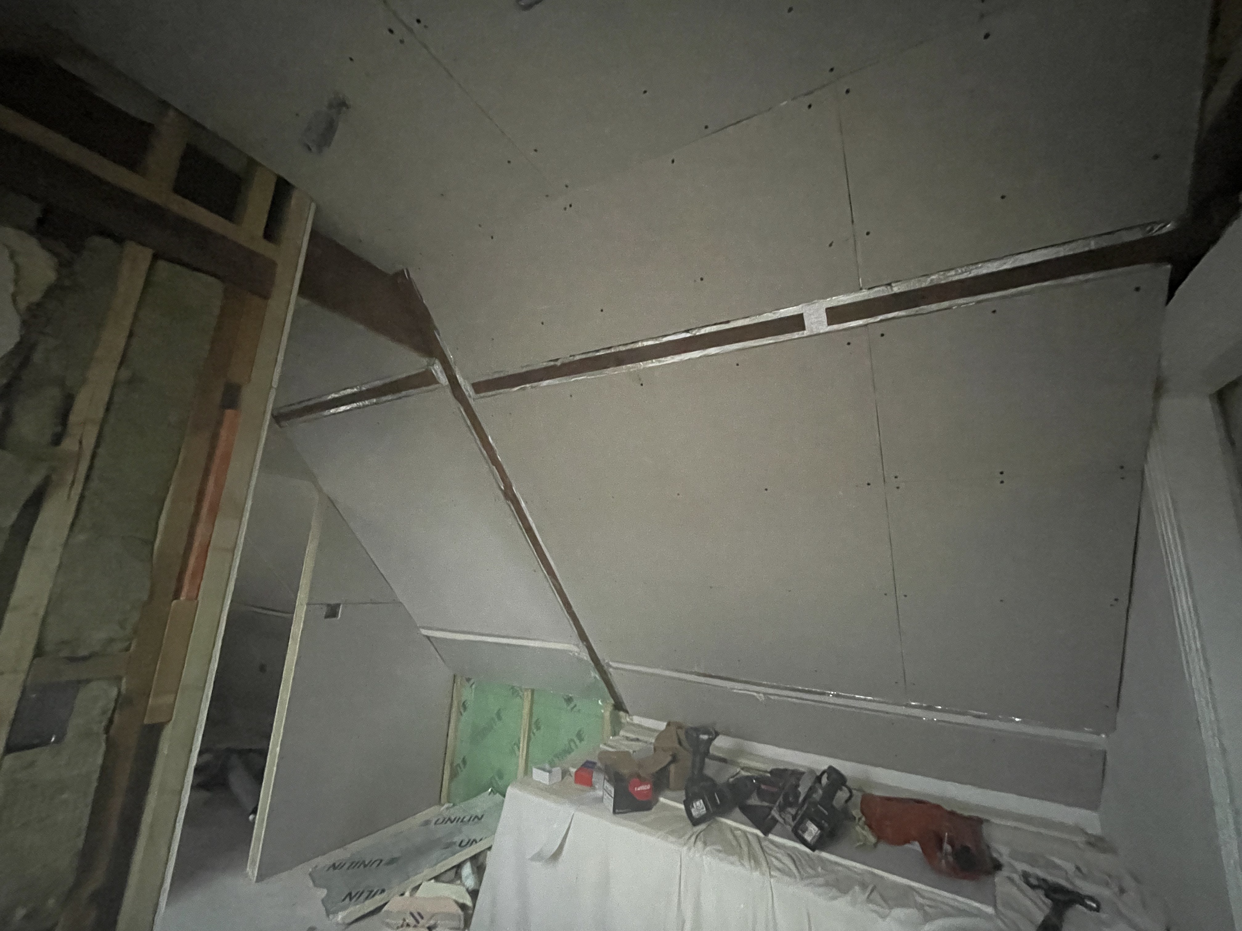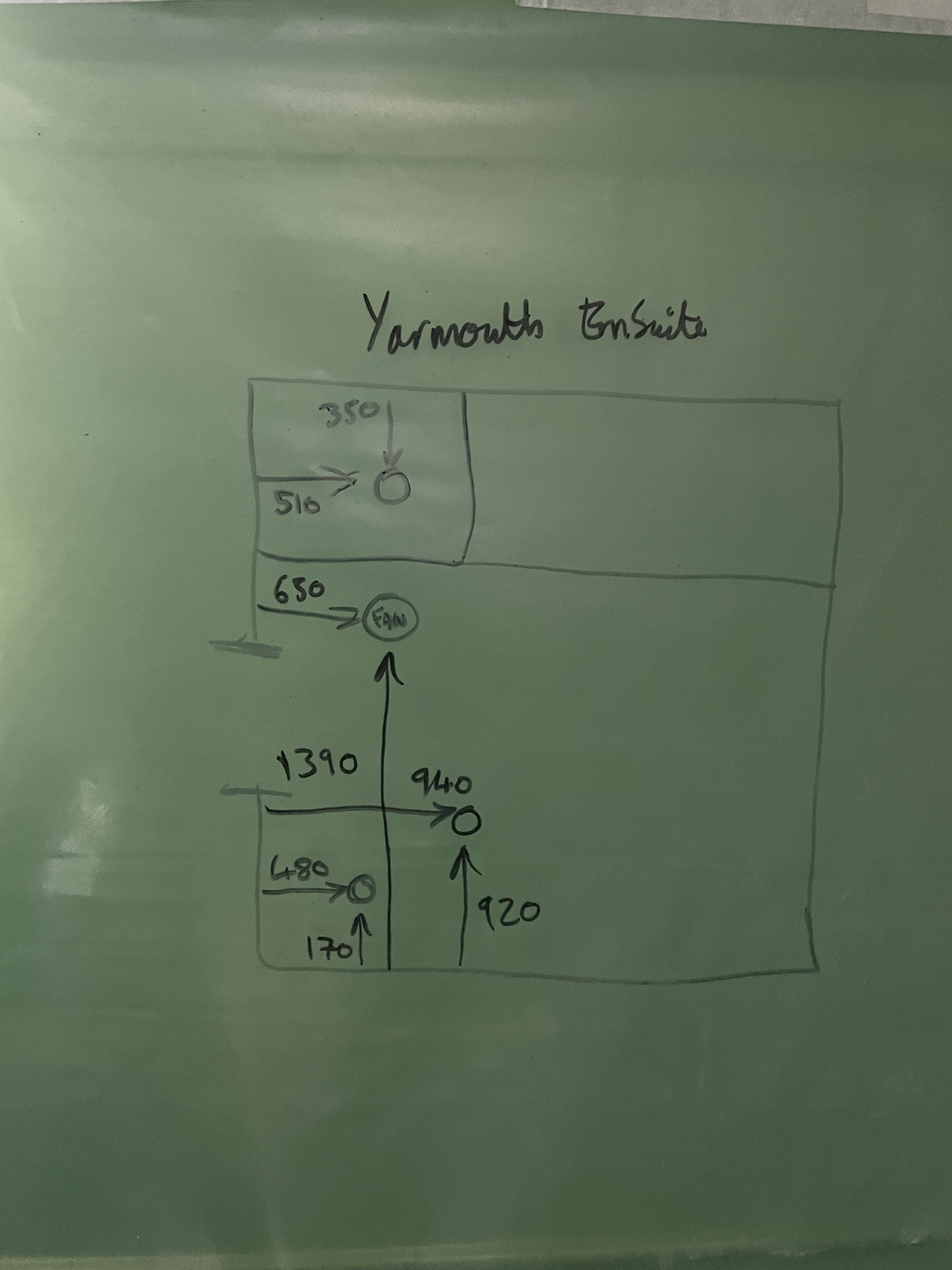 The other main change is in the farmhouse where our builders have installed all the plasterboard in our bathroom, ensuite, and throughout the top floor. They’ve managed to keep a couple of the old beams visible (ones with bark still on the wood) which will help the house retain some of its character. We’re glad they’ve made progress in the bathrooms as it’s been a month now since they were covered with sheeting and green plastic and the novelty has definitely worn off. The electrician started the week by drilling holes for the light fittings and extractor fan into the insulation – we’re intrigued by how they’ll know where these are as they’ve now been boarded over with plasterboard. There’s a lovely little diagram on the green sheeting in our ensuite complete with measurements which may help, however we’ve not discovered anything like this in the bathroom yet. Maybe it just requires a lucky guess!