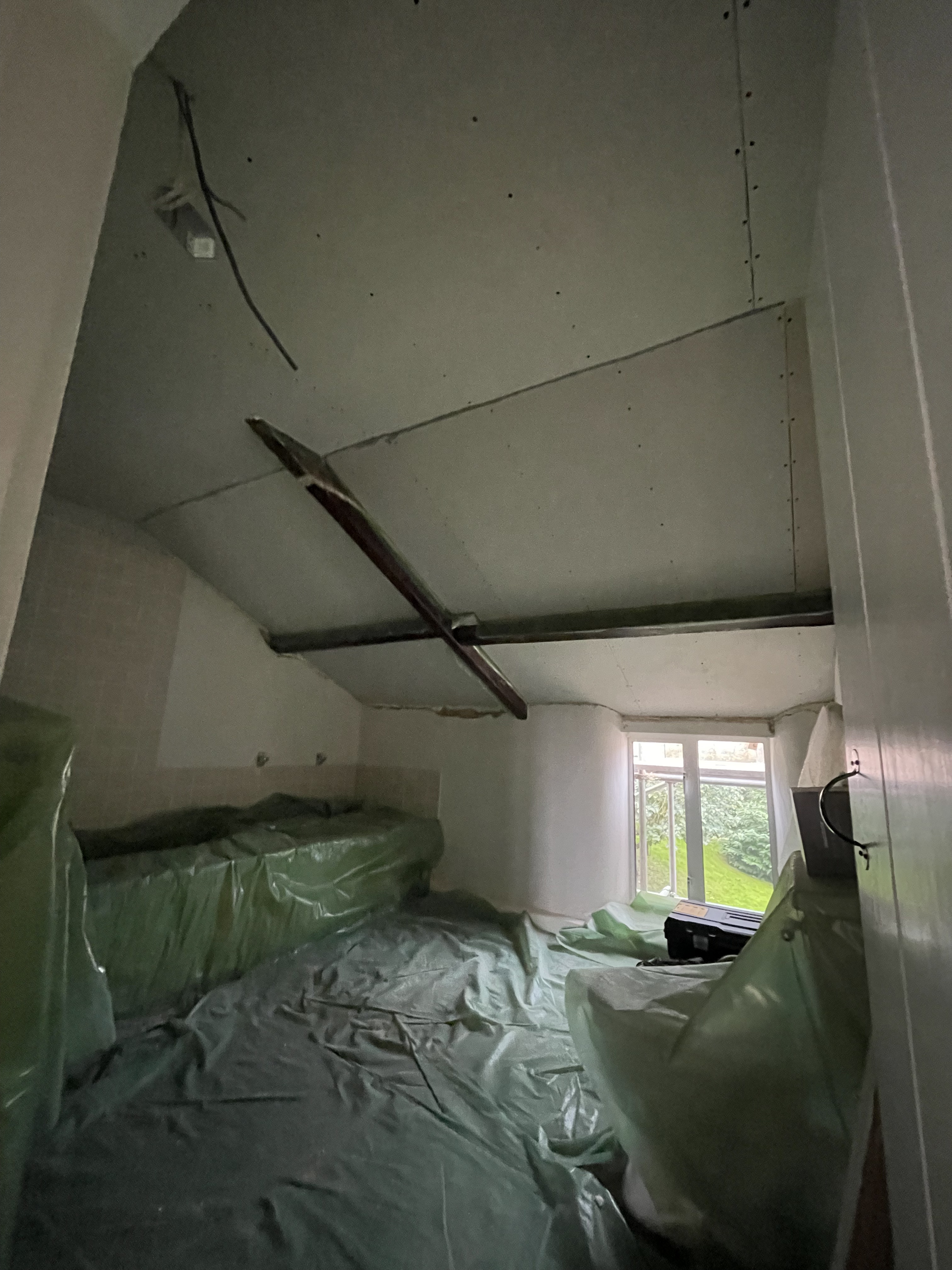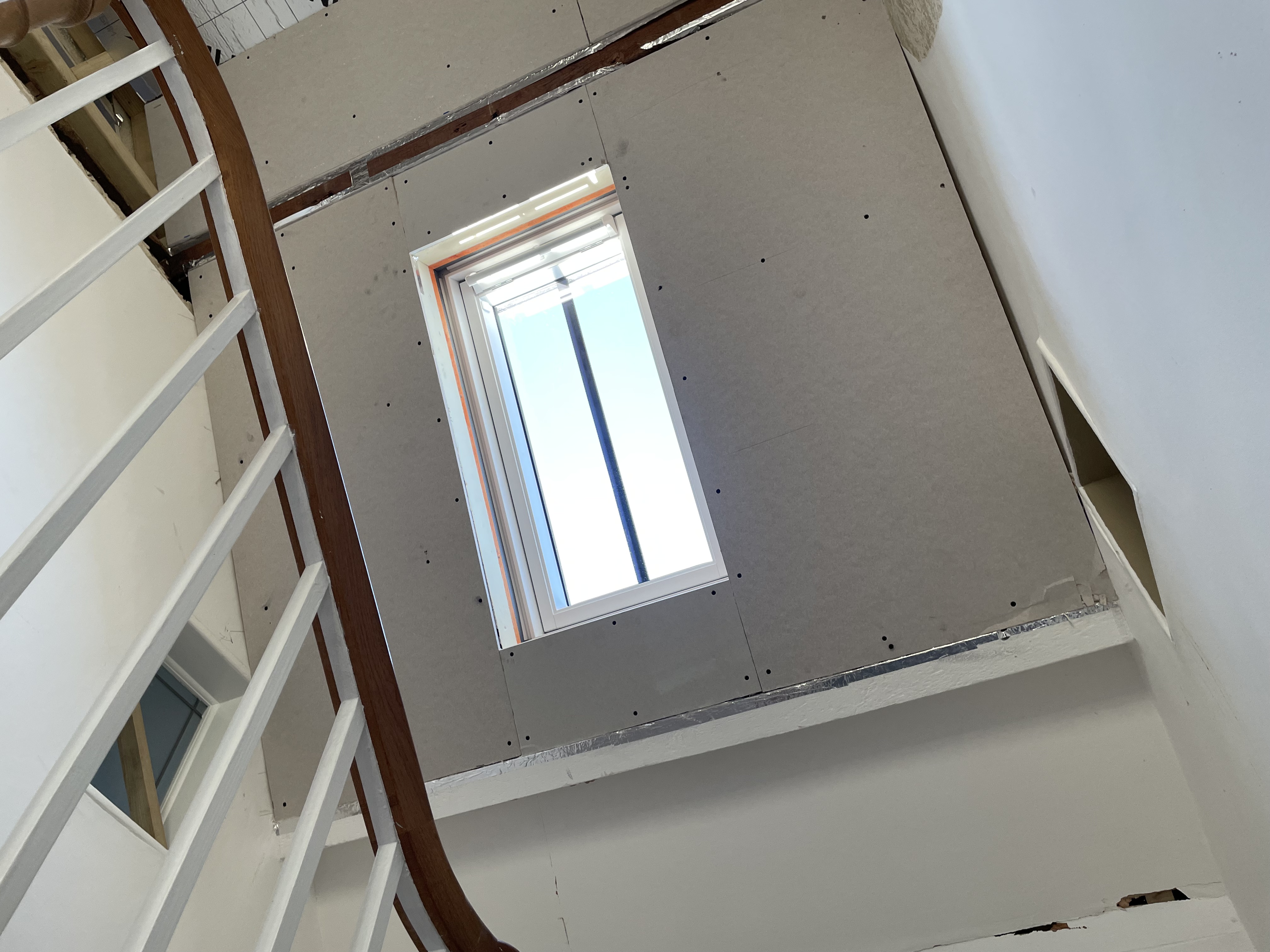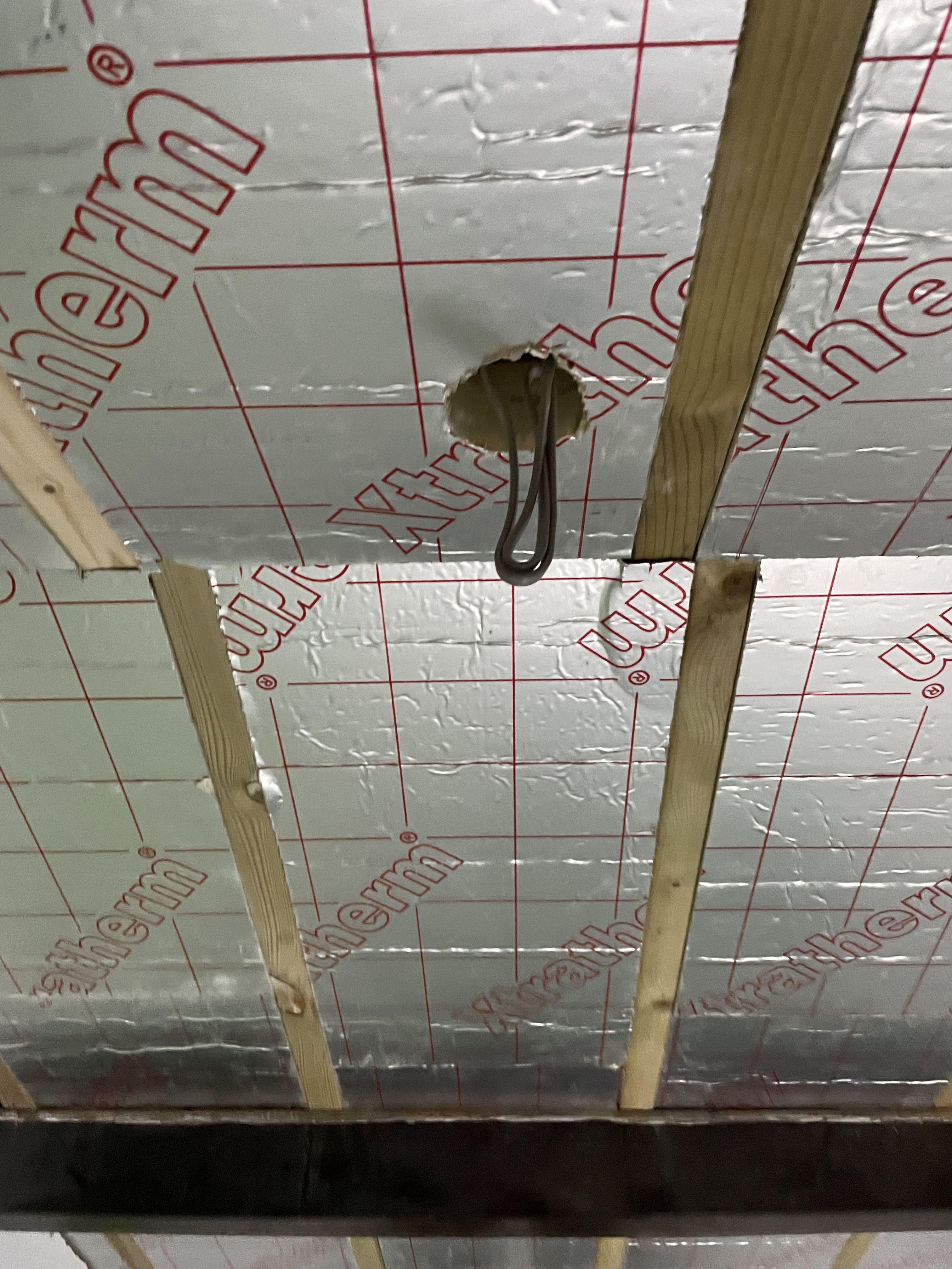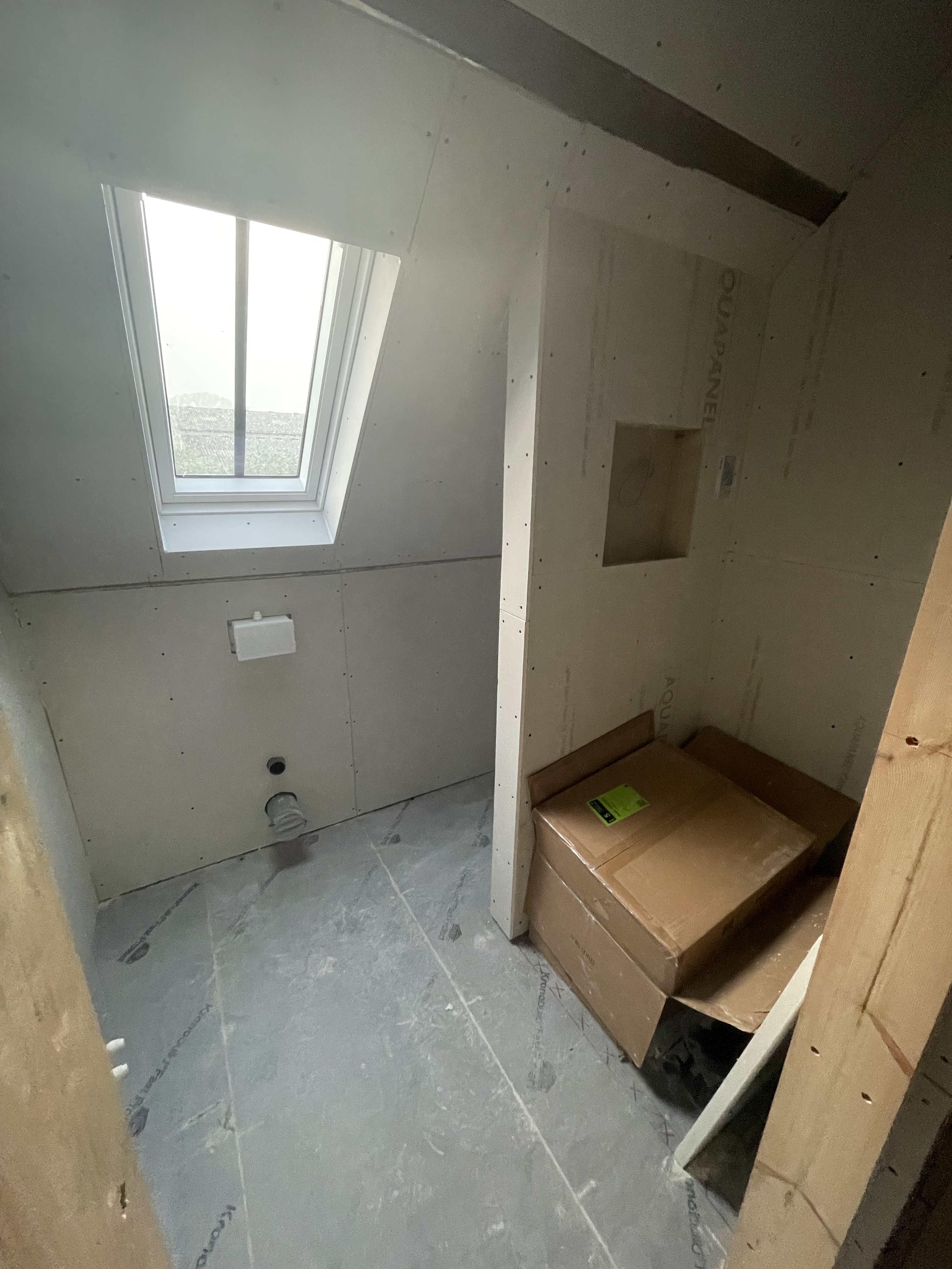 The other main change is in the farmhouse where our builders have installed all the plasterboard in our bathroom, ensuite, and throughout the top floor. They’ve managed to keep a couple of the old beams visible (ones with bark still on the wood) which will help the house retain some of its character. We’re glad they’ve made progress in the bathrooms as it’s been a month now since they were covered with sheeting and green plastic and the novelty has definitely worn off. The electrician started the week by drilling holes for the light fittings and extractor fan into the insulation – we’re intrigued by how they’ll know where these are as they’ve now been boarded over with plasterboard. There’s a lovely little diagram on the green sheeting in our ensuite complete with measurements which may help, however we’ve not discovered anything like this in the bathroom yet. Maybe it just requires a lucky guess!