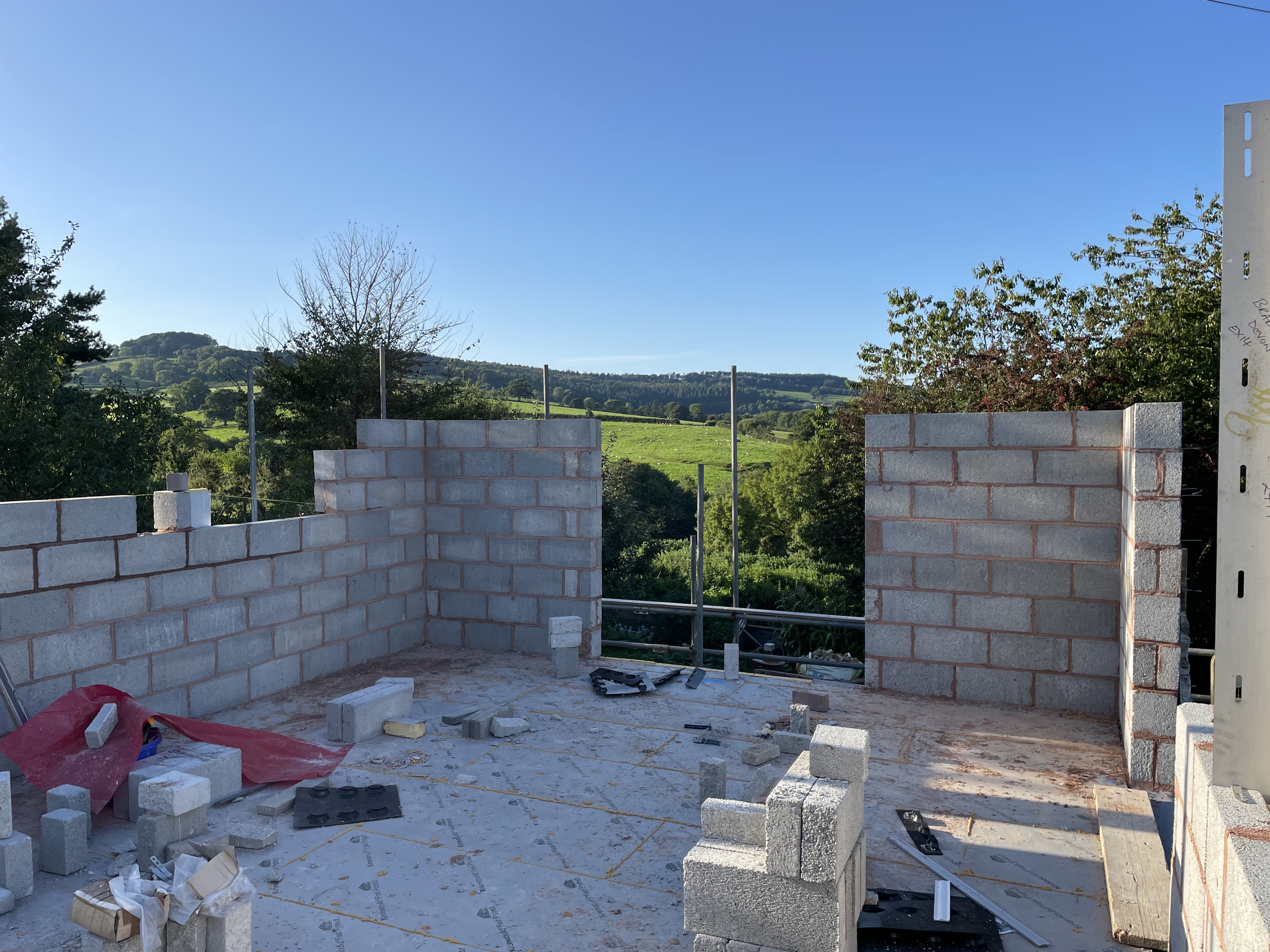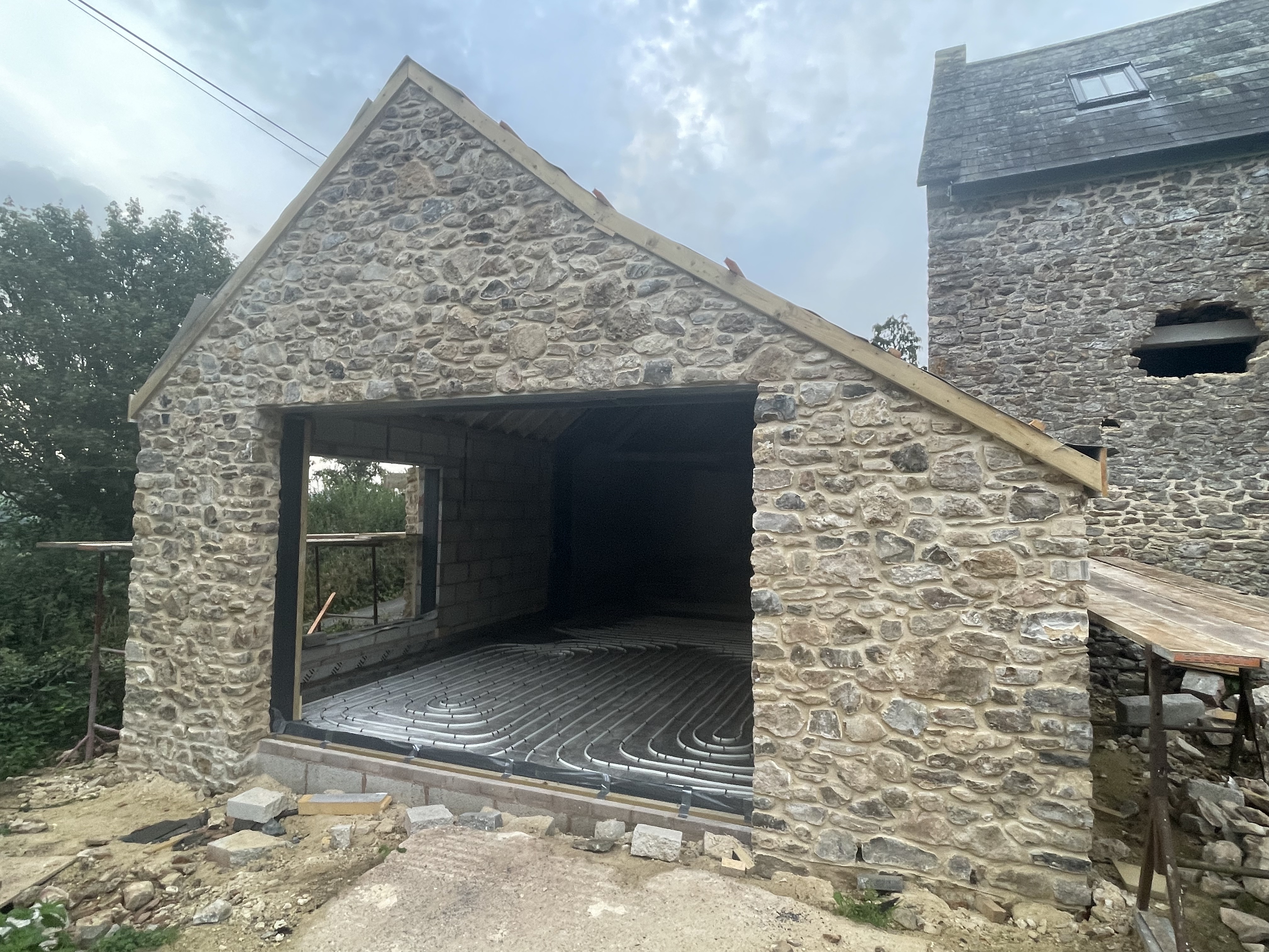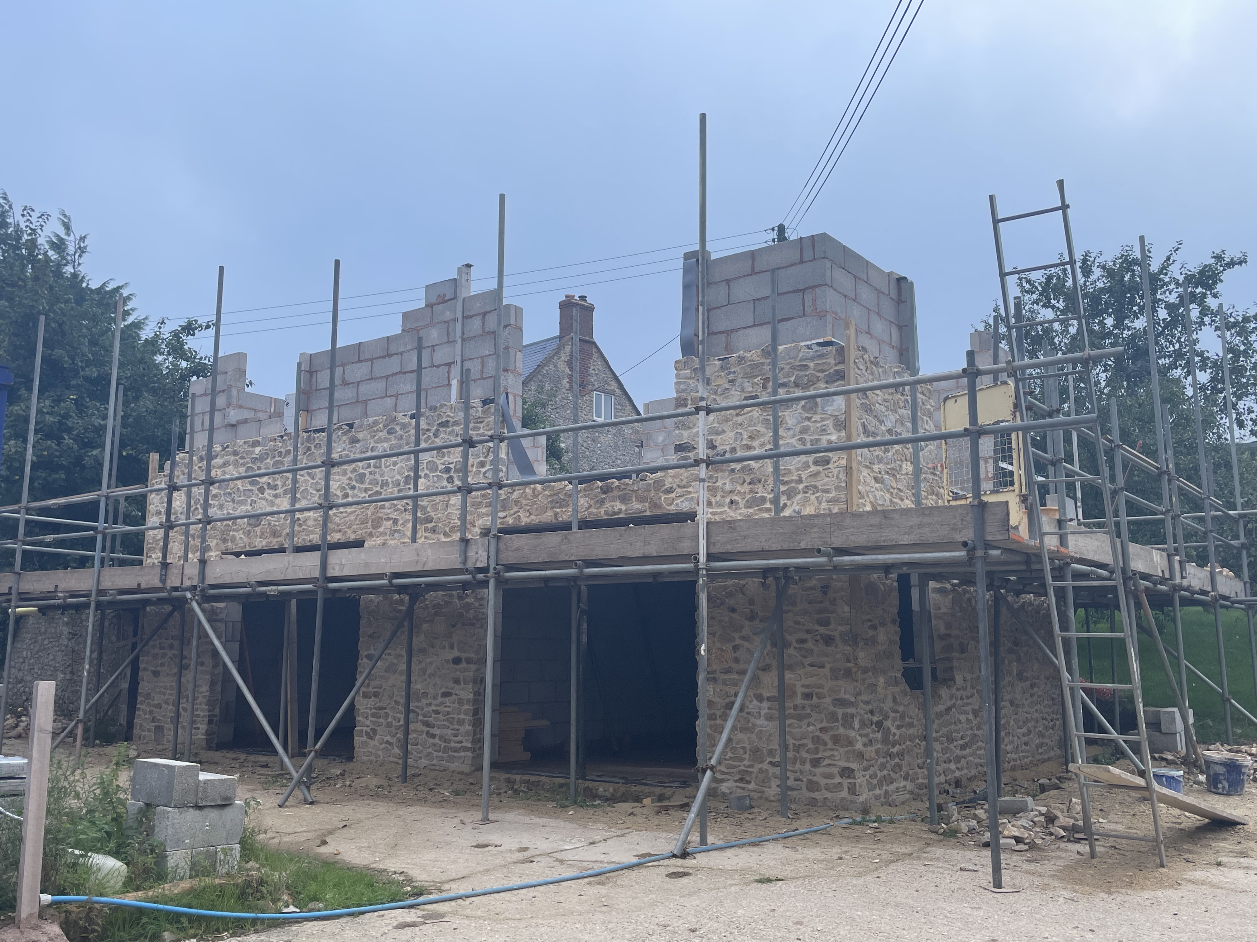 The walls of our garage / communal building continue to rise. It does feel a little bit like our builders have both ends of extreme weather holding them back – with heavy rain the last few weeks, and incredibly hot sun this past week. Our stonemasons must have worked particularly fast in this weather to avoid the lime mortar drying out – they’re making very good progress though.