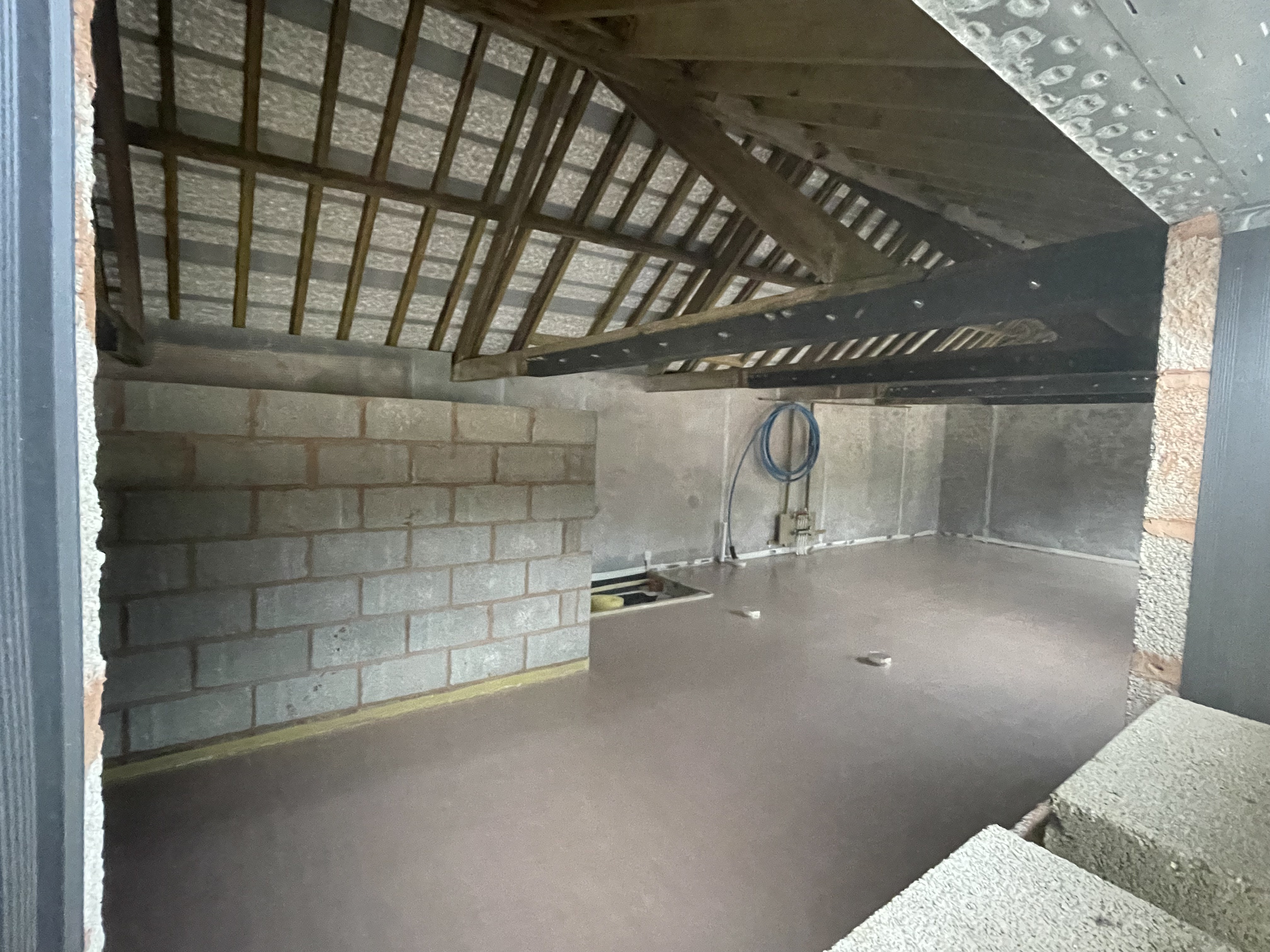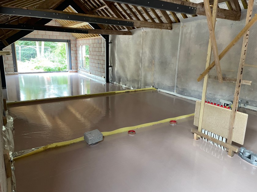 It only took a day to lay all the pipes in both ends of the building – with black floor clips poked through the floor insulation to make sure the pipes were a consistent distance apart. And then just as quickly, on Friday, the screed went down with a cement mixer in the courtyard pumping it into the building. There’s now a beautifully smooth floor in place – we’ve been banned from walking on it until it’s dried next week to avoid marking it. Let’s just hope there’s nothing wrong with the underfloor heating pipes!