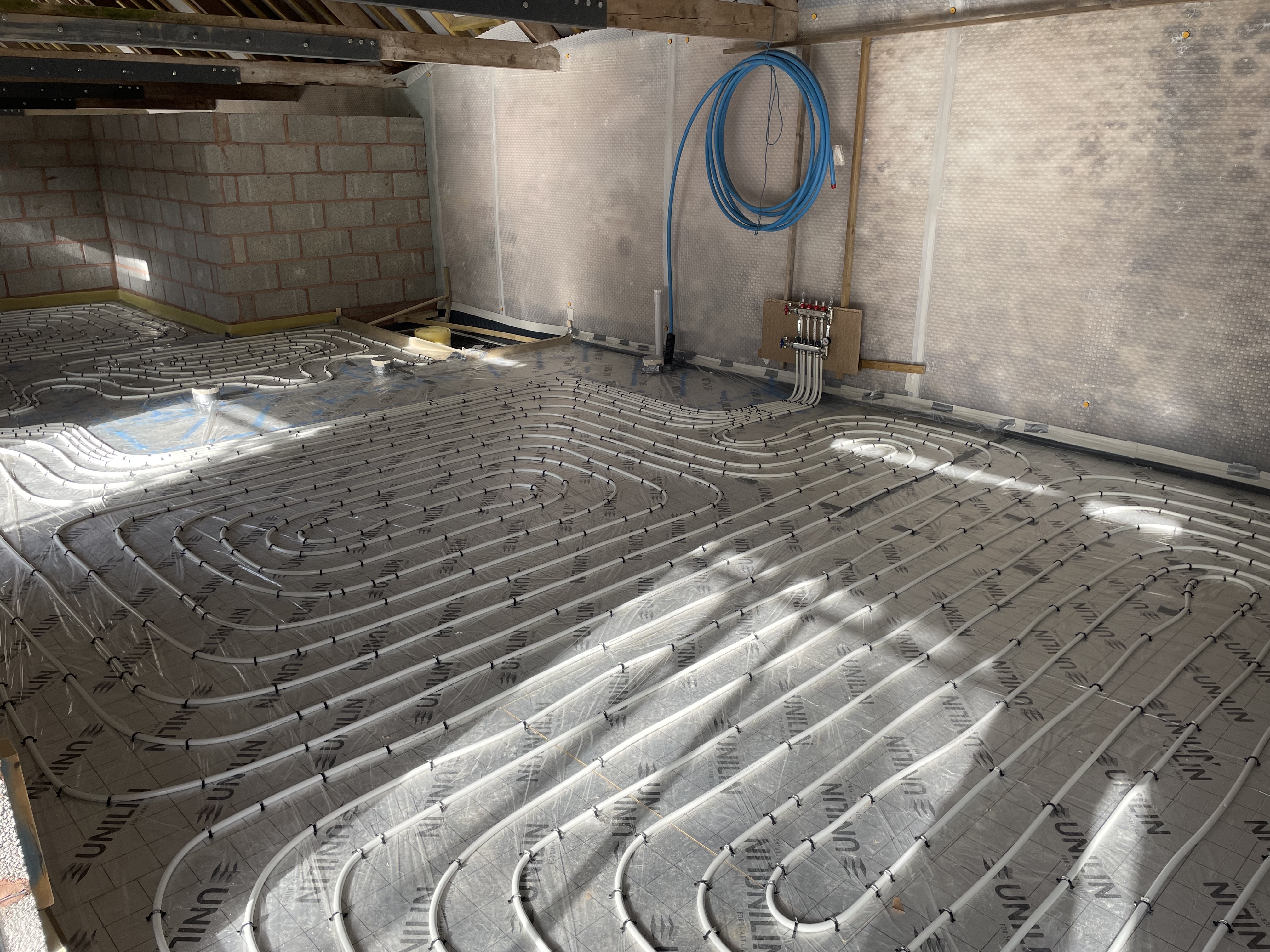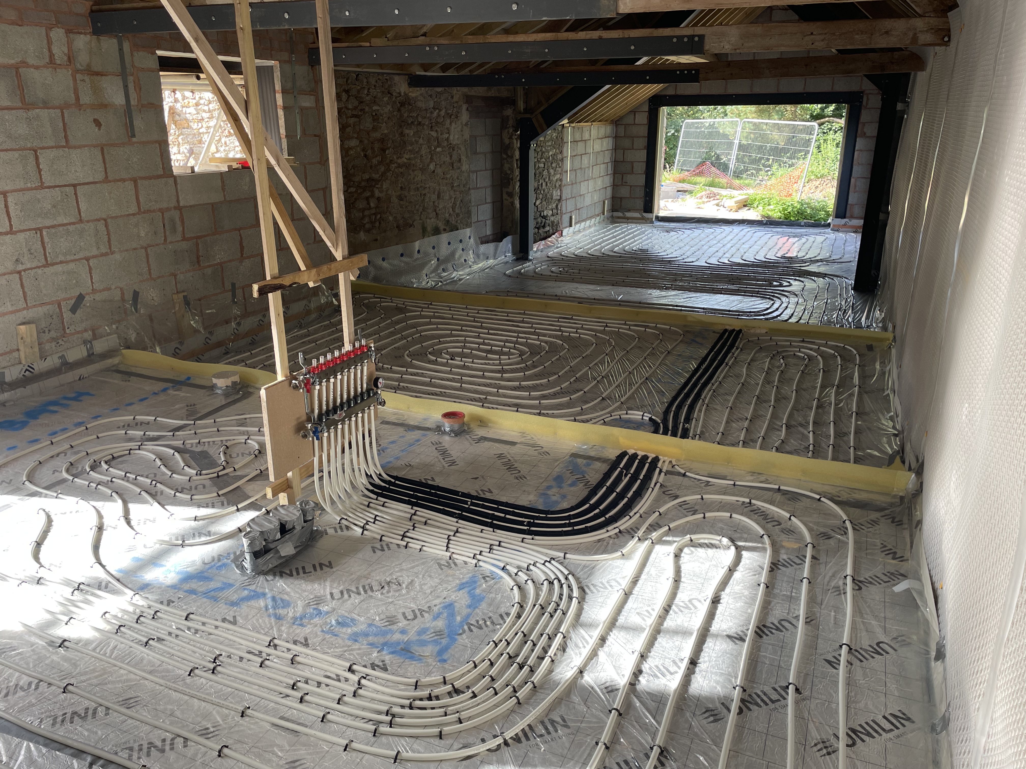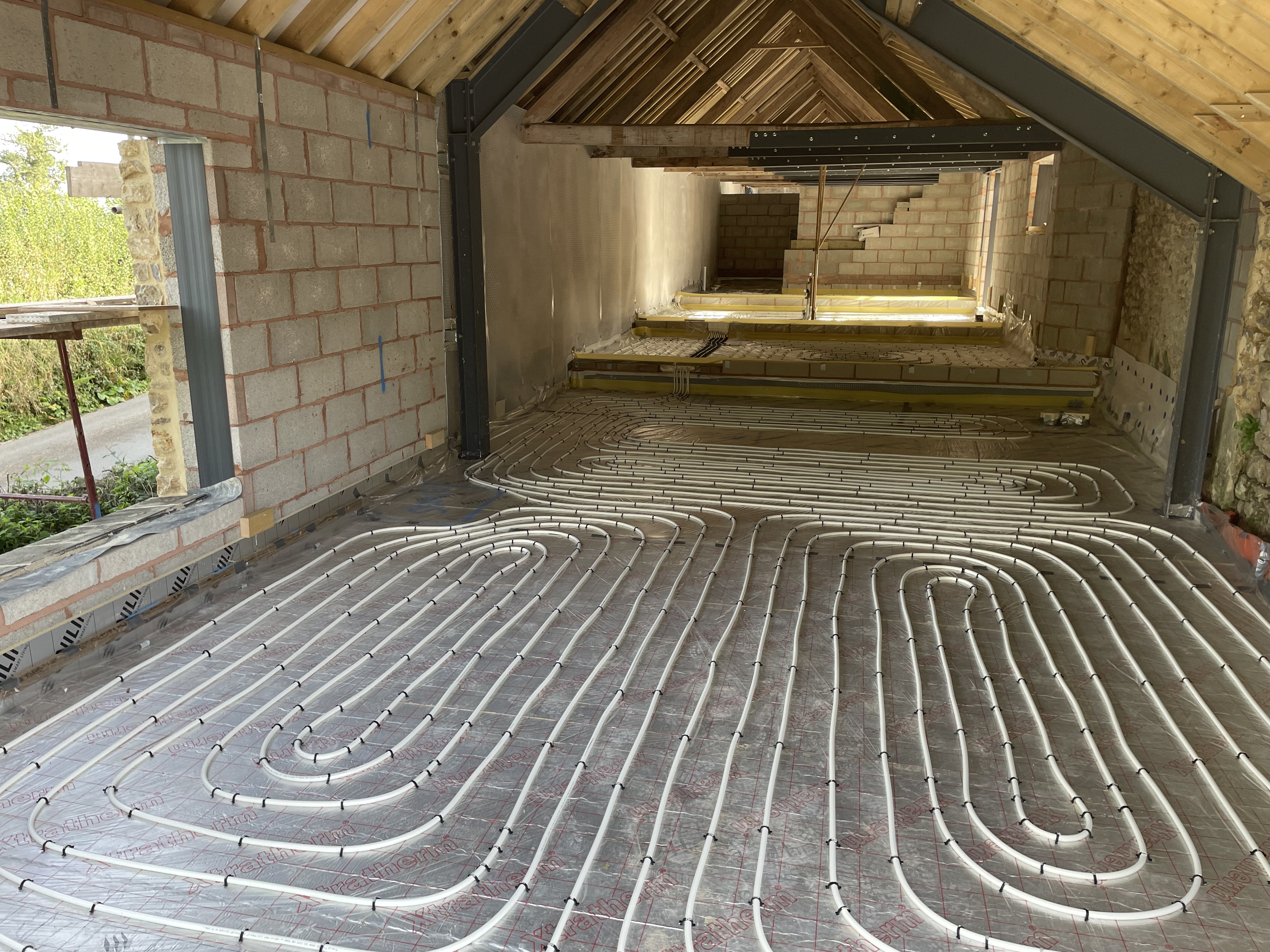 Suddenly it feels like we’ve progressed from having an old cow shed with new walls and ceilings into it becoming a proper building – with the addition this week of our underfloor heating. Our builders put this down first in the shippon as they’re using the barn as a workshop in the recent bad weather and the floor space is used too regularly.