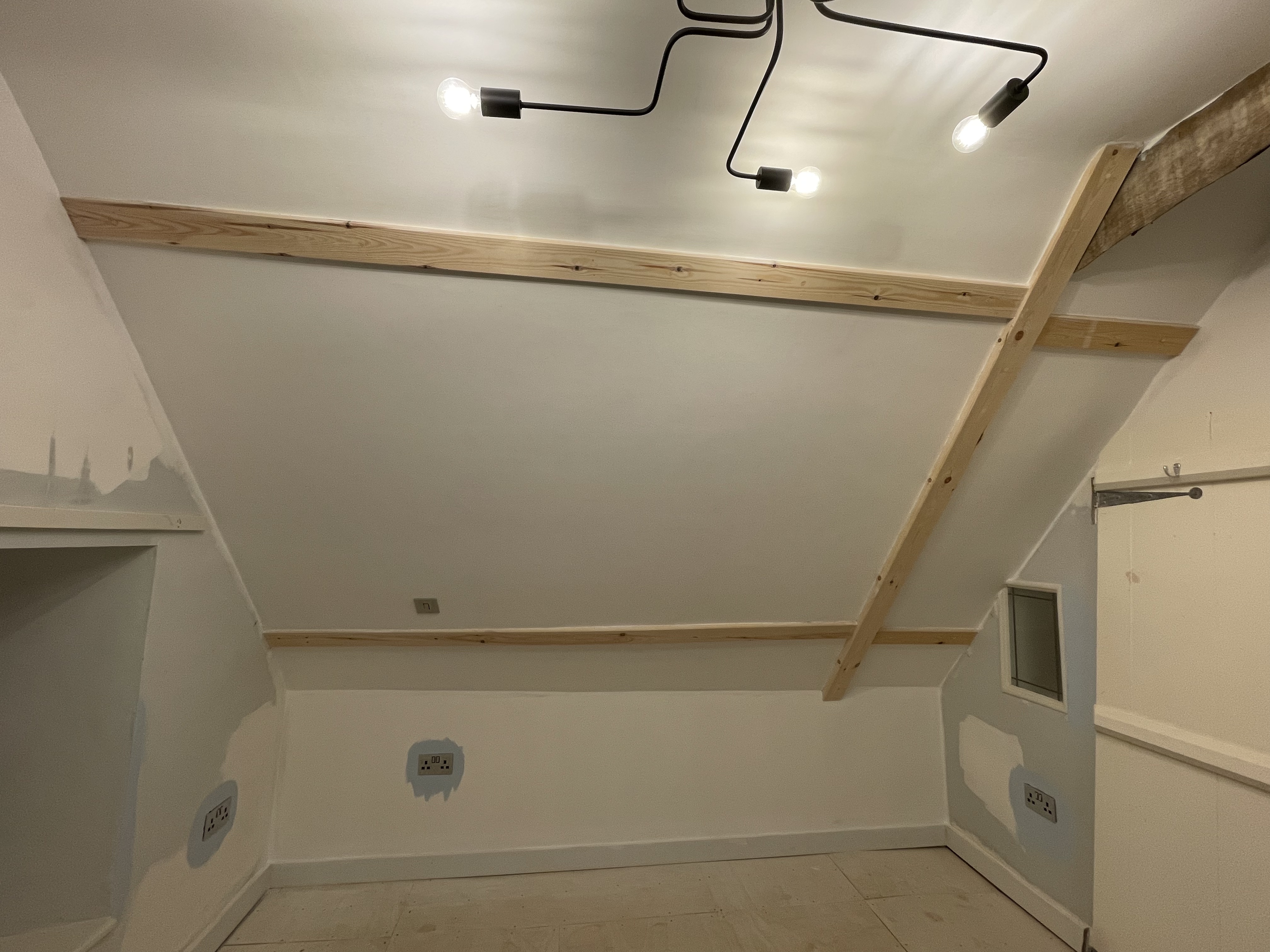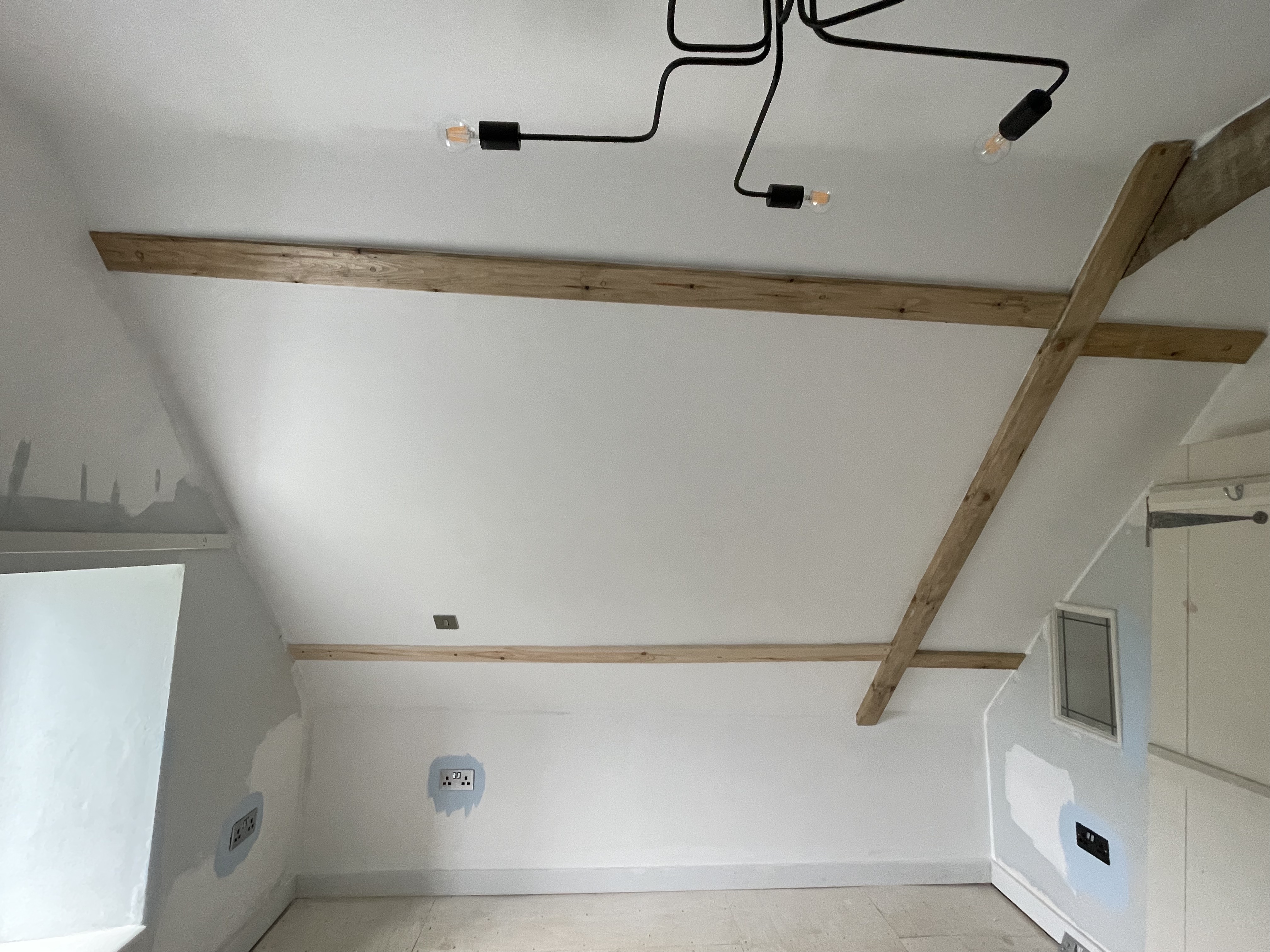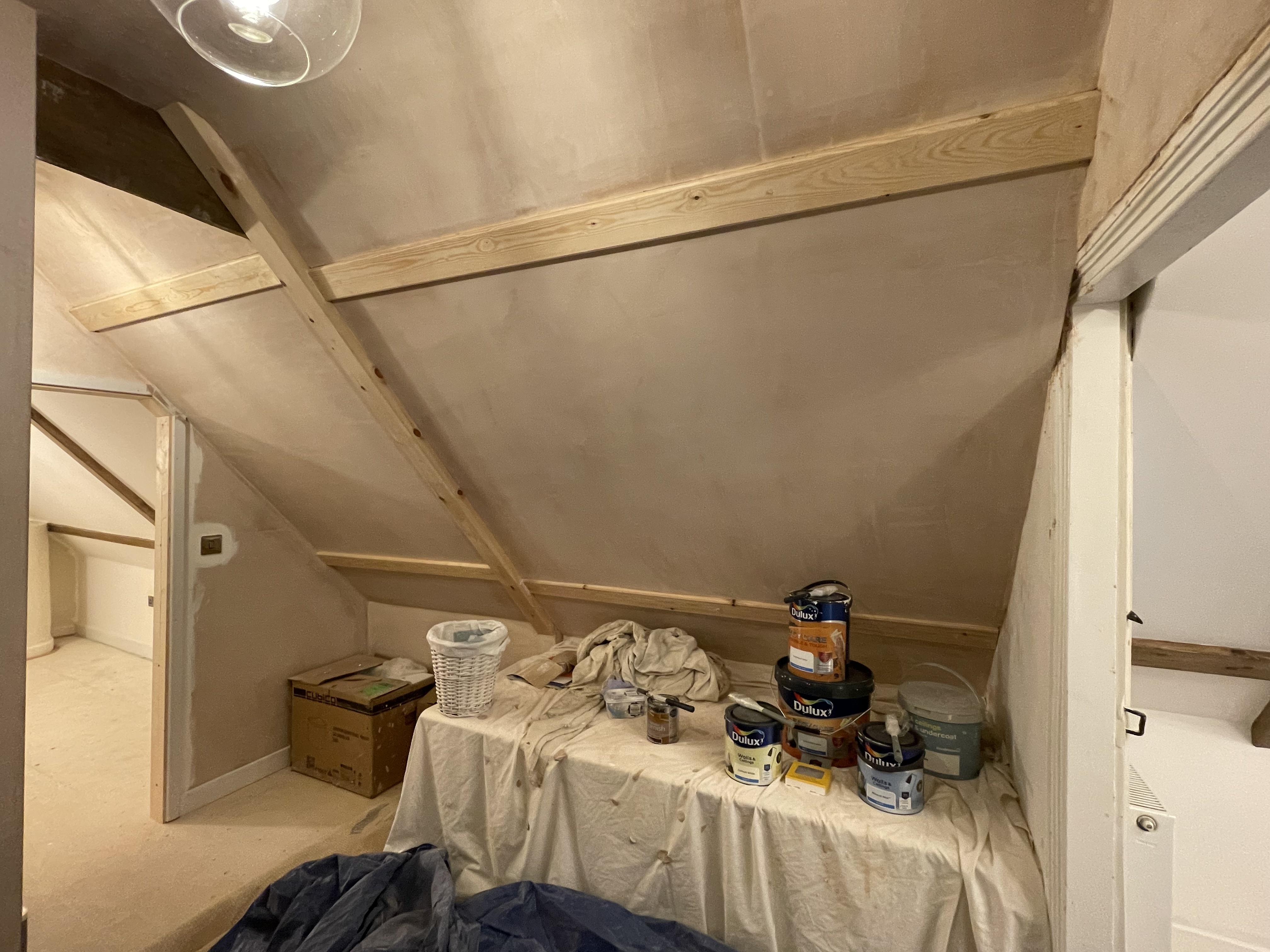 The carpet fitter replaced the carpets in the two bedrooms on Wednesday, as well as new vinyl in the top floor shower room. And – after we broke our hoover by hoovering up plaster dust – our site manager spent a day clearing all the protective sheets and mess left behind. It looks so much better – and it’s so nice to not be living in sheets and dust. We also managed to get a bit more painting done – the bathroom and ensuite ceilings are finished, and we’ve stained most of the beams in the bedrooms (save one that needs wooden plugs to cover the screws). In a great example of being so focused on the job in hand that you don’t see the bigger picture – once finished I noticed more beams on the landing that I’d completely missed – so we can’t tick that job off yet. Our aim is to complete the bedrooms, then the shower room, and then finally the landing, while also finishing the snagging from the bathroom and ensuite – such as tiling above the showers where the ceiling is a bit higher than it was previously, and painting over the plastering drips.