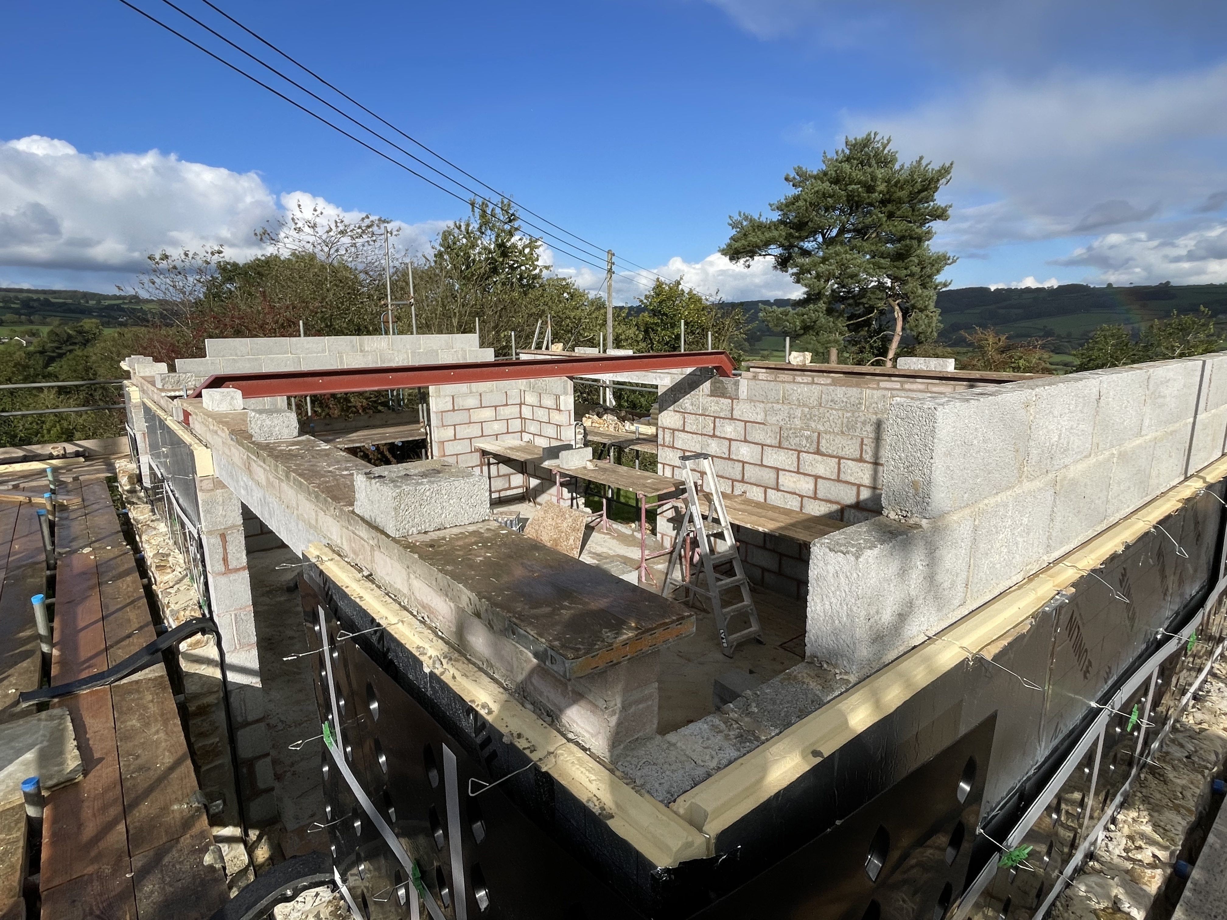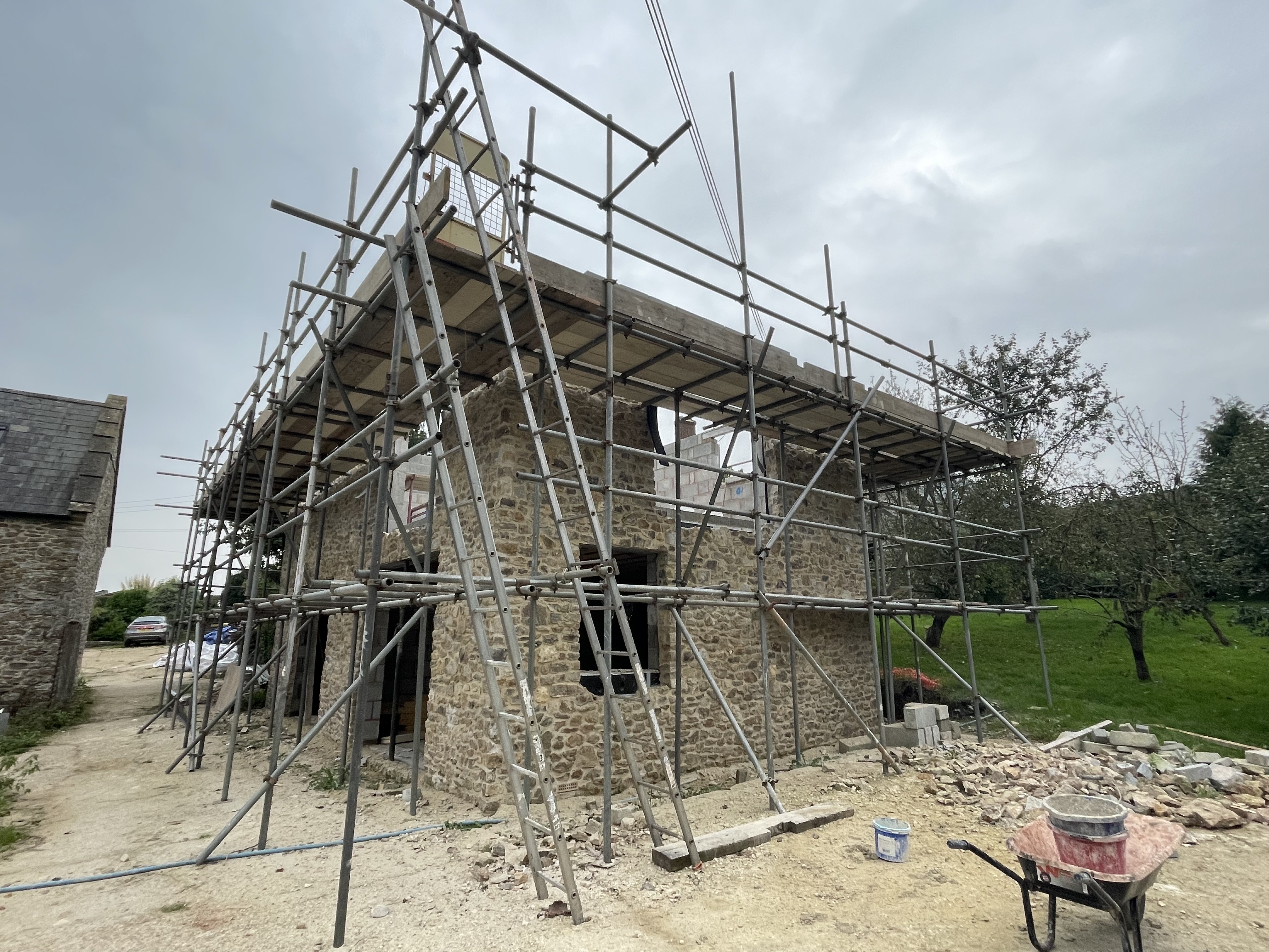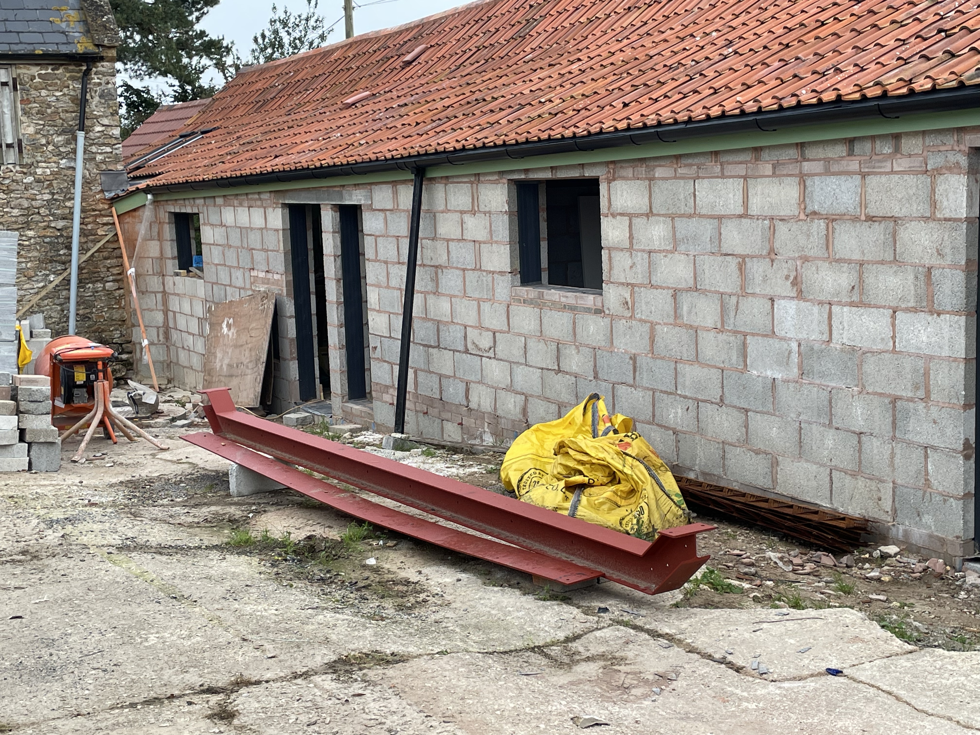 The scaffolding has been taken down along the front of the shippon and used to raise the level of the scaffolding on the garage building so the stonemasons can reach the top of the first floor. They’ve since installed the lintels and the steels (which they moved by hand!!) – it’s impressive to see how fast it’s coming on.