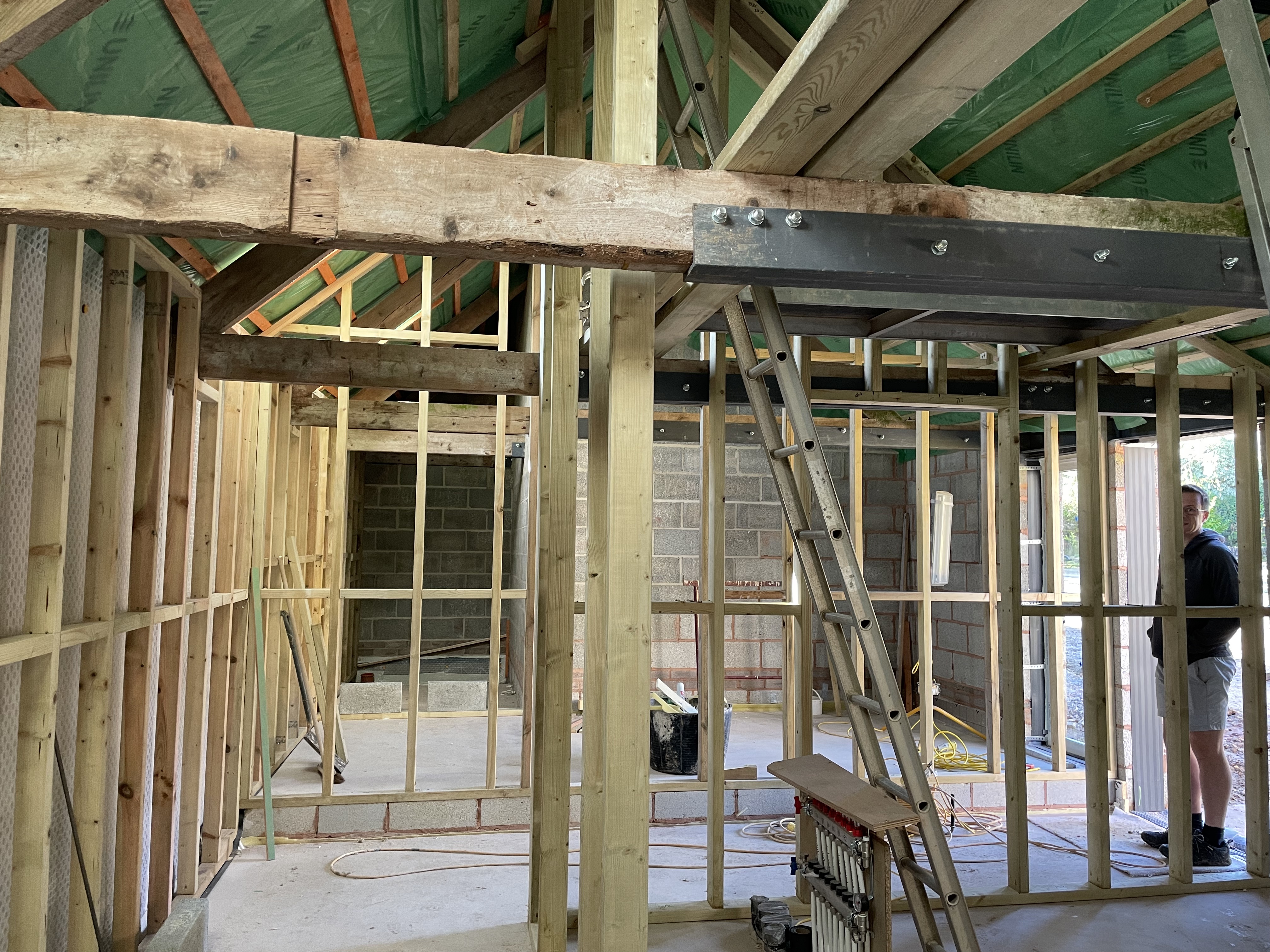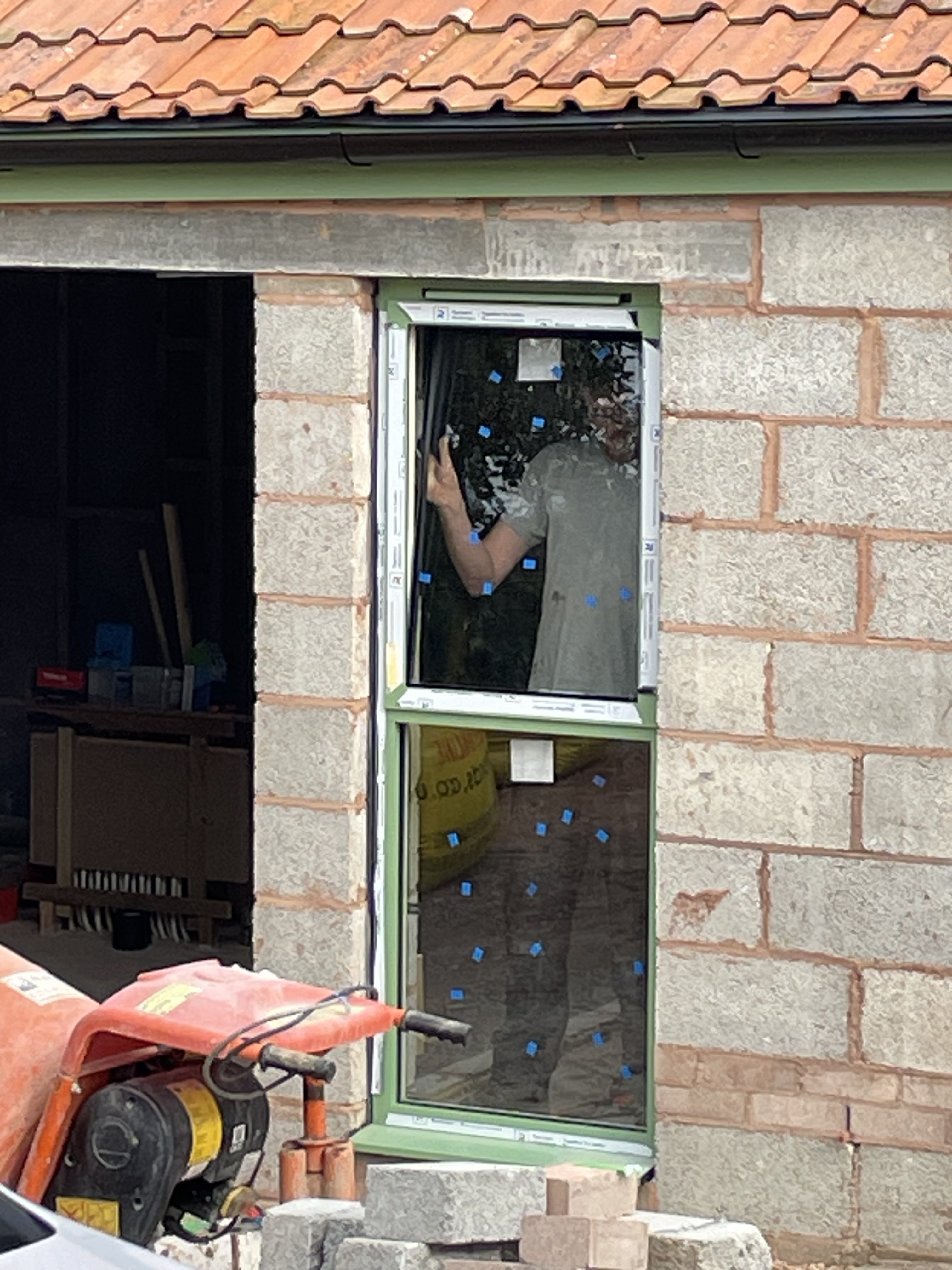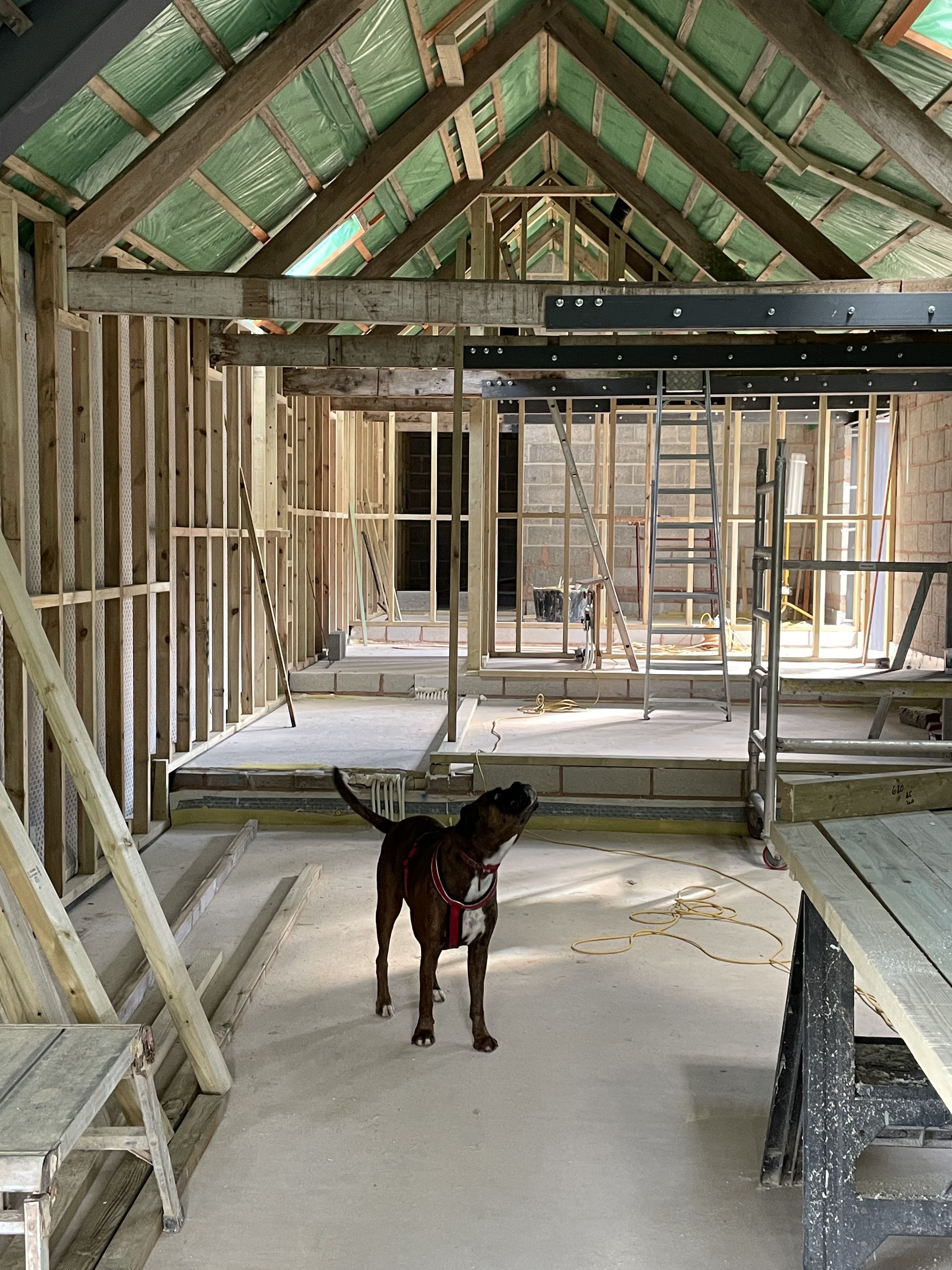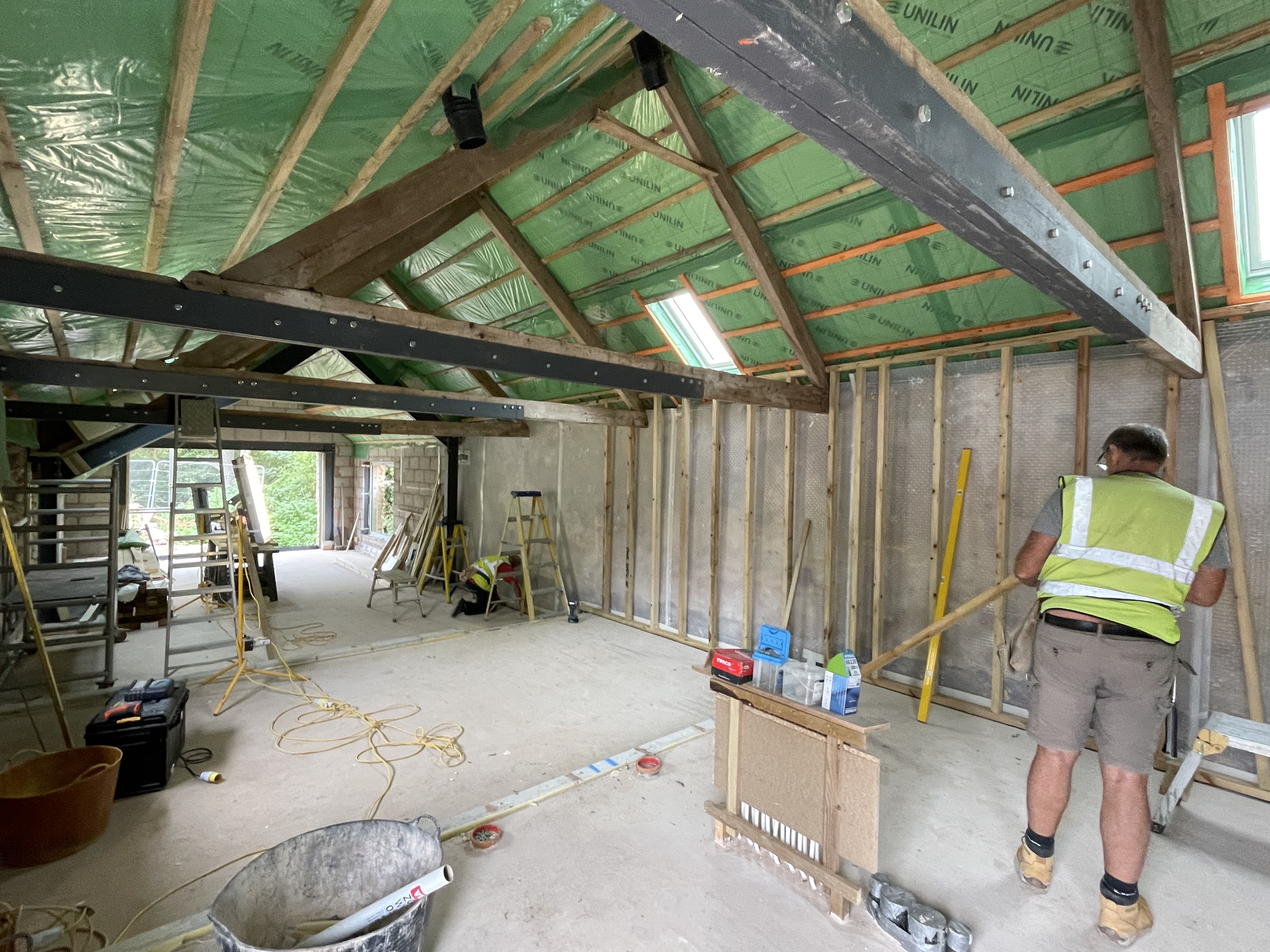 We entered our 8th month of building work this week- and what a week of progress! The windows and french doors were installed in the shippon and the one-bed now has a temporary front door to keep the building a bit more watertight. Although the window frames are mostly covered in protective film, you can see glimpses of the green metal colour we chose, which looks great against the clean orange roof tiles. And the carpenters have made a very good start on the stud walls inside our new house – they’ve completed the long roadside wall and our bedroom wall, and made a start on the bathroom and spare room walls. It’s getting a bit easier to visualise what the rooms will look like so we’re starting to think about how we’ll lay the furniture out. It’s particularly helpful in the rooms that are constrained in terms of size, shape and light (the consequence of converting a curtilage listed building means we’ve not been able to put extra windows in or move walls or the roof).