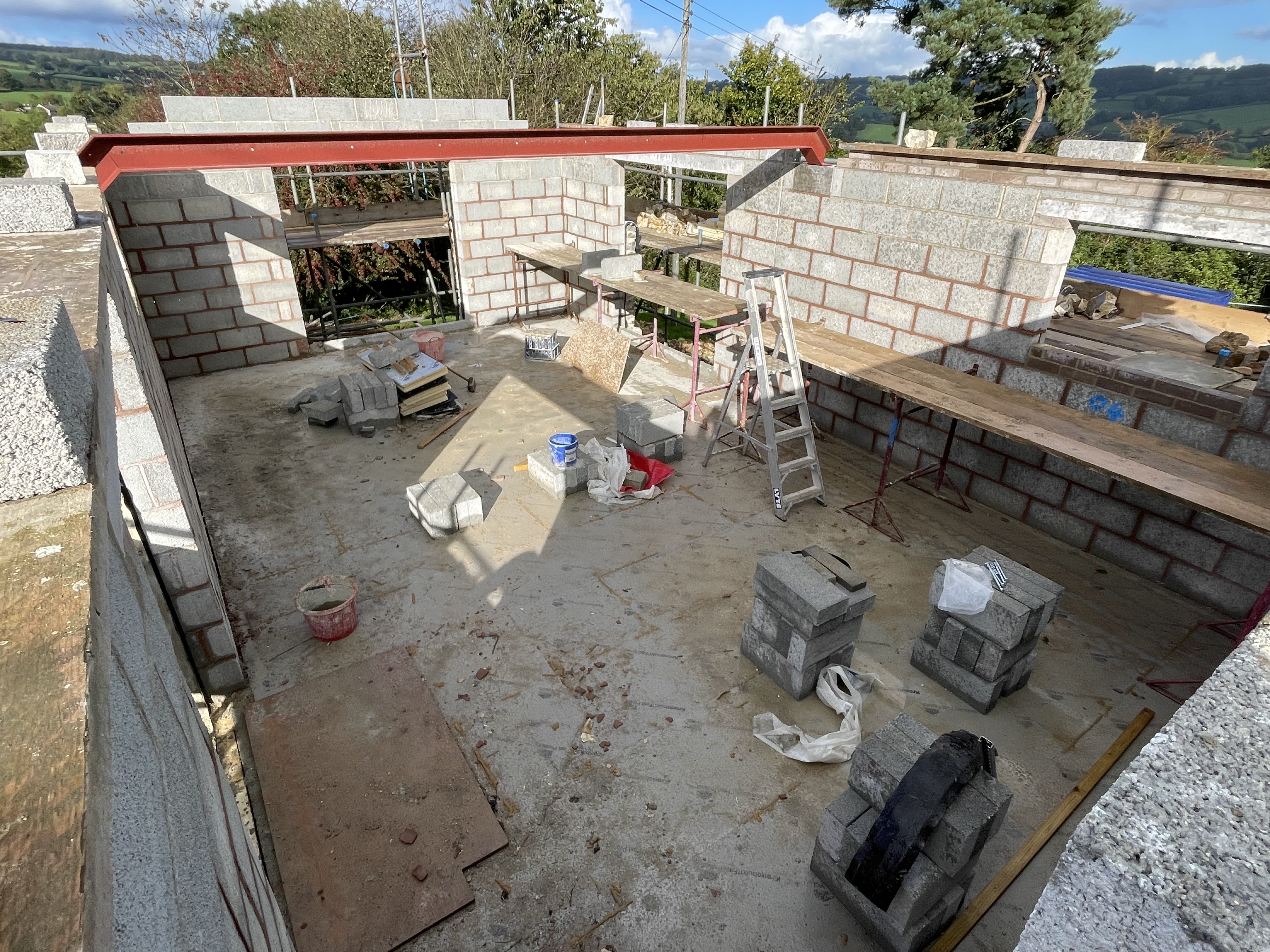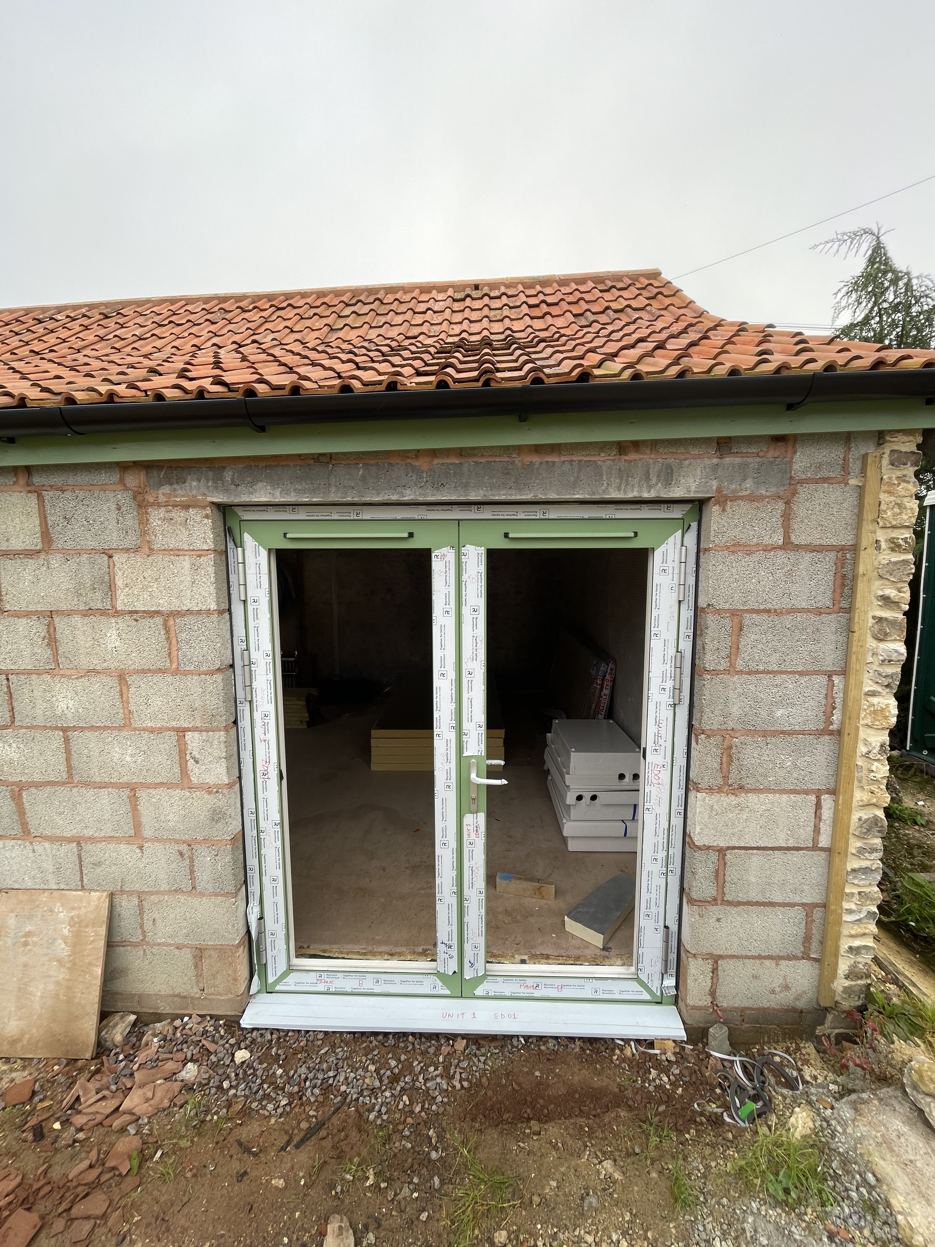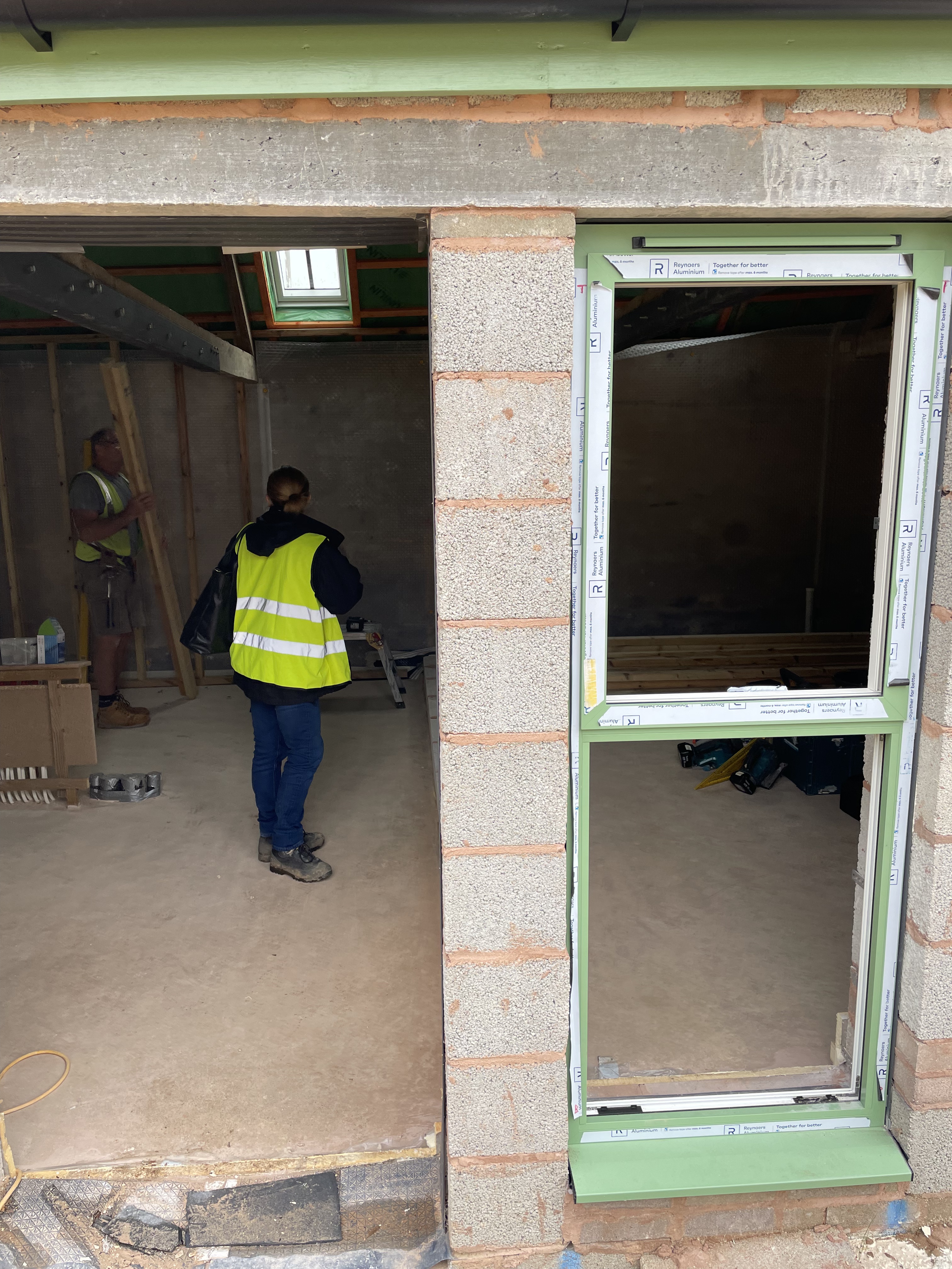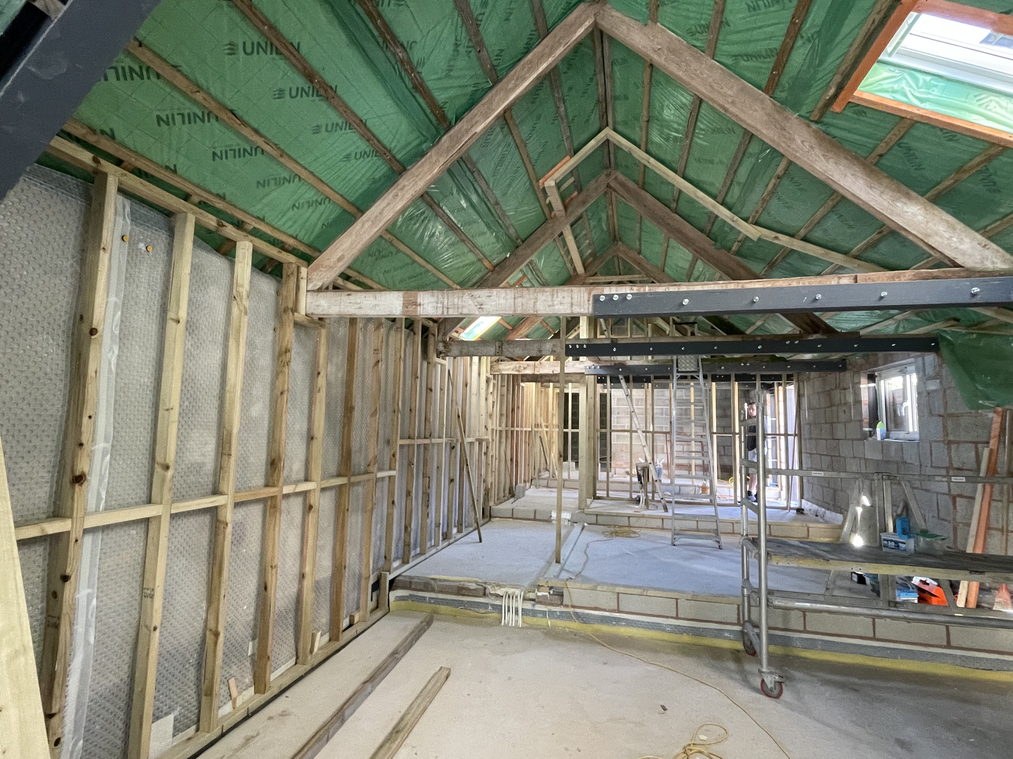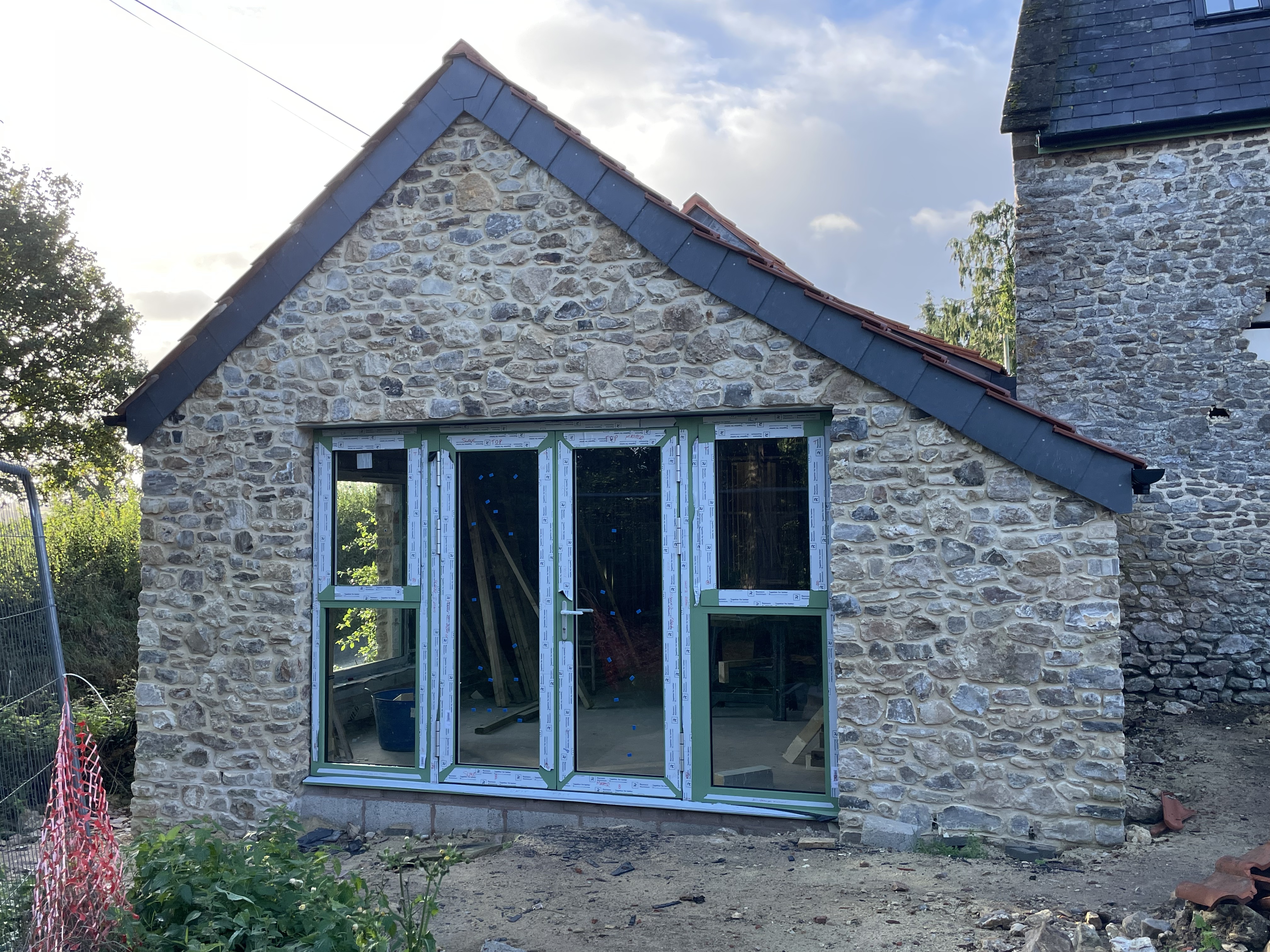 We entered our 8th month of building work this week- and what a week of progress! The windows and french doors were installed in the shippon and the one-bed now has a temporary front door to keep the building a bit more watertight. Although the window frames are mostly covered in protective film, you can see glimpses of the green metal colour we chose, which looks great against the clean orange roof tiles. And the carpenters have made a very good start on the stud walls inside our new house – they’ve completed the long roadside wall and our bedroom wall, and made a start on the bathroom and spare room walls. It’s getting a bit easier to visualise what the rooms will look like so we’re starting to think about how we’ll lay the furniture out. It’s particularly helpful in the rooms that are constrained in terms of size, shape and light (the consequence of converting a curtilage listed building means we’ve not been able to put extra windows in or move walls or the roof).