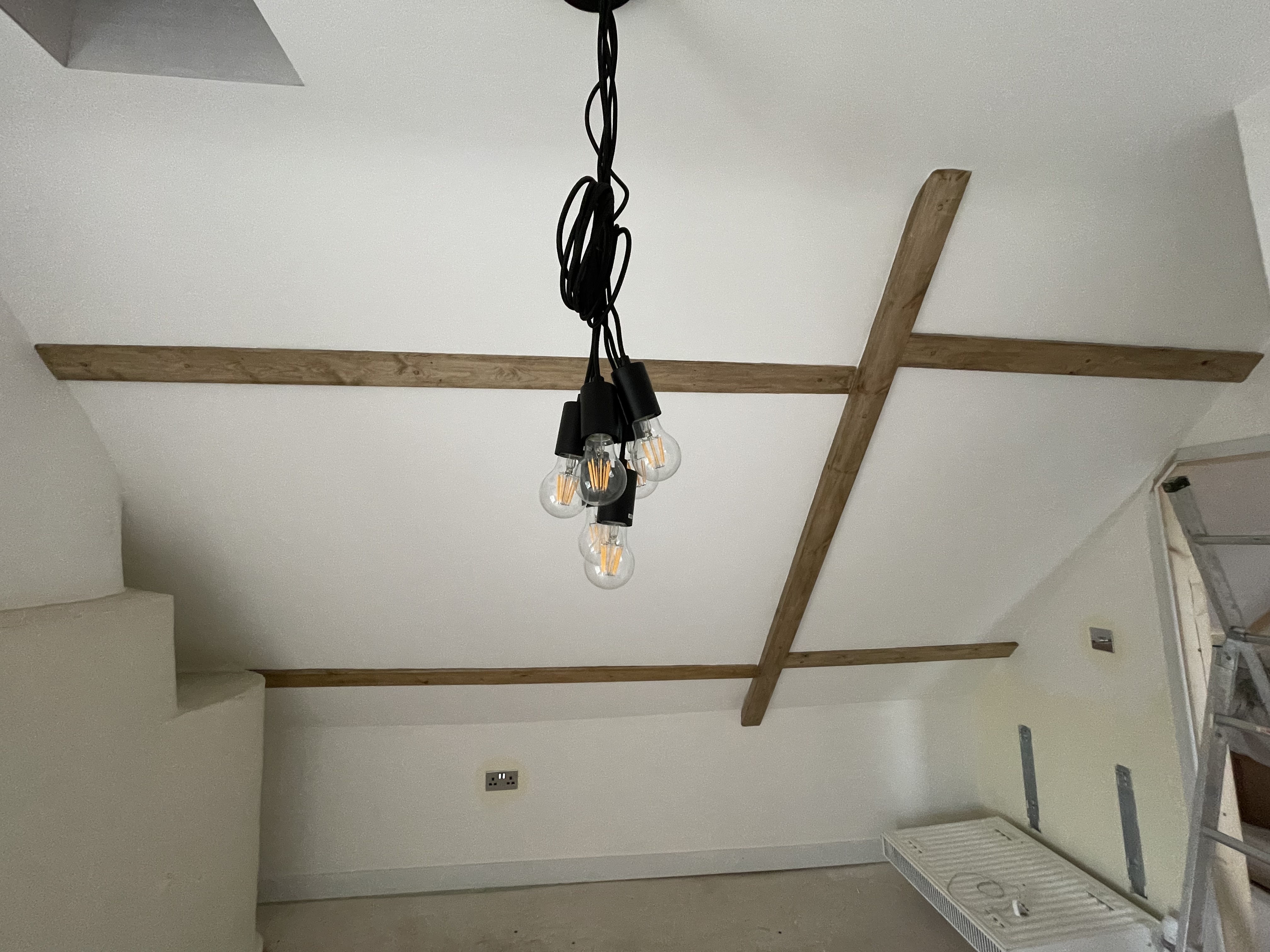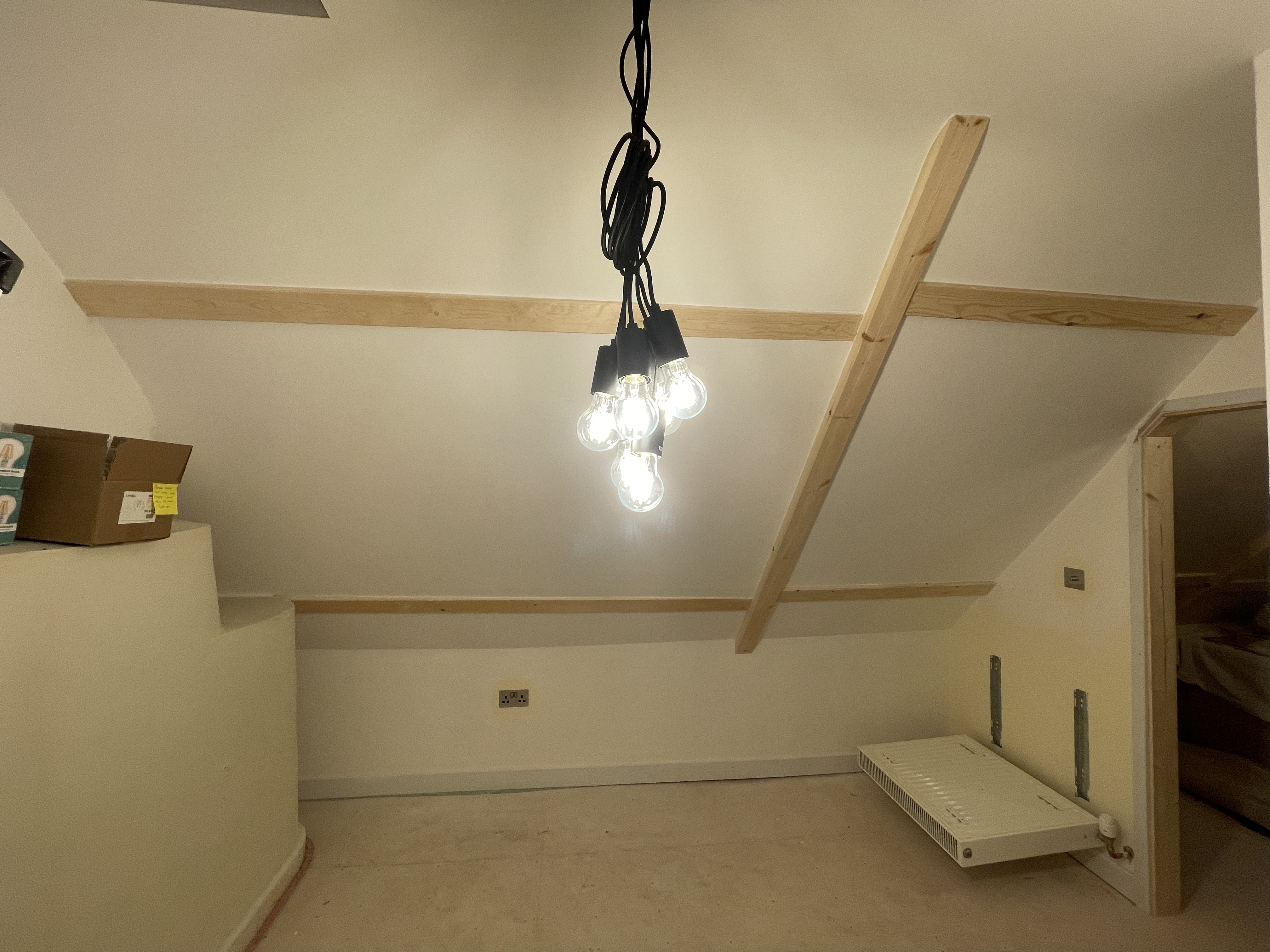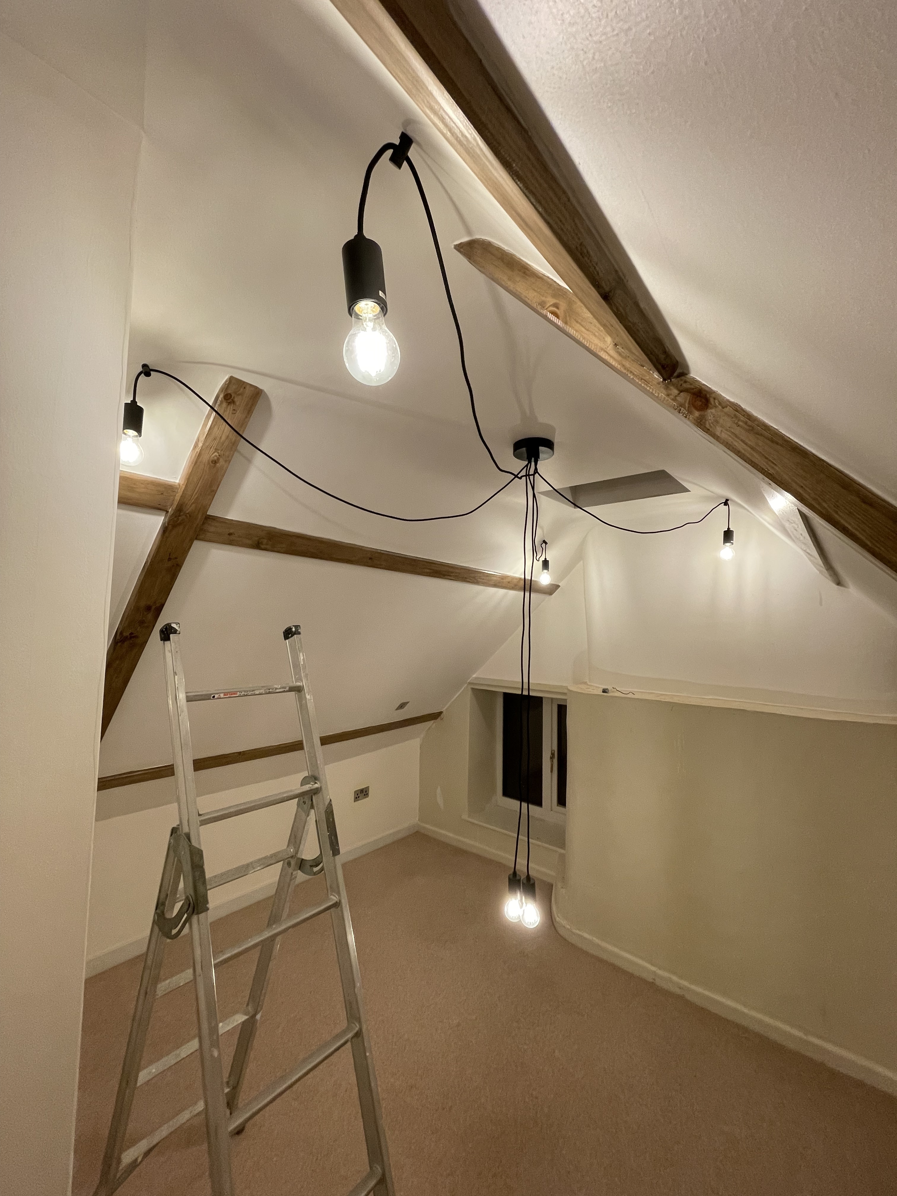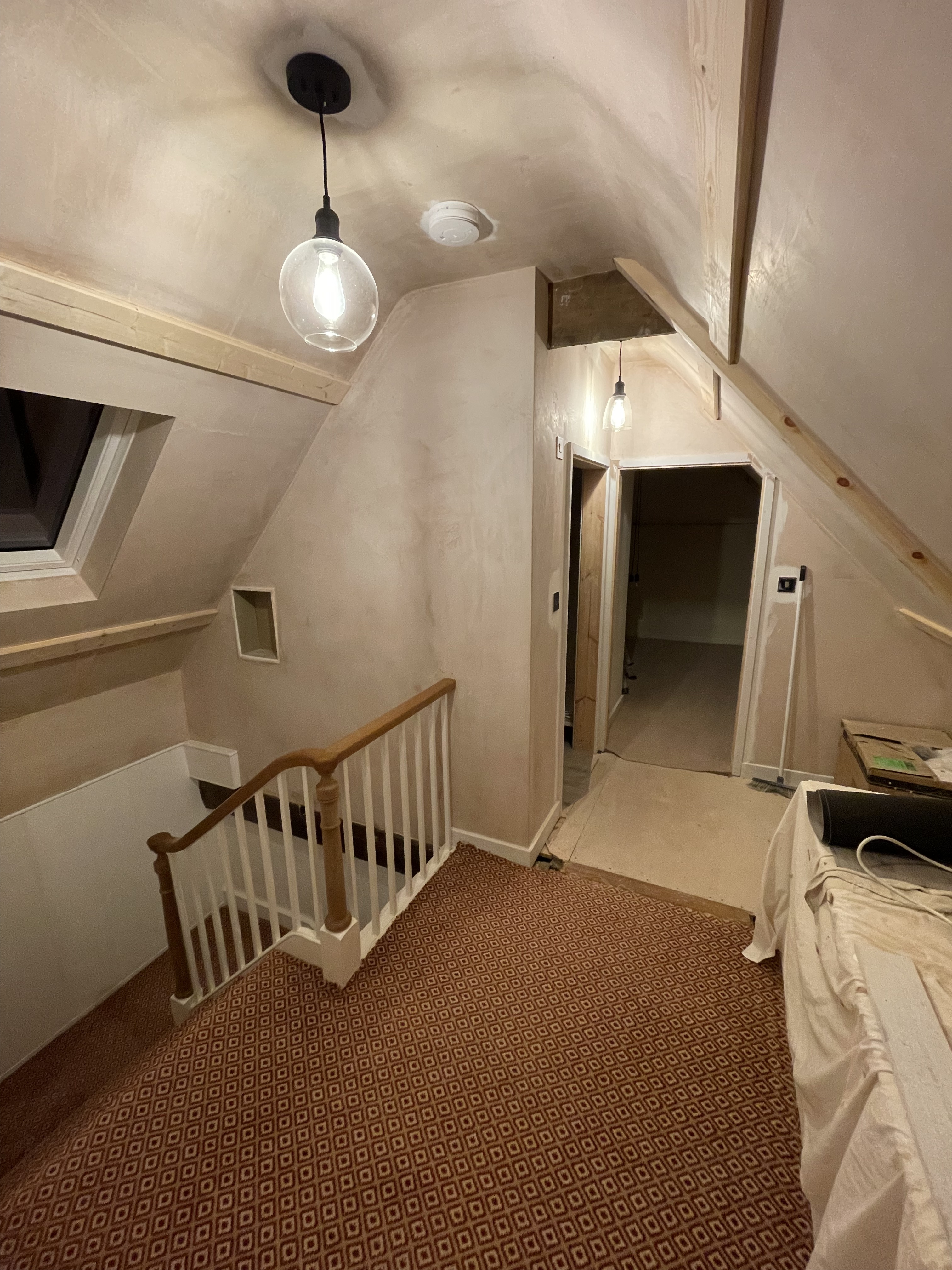 It seems like a long time ago already, but it was only Monday that the electricians arrived to connect the electricity supply up in the farmhouse top floor, bathroom and ensuite. It makes such a difference having light again – we’ve been able to paint late into the evening, and it’s great not to have to shower by torchlight now the mornings are getting darker. We love the way the light fittings work in the spaces – although we’re going to raise the ones in the landing slightly, and we’ve only been able to hang four out of the six lights on the ‘industrial spider’ light while we try and get hold of a couple more ceiling hooks (the pitched roof means we can’t spread the light ‘legs’ out equally across the ceiling).