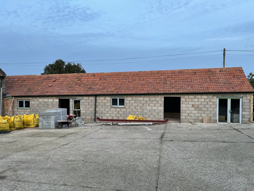 The scaffolding has been taken down along the front of the shippon and used to raise the level of the scaffolding on the garage building so the stonemasons can reach the top of the first floor. They’ve since installed the lintels and the steels (which they moved by hand!!) – it’s impressive to see how fast it’s coming on.