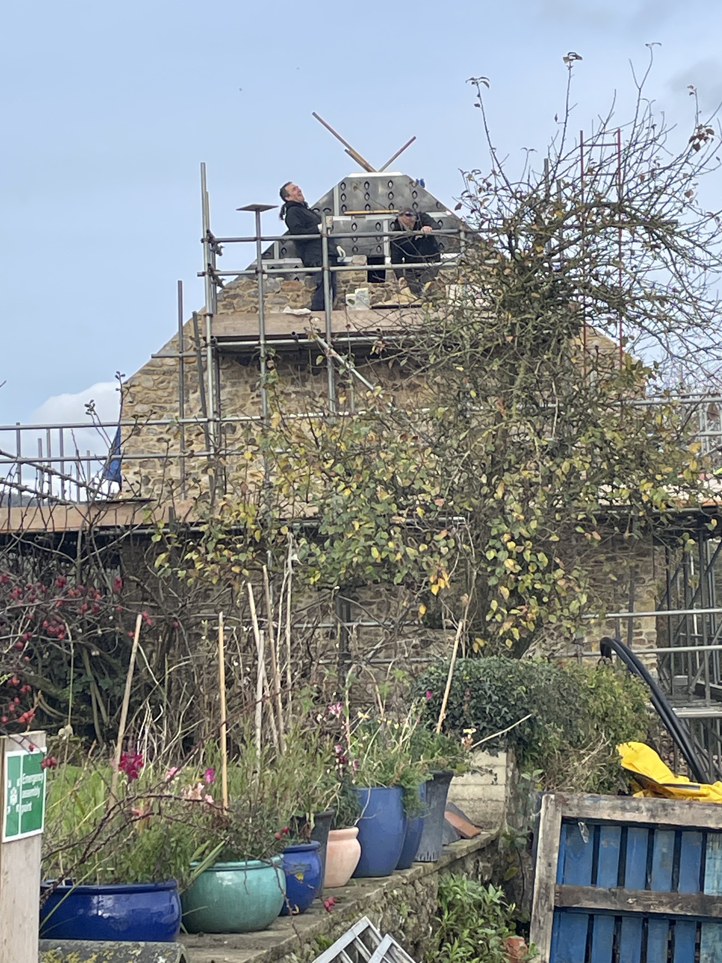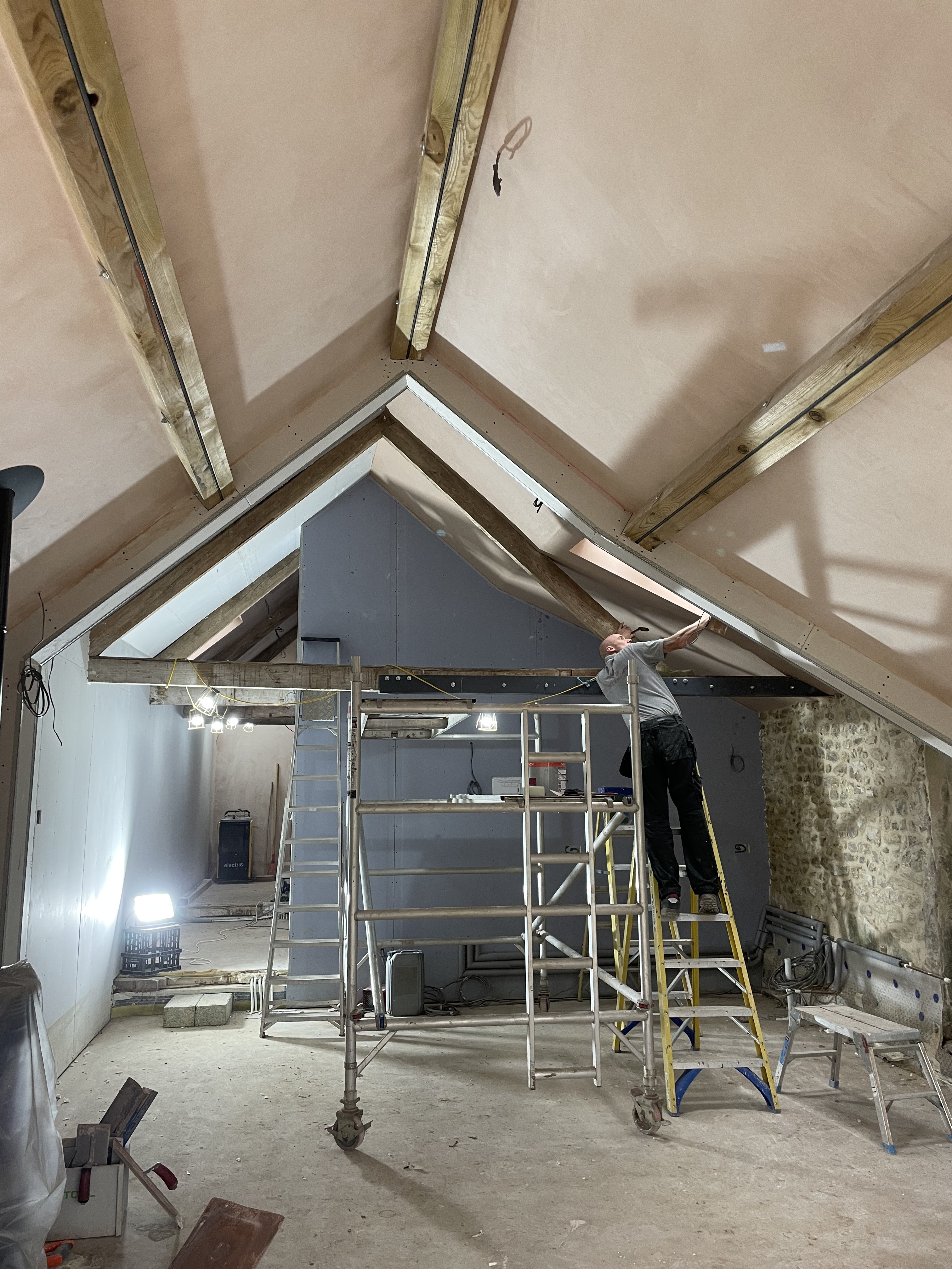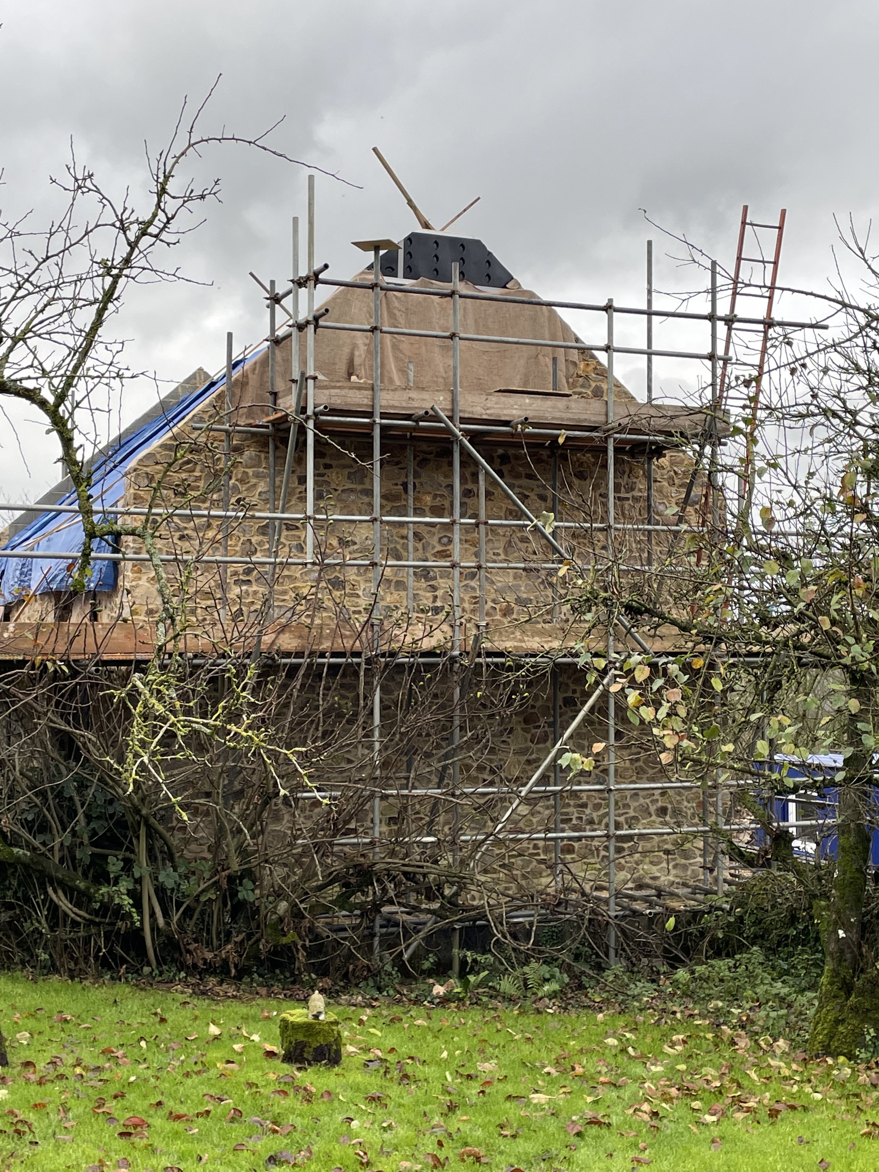Wednesday was a day for concreting – at the same time they finished repairing next door’s driveway after we dug it up to bury the electrical supply, and they also created and concreted the base for the first outbuilding round the back of the barn. At the same time, we’ve had other builders on site continuing to build out the top floor of the communal building – insulating it and boarding out the bat loft, which is now looking particularly cosy and hopefully large enough for several bats. And the stone masons have nearly finished the second gable end – despite the freezing temperatures. It’s really coming on.
