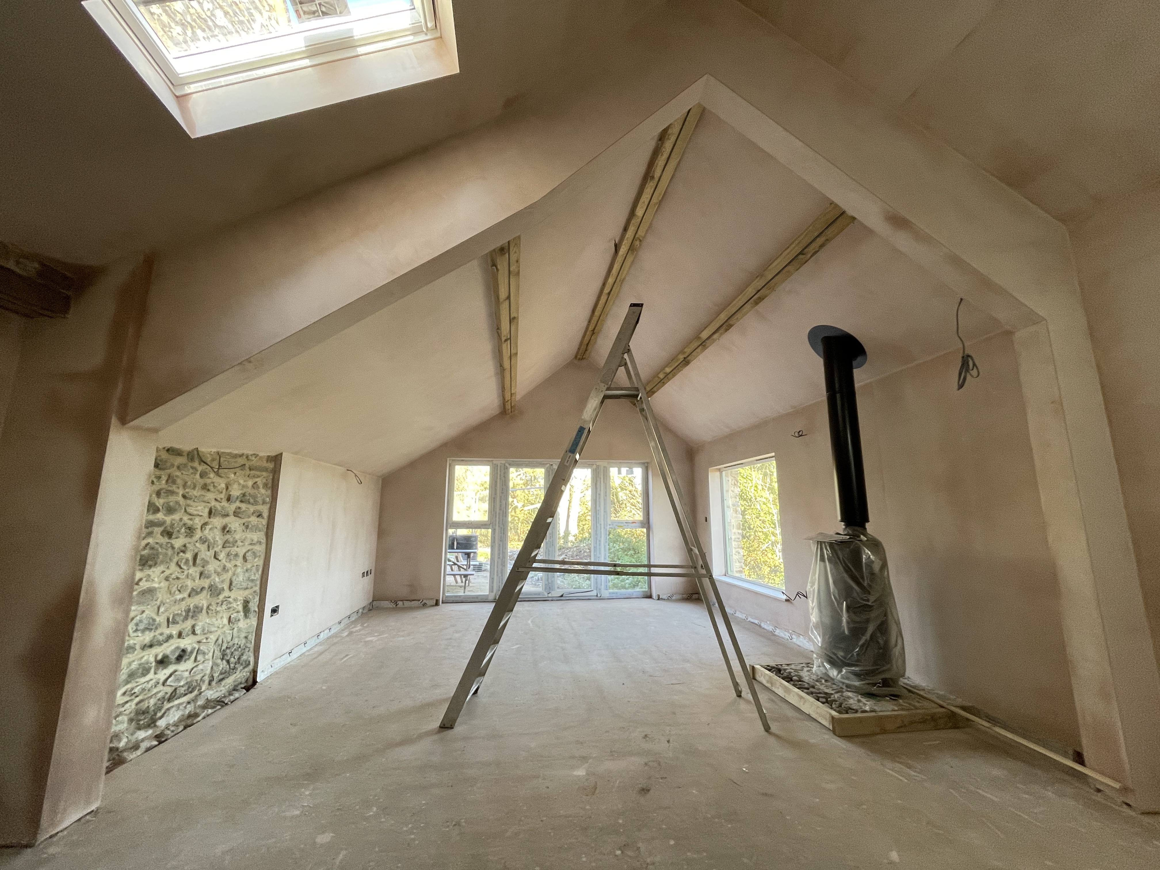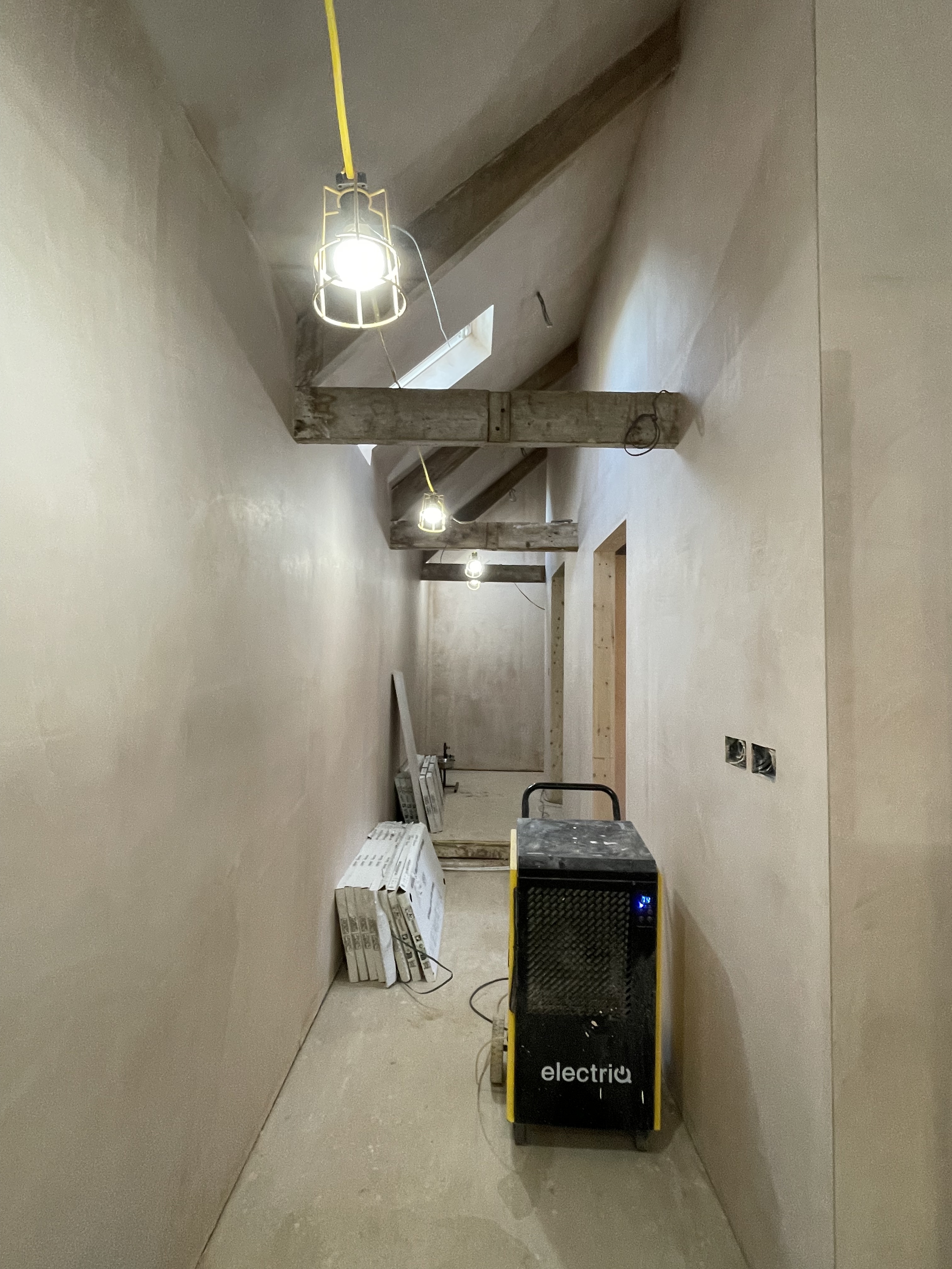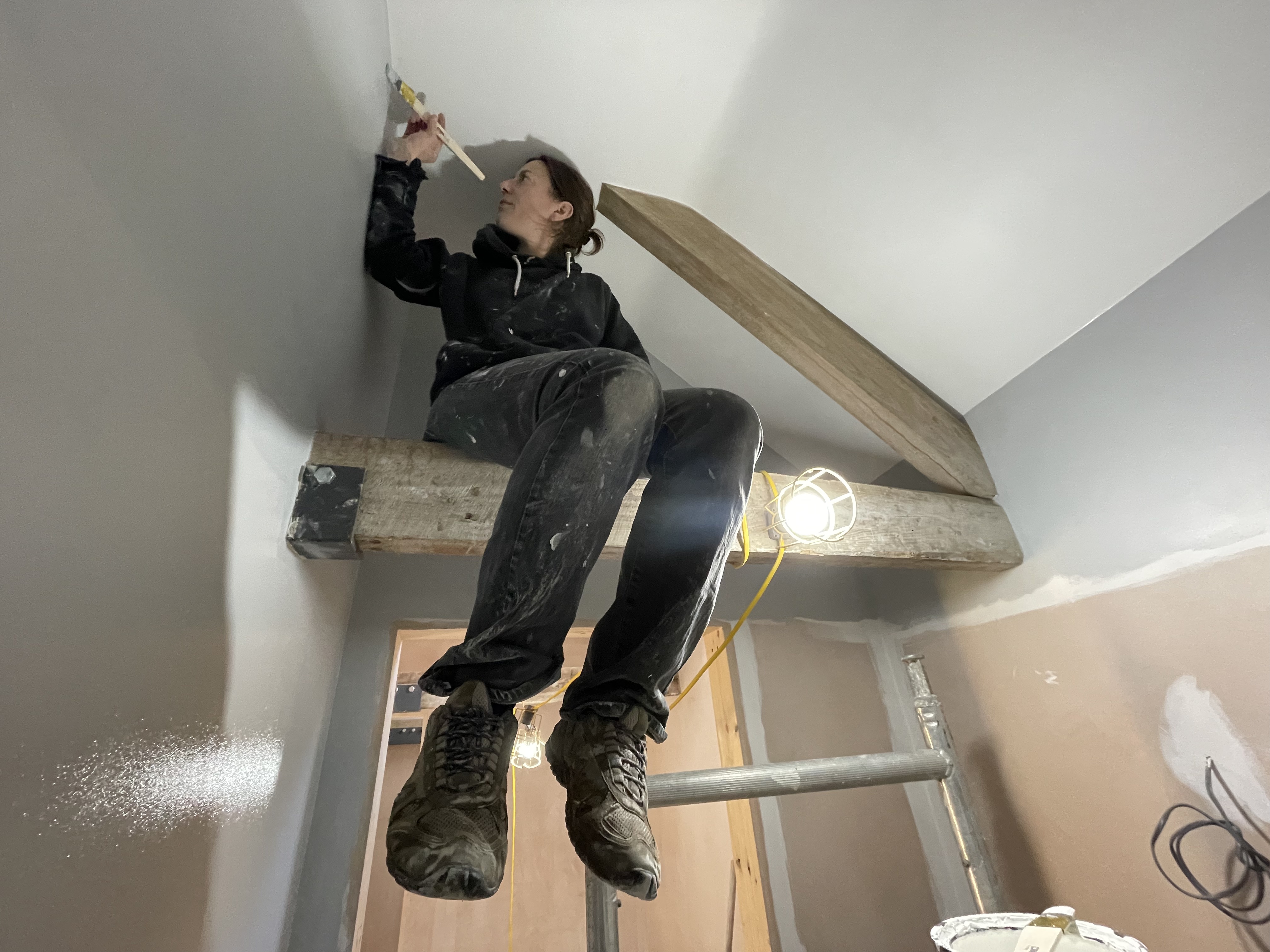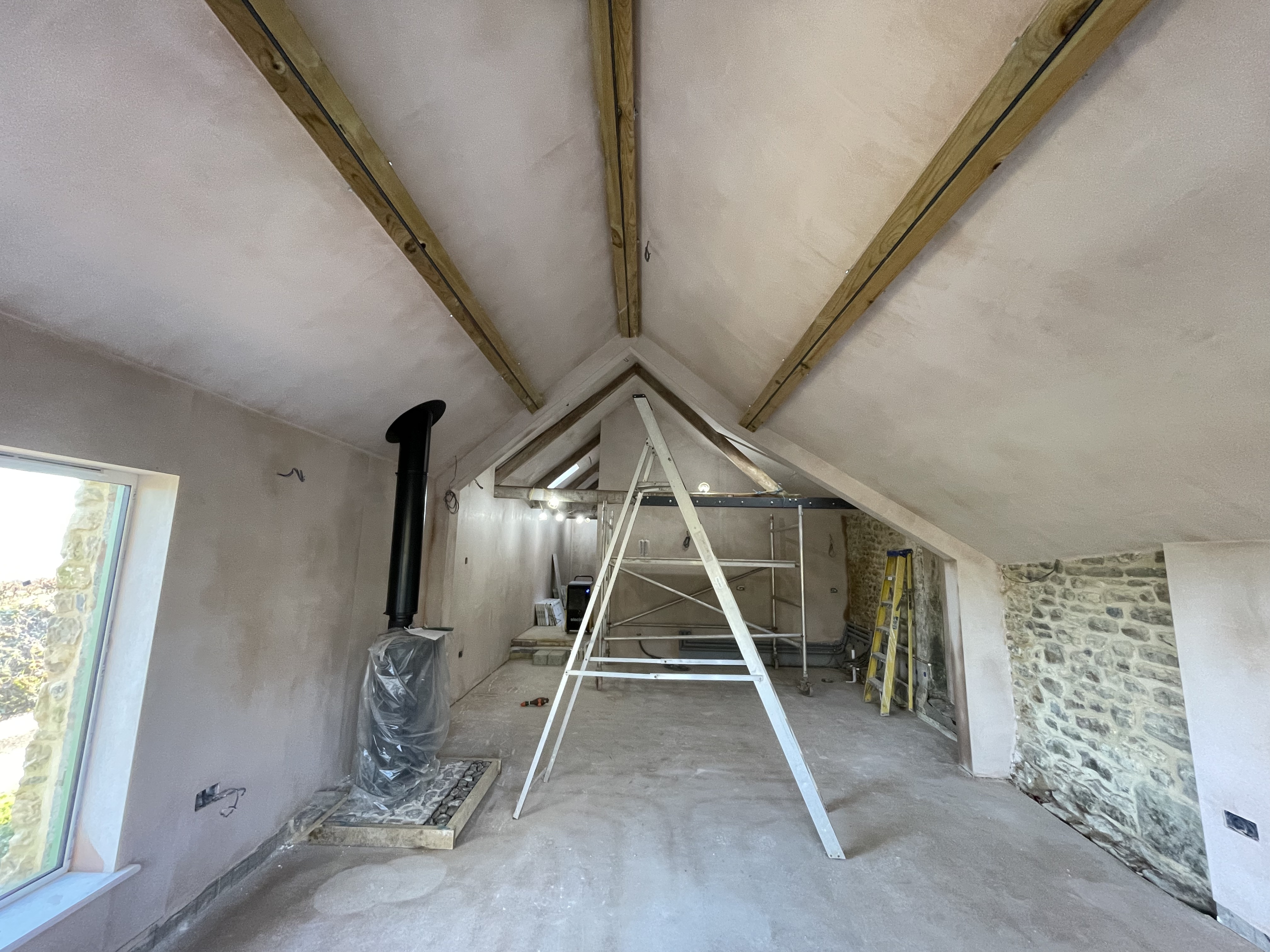 We’ve seen a real step change in our new house this week, as the plasterer has been incredibly hard at work and almost finished the entire building (save for a tiny triangle that’s been missed). It’s strange how much bigger the house looks now the plaster is on the walls – apparently this is very normal and is because of having smooth surfaces instead of being able to see all the beams and insulation. He’s done such an amazing job – it’s a tricky building to work in because of the beams cutting in at inconvenient places and the height of the vaulted ceilings – but every surface is completely smooth, even in the spaces behind the beams that look too thin for a paintbrush.