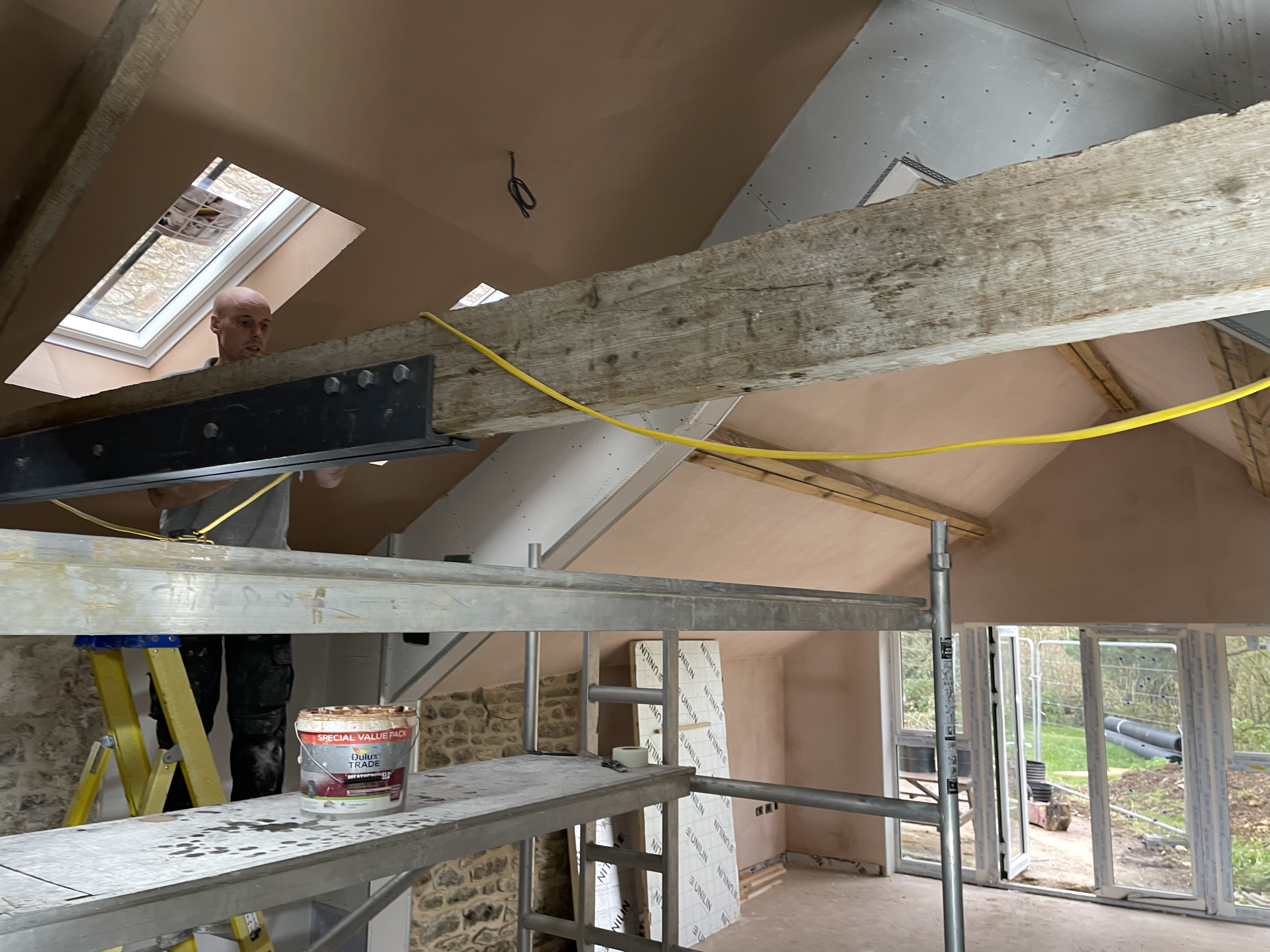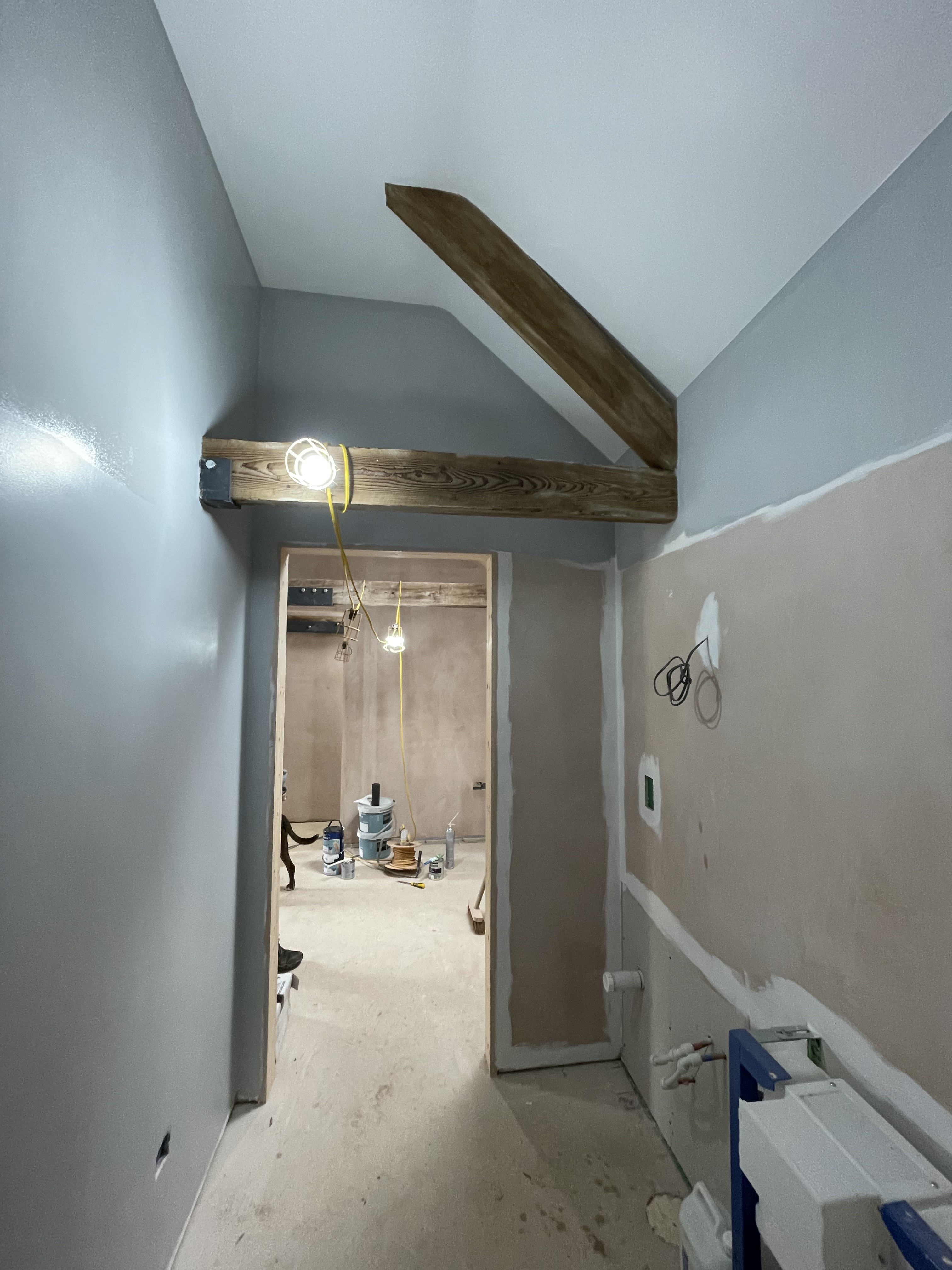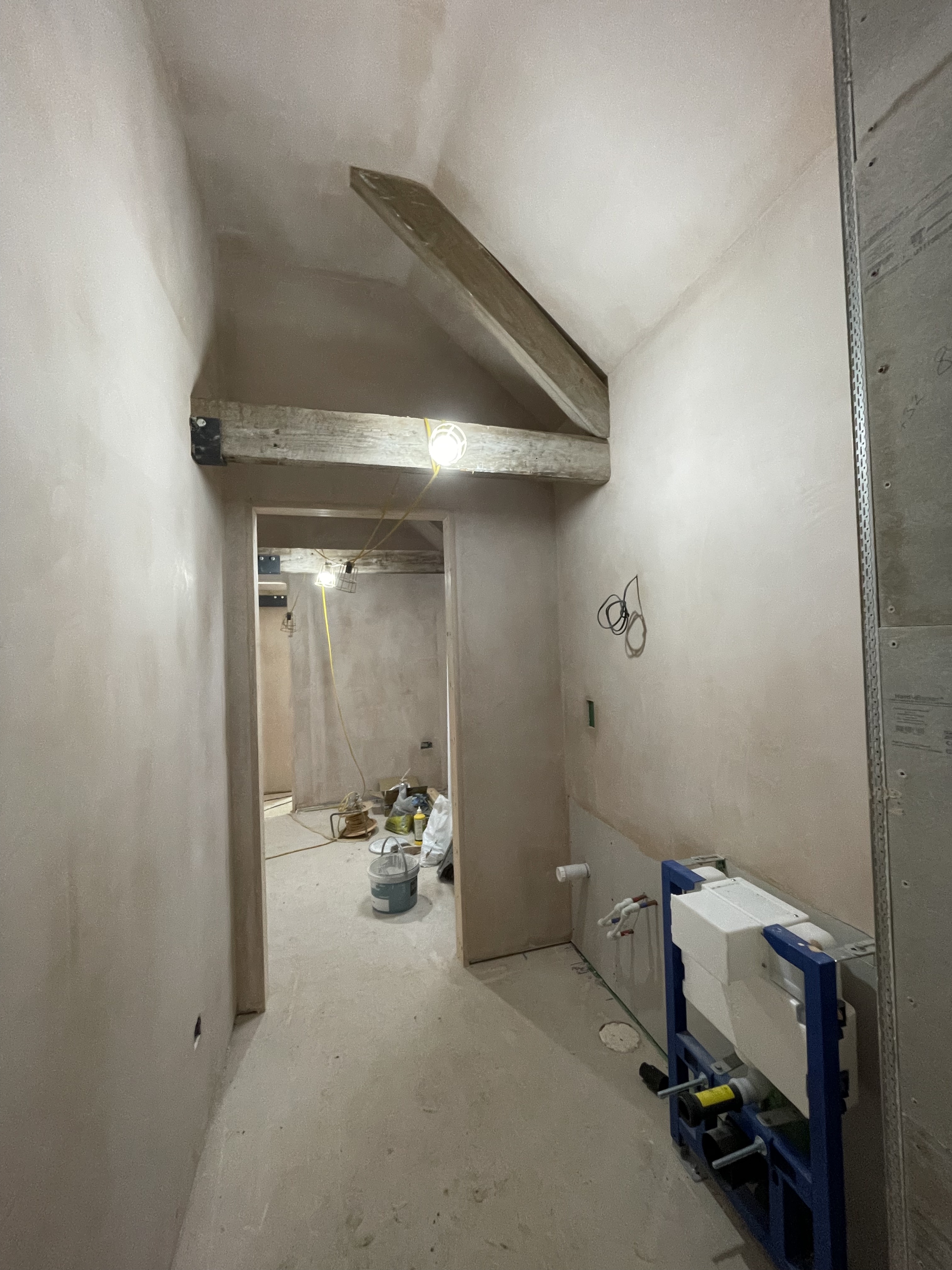 We’ve seen a real step change in our new house this week, as the plasterer has been incredibly hard at work and almost finished the entire building (save for a tiny triangle that’s been missed). It’s strange how much bigger the house looks now the plaster is on the walls – apparently this is very normal and is because of having smooth surfaces instead of being able to see all the beams and insulation. He’s done such an amazing job – it’s a tricky building to work in because of the beams cutting in at inconvenient places and the height of the vaulted ceilings – but every surface is completely smooth, even in the spaces behind the beams that look too thin for a paintbrush.