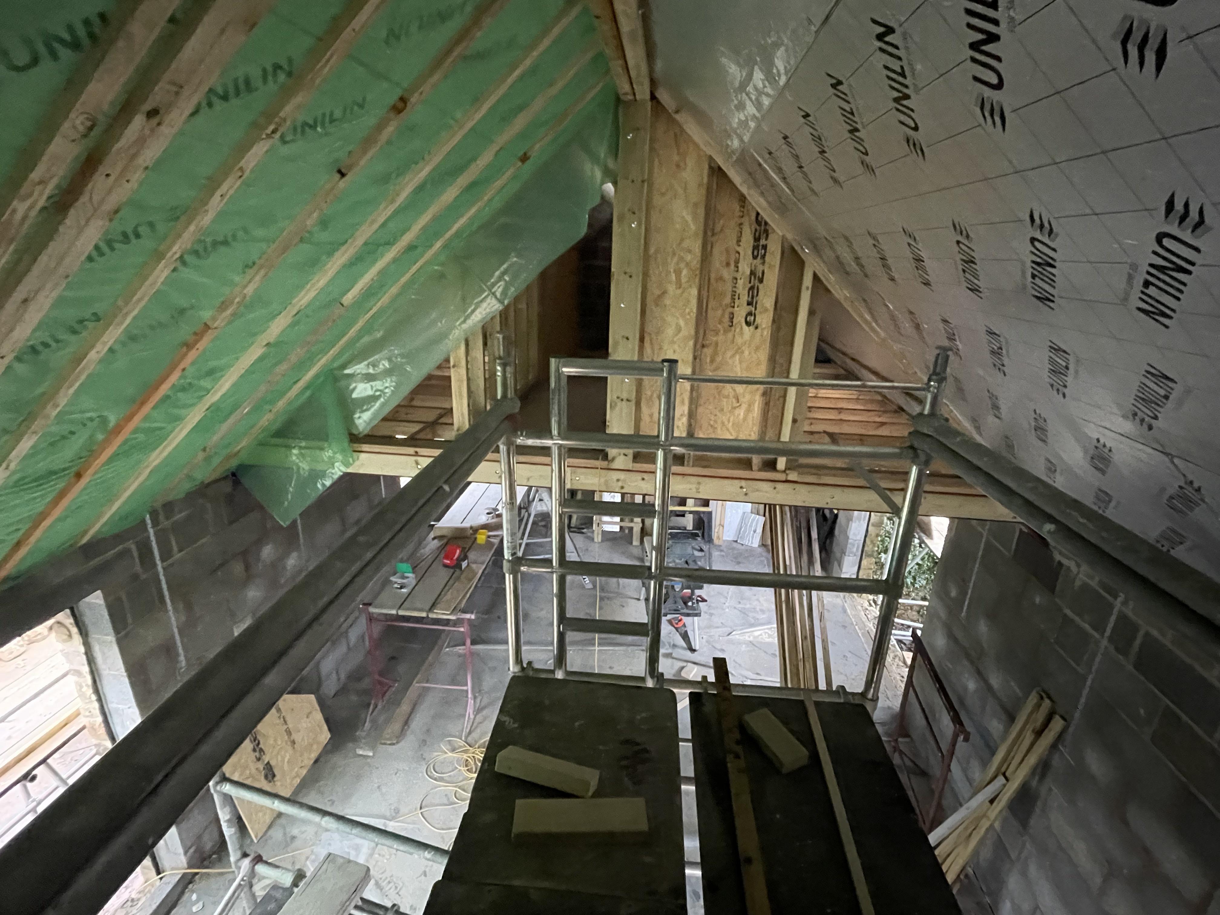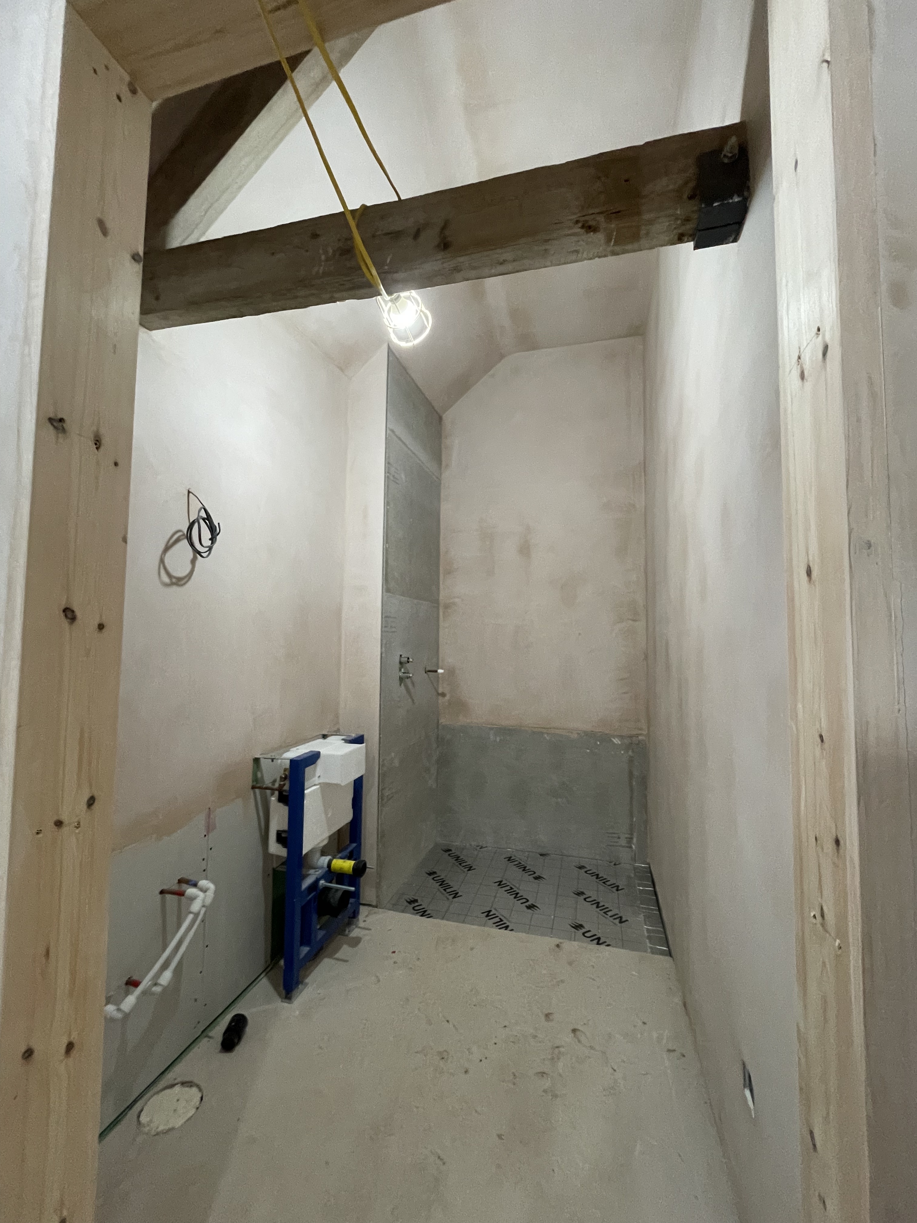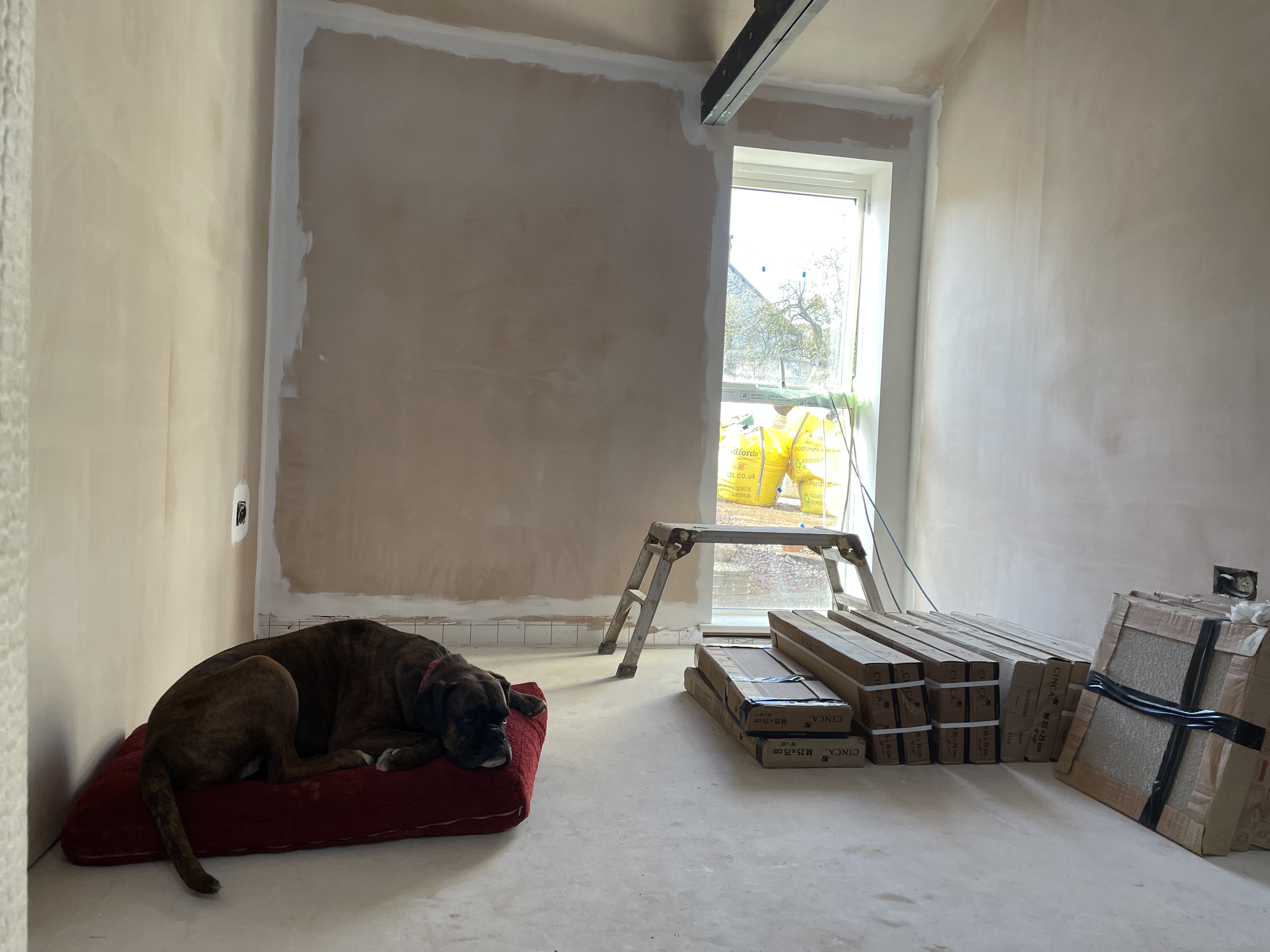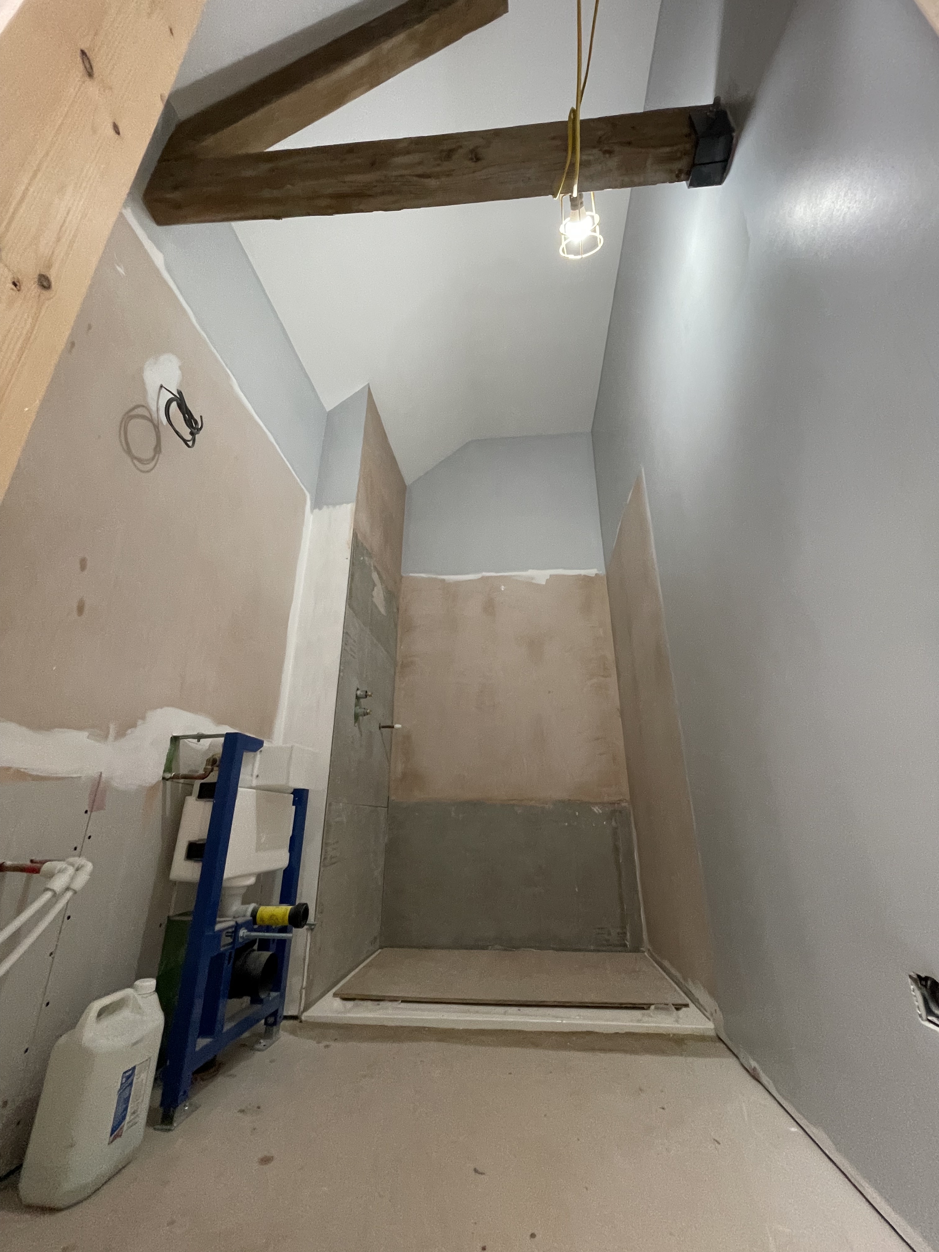 We’ve seen a real step change in our new house this week, as the plasterer has been incredibly hard at work and almost finished the entire building (save for a tiny triangle that’s been missed). It’s strange how much bigger the house looks now the plaster is on the walls – apparently this is very normal and is because of having smooth surfaces instead of being able to see all the beams and insulation. He’s done such an amazing job – it’s a tricky building to work in because of the beams cutting in at inconvenient places and the height of the vaulted ceilings – but every surface is completely smooth, even in the spaces behind the beams that look too thin for a paintbrush.