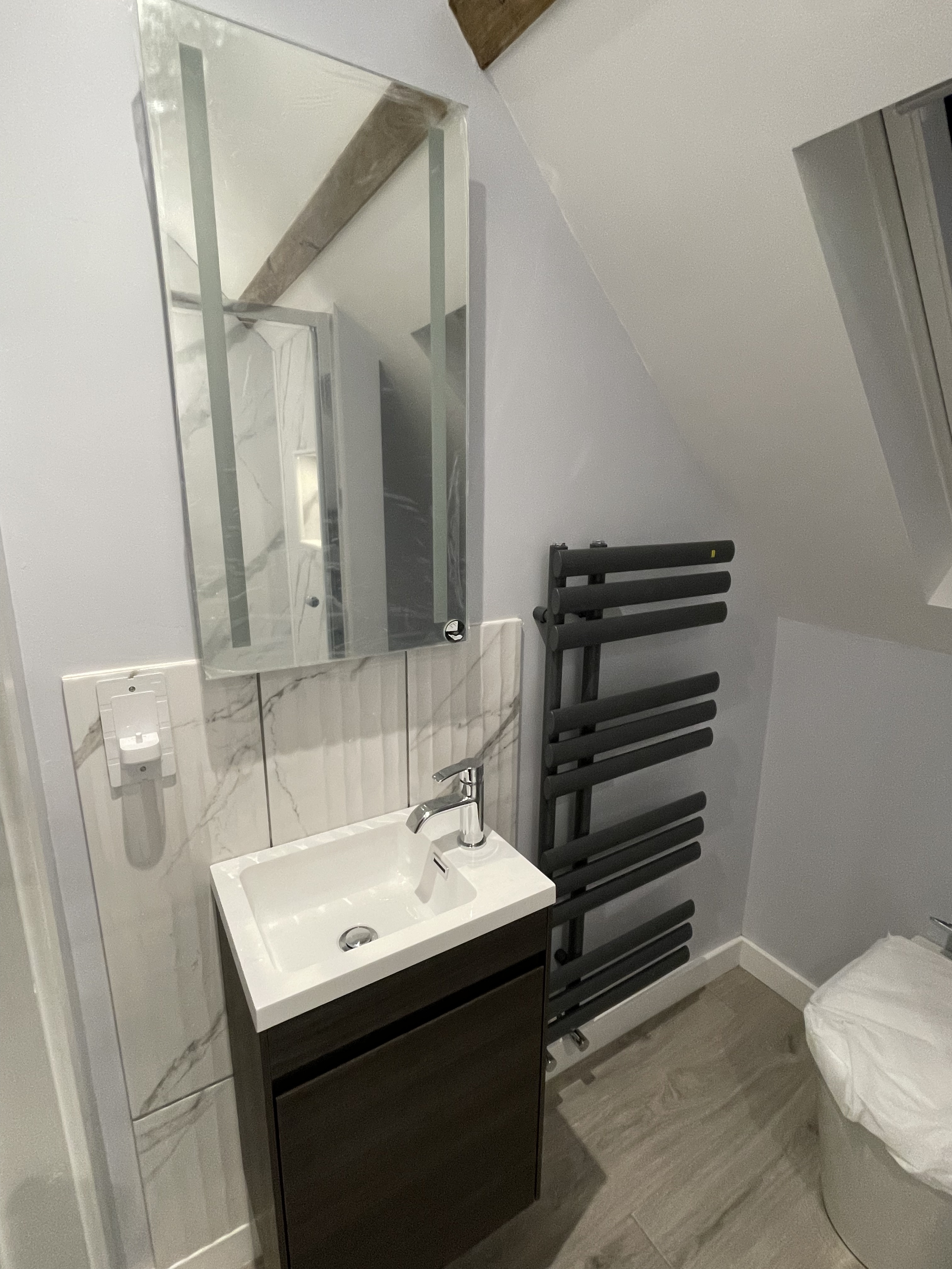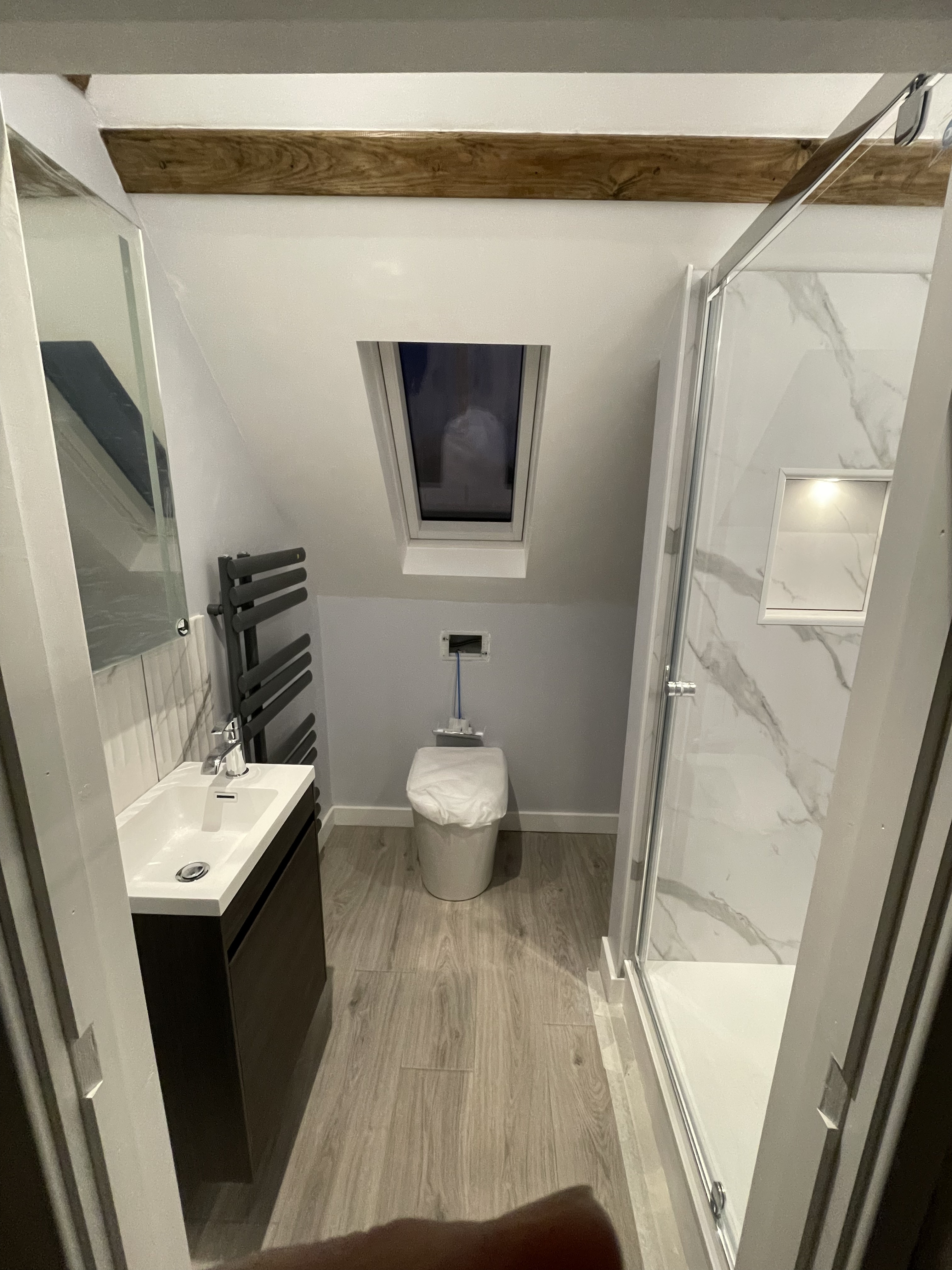 The top floor shower room is pretty much finished now and is looking lovely. Between the plumbers and our site manager, they tiled a section behind the sink and installed all the fixtures within a week. The only things left to do are to wire up the mirror, sand and paint the filler around the toilet flush, and then install the door (which was waiting for us to paint the architrave and is now held up by the lack of paint). Oh and then silicon everything in. It’s a nice milestone and is a real transformation from the water cupboard it was originally.