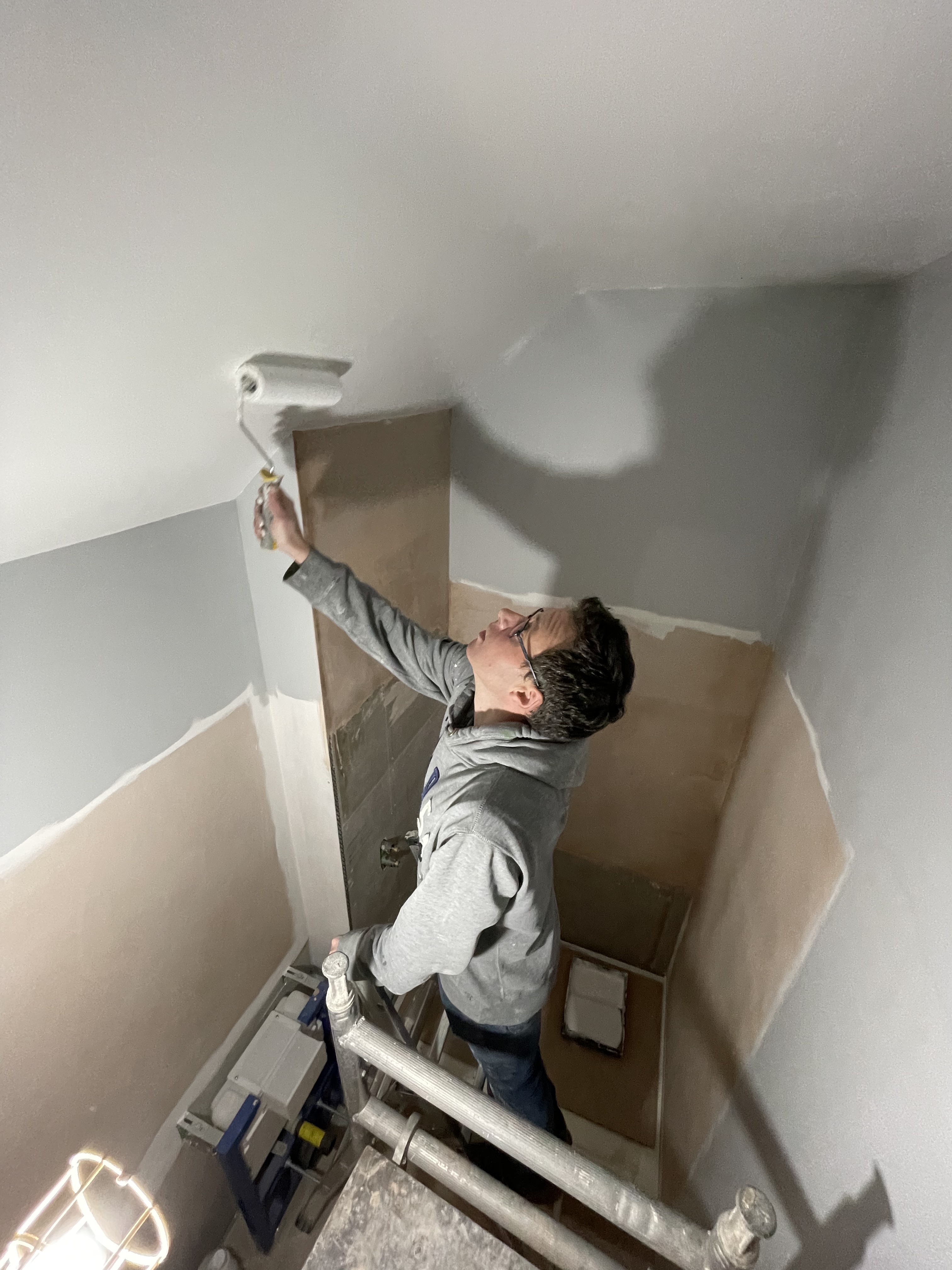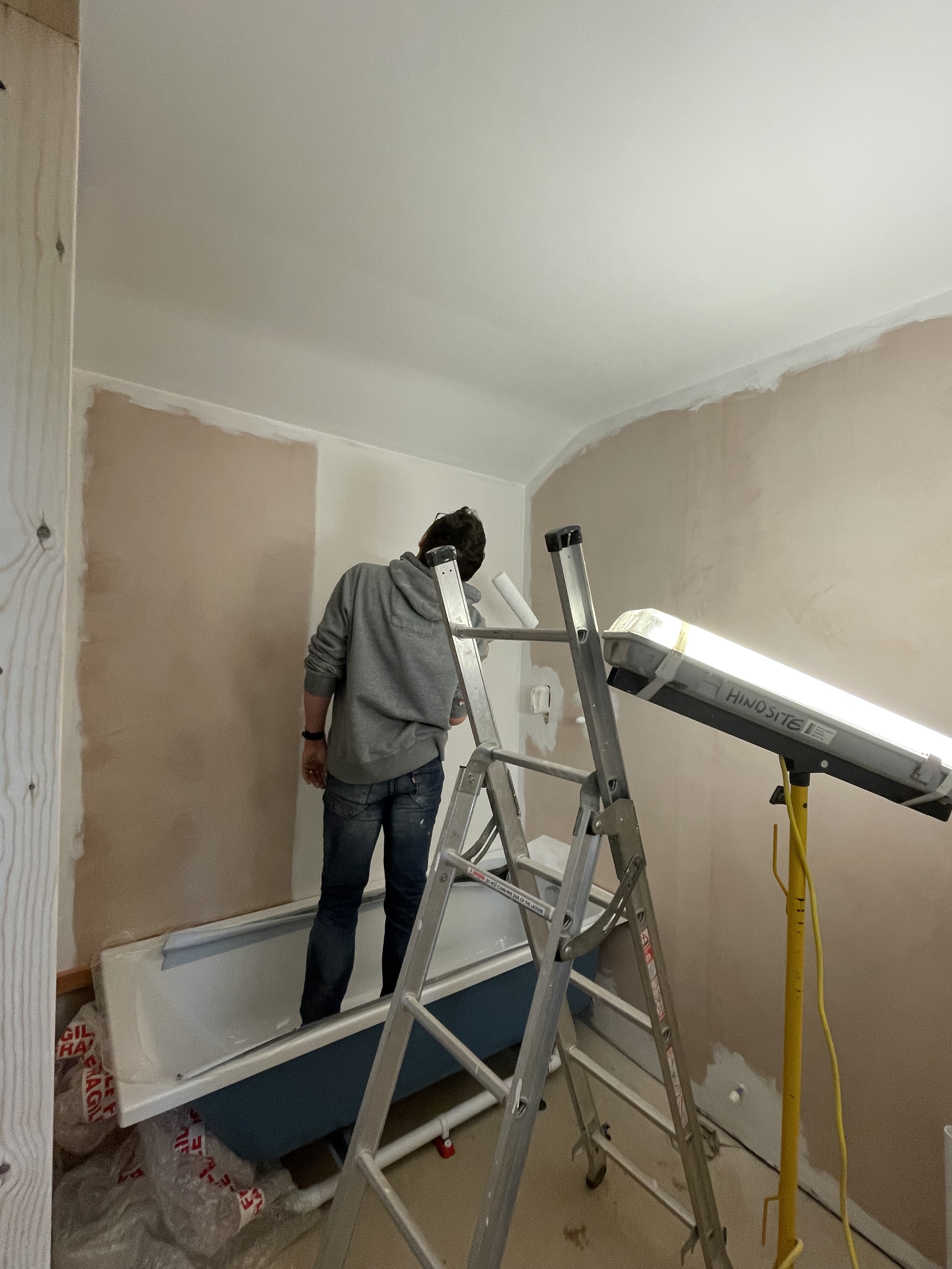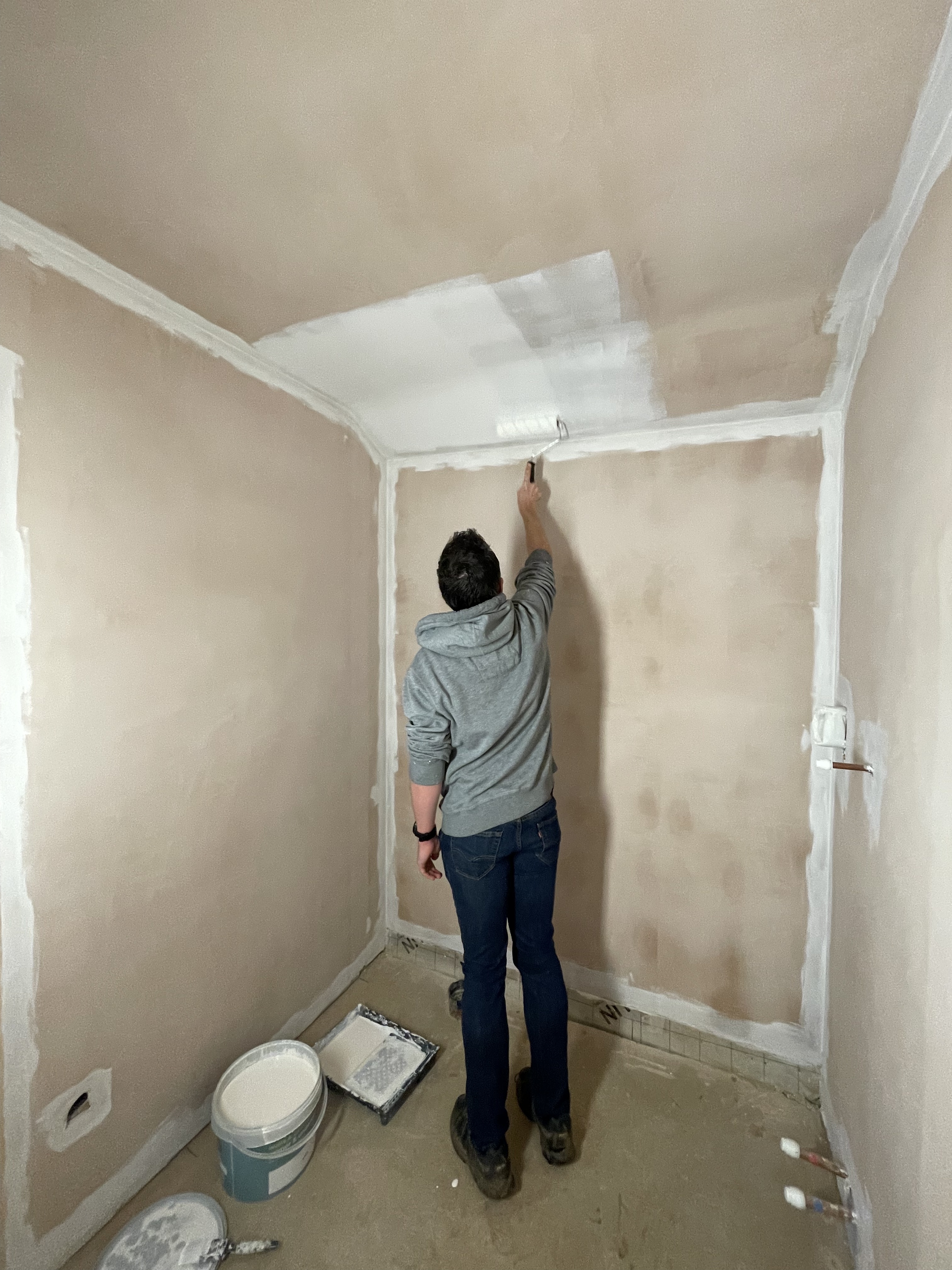 With the tiler coming on Monday to do the bathroom and ensuite, this gave us a week to prime and paint both rooms. Cue a couple of mornings off during the week and our first Saturday job – luckily we only needed to do the areas that aren’t being tiled or we’d never have got it all done.