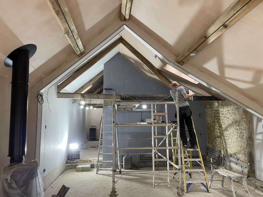 We’ve seen a real step change in our new house this week, as the plasterer has been incredibly hard at work and almost finished the entire building (save for a tiny triangle that’s been missed). It’s strange how much bigger the house looks now the plaster is on the walls – apparently this is very normal and is because of having smooth surfaces instead of being able to see all the beams and insulation. He’s done such an amazing job – it’s a tricky building to work in because of the beams cutting in at inconvenient places and the height of the vaulted ceilings – but every surface is completely smooth, even in the spaces behind the beams that look too thin for a paintbrush.