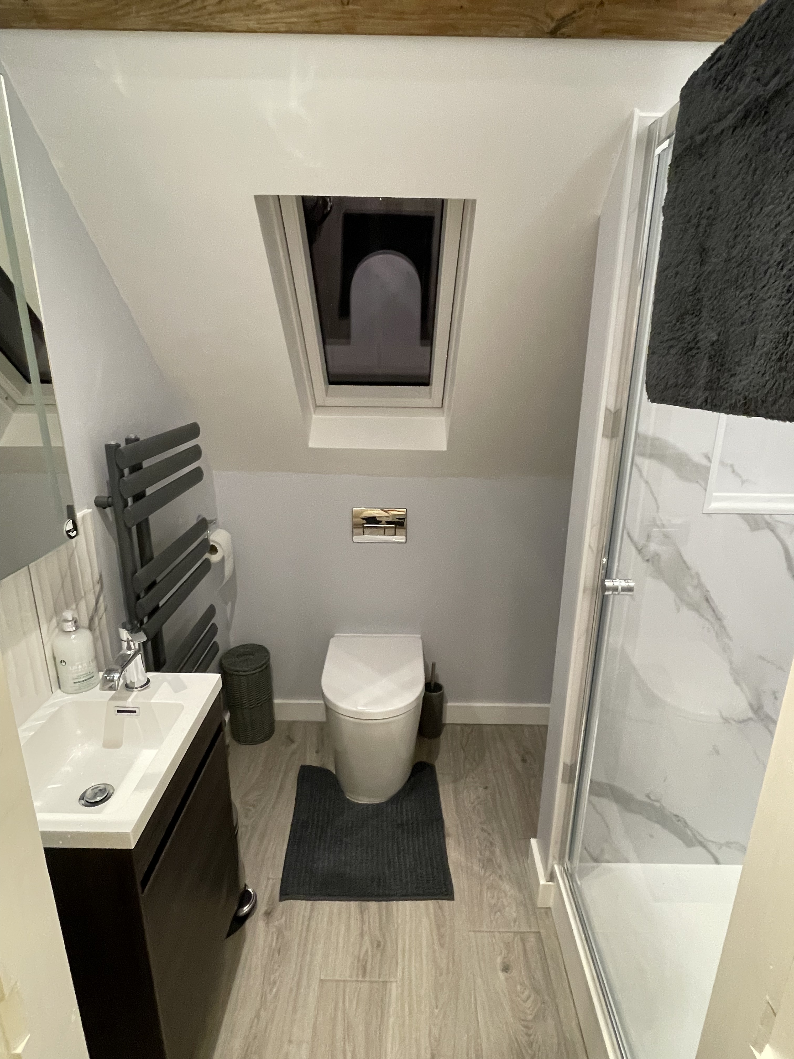 We’ve been on countdown to get the top floor bedrooms ready for family coming to stay over Christmas, and very nearly made it. The doors and door metal are now fully painted and hung (both bedrooms and the shower room), and we spent Friday night and Saturday morning putting up all the fixtures we’d forgotten about – towel holders, door hooks, toilet roll holders etc – which took more time than we expected it to. The toilet roll basket we ordered wasn’t the right colour (‘antique wash’ i.e. brown instead of grey) so we then ordered some spray paint to spray it, and it looks so much better. We managed to get curtains up in one of the rooms but dismally failed in the second. Nearly there though!