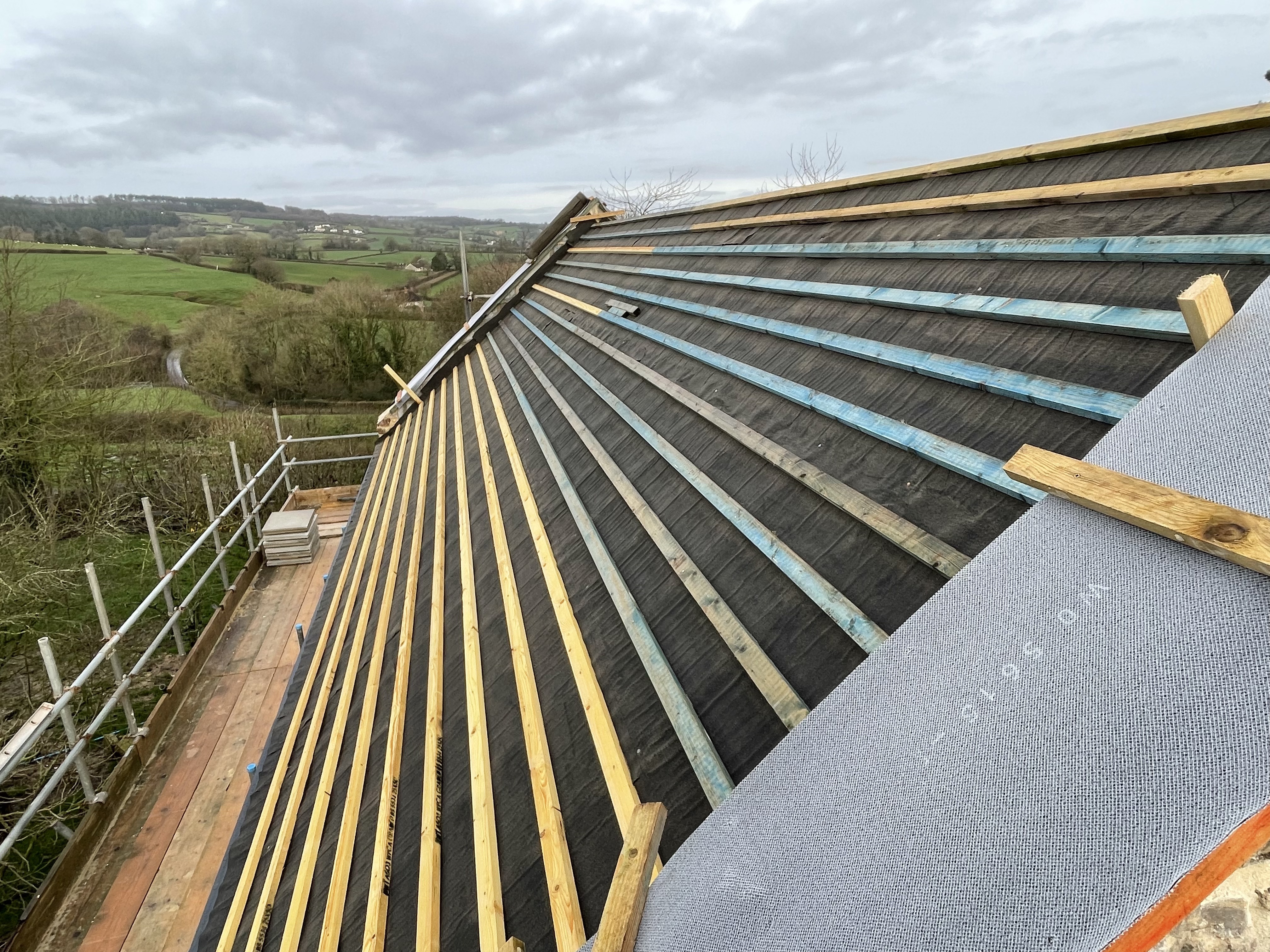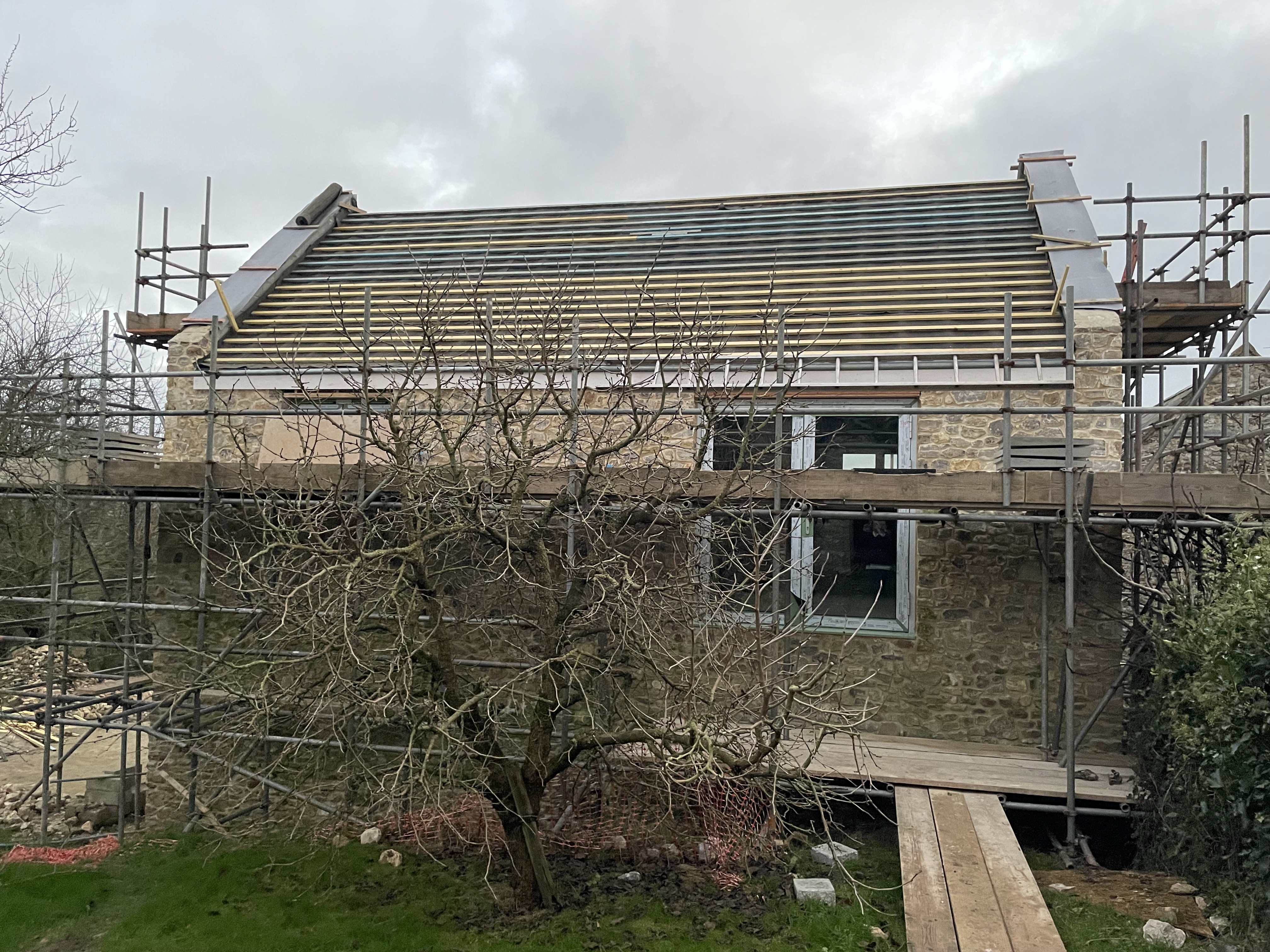 The other big job last week was to start getting the roof ready on the garage/communal barn. It’s taken much longer to build up the walls than expected, and the first floor flooring was only supposed to be waterproof for two months. That was up in October sometime, so getting the building watertight has been a priority for a while now (luckily the flooring looks like it might be ok though). The roof has been covered by tarpaulin, and we had the windows and doors put in a couple of weeks ago, but it hasn’t been entirely waterproof. So despite the stormy weather, our roofers came to felt and batten the roof before Christmas, which they managed to do in a morning!