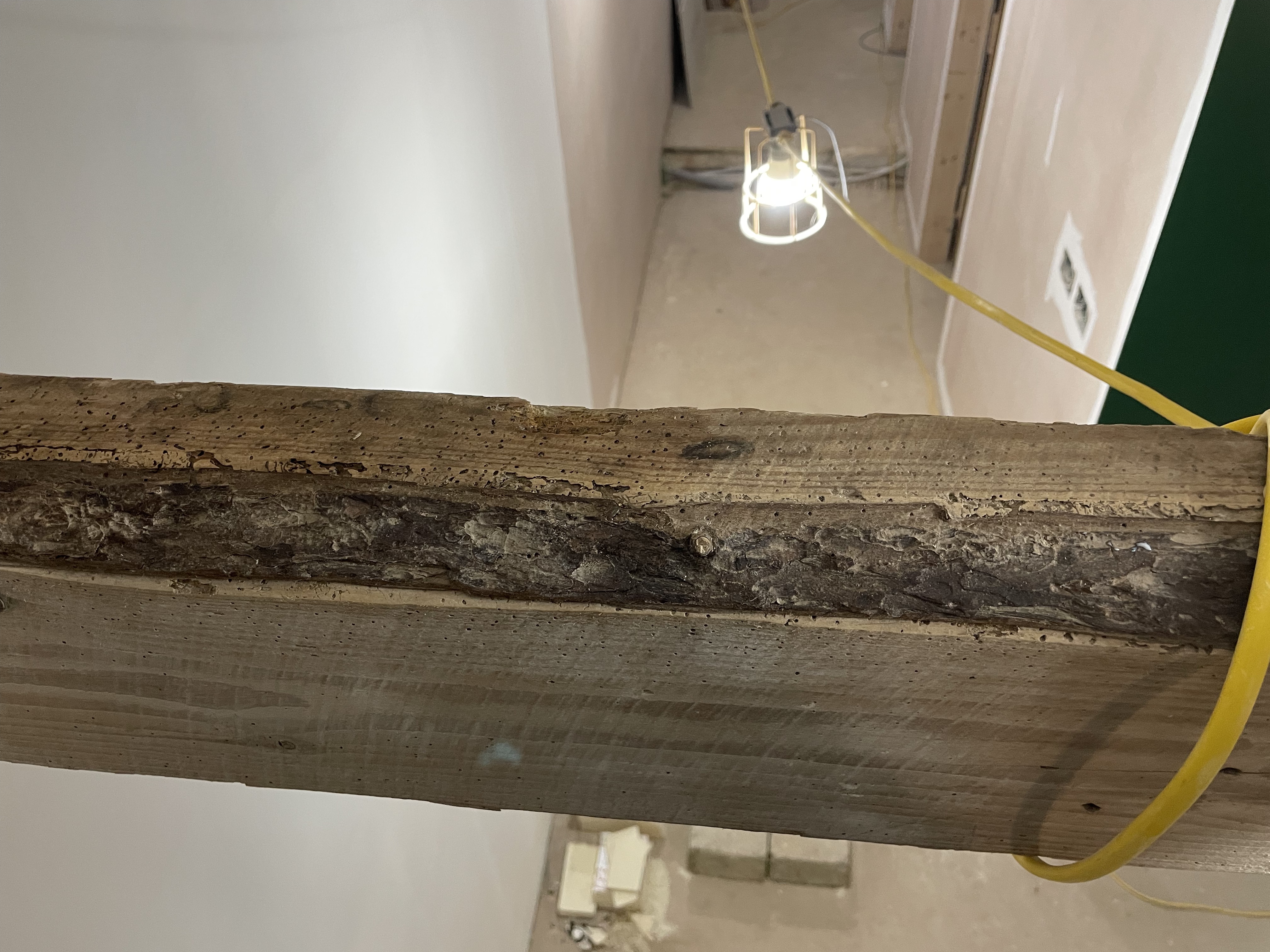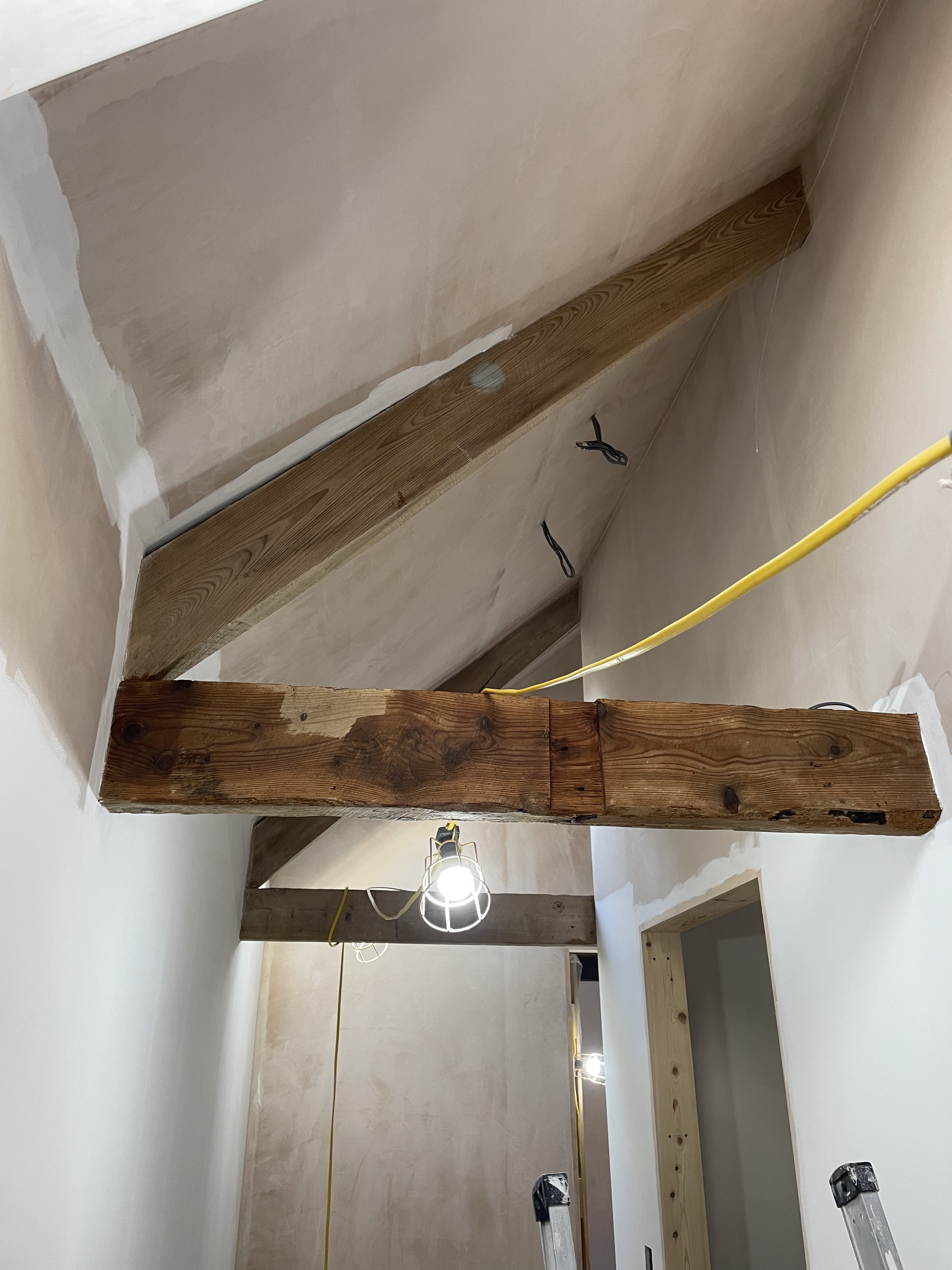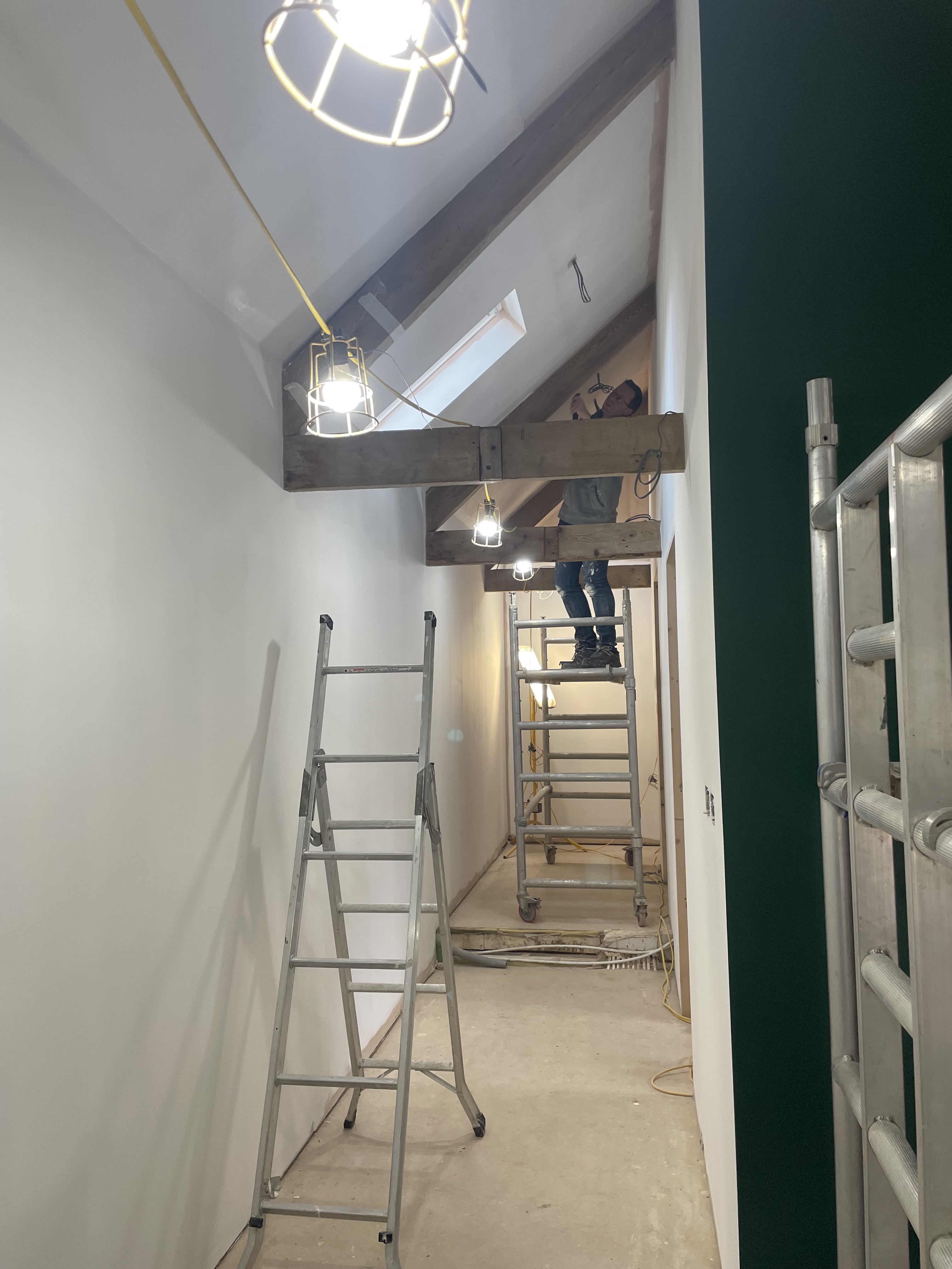 We used our spare time to clean, sand and treat a couple more beams (you should see the amount of filth that comes off them…) and prime the lounge roof and the corridor walls. With the beams, we had originally planned to apply a thin coat of clear varnish but a test patch showed the wood went dark, and we decided we prefer the lighter ‘raw’ colour of the wood now it’s been sanded. Only four more beams to go….