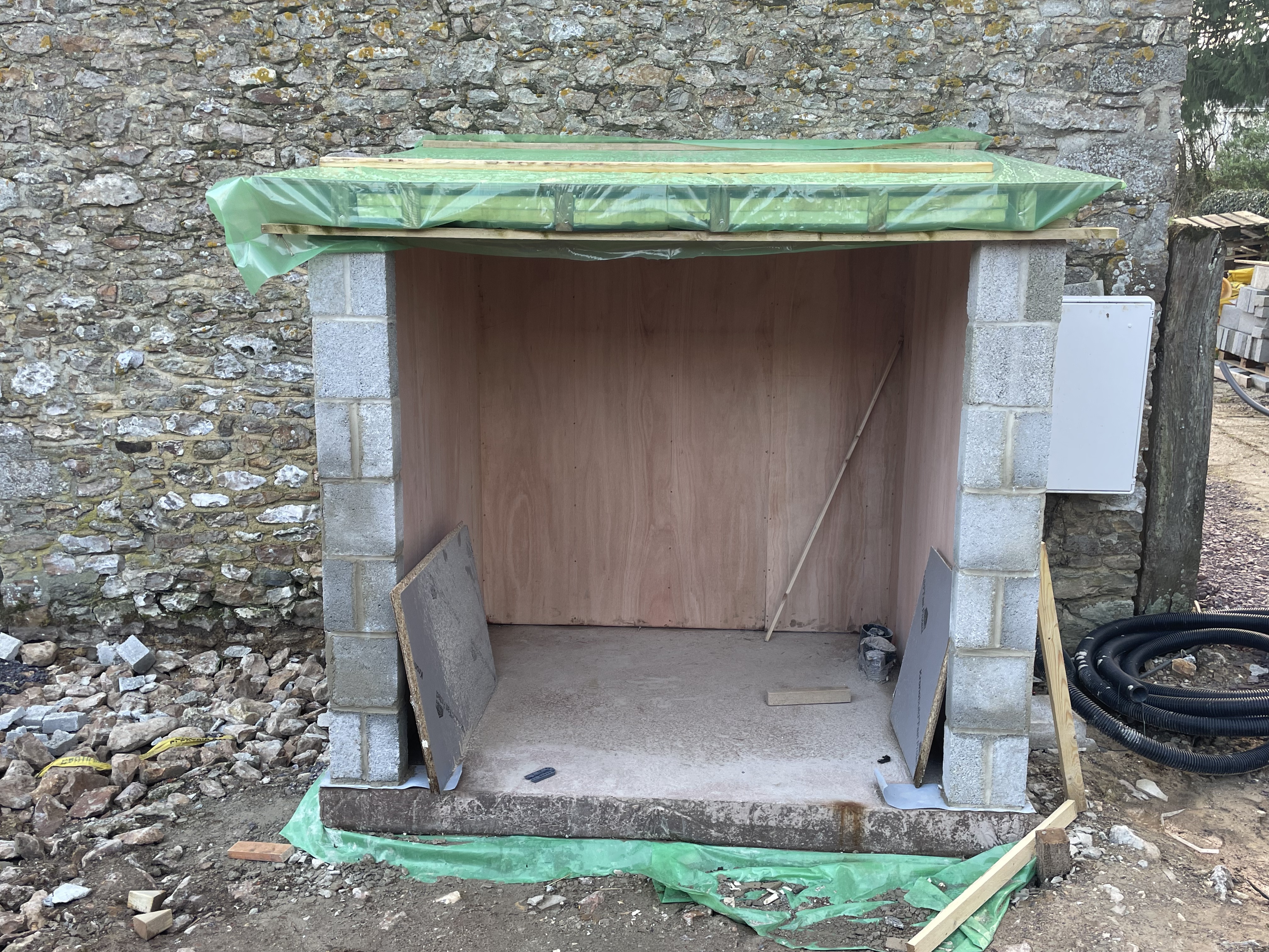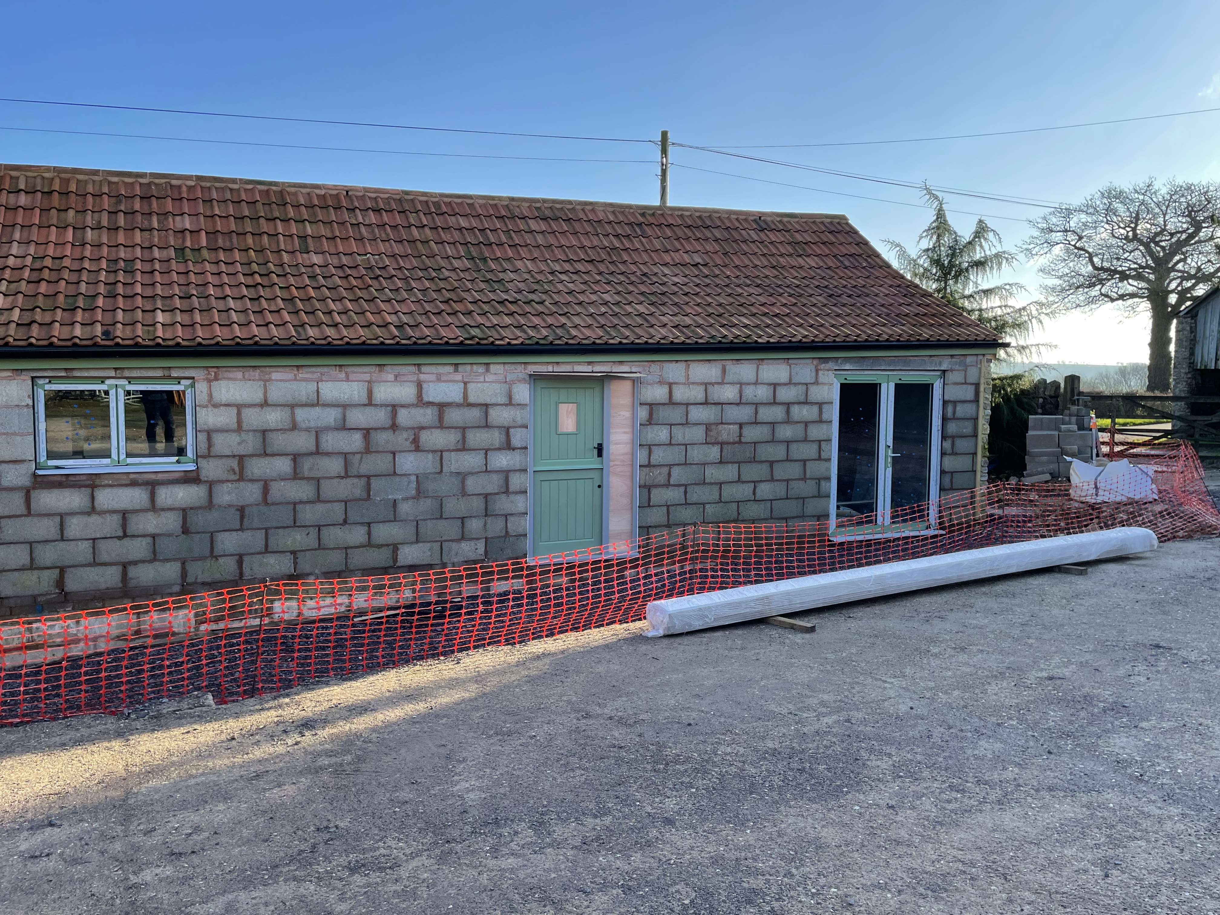 We have a February deadline to get our heat pumps installed, driven by the Ofgem heat pump incentive scheme (you have 3 months from approval date to get the system installed and up and running). Because we’re tight on space in our one-bed and three-bed barns, we’re building small outbuildings to house the hot water cylinder and equipment. One of the heat pumps will be wall-mounted, but the other two need to stand on a concrete plinth which also needs to be made. Of course you can’t build any of these in the rain – and December and January have been very wet months so far. Our builders managed to make a start on one of the outbuildings before Christmas – and this week they added the roof and wall insulation, and have boarded the inside.