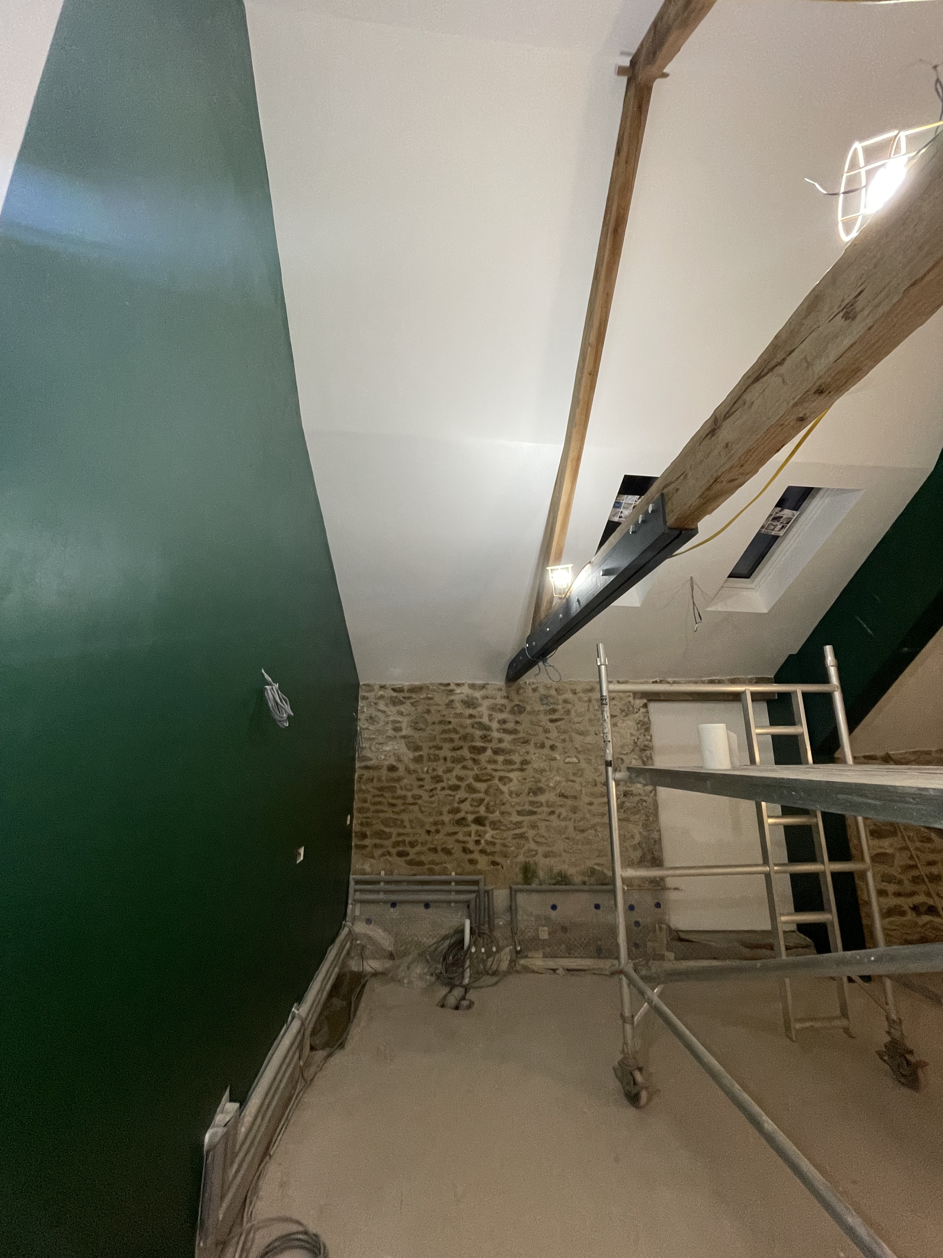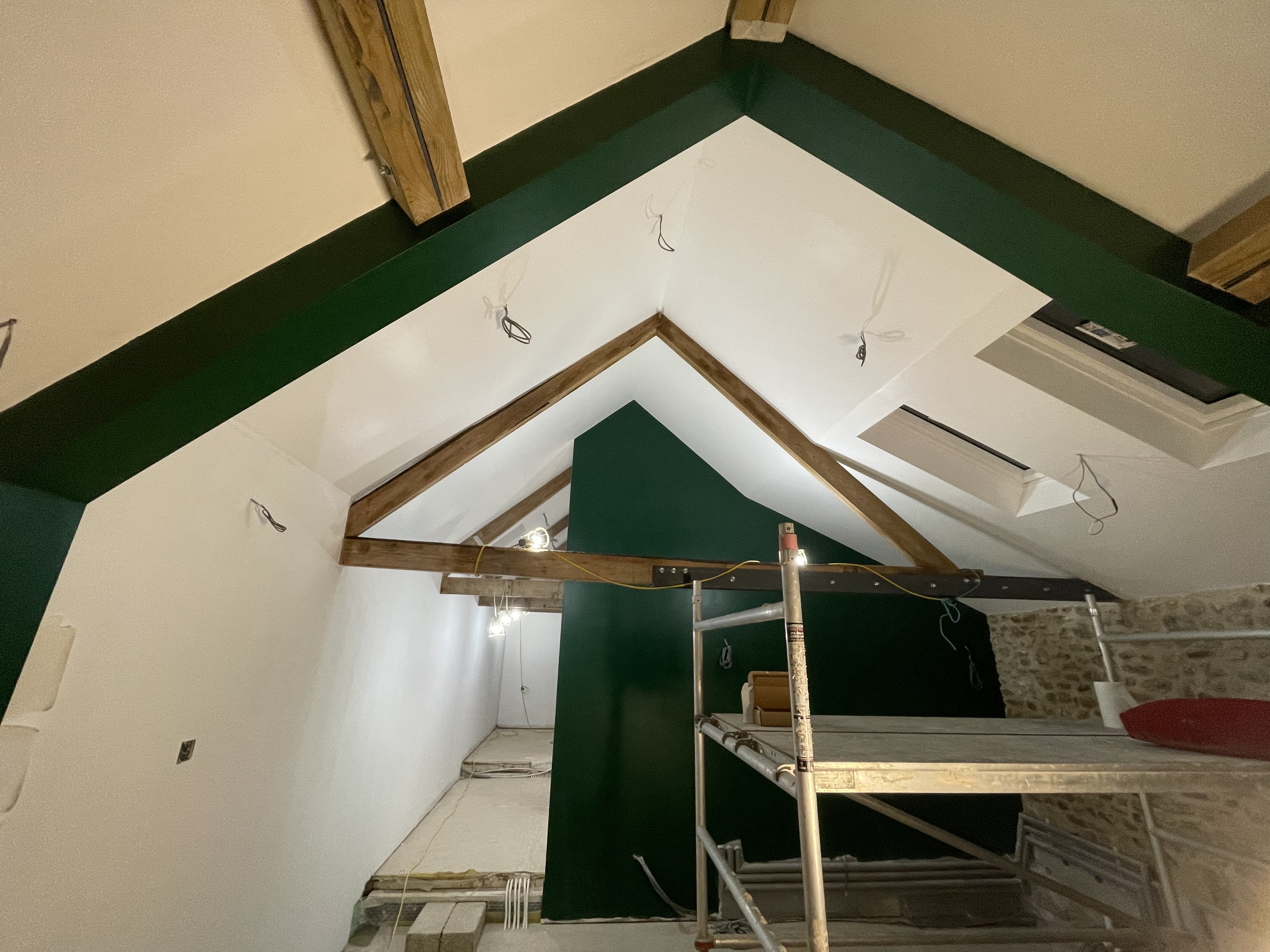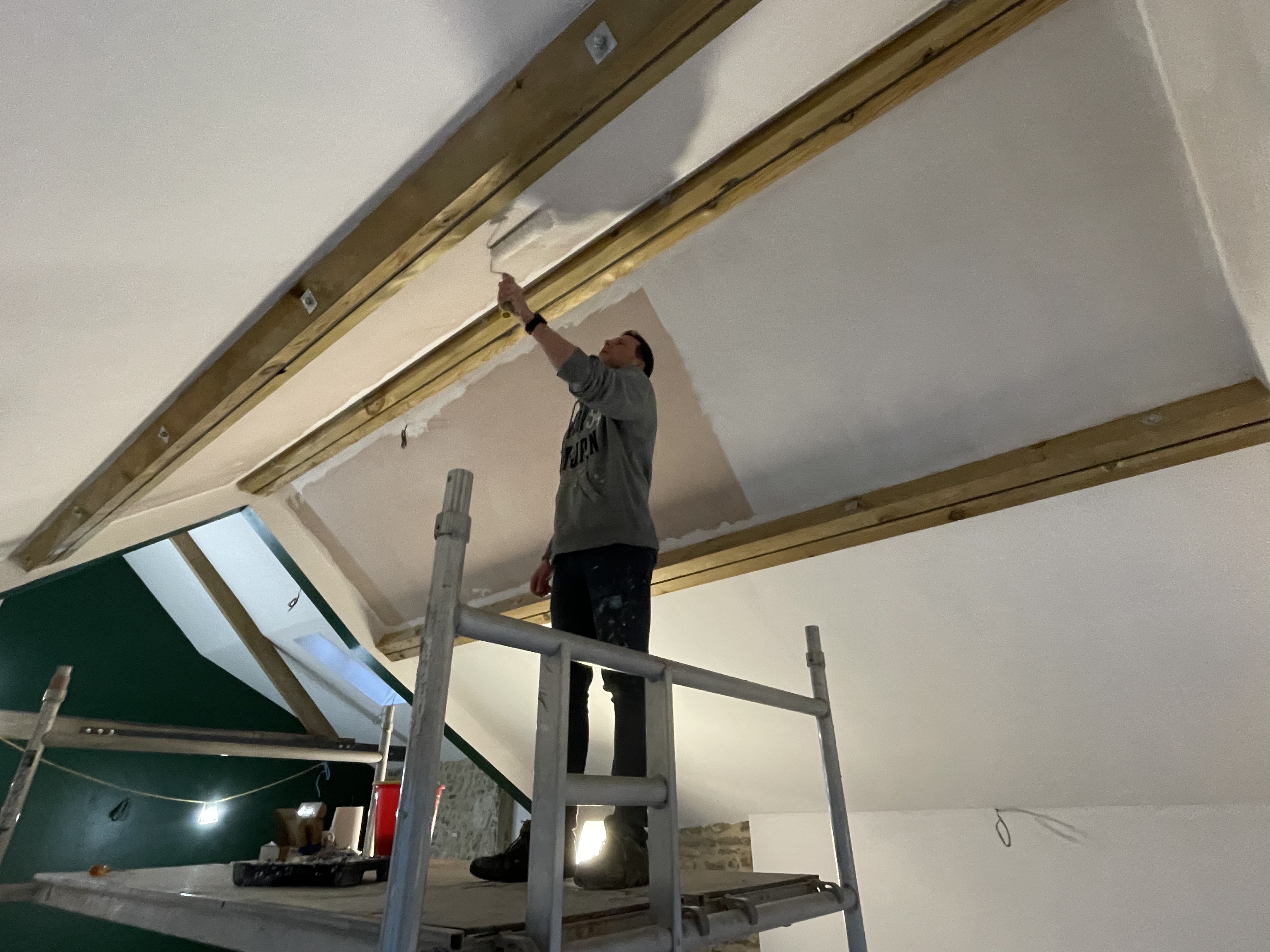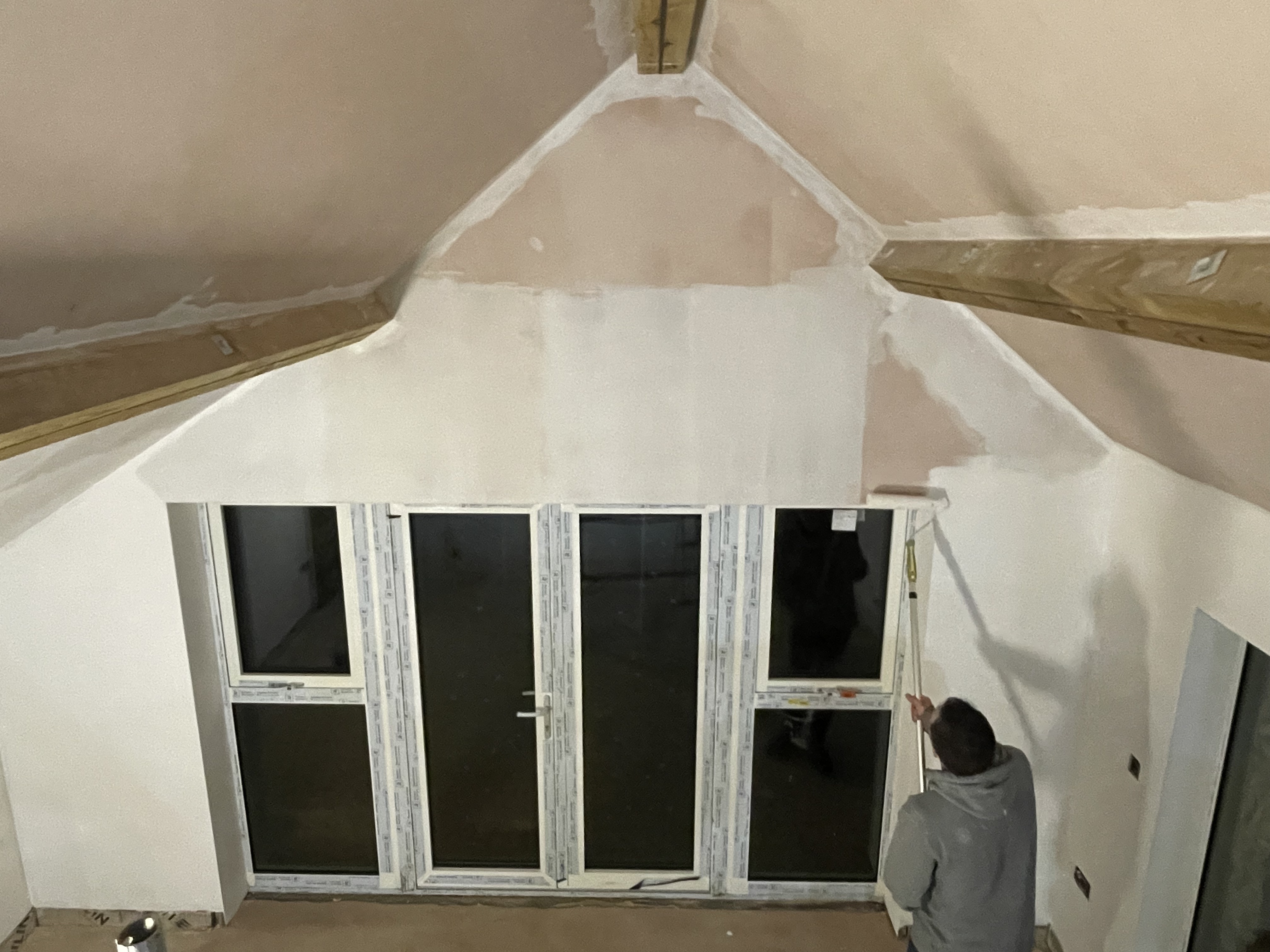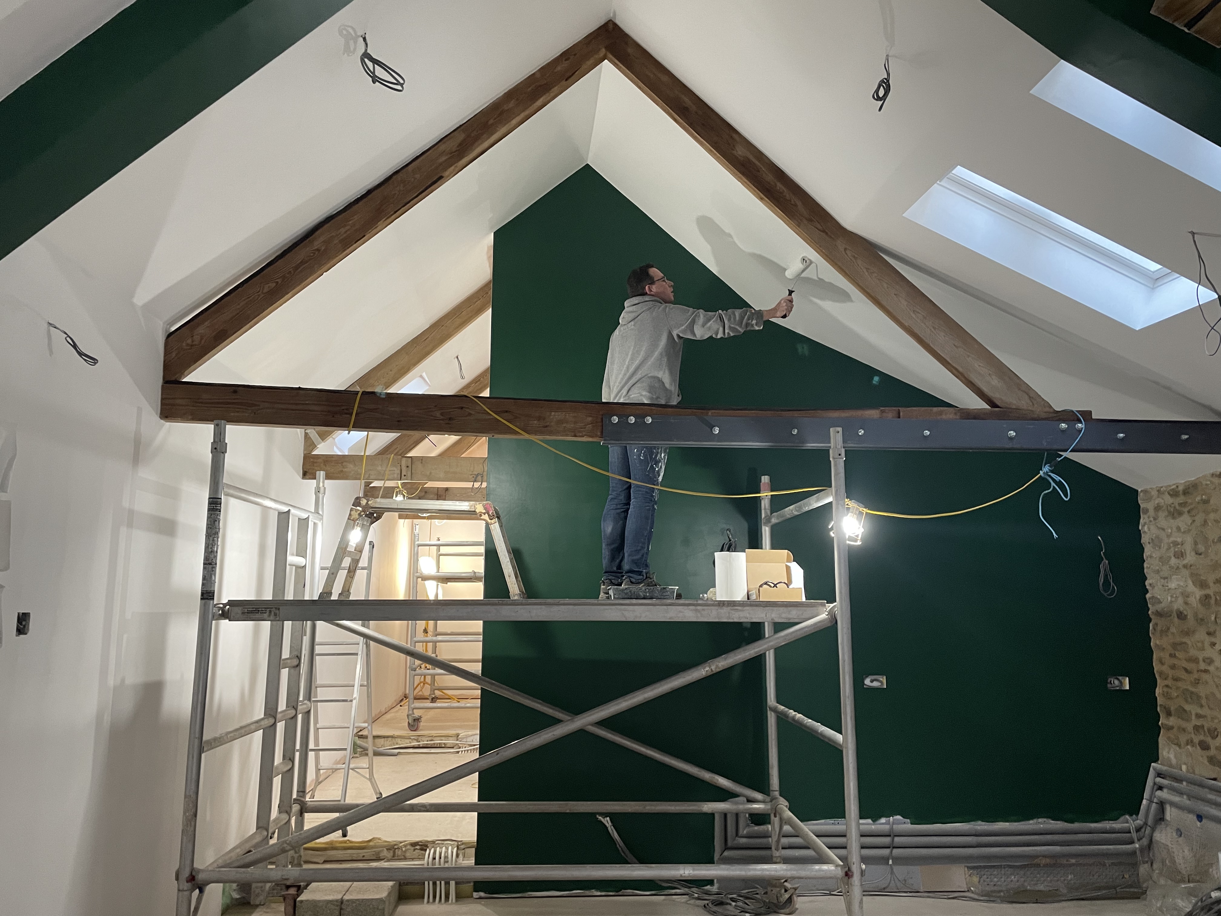 We’ve spent most evenings and all weekend painting in our new house. This is on the critical path now – the electricians are waiting for us to finish before they come in and install everything. They need the platform to install the lights in the vaulted ceilings, which can only be done before the kitchen is installed as there won’t be enough space for it otherwise. At the moment all the power in the barns is being run off the farmhouse – the electricians will also need to bring the shippon supply into the new house and fit the fuse board rather than running everything off a temporary supply. So this week we focused on getting the first coats of proper paint on the kitchen ceiling and in the ‘service cupboard’ (i.e., an airing cupboard that has the underfloor heating and heat pump equipment in, that we’ll also use for general storage). It’s been pretty difficult to paint the ceiling at height and get an even line against the green wall paint – some touching up was required afterwards!