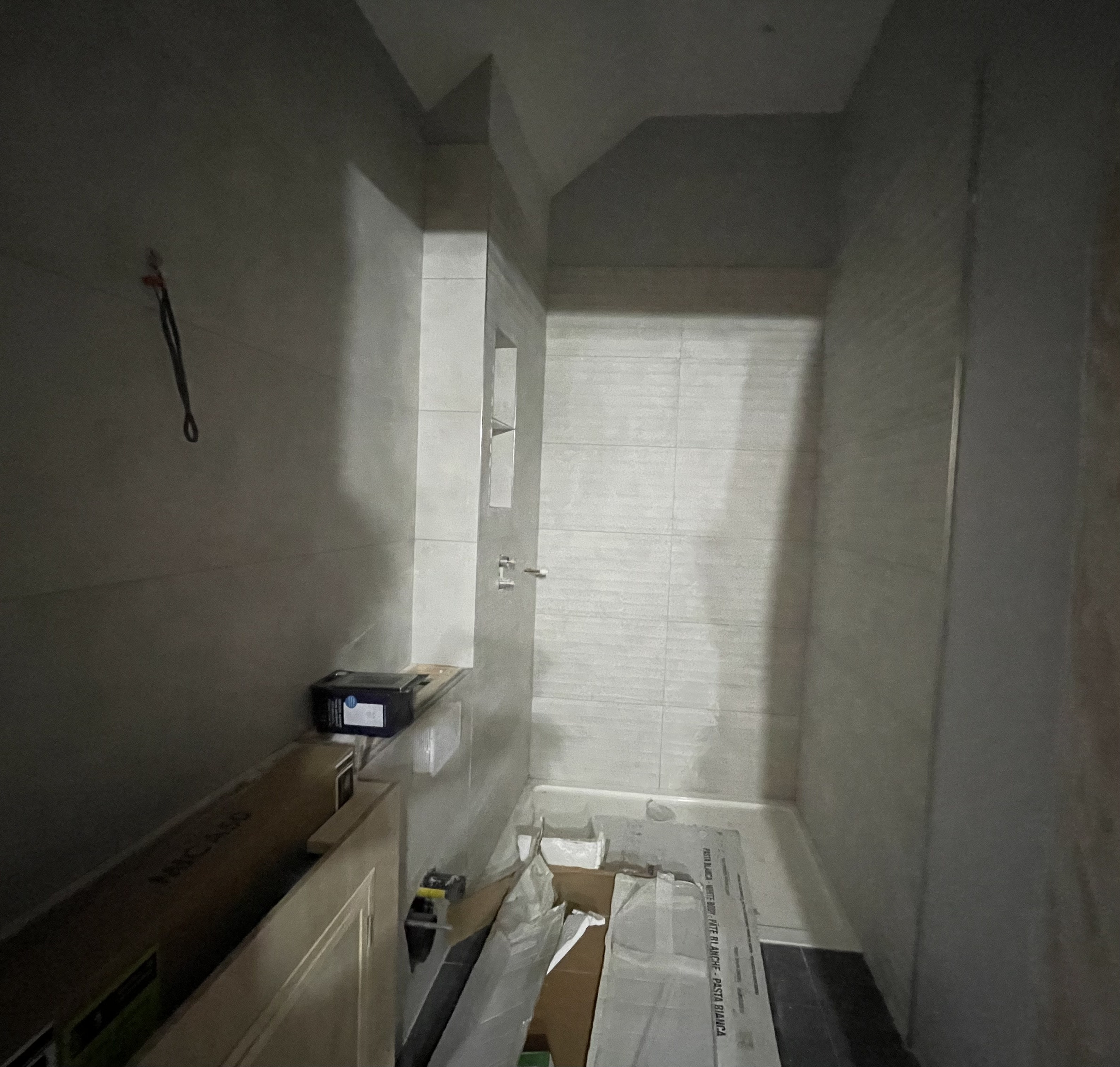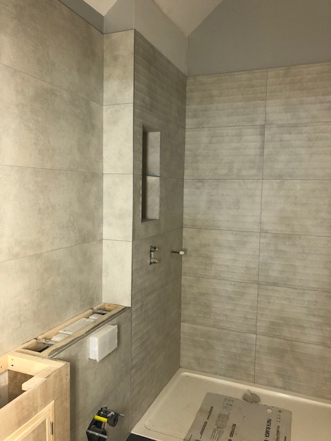 The tiler has been in to do a bit more work in the bathroom and ensuite. We had to get the back wall of tiles replaced as they’d all damaged slightly in the process of putting them in, so the tiler had to take them all off and replace them with new ones. He’s also finished tiling the wall that boxes in the shower pipes, so the whole room is coming together nicely.