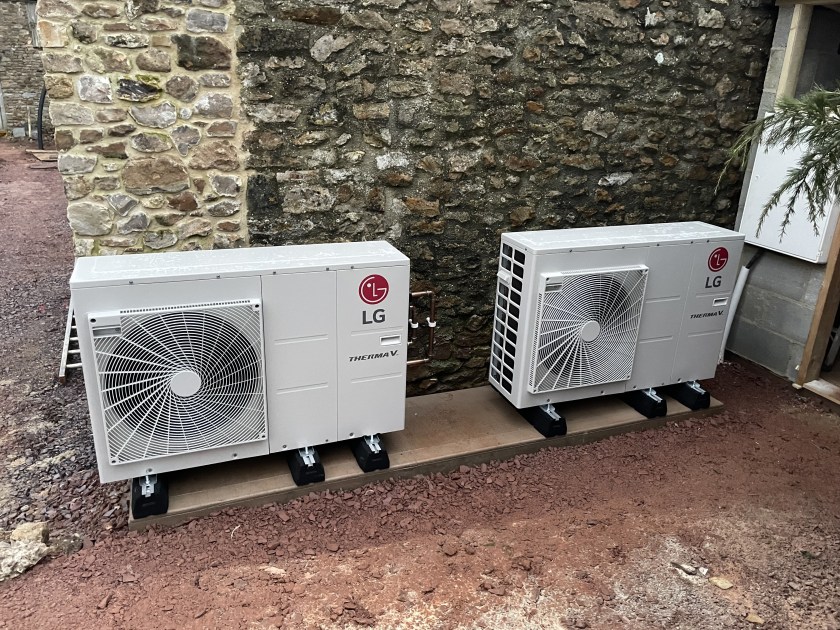 Another week, and more progress across the site. One of the most exciting for us is the air source heat pumps being installed for our new house and for the one-bed cottage – mainly because of the process and stress we went through for these. We put in a separate planning application for renewable technology across the site because we were cautious of how much change the council would accept in one go (this was after we put our first applications in for change of use from barns to residential; and for the changes to the top floor of the farmhouse). It took quite a few months for the council to approve the application, but as this was our only option for sustainable and affordable heating, it was crucial to our plans.