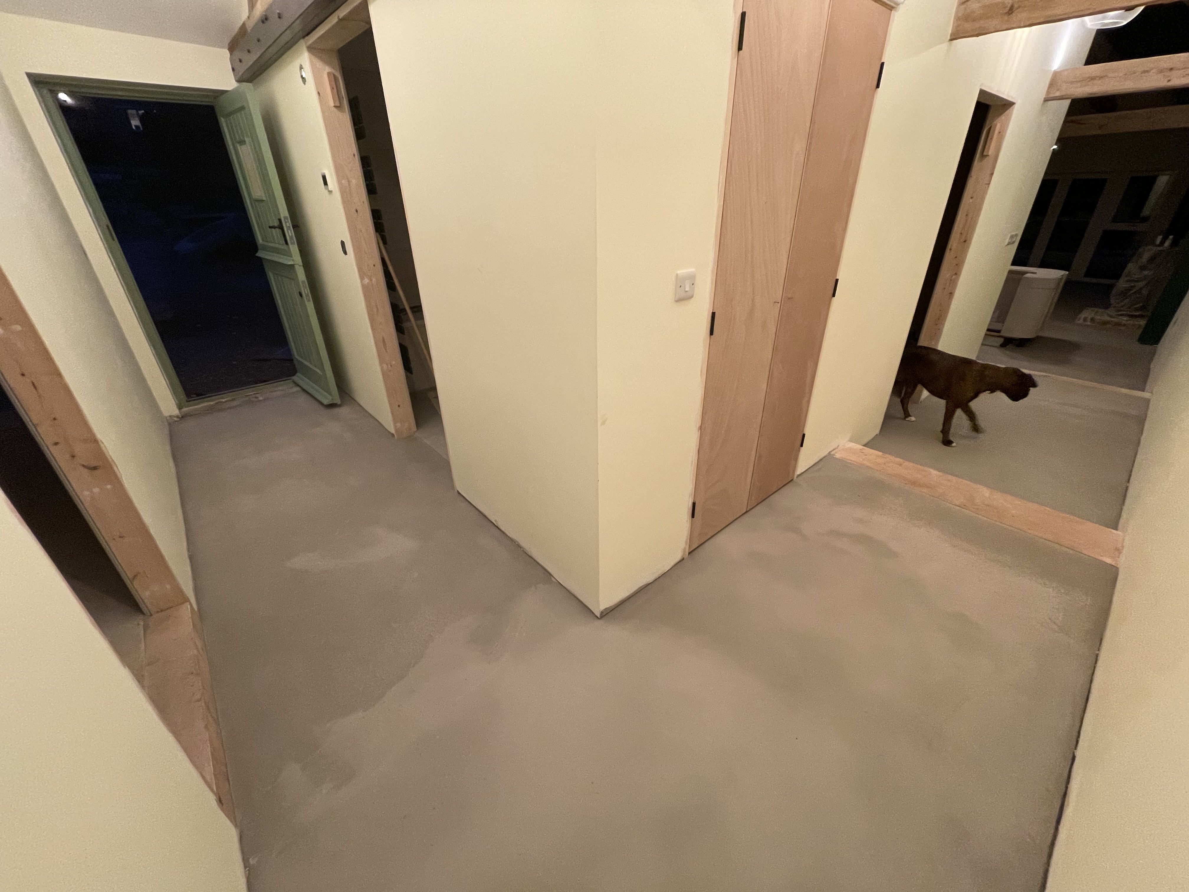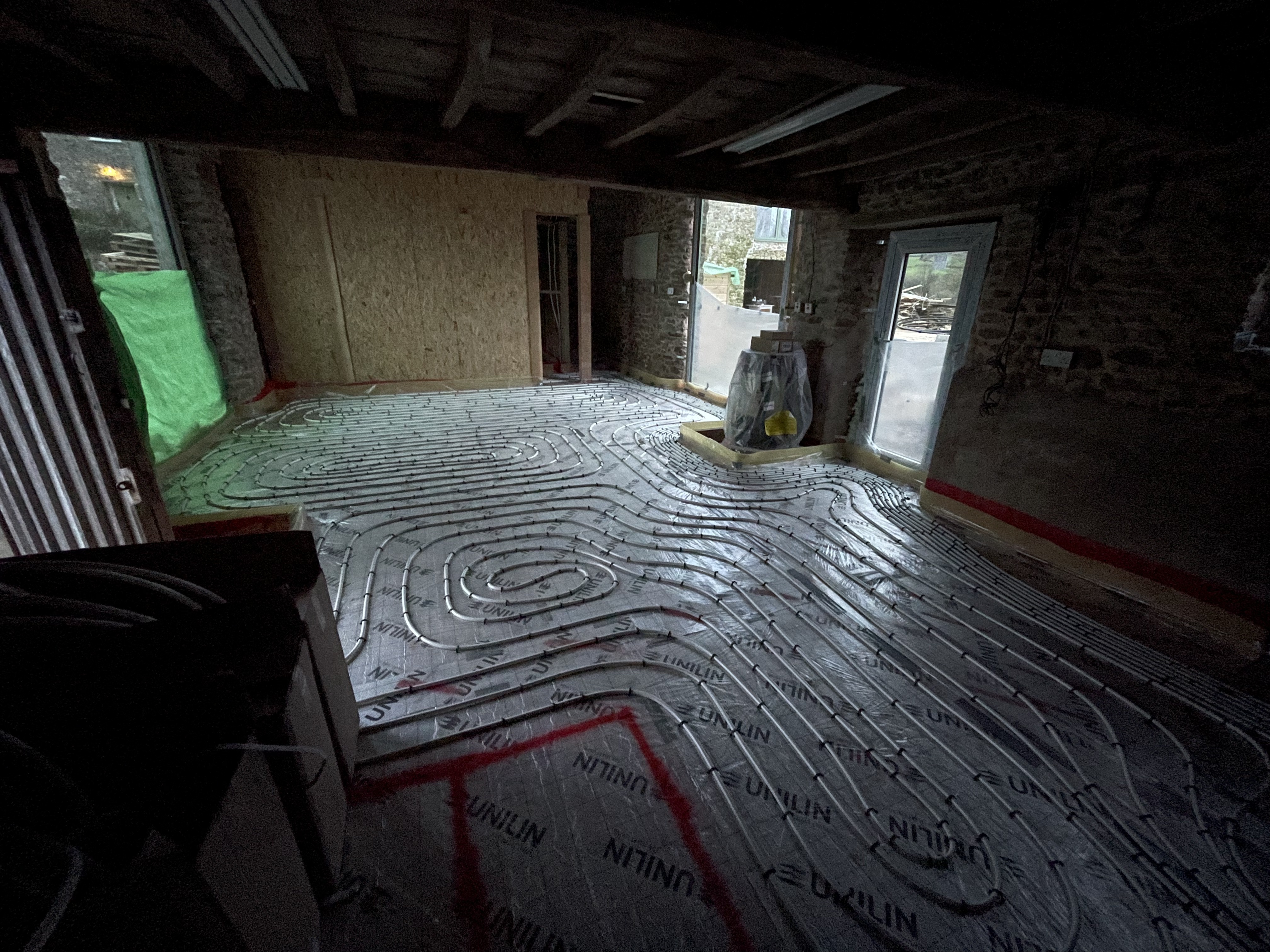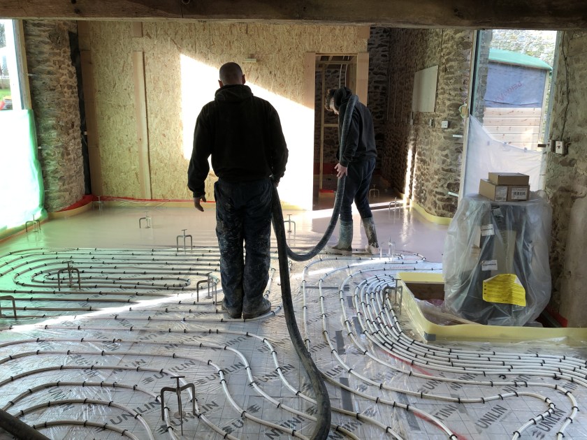 Our builders are making good progress against our Ofgem deadline for installing and commissioning the air source heat pumps – this week saw them lay the underfloor heating in the three-bed and then pump the screed on top. They’ve only done the ground floor for now – we’ll also have underfloor heating in the two first floor bedrooms but that can be added at a later stage and isn’t required to commission the system.