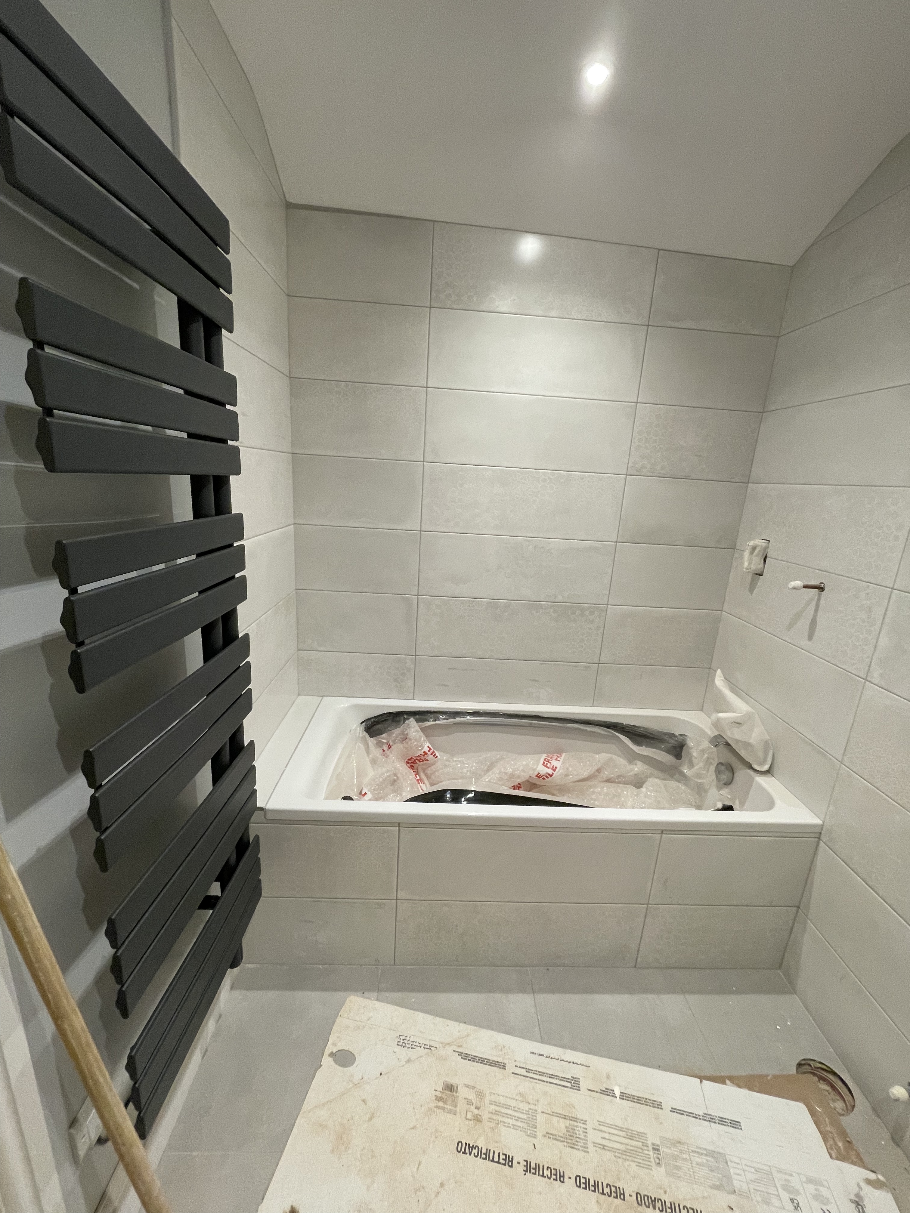 The bathroom’s gradually progressing too – the towel rail was added a week ago and the bath has now been tiled. It’s quite a small room without a window and we were worried it would feel dark and squashed, but the tiles are reflecting the spotlights nicely. It also makes you realise just how much of a slope the house is on, with the tiles sloping against the ceiling.
