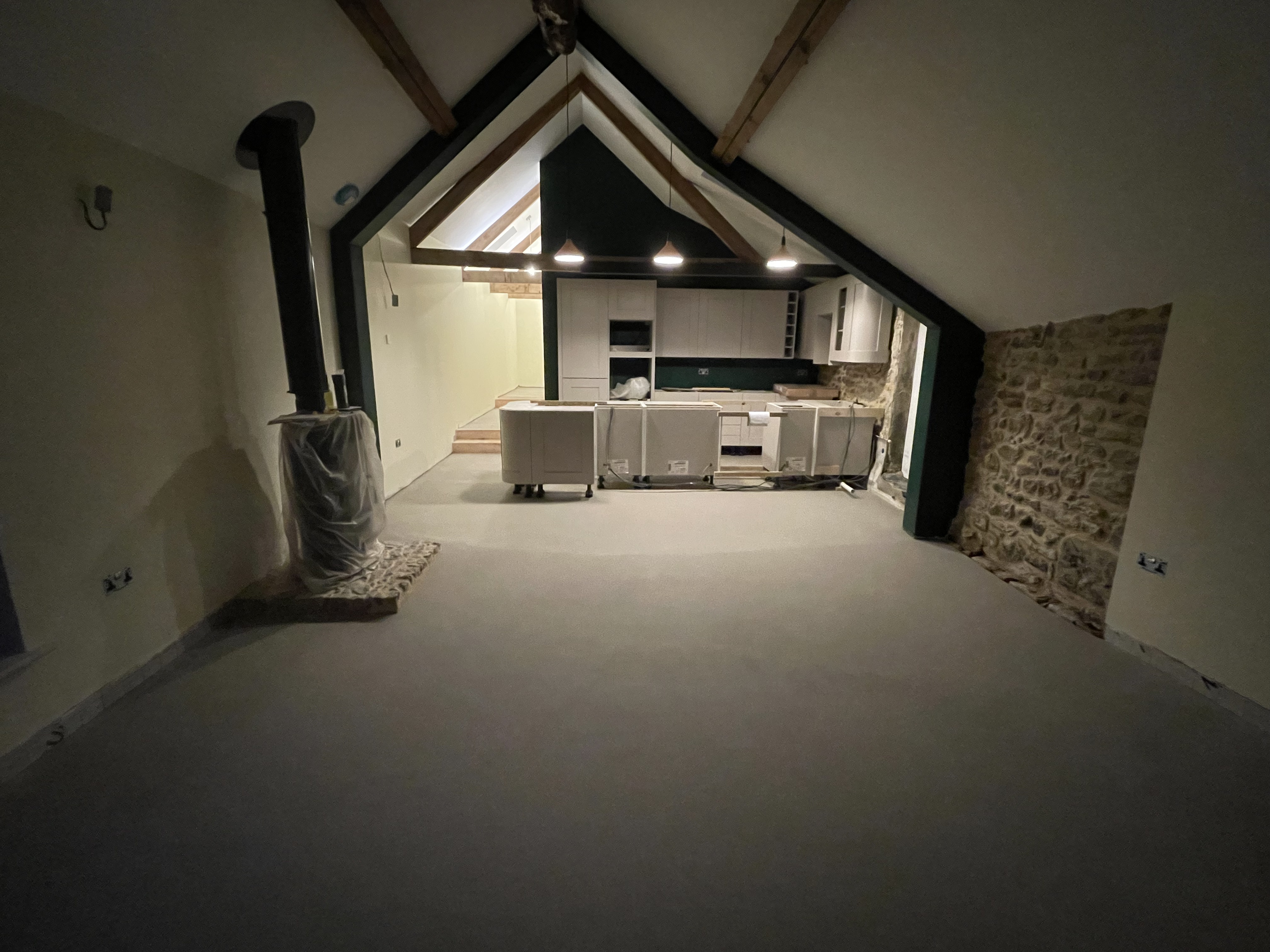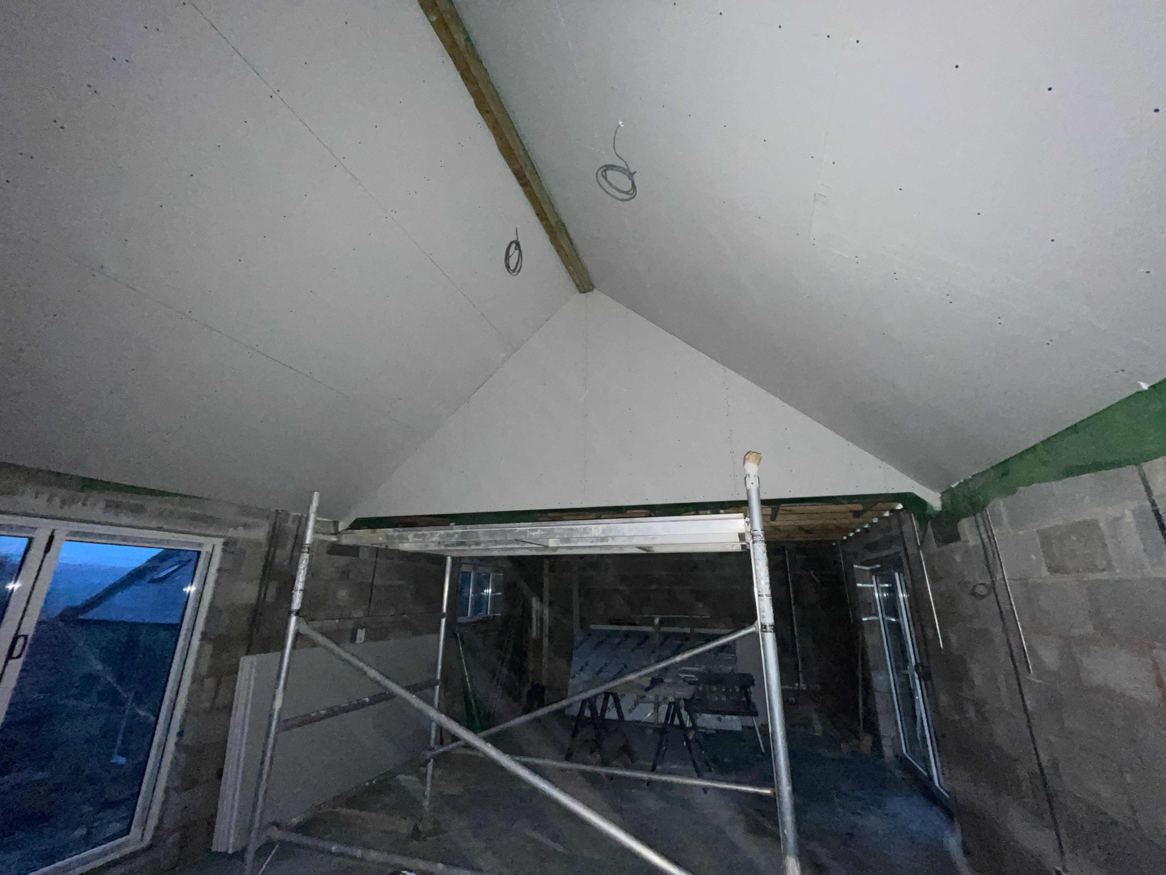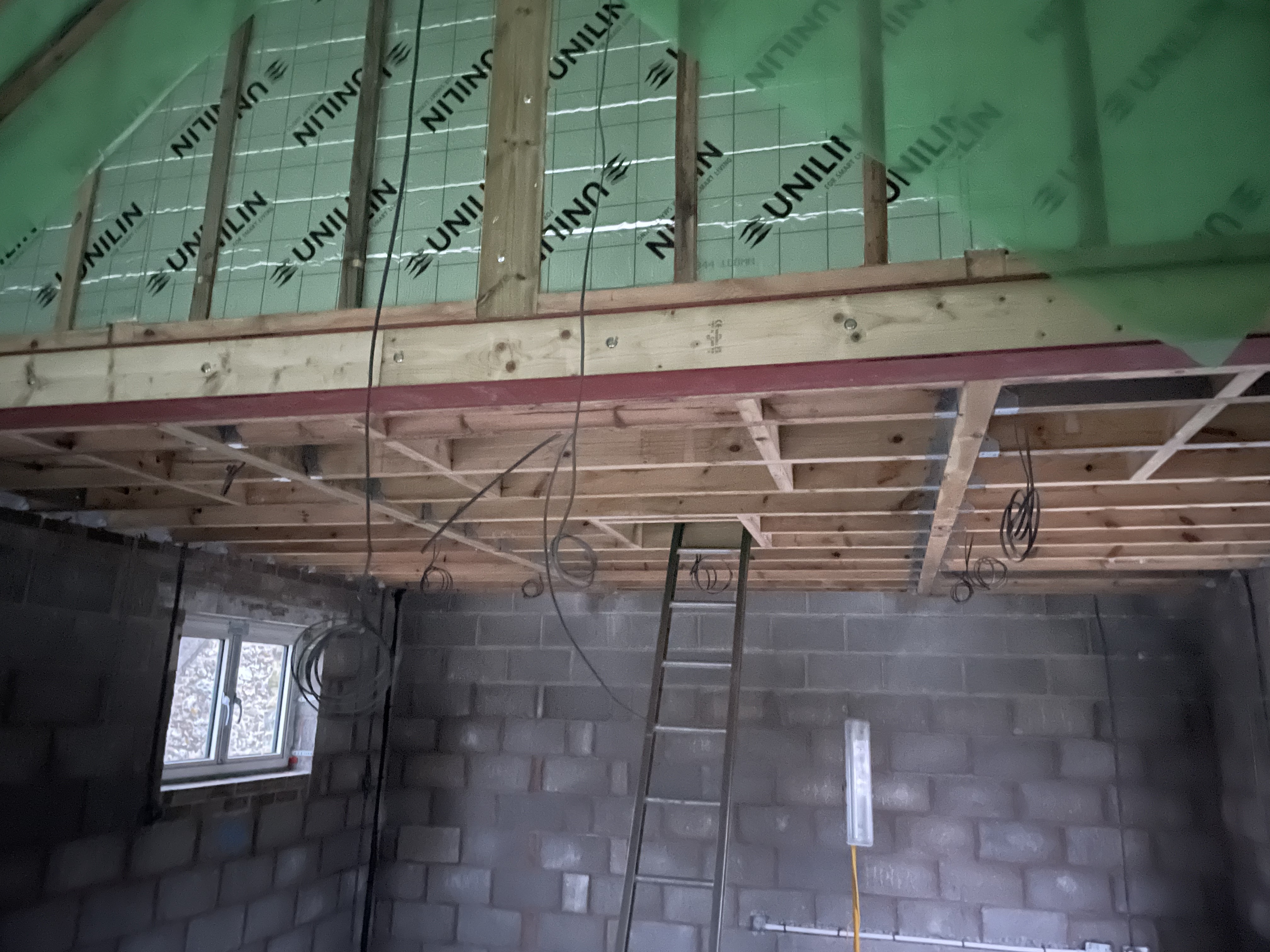 They’ve been hard at work in the first floor communal building too. We’ve been designing the internal layout for the whole building over the last few weeks, trying to make sure there’s enough space in the laundry and garage for everything we need (including storage space as this will be where we store everything needed for the cottages), and then thinking about the different ways guests might want to use the top floor and building in all the electrical needs now. John met with our builder and electrician to talk through our plans, and since then, the first fix electrics have already gone in and they’ve started plasterboarding the top floor.