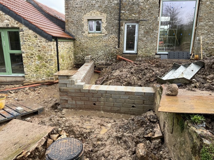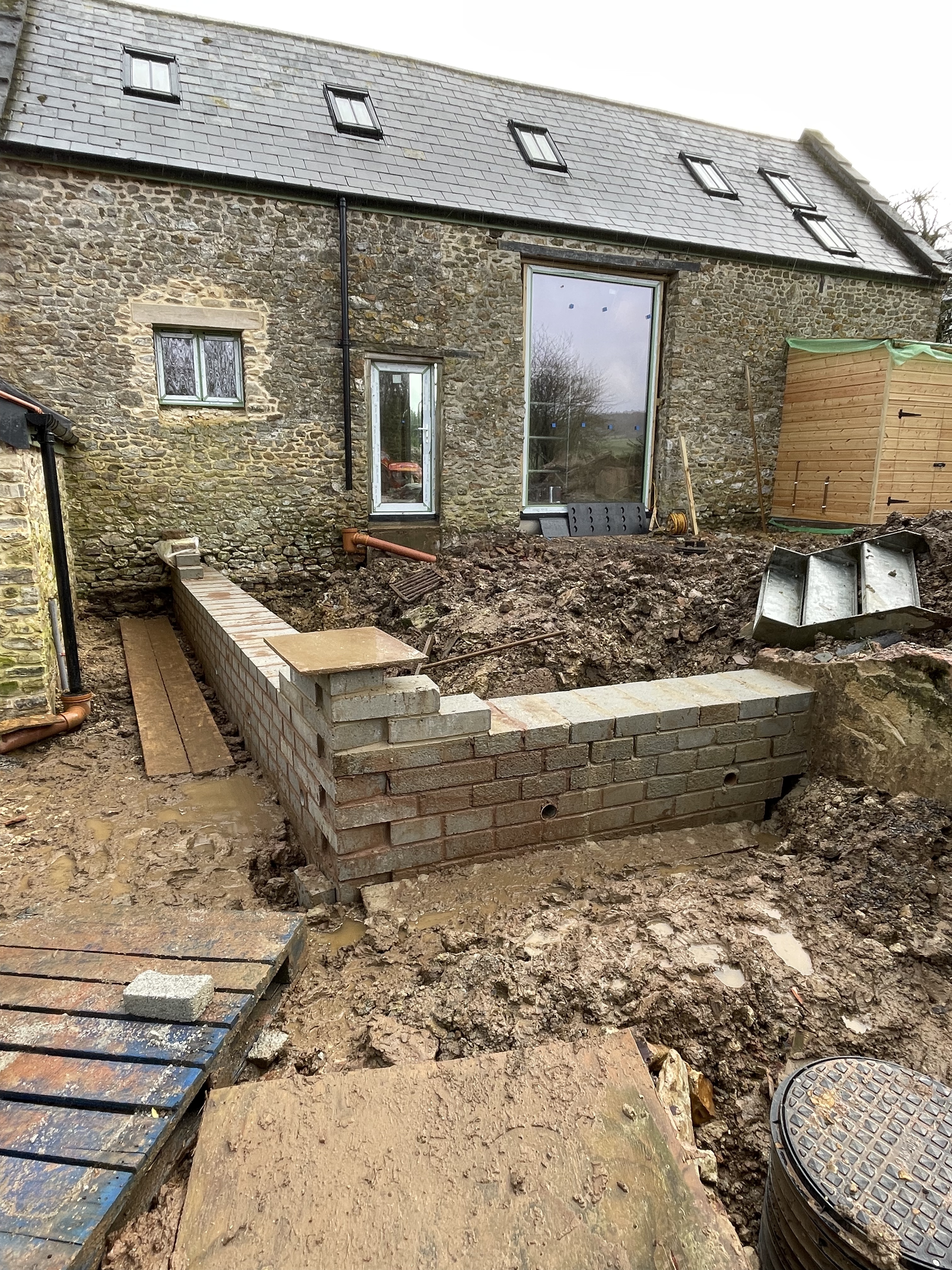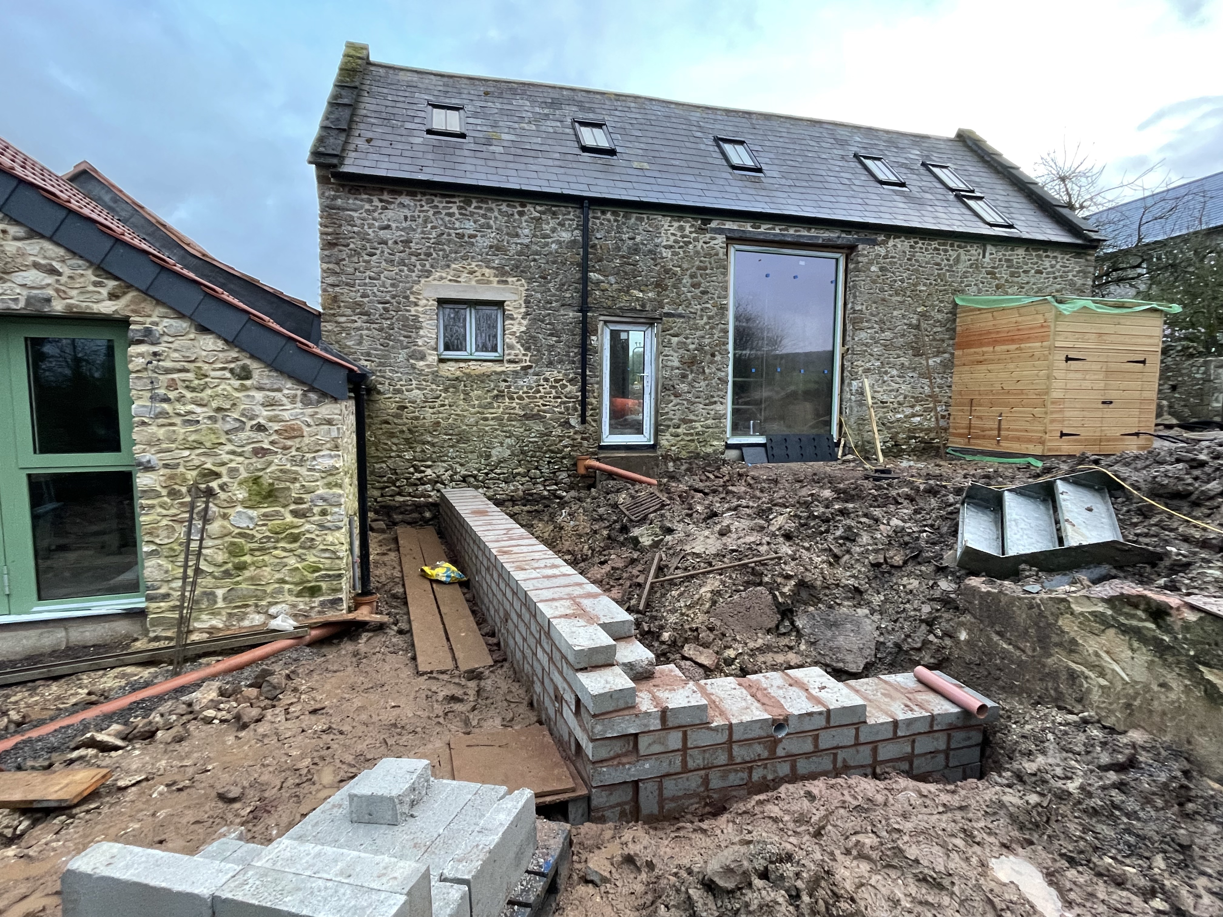 Our builders have been busy building up the retaining wall between our back garden and the garden for the three-bed barn. As we’re located on a hill, the ground outside our back door is lower than behind the barn which means the two gardens will be at different heights; in addition to this, there’s a further step up into the barn, and so we’re having to raise the level of their garden to create a flat route into the building. All new builds now need to have step-free access as a building regulation – we didn’t realise this when the building was being designed initially, and we’ve kept the existing floor level inside which means the front door opens and steps up where the previous owner laid a damp course and concreted the floor. So we’re using the back door entrance as the one with step-free access. Had we realised this sooner, we’d have considered taking up the floor inside as the step is pretty inconvenient and there’s not much headroom in the kitchen area. Even raising the ground outside, it’s still likely we’ll need a small ramp to get into the back door, although this will be much smaller than if we’d left it at the original level.