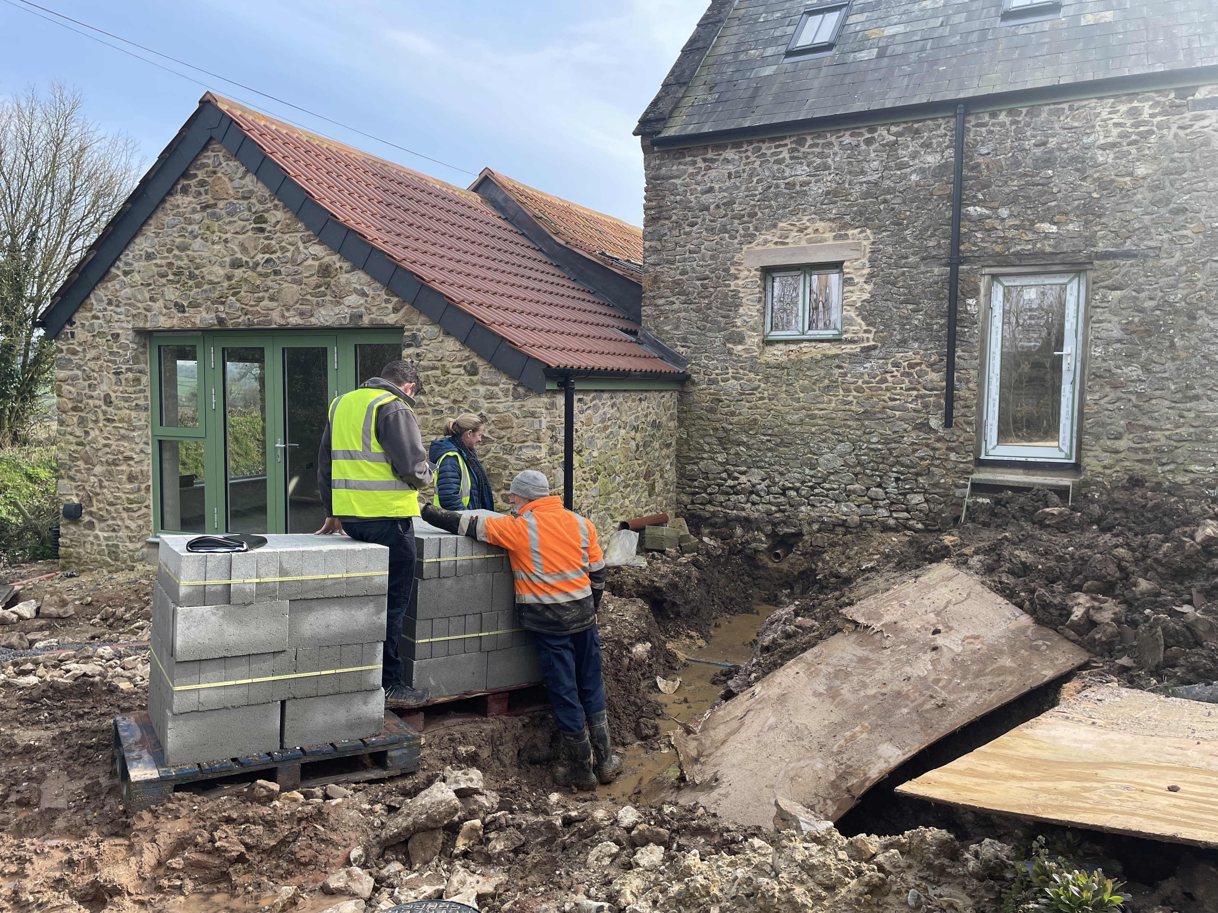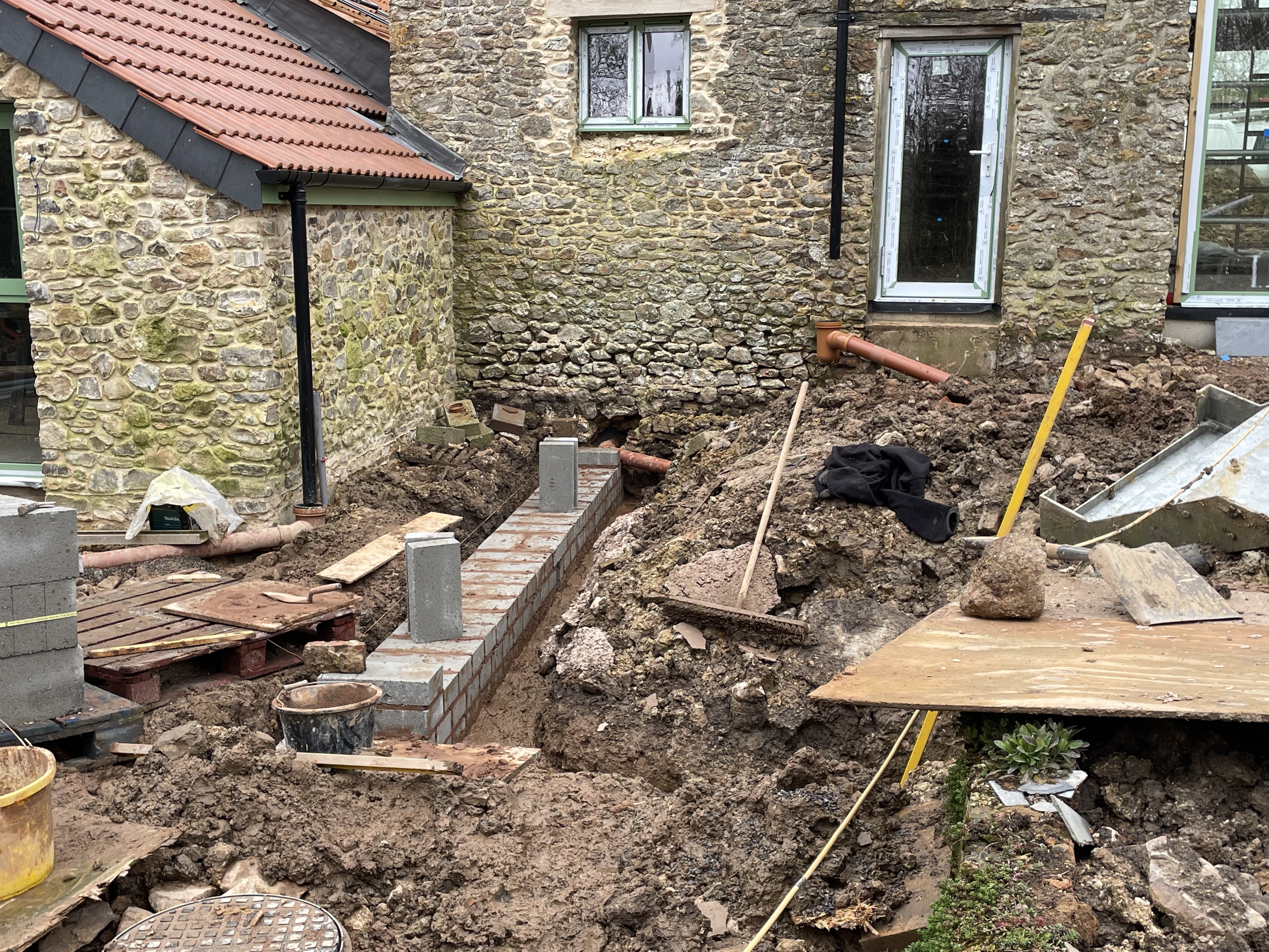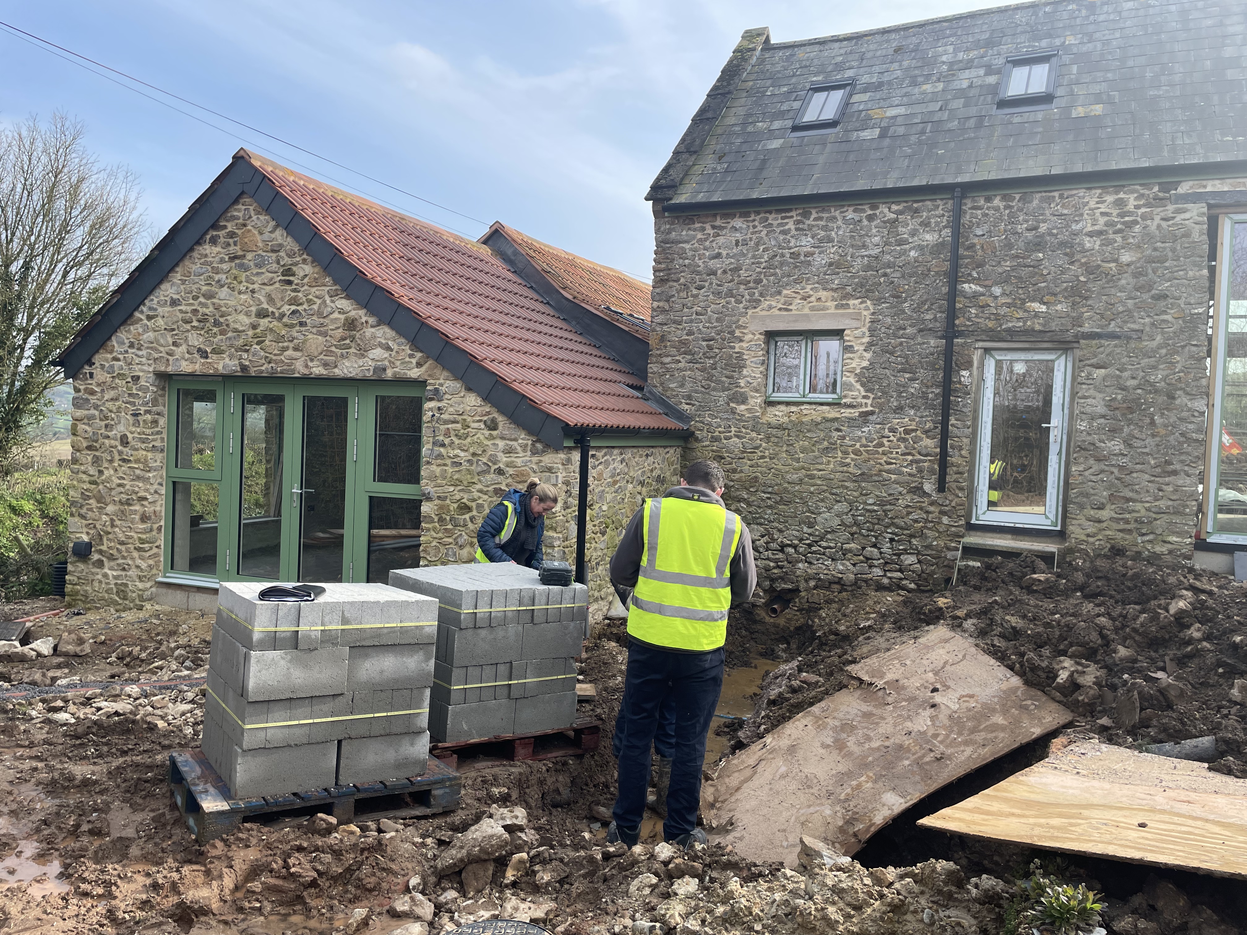 Our builders have been busy building up the retaining wall between our back garden and the garden for the three-bed barn. As we’re located on a hill, the ground outside our back door is lower than behind the barn which means the two gardens will be at different heights; in addition to this, there’s a further step up into the barn, and so we’re having to raise the level of their garden to create a flat route into the building. All new builds now need to have step-free access as a building regulation – we didn’t realise this when the building was being designed initially, and we’ve kept the existing floor level inside which means the front door opens and steps up where the previous owner laid a damp course and concreted the floor. So we’re using the back door entrance as the one with step-free access. Had we realised this sooner, we’d have considered taking up the floor inside as the step is pretty inconvenient and there’s not much headroom in the kitchen area. Even raising the ground outside, it’s still likely we’ll need a small ramp to get into the back door, although this will be much smaller than if we’d left it at the original level.