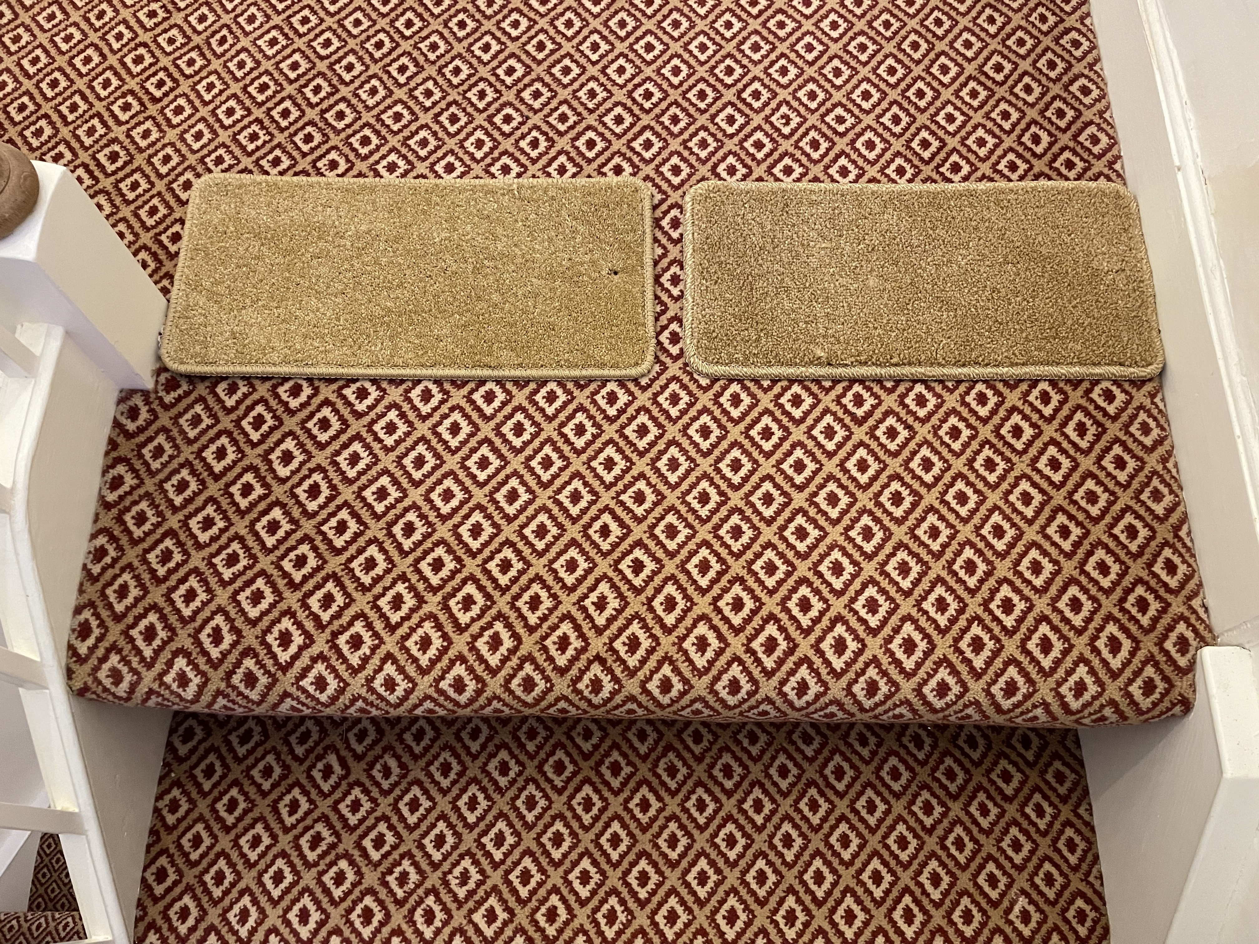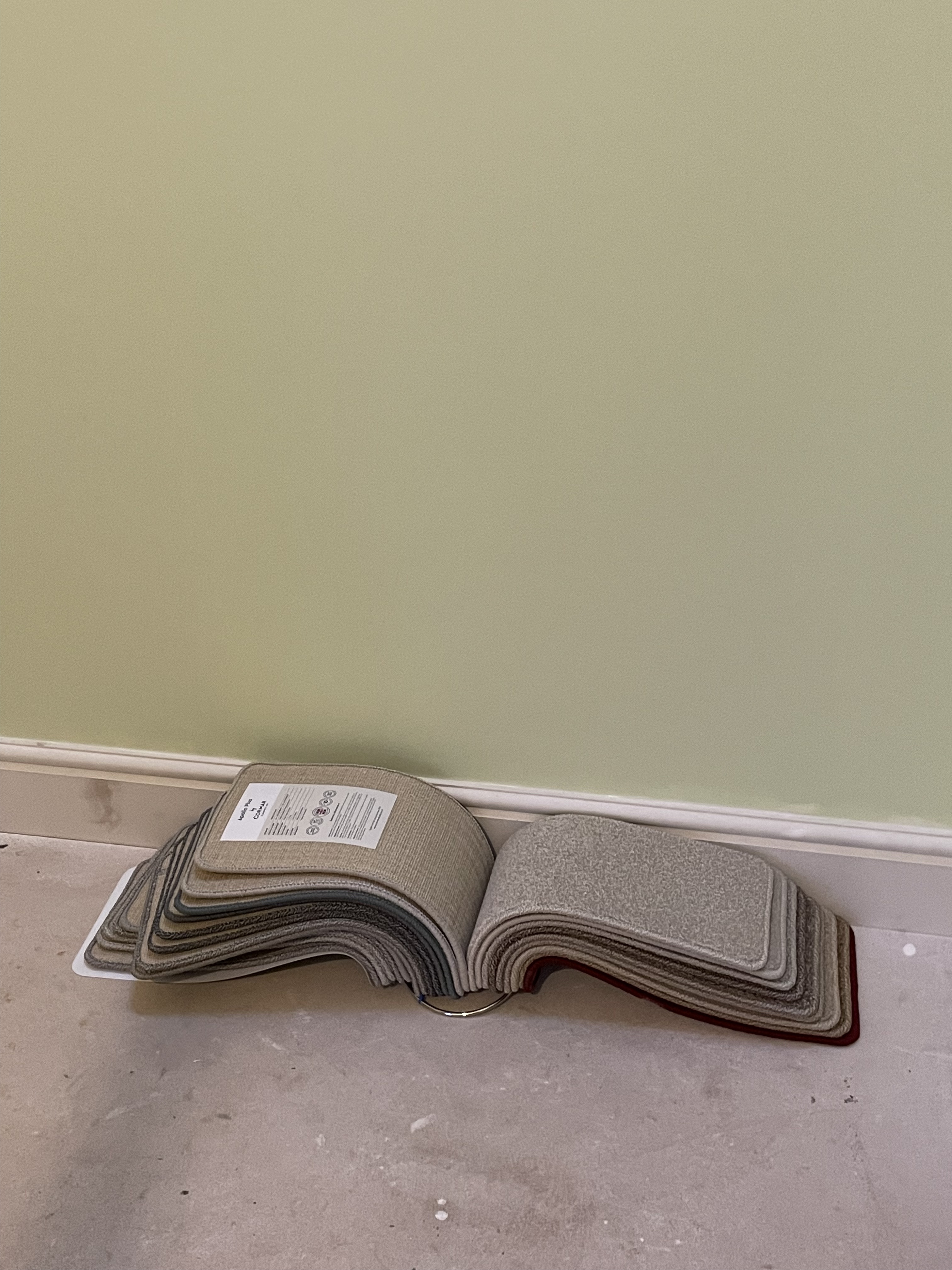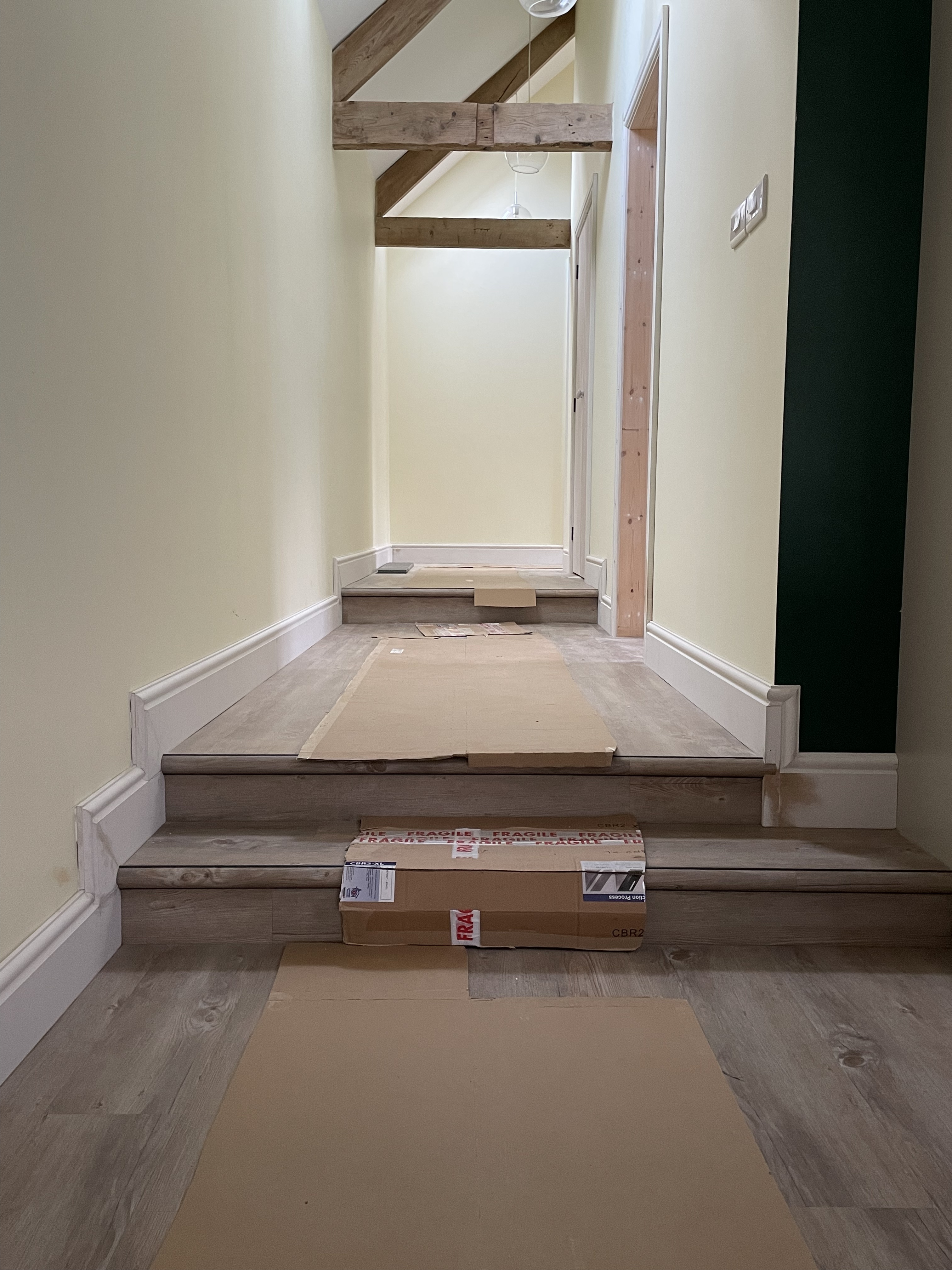 Work is progressing in our new house – we started painting our bedroom, although as the light fittings aren’t in yet (they finally arrived this week) there’s not enough light to paint clean edges in the evenings and we’re limited to painting in the daytime only. Now that the karndean flooring is in, our carpenter has been adding the skirting and architraves throughout the hallways, and it’s looking so much neater. The plumbers have also been building out our ensuite now the vanity top is in, although a faulty shower holder annoyingly means pausing until it can be replaced. And we’ve chosen our carpets – both for the two bedrooms in our new house, and for the top floor landing in the farmhouse where we’ve extended the landing but didn’t have enough leftover stair carpet to cover this space. The bedrooms were fairly easy as we went for neutral colours, but the farmhouse landing was much harder as we’ve had to try and match one of the colours in the original stair carpet so it doesn’t look too out of place.