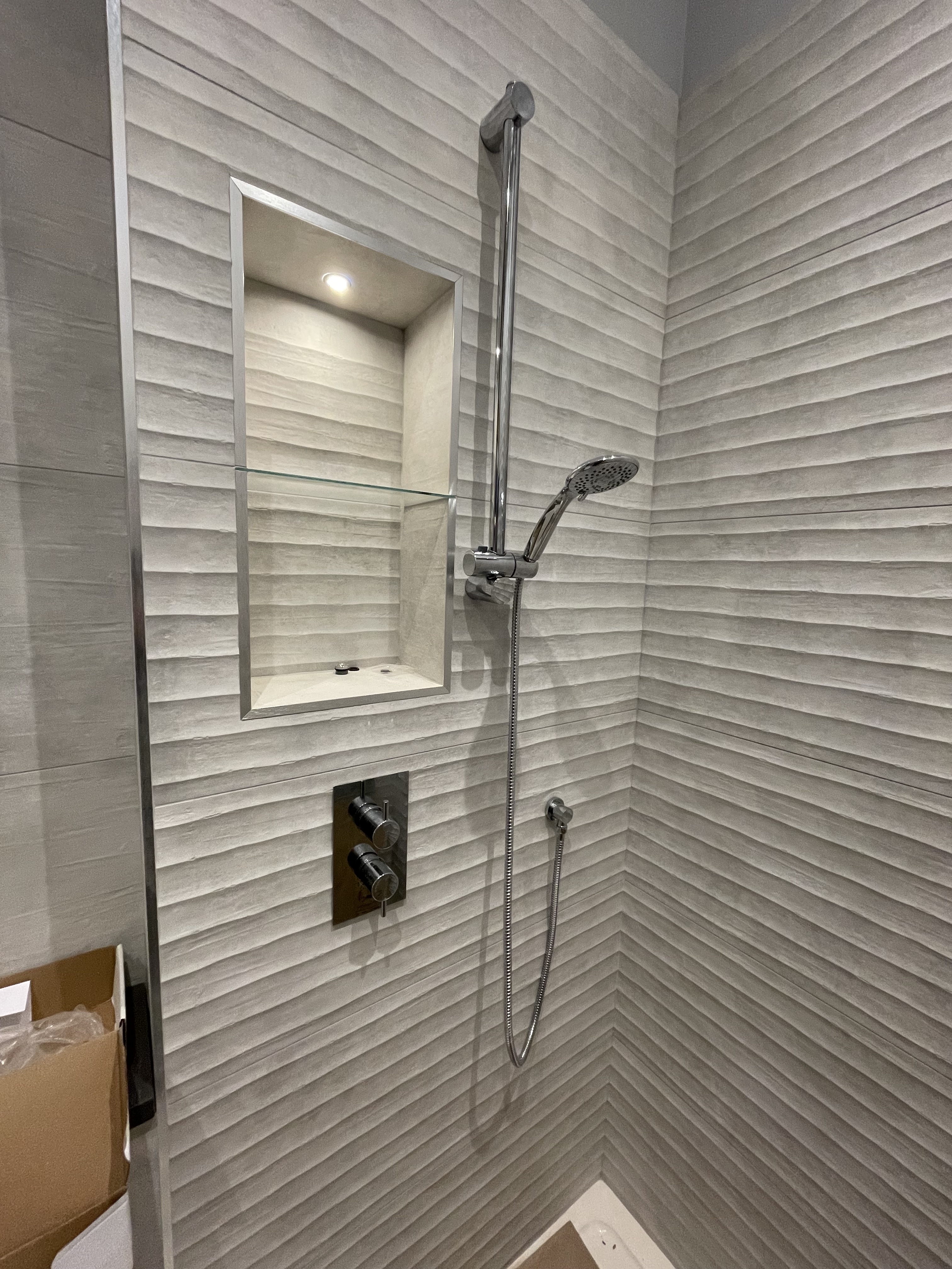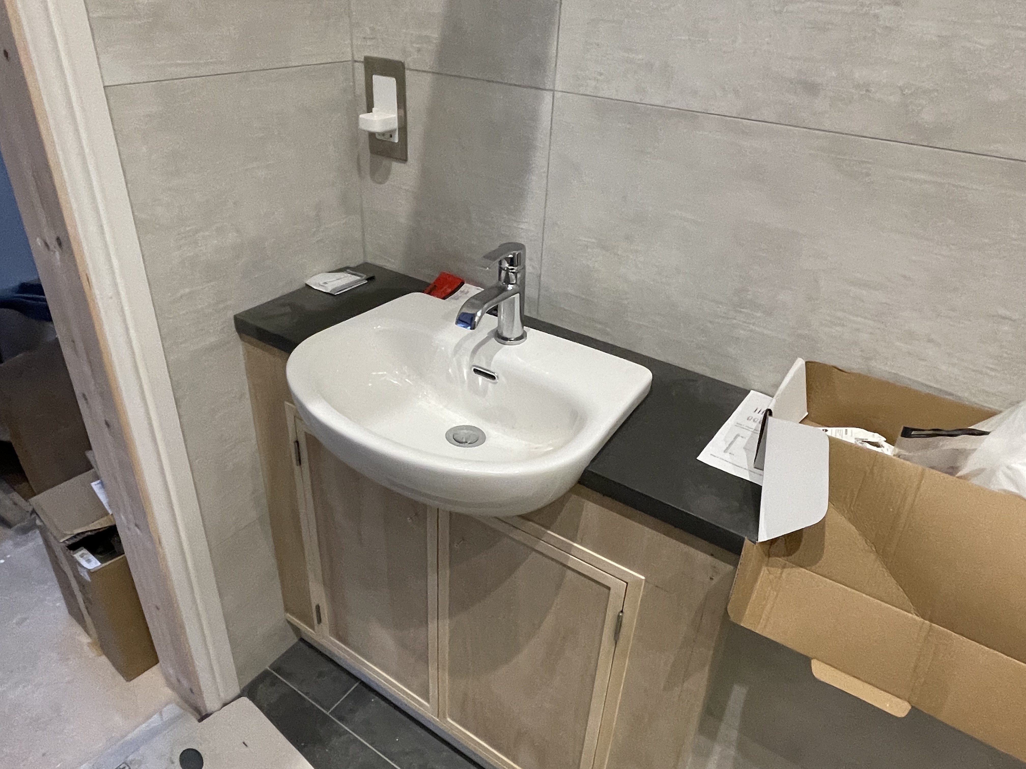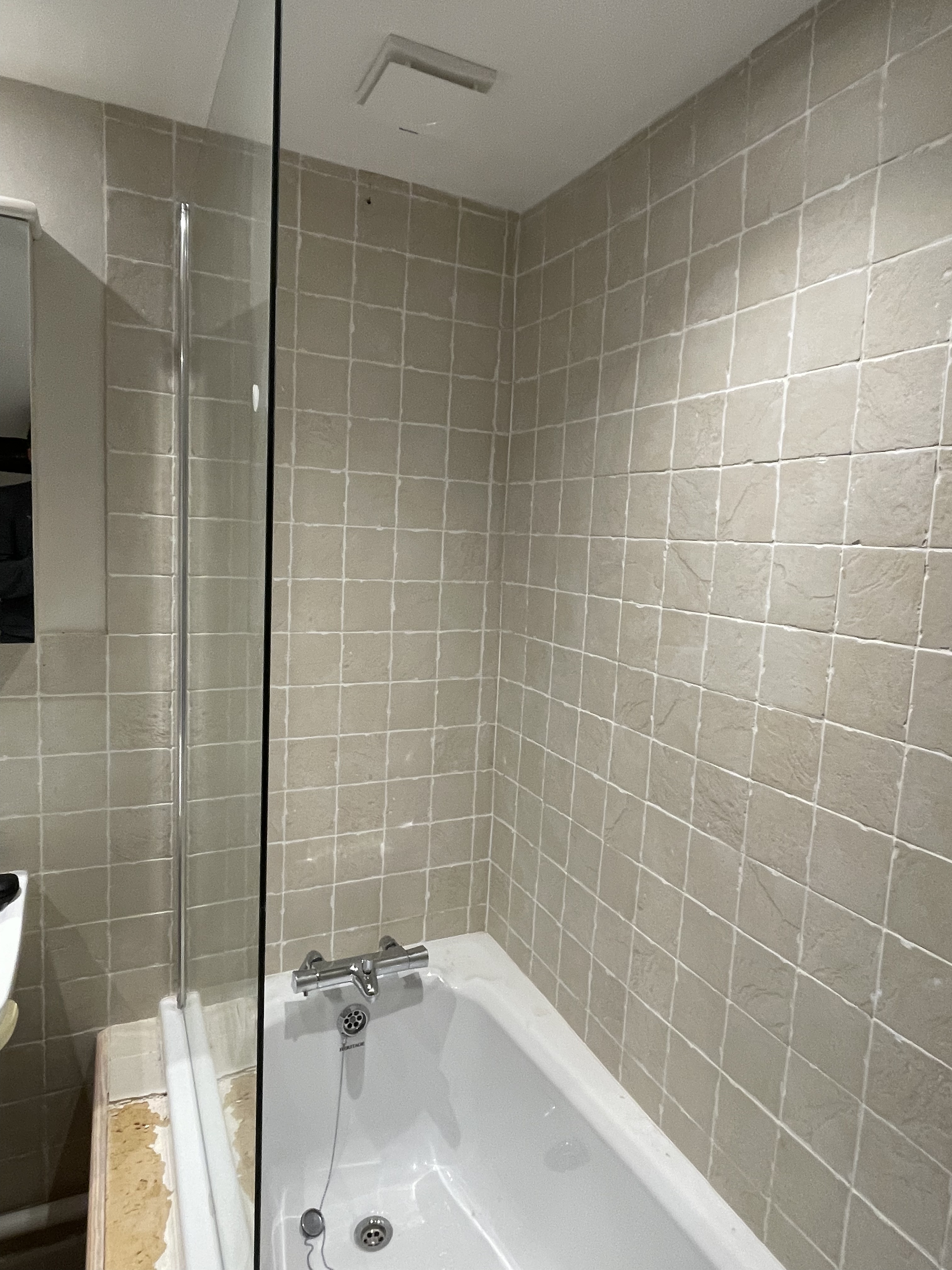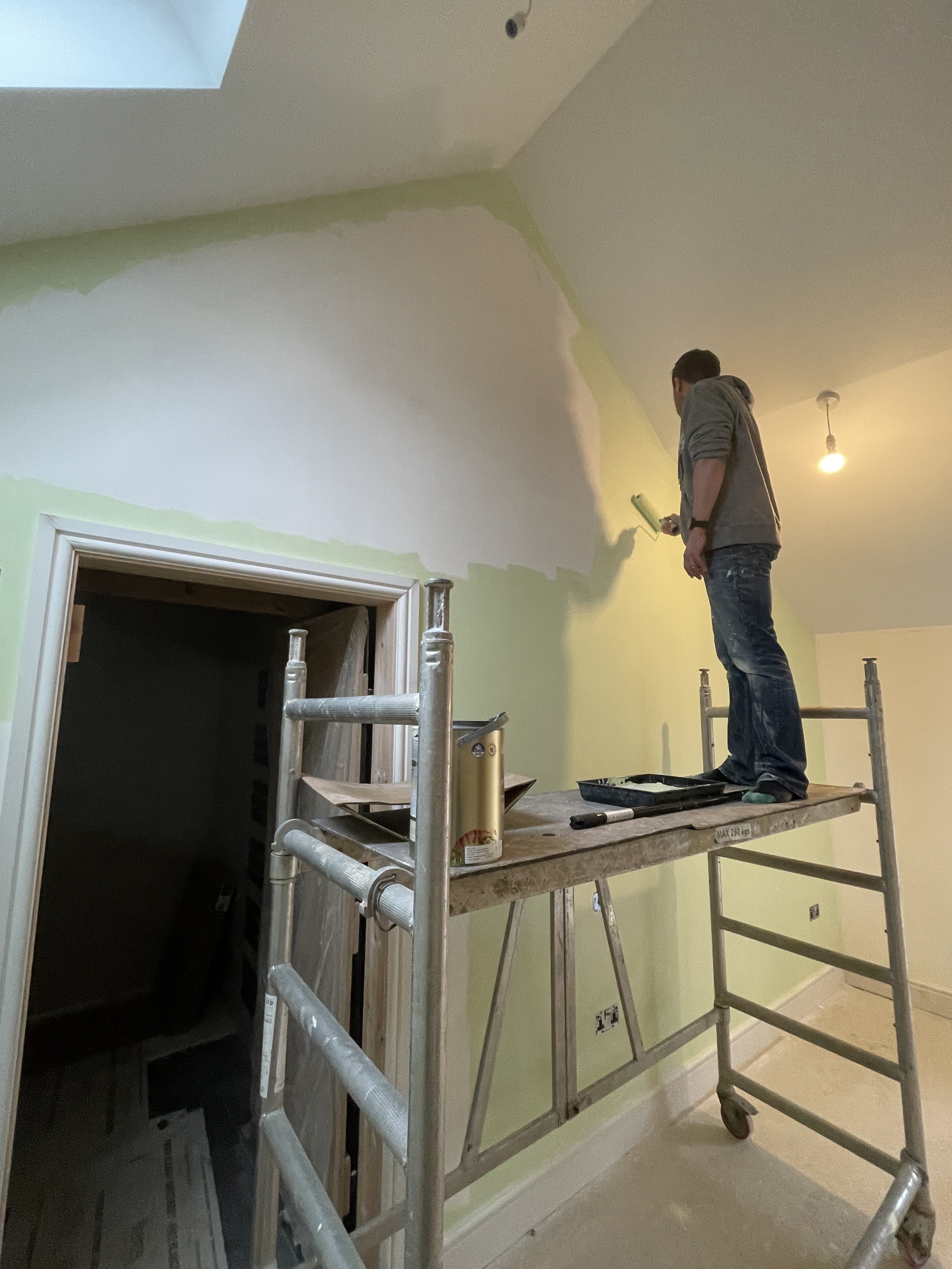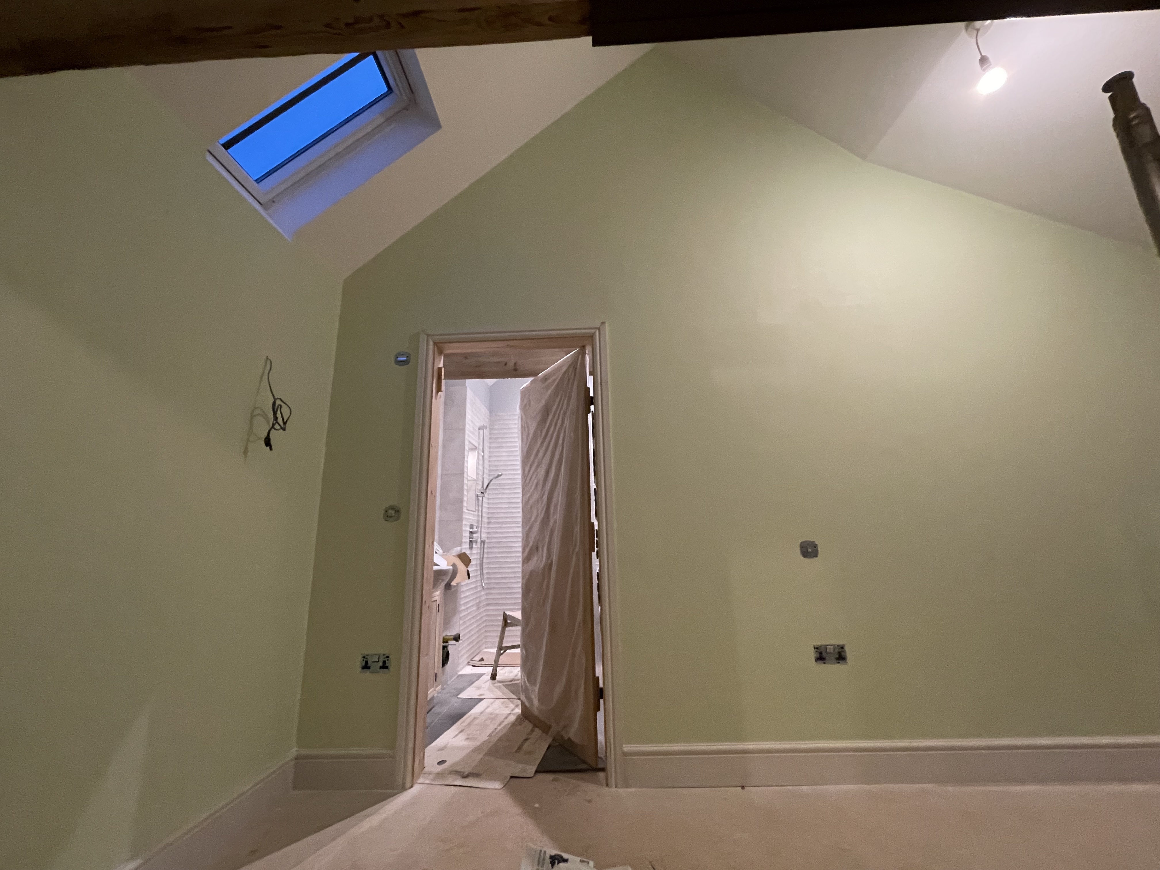 The plumbers were also back in the farmhouse to upgrade our bathroom shower from having single taps to a mixer tap and increase the shower head height to maximise the higher ceilings we gained from replacing the rotten roof. The previous shower was pretty feeble in terms of pressure and was so low that anyone taller than 5ft 10in had to bend down – we’ve gained an extra c.10cm which isn’t brilliant but is at least better; and the new taps along with the new Mixergy hot water cylinder should make the pressure stronger. The plumbers got partway through before running out of time, so hopefully we’ll get this finished and ticked off next week. John’s painted the top of the walls where the new plaster was added, although we’ll likely need to redo parts of it as the paint smells like it’s gone off :(
