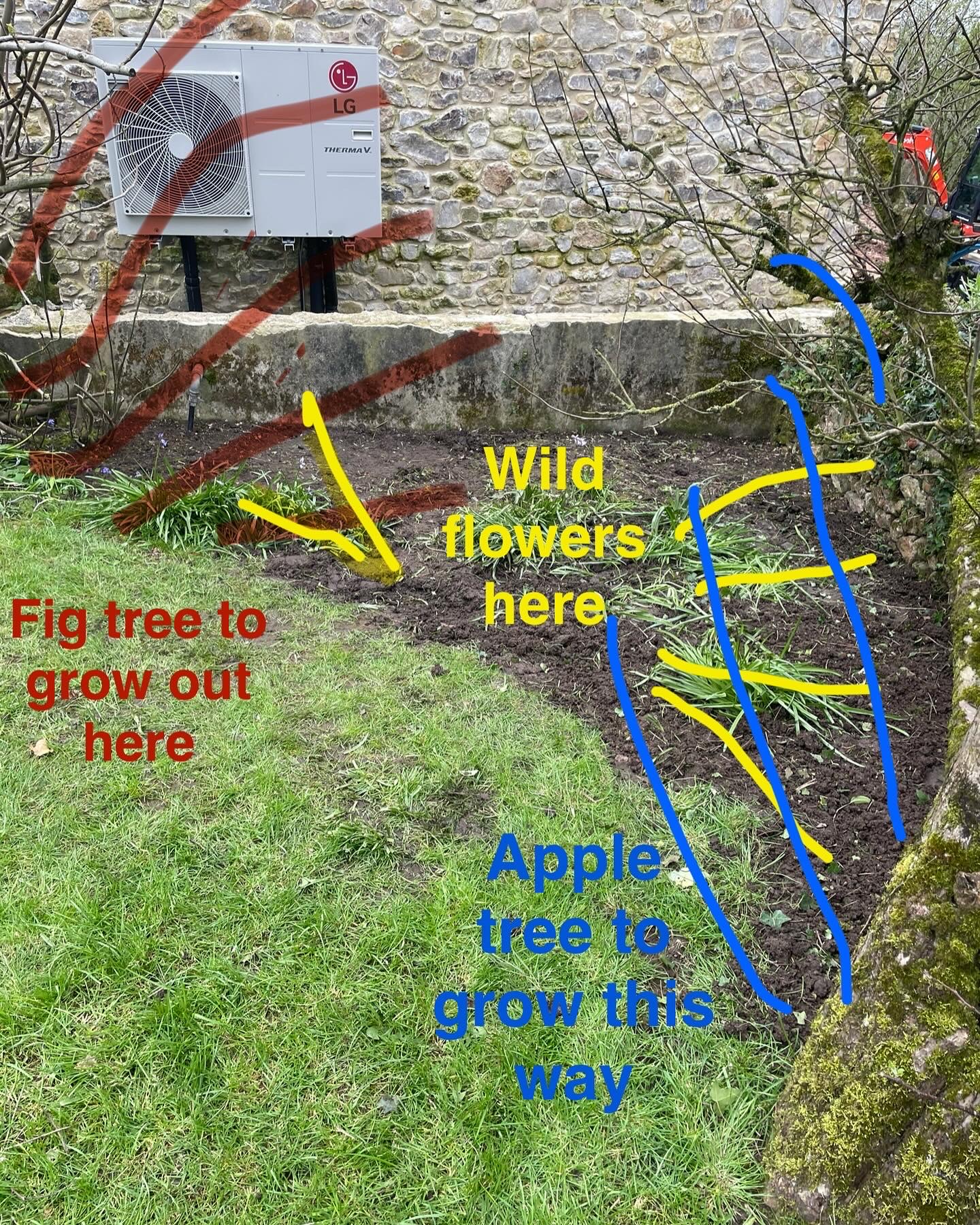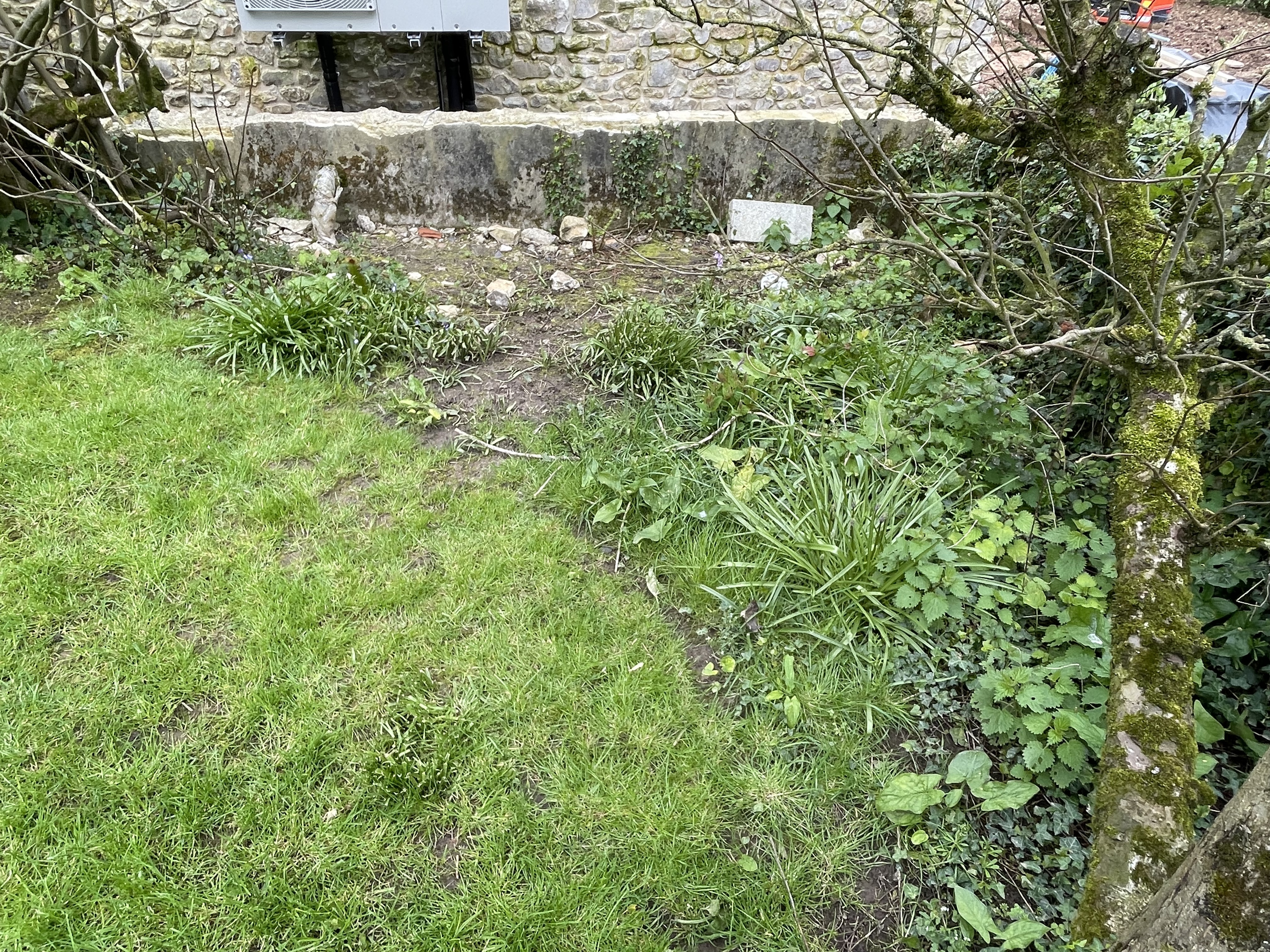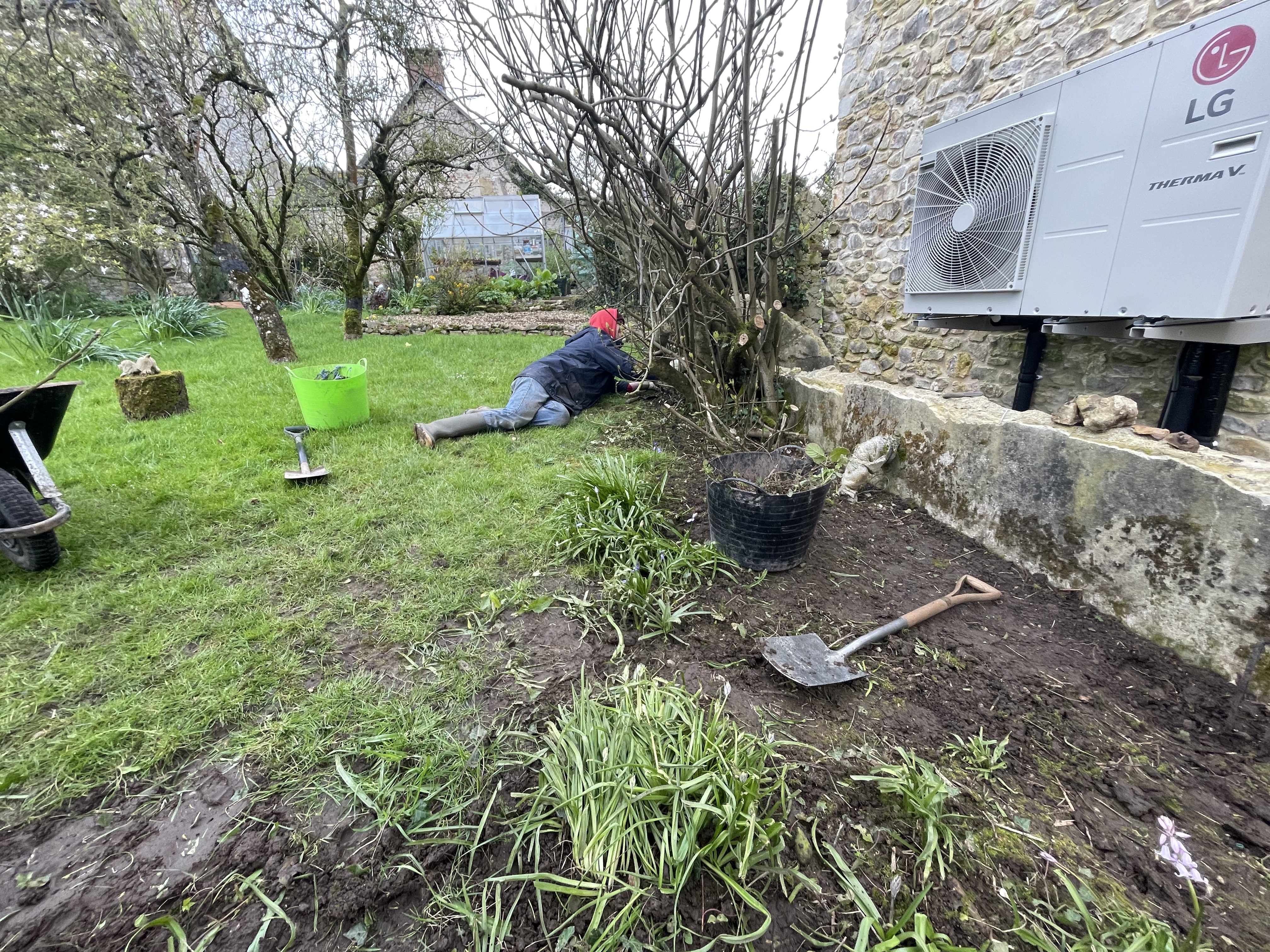 Our other job was to start prepping the area in front of the air source heat pump in the front garden. Our listed building planning permission condition requires us to hide the heat pump from view, and rather than have something fake we’re going to train the fig and apple trees either side of it across the front, and fill the gap with wild flowers. It’s been full of weeds since we moved in, with added rubble from building the new barn, so it was a bit of a mess to clear. It’ll look so much better when we’ve finished though.