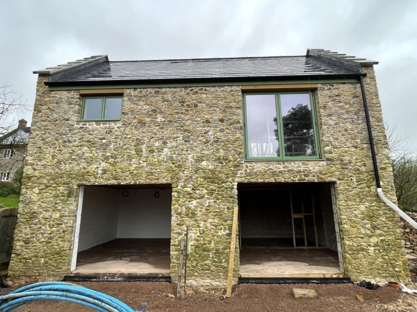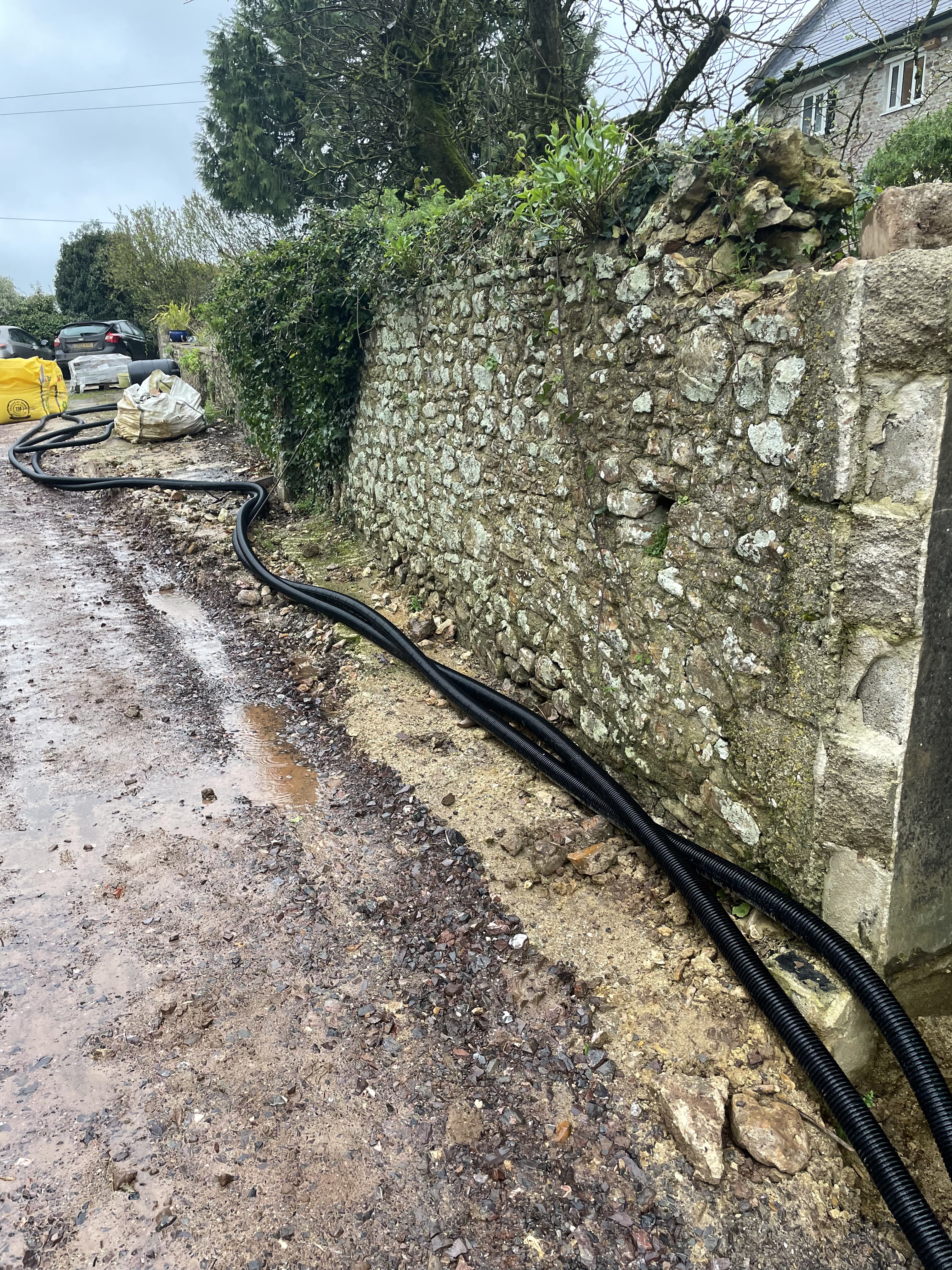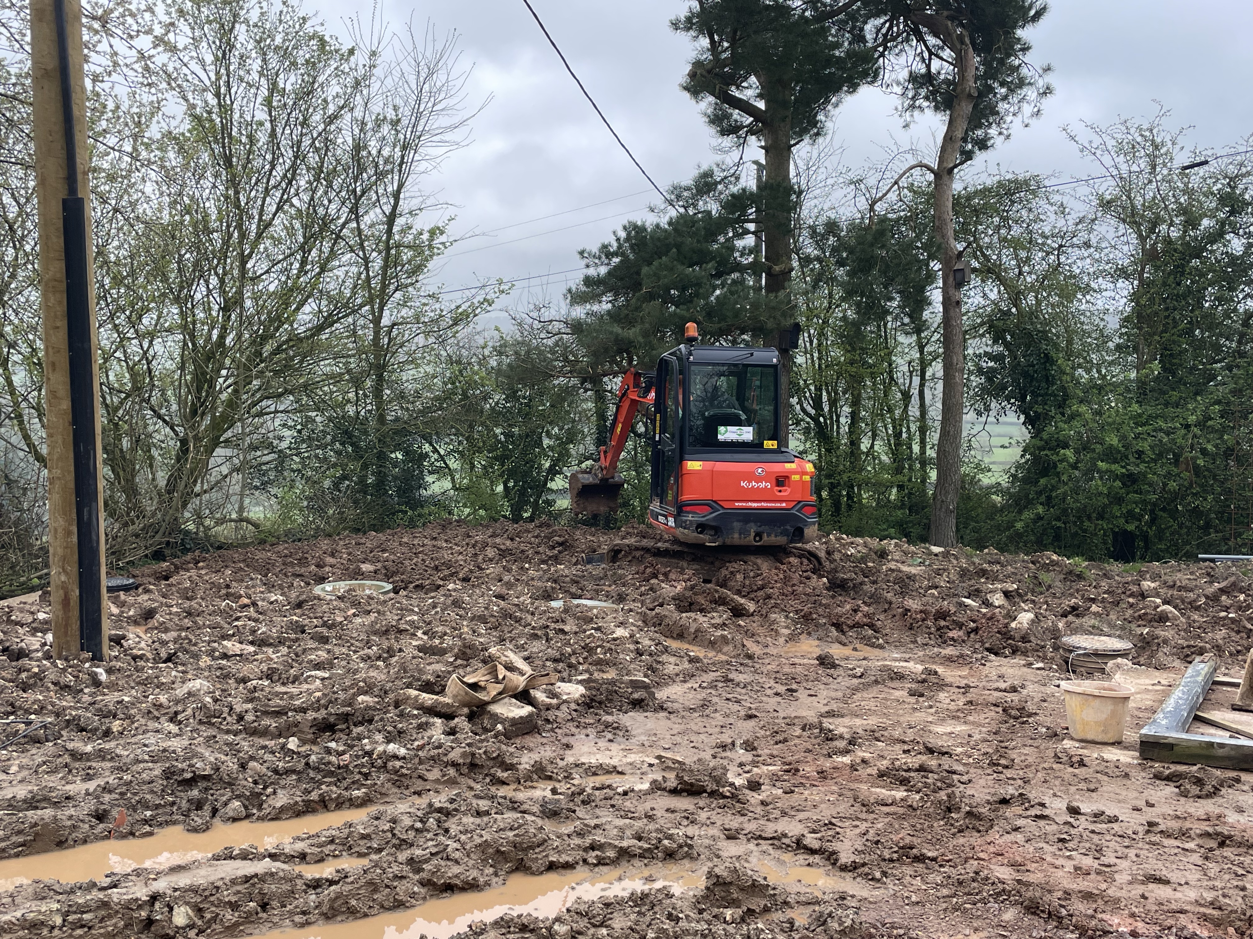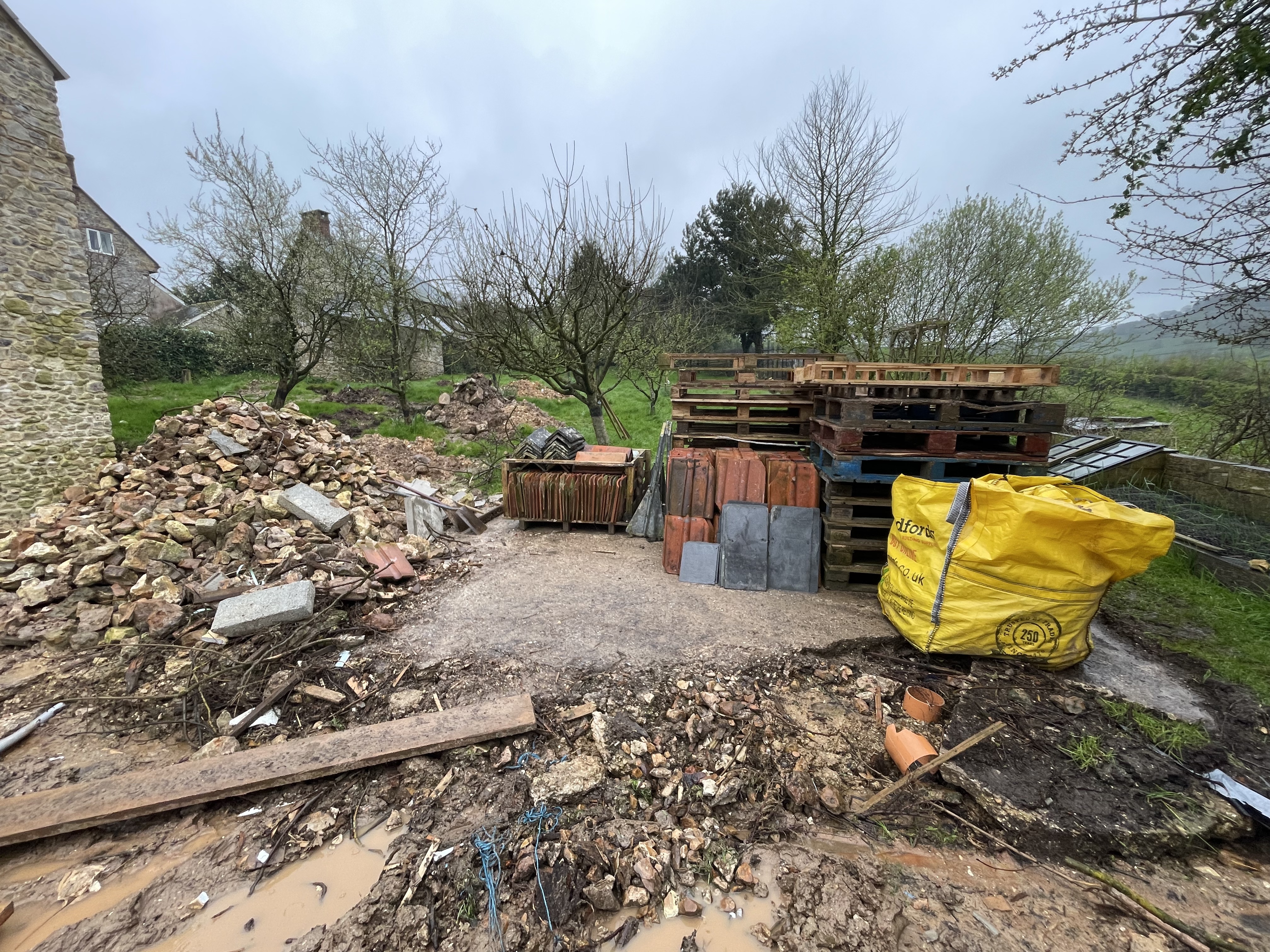 Our builders have spent a good couple of days clearing the courtyard and site of all the materials that had stacked up over the last year – mainly items we’d hoped to be able to reuse for certain ‘projects’ and just hadn’t had time to start. They’ve also concreted in the cabling for the sewage treatment pump that they installed last week. One of the next jobs is to dig in the electrical cables for the Electric Vehicle car chargers which will go against the garden wall. Our site manager has also been flattening our new back garden a bit, although I suspect it’s still too wet to do anything too meaningful. Surely this rain can’t continue!