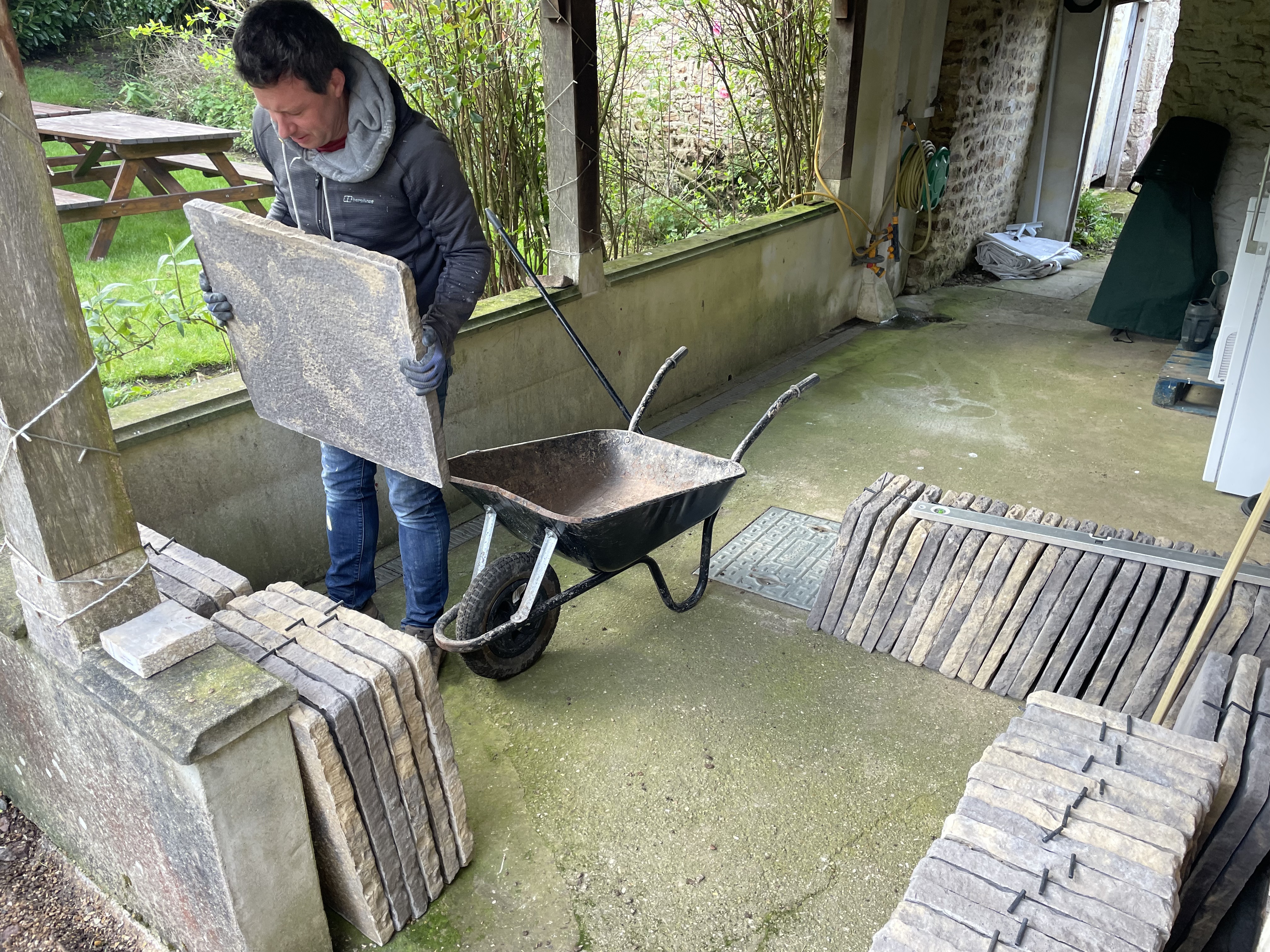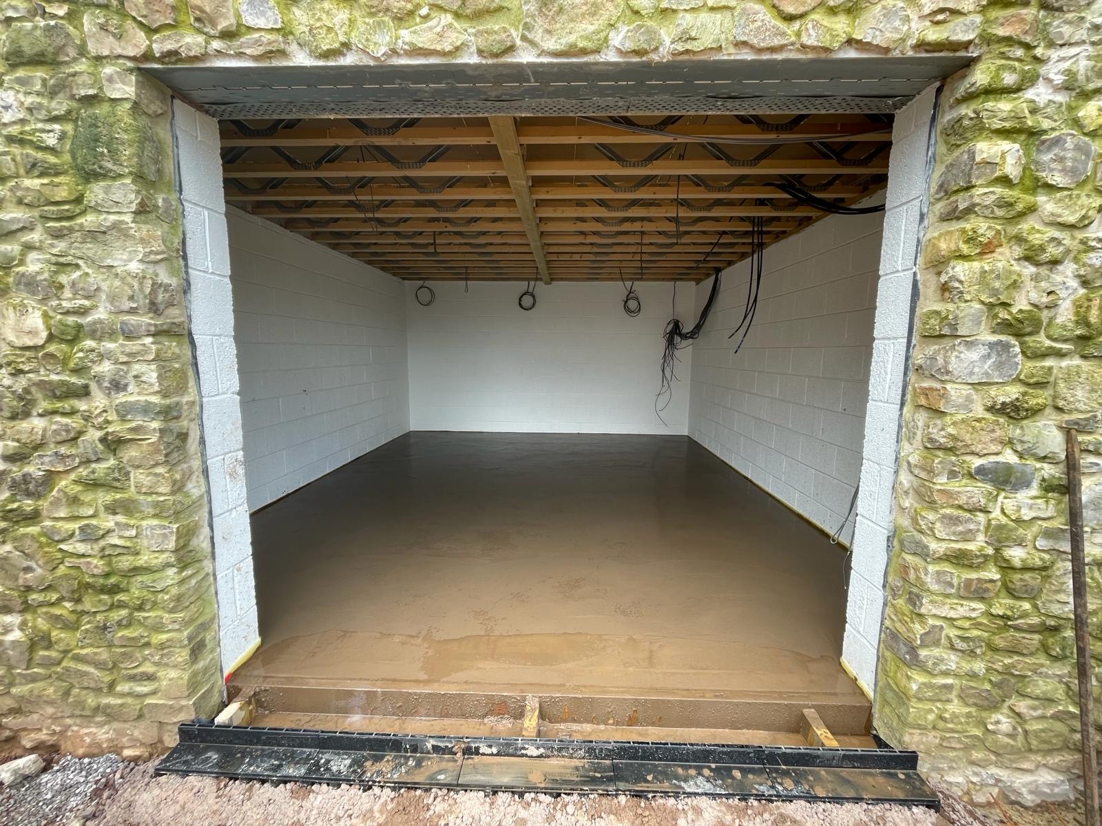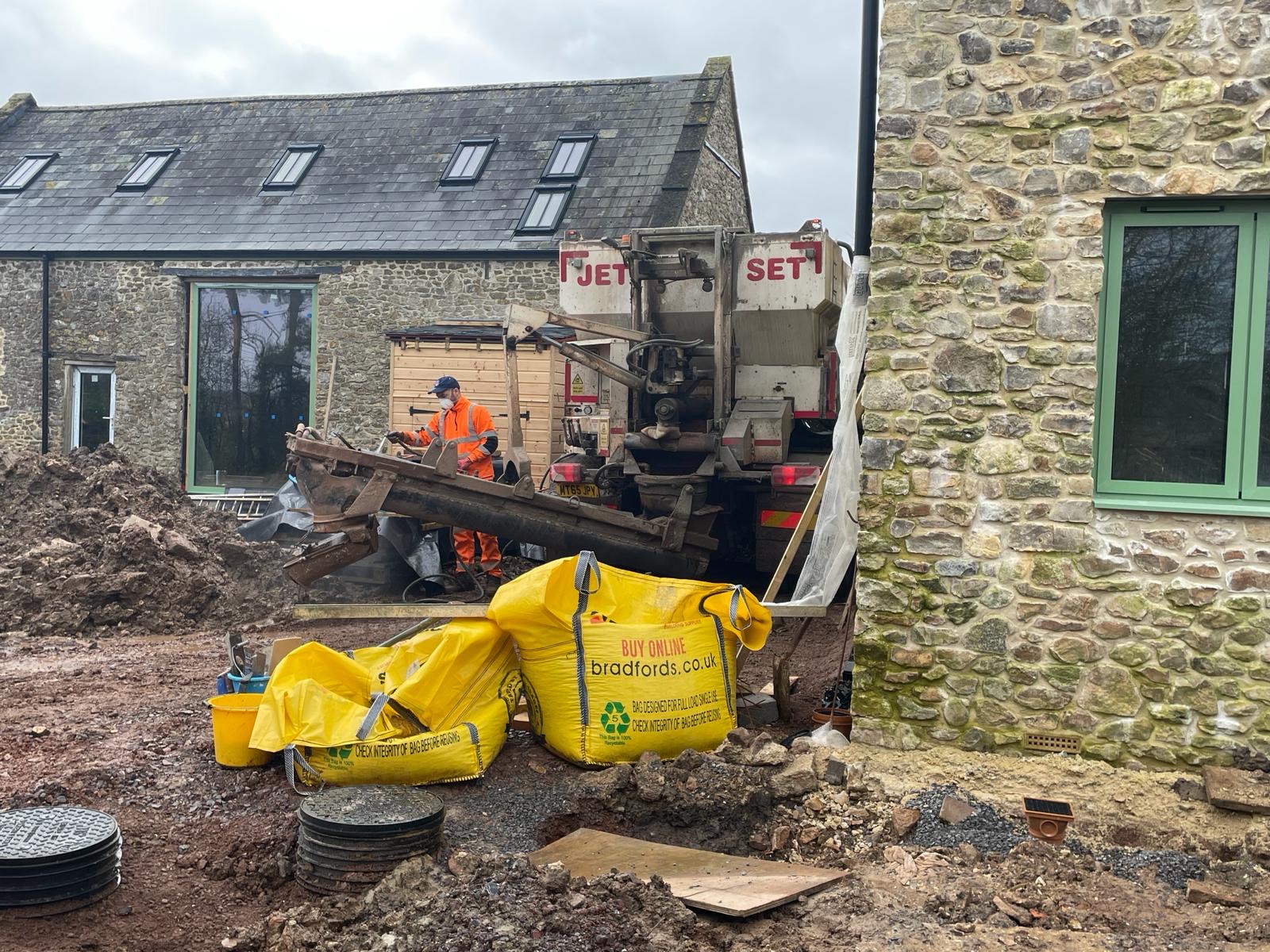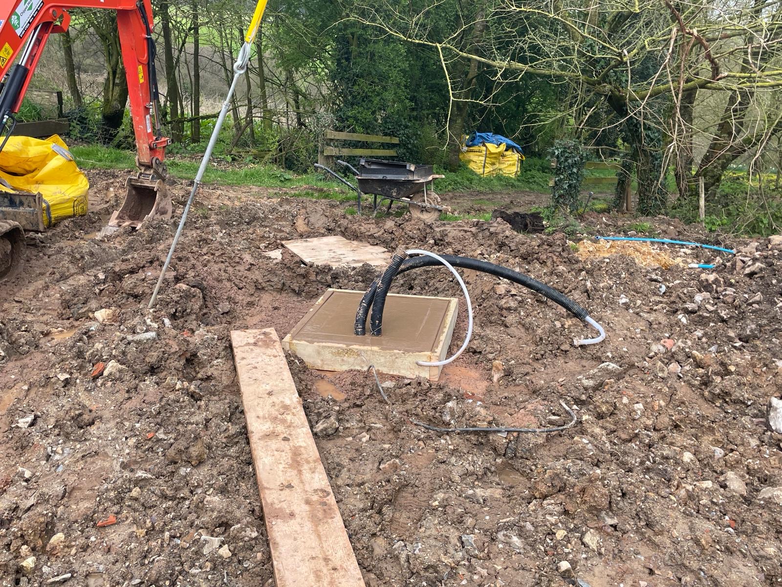 Our builders have spent a good couple of days clearing the courtyard and site of all the materials that had stacked up over the last year – mainly items we’d hoped to be able to reuse for certain ‘projects’ and just hadn’t had time to start. They’ve also concreted in the cabling for the sewage treatment pump that they installed last week. One of the next jobs is to dig in the electrical cables for the Electric Vehicle car chargers which will go against the garden wall. Our site manager has also been flattening our new back garden a bit, although I suspect it’s still too wet to do anything too meaningful. Surely this rain can’t continue!