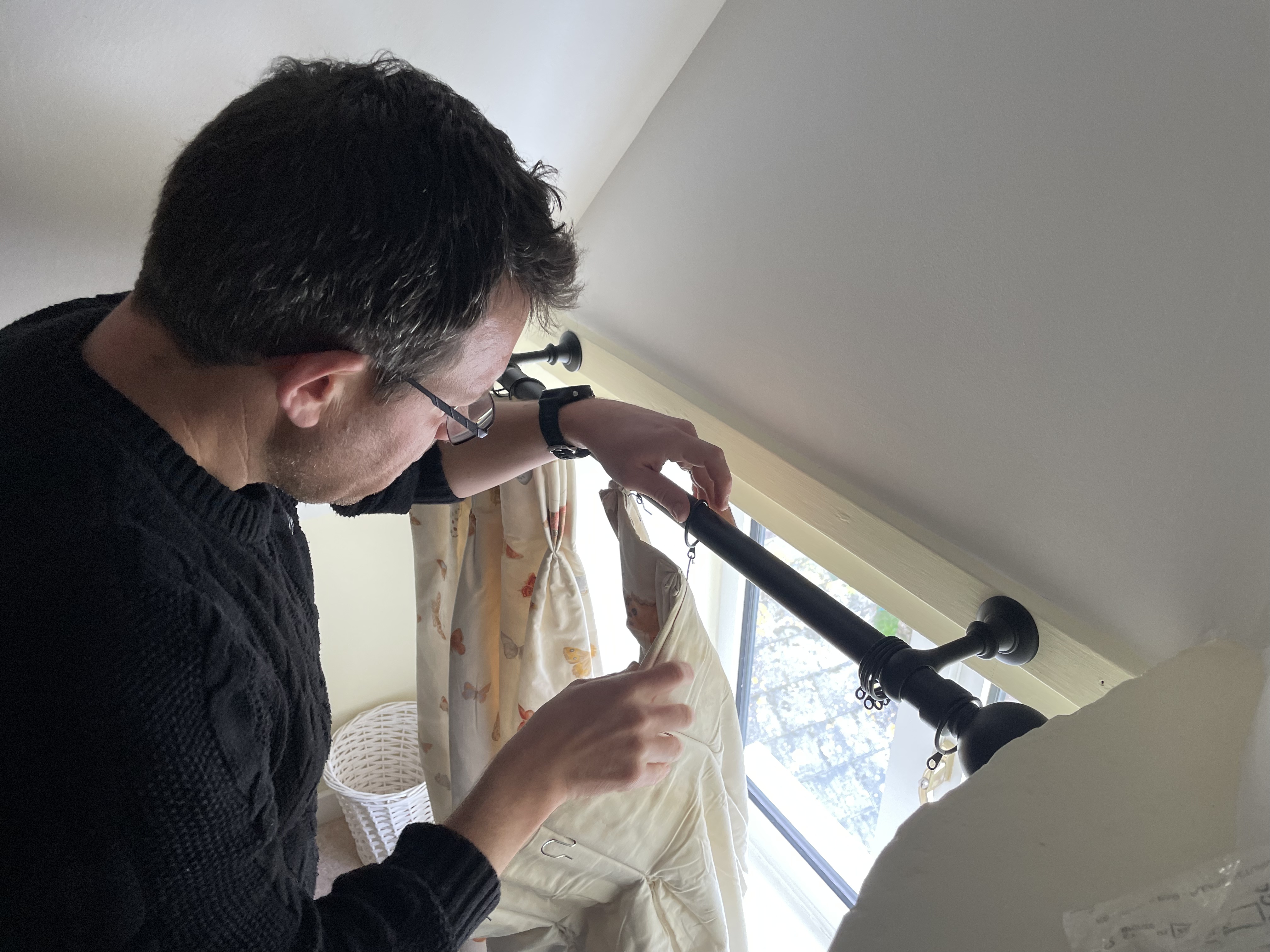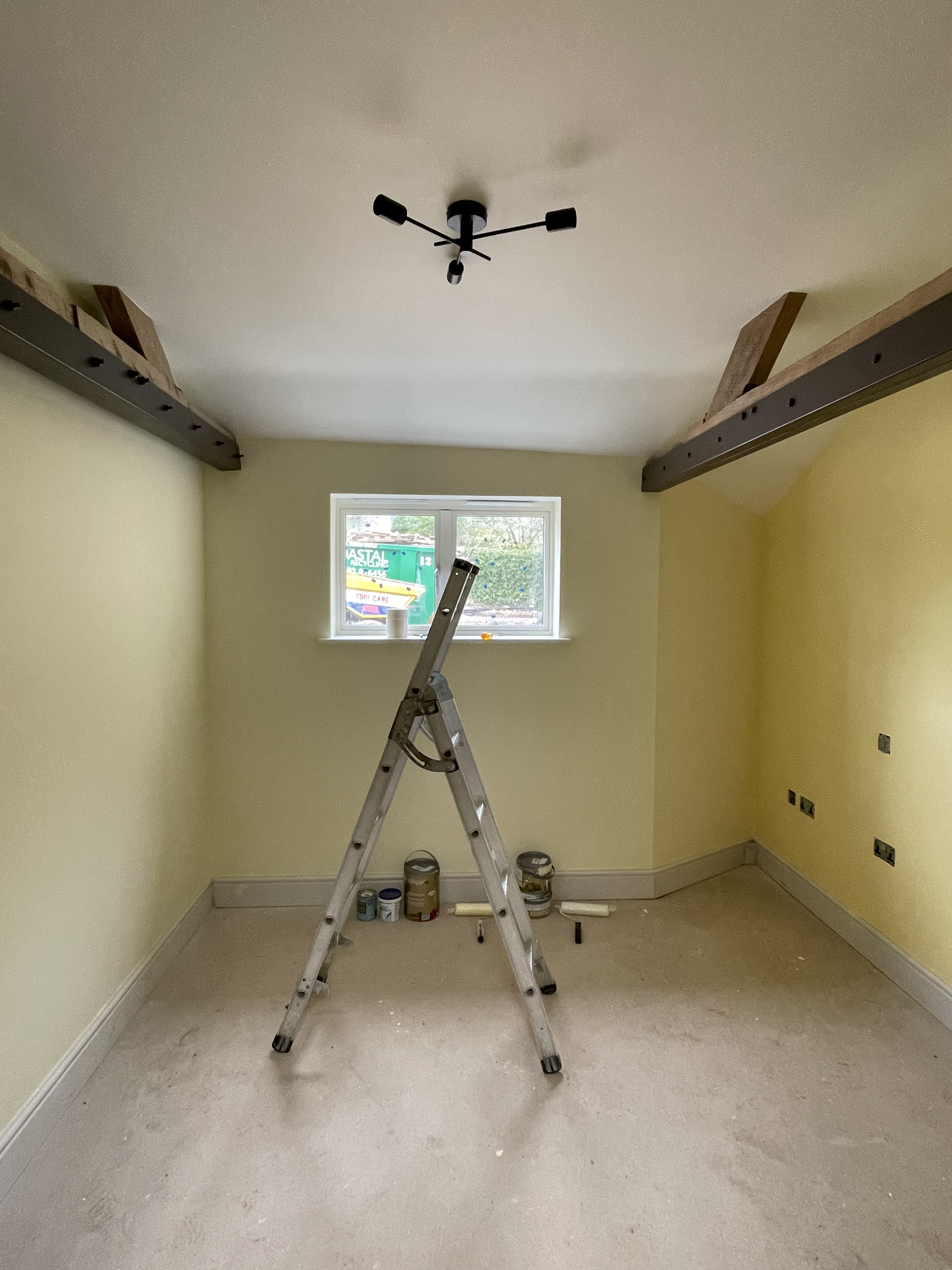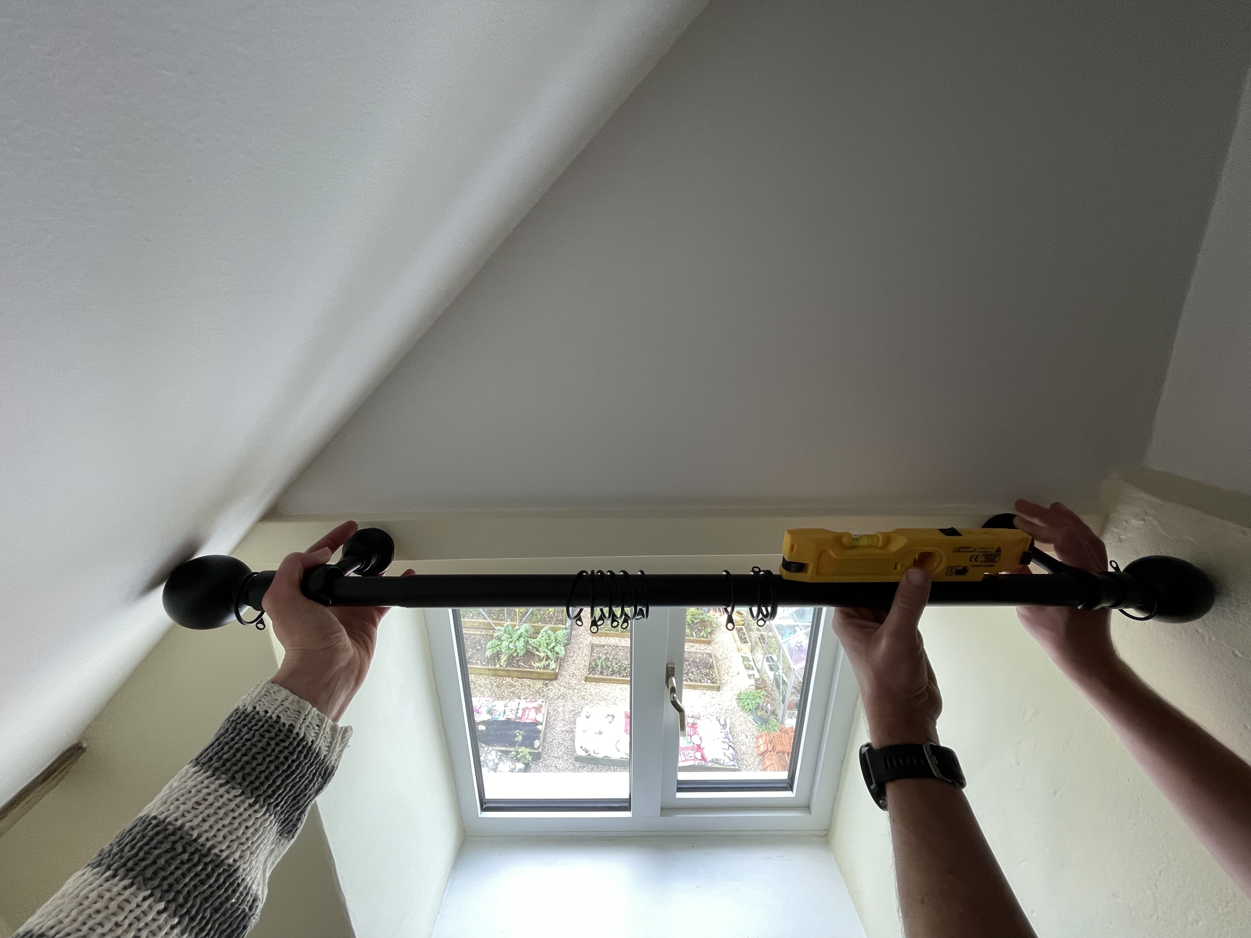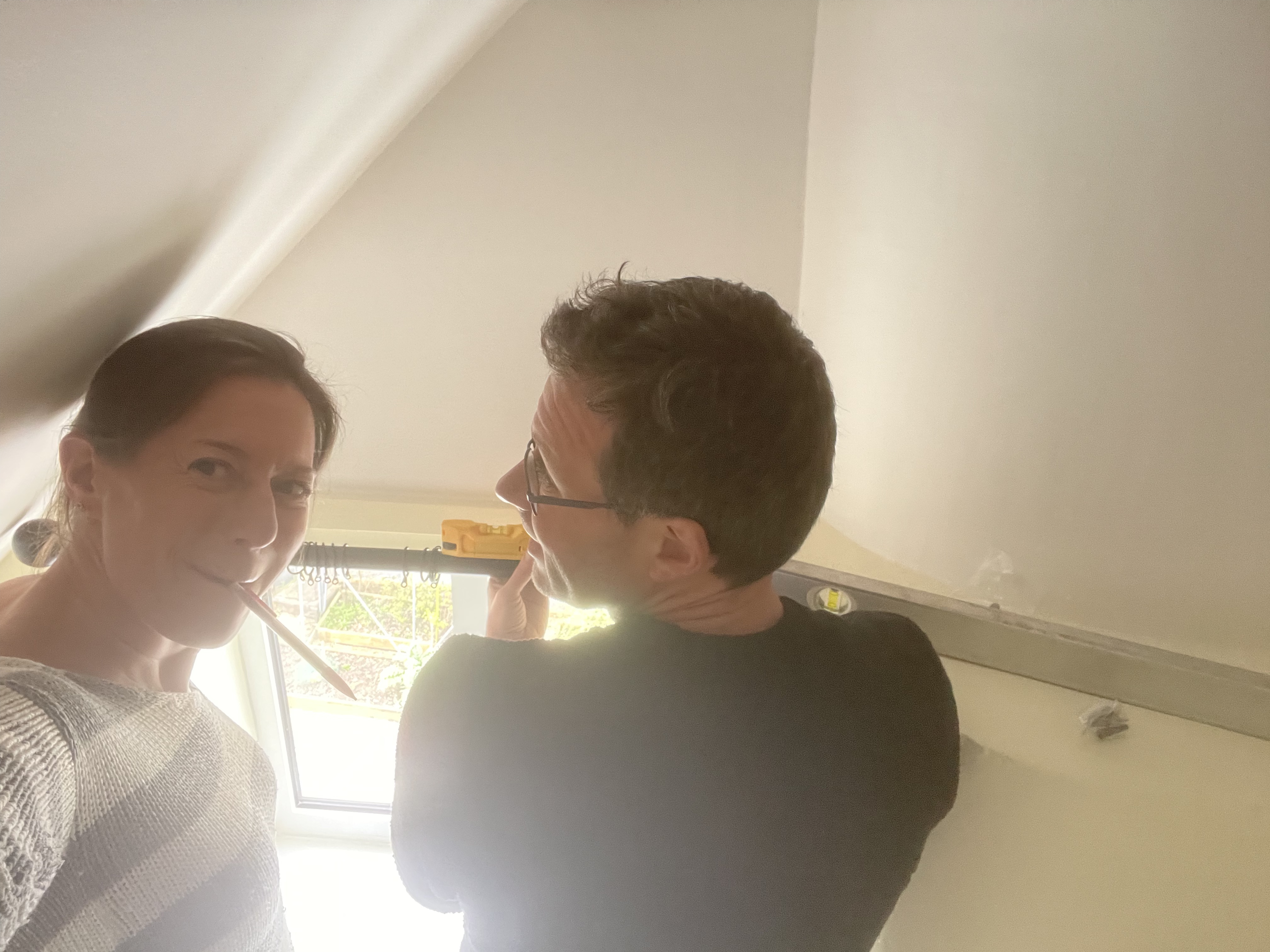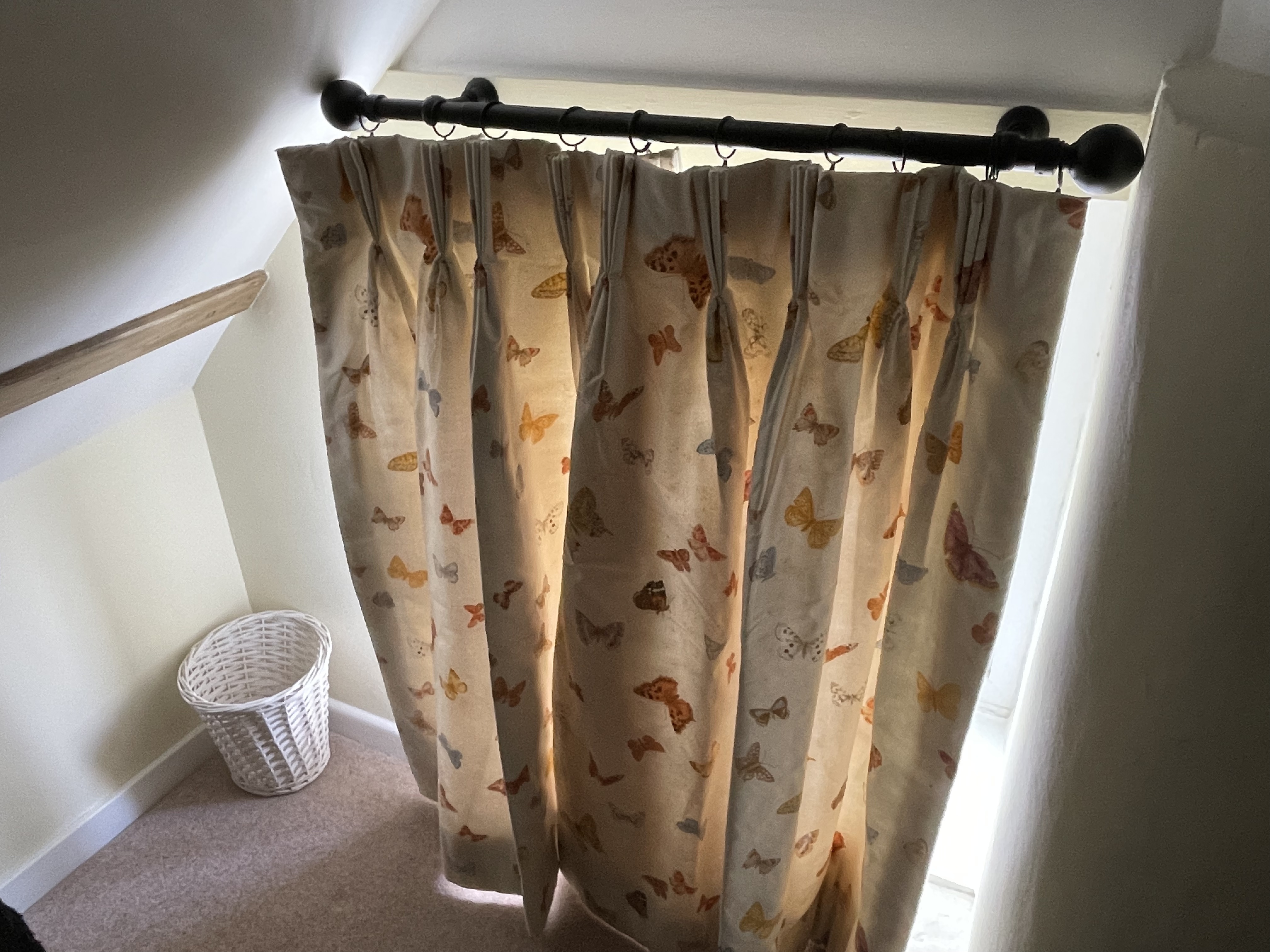 And in our farmhouse, we finally got round to putting up the curtain rail in our yellow bedroom in time for a family visit and to make the bedroom toddler-friendly – although having looked at the stains on the curtain we inherited, we will need to invest in a new curtain and some side hooks before we rent the place out! Years of a poorly-insulated room have not been kind to the curtains, not even the dry cleaners could get the mould stains out.