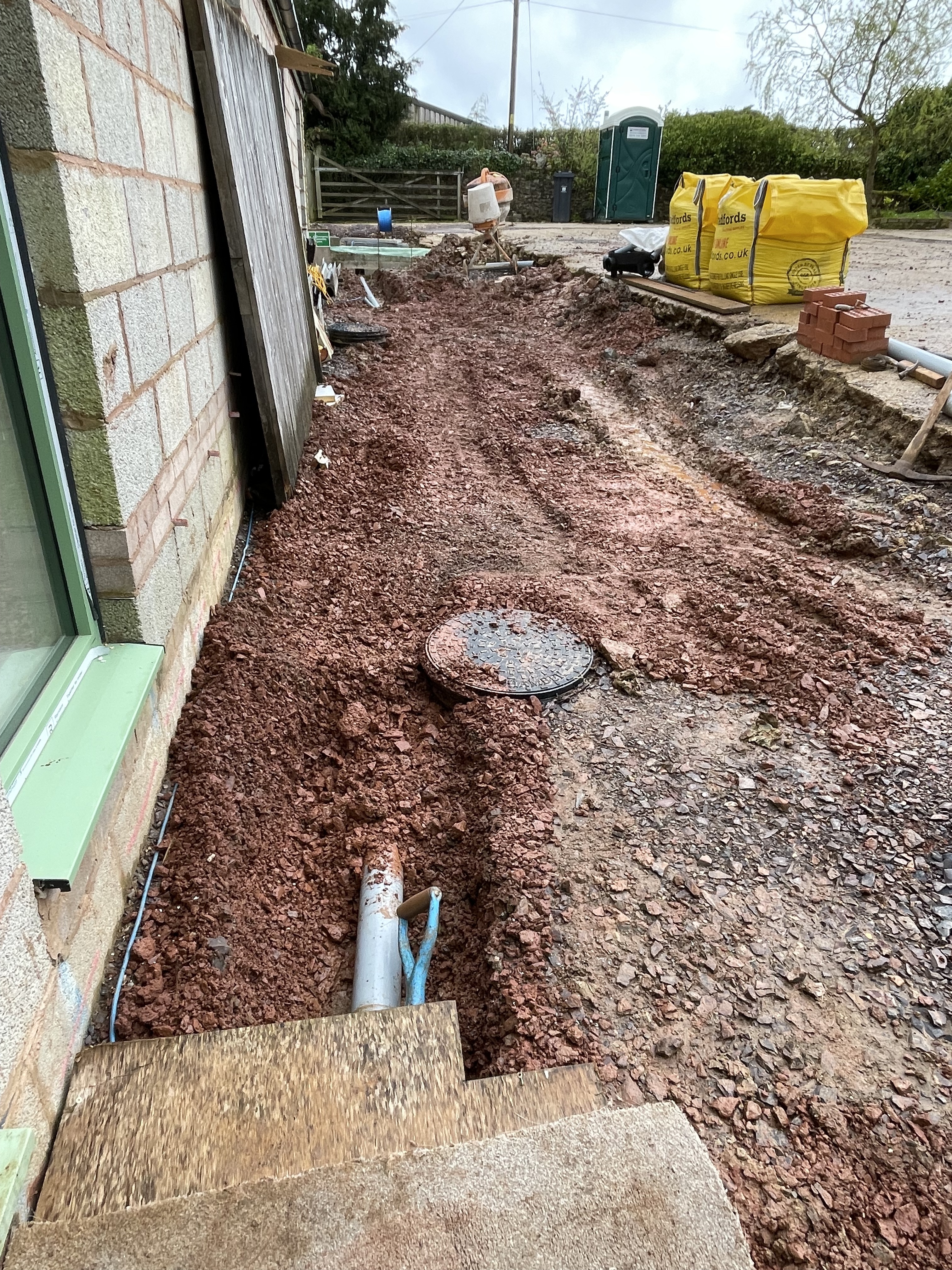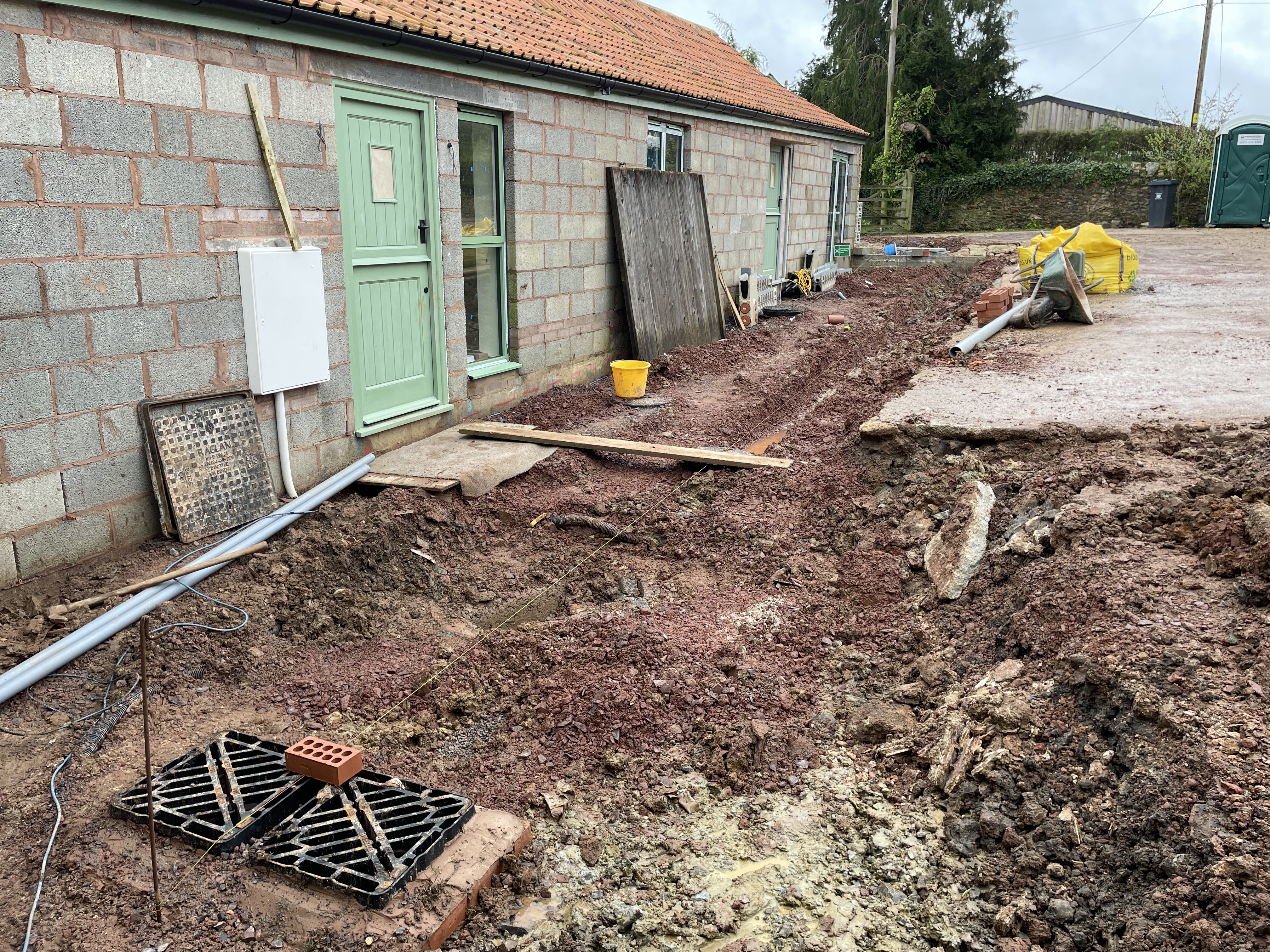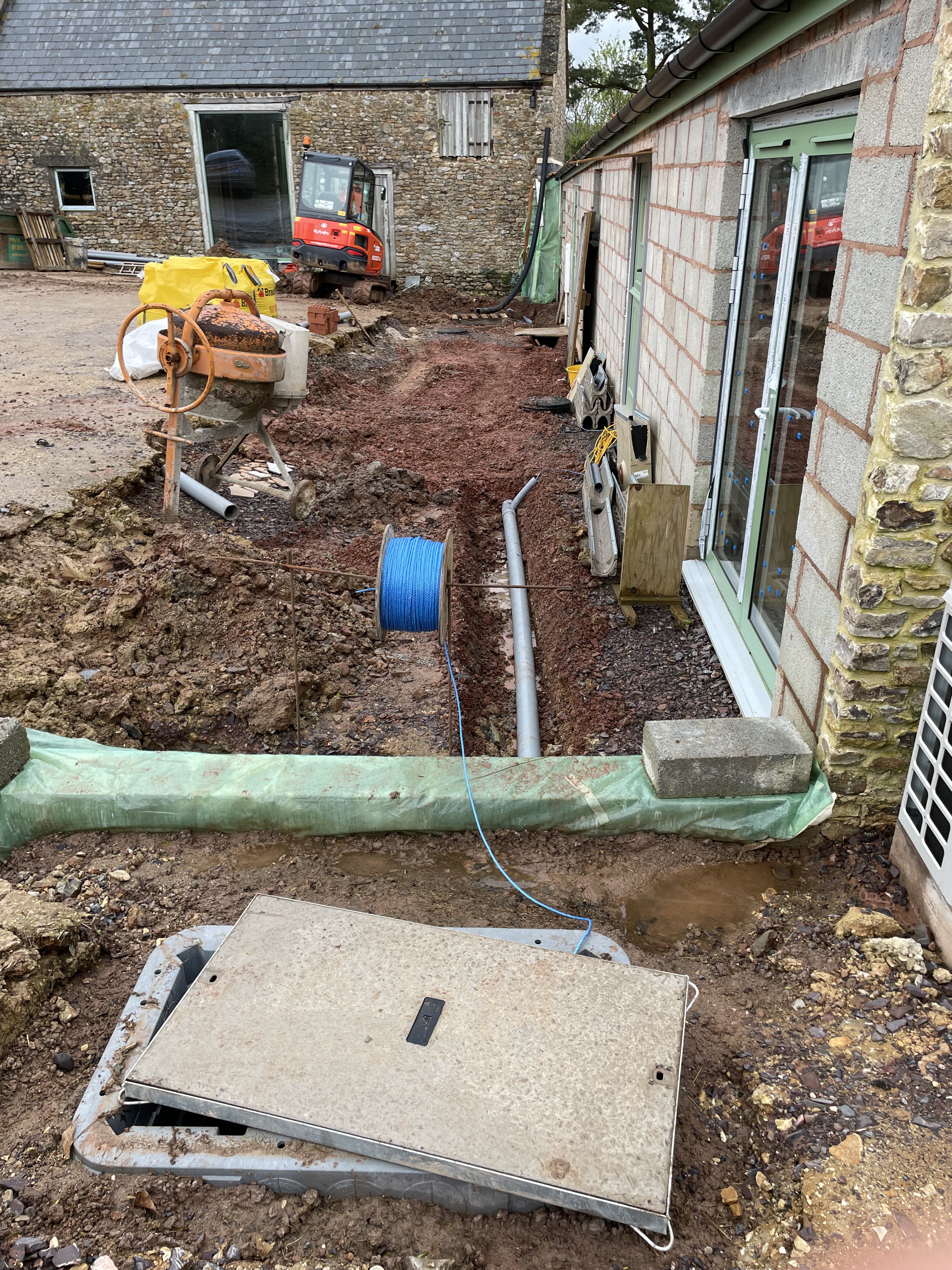 Our builders have been busy ticking other jobs off too – they sanded the concrete floors in our garage and laundry that were poured a couple of weeks ago – as these rooms are currently open to the elements it took a bit longer for them to dry. They’ve laid the broadband cables across the site (each property will have its own connection coming off the main supply, and while we can’t bury the farmhouse connection, we took the opportunity to bury the rest while we’re digging up the ground). And they’ve laid the cabling for the EV charger that will be connected to our house (the other two will be connected to the communal barn electricity supply). Then they’ve dug the trench for the aco drain along the front of the shippon. This is essentially our last line of defence in case we ever get excessive rainwater, and should take the water away from the two shippon conversions rather than going in. And they’ve also started filling in the garden area for the three-bed barn, as they work from the back of the site round to the front.