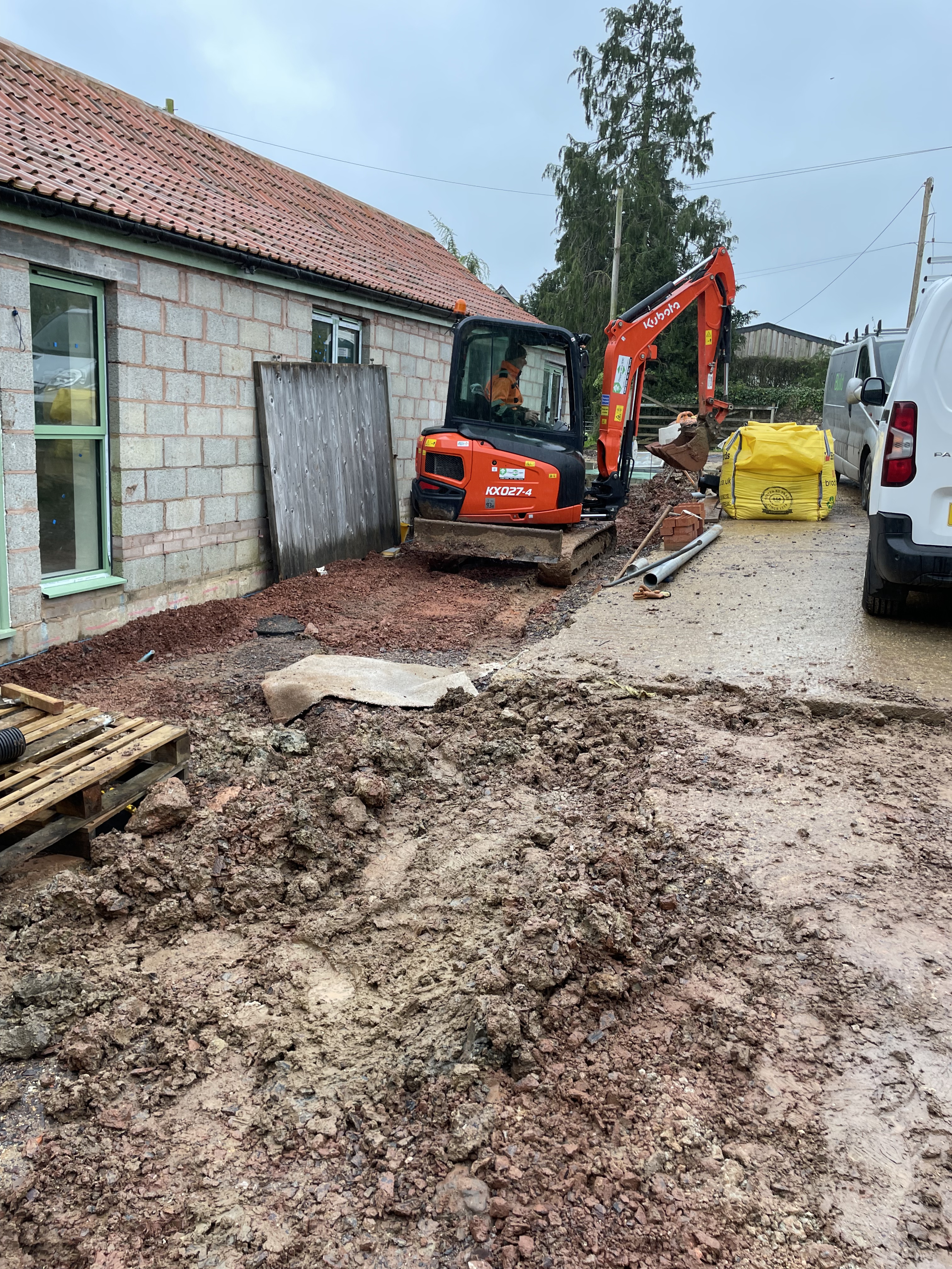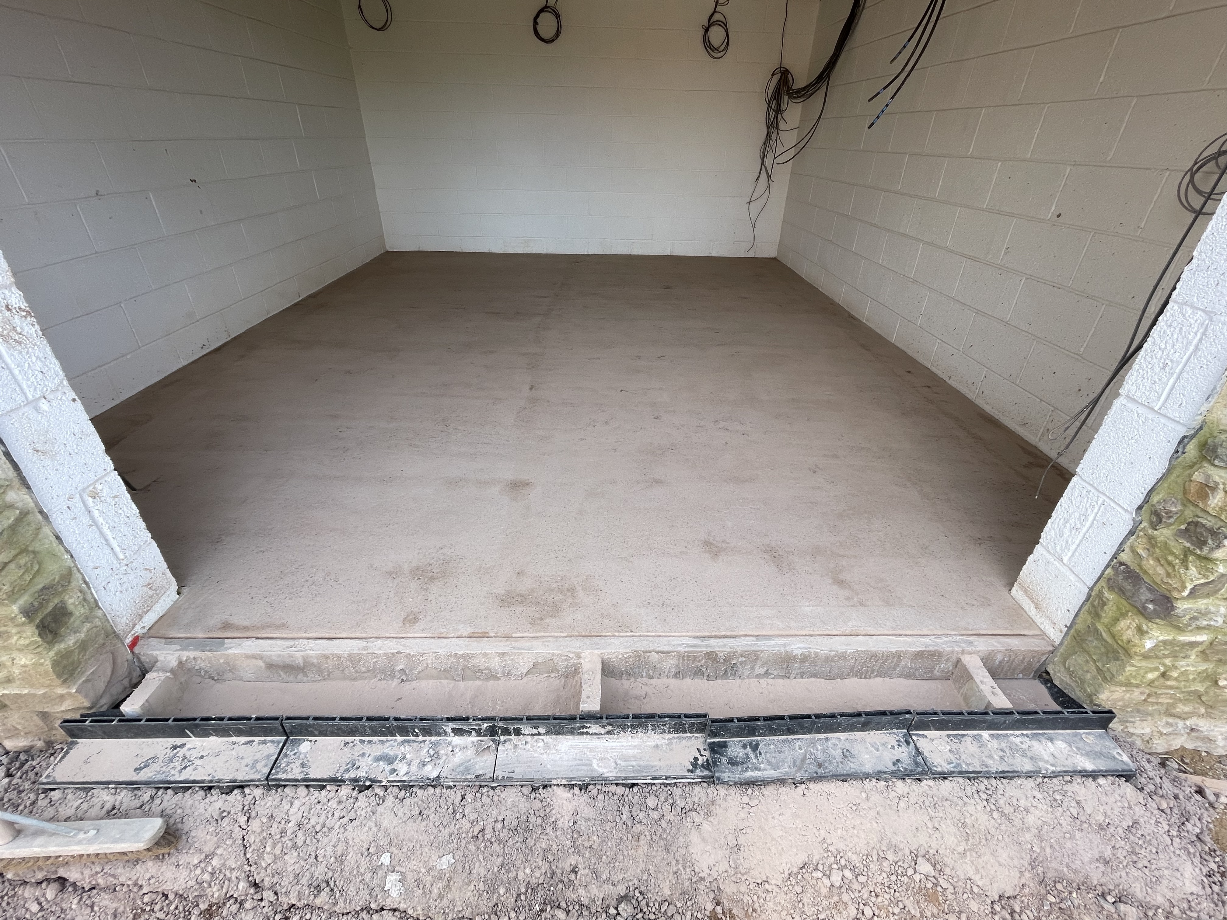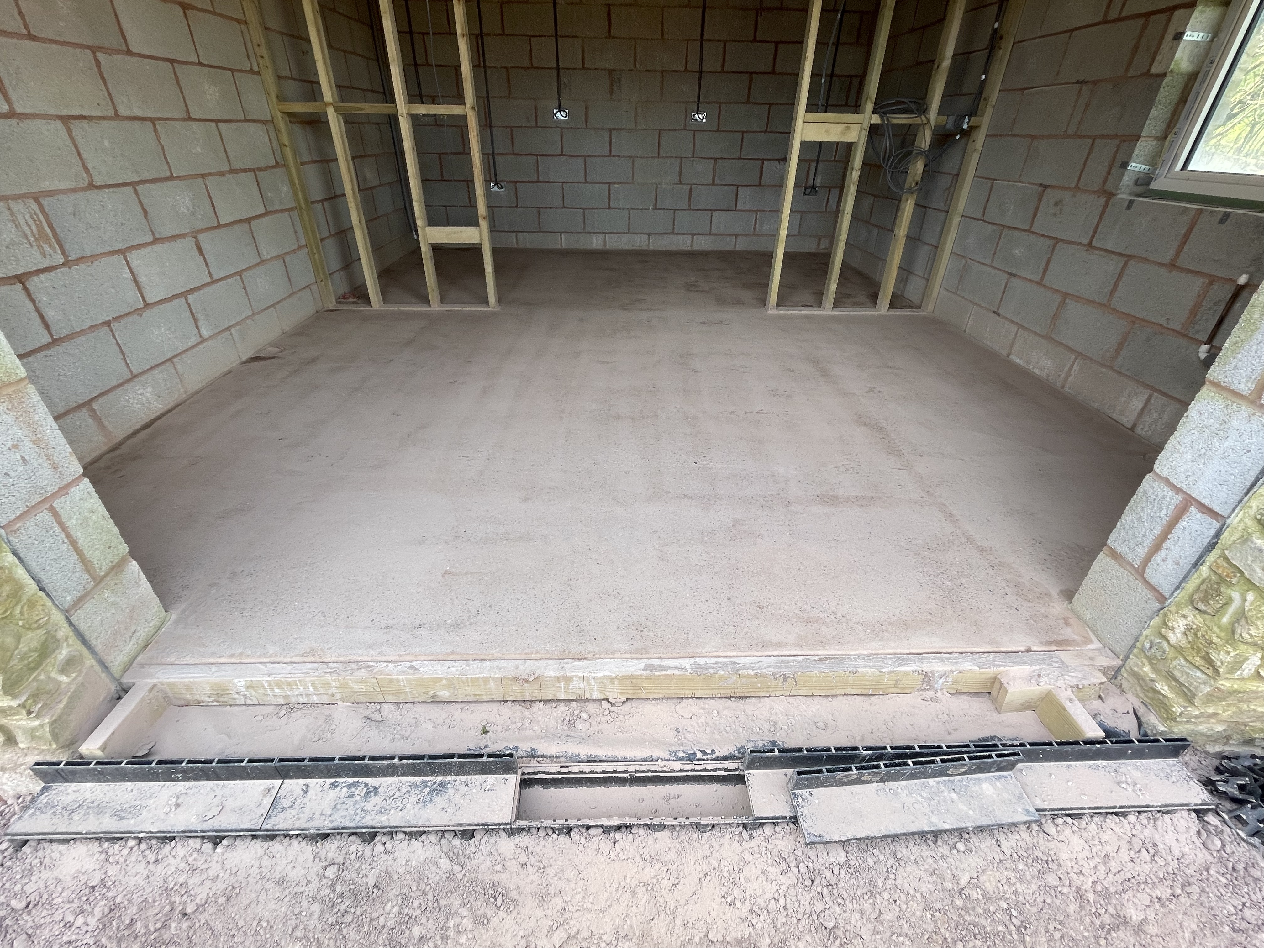 Our builders have been busy ticking other jobs off too – they sanded the concrete floors in our garage and laundry that were poured a couple of weeks ago – as these rooms are currently open to the elements it took a bit longer for them to dry. They’ve laid the broadband cables across the site (each property will have its own connection coming off the main supply, and while we can’t bury the farmhouse connection, we took the opportunity to bury the rest while we’re digging up the ground). And they’ve laid the cabling for the EV charger that will be connected to our house (the other two will be connected to the communal barn electricity supply). Then they’ve dug the trench for the aco drain along the front of the shippon. This is essentially our last line of defence in case we ever get excessive rainwater, and should take the water away from the two shippon conversions rather than going in. And they’ve also started filling in the garden area for the three-bed barn, as they work from the back of the site round to the front.