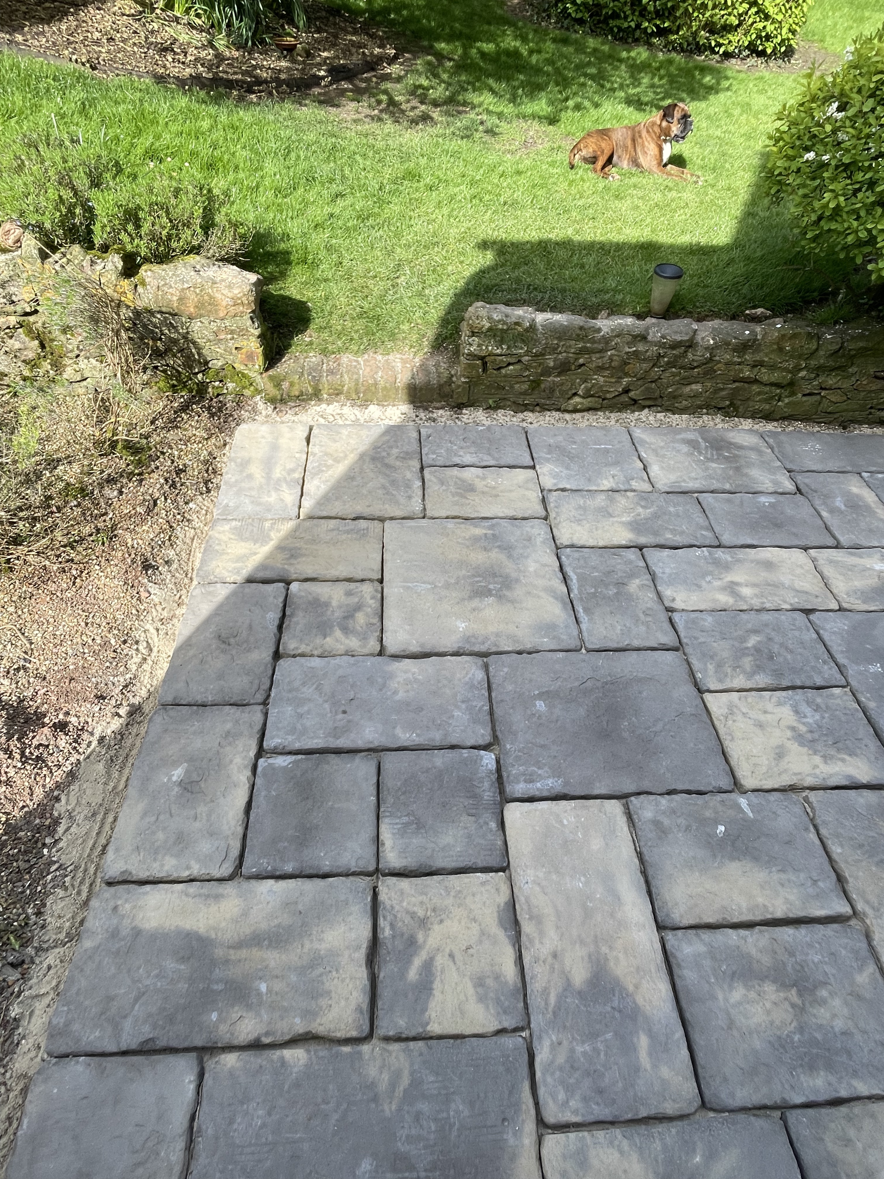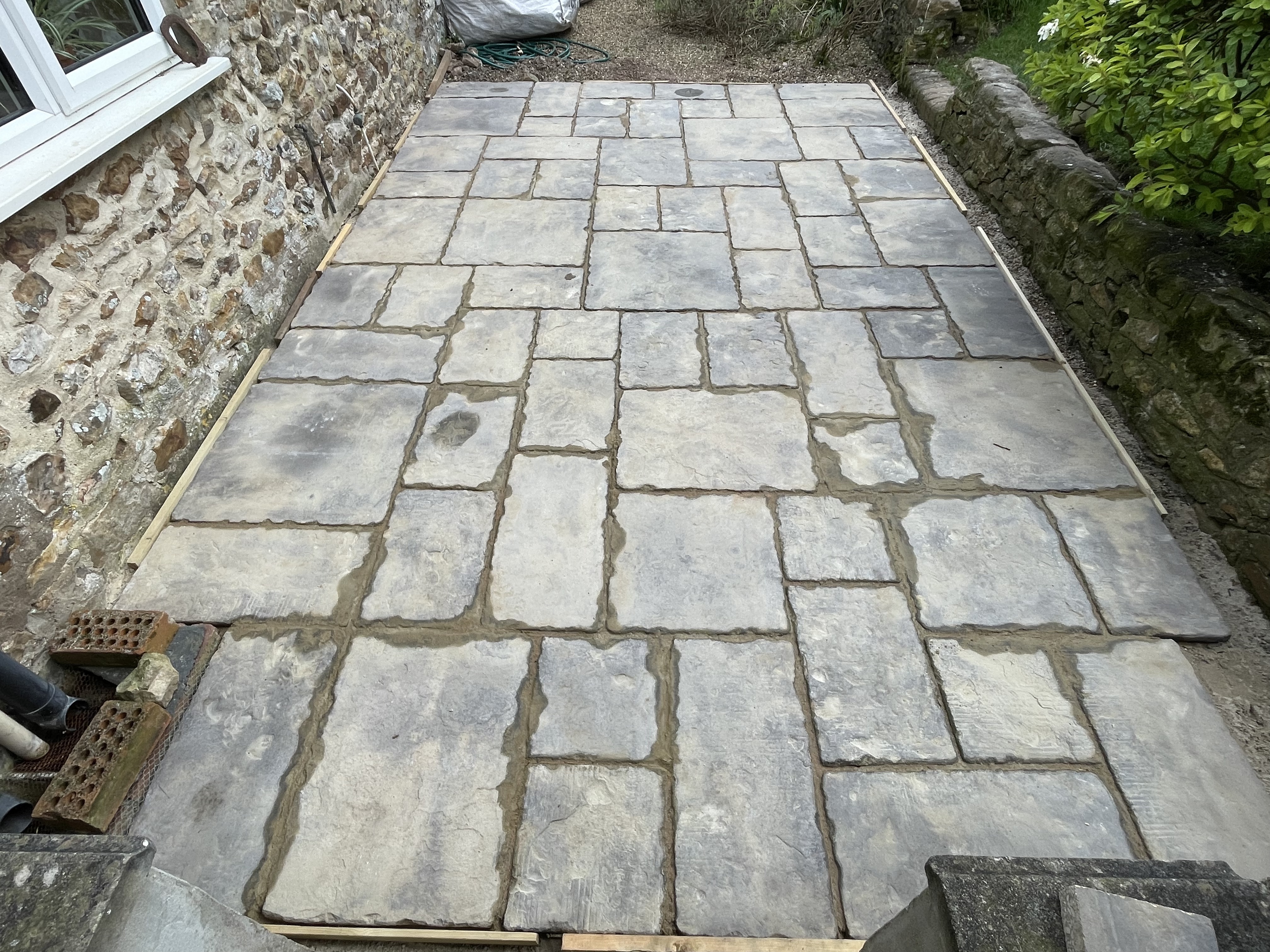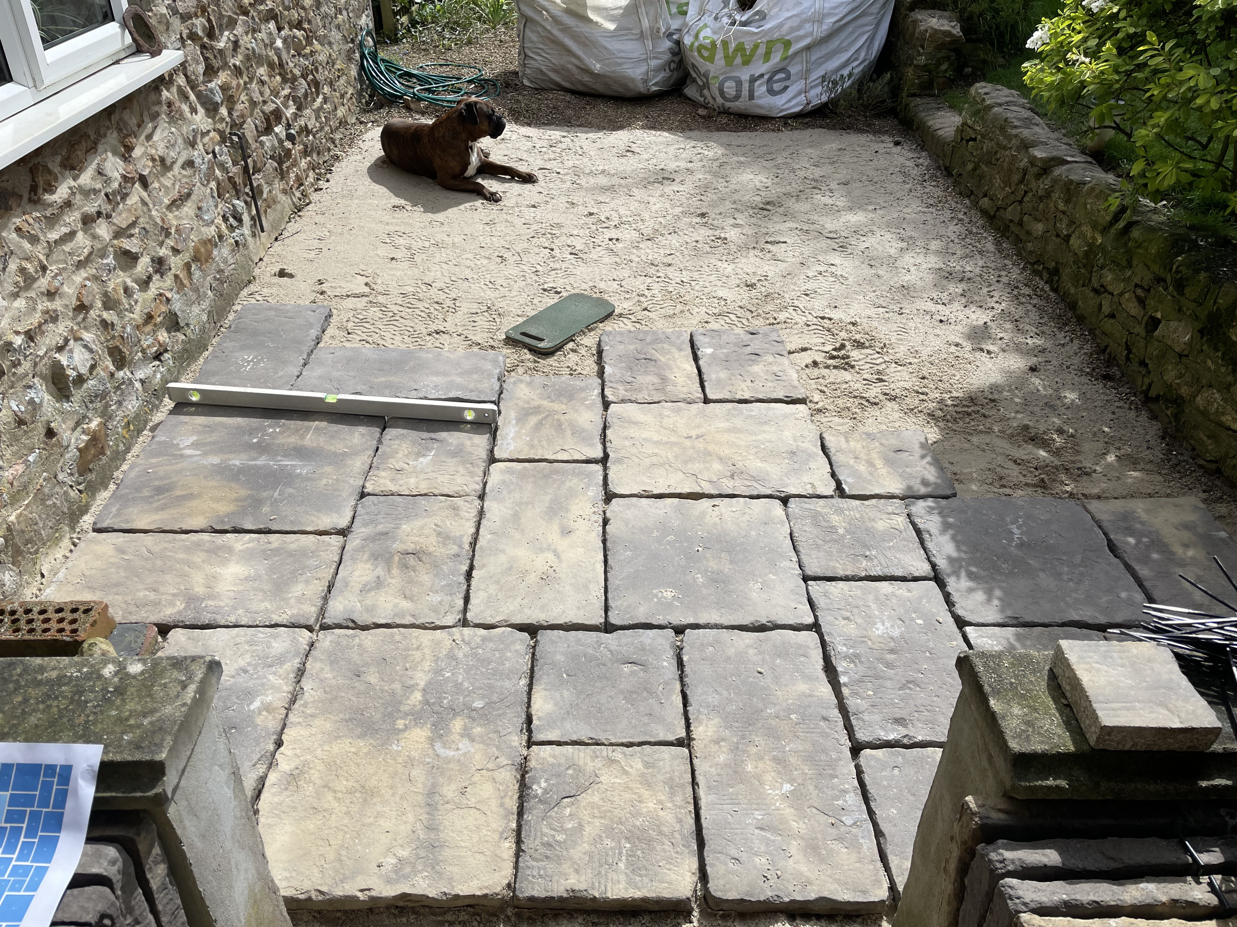 As for us – we made the most of a dry weekend by getting through some of our garden jobs. We started by laying the new patio round the back of the farmhouse. The whole area behind the house was gravelled by the previous owners and we’ve wanted to get rid of it ever since – the clay soil sticks to your boots and then picks up gravel and spreads it everywhere. We went for an old style slab to keep true to our farmhouse heritage – they’re actually moulded from slabs that were reclaimed from a 19th century Lancashire cotton mill. Not so easy to lay though as they’re not flat on the top, so trying to get a reasonable pitch that isn’t too much it feels like you’re sitting on a slope, but that allows the water to drain, is a little challenging. The pitch is also not the same direction as the hill as we’re draining the water away from the house, so it looks slightly odd from the kitchen!